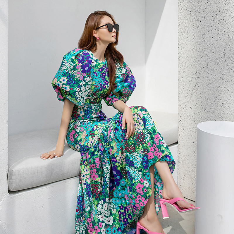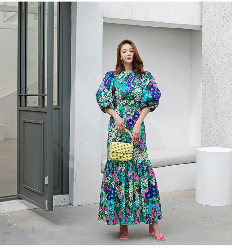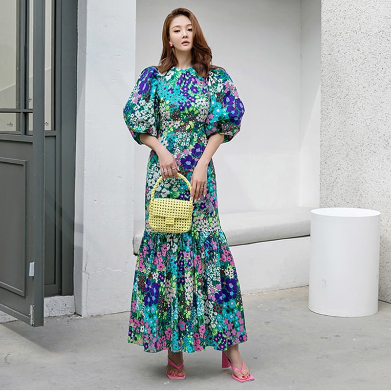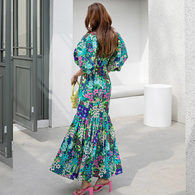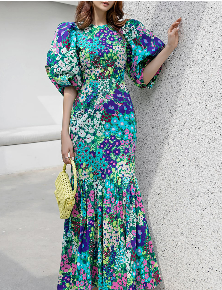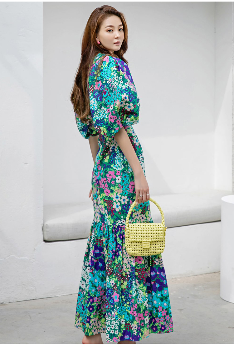 RY2652# 2026夏新款韩版时尚长裙鱼尾印花碎花小雏菊田园超修身圆领连衣裙
