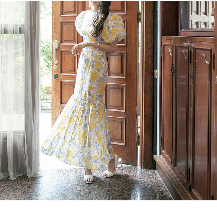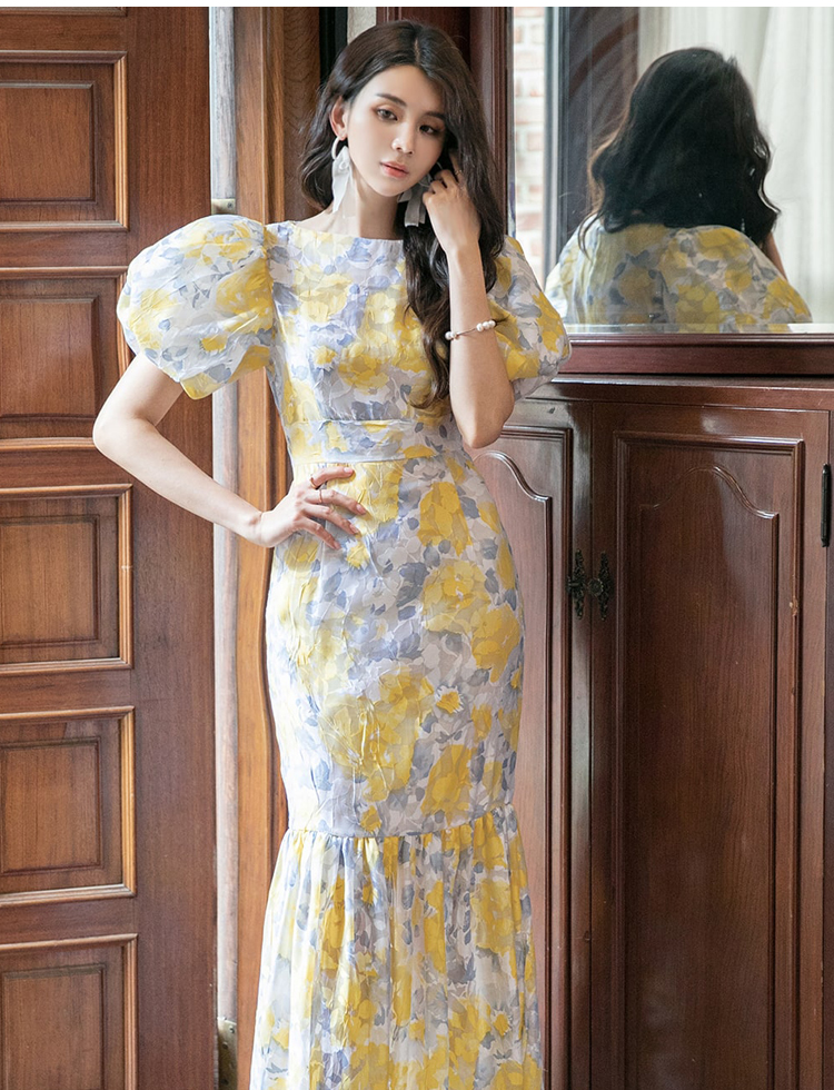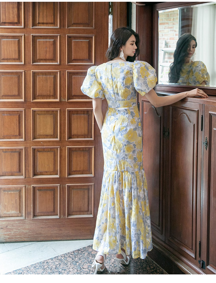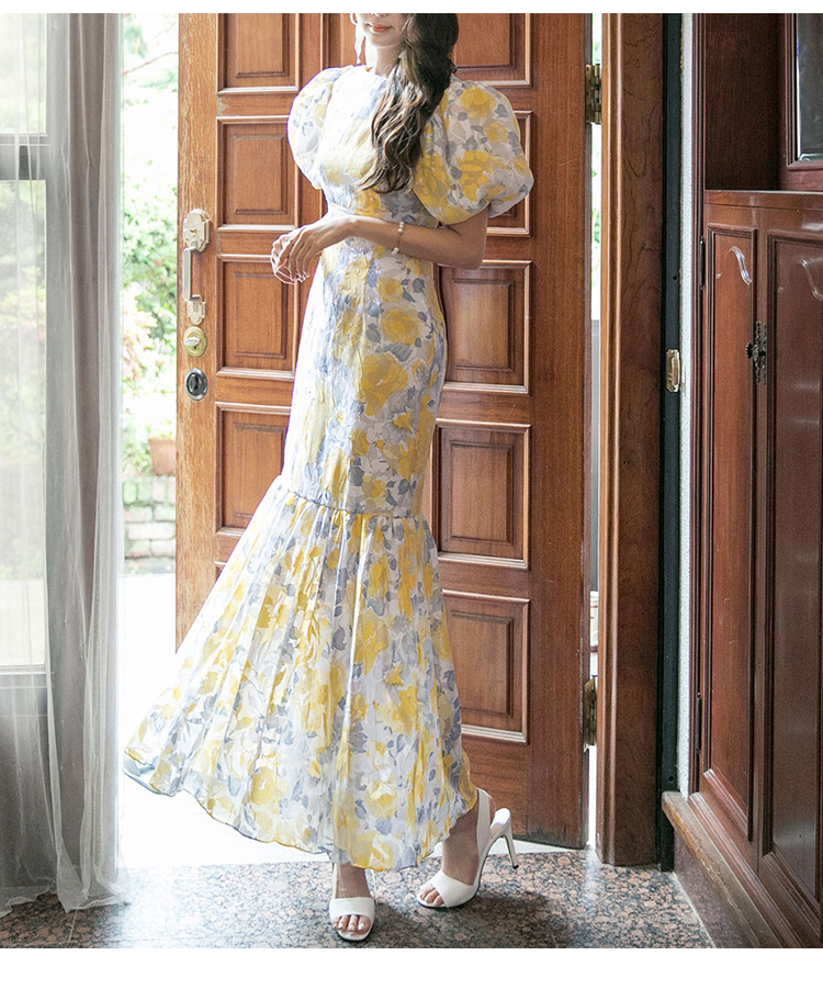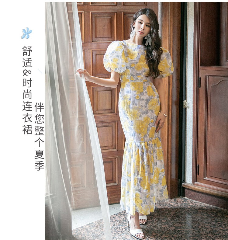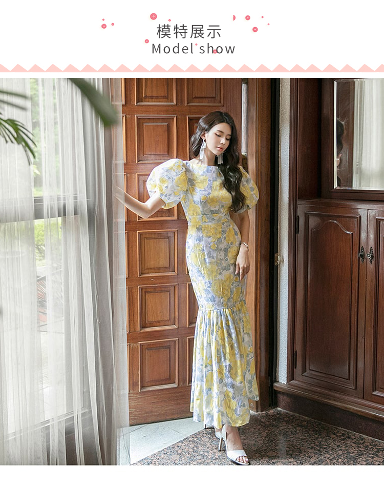 RY2655# 2026夏新款韩版时尚复古优雅超修身灯笼袖印花碎花鱼尾长款连衣裙