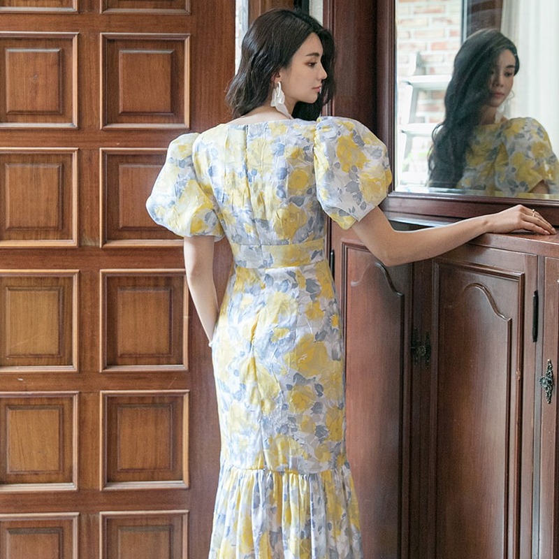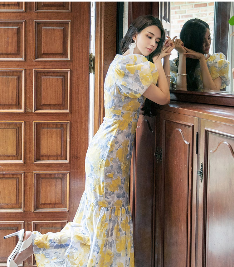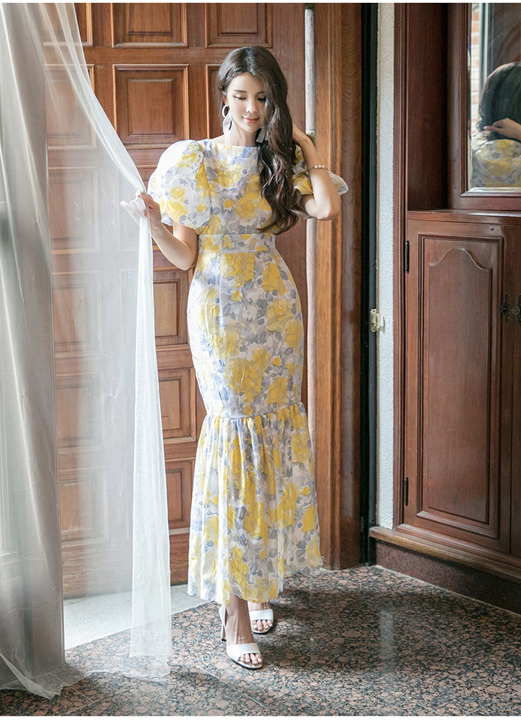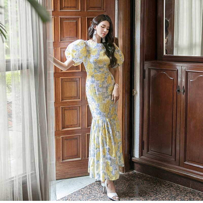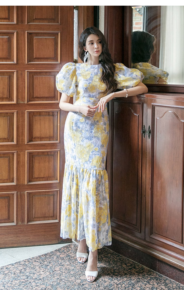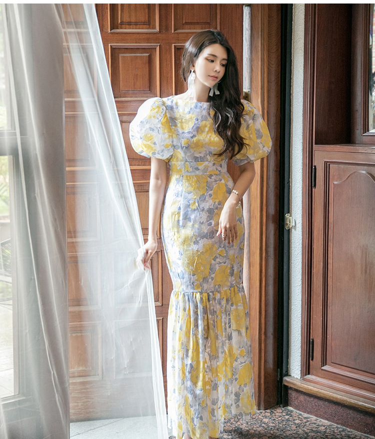 RY2655# 2026夏新款韩版时尚复古优雅超修身灯笼袖印花碎花鱼尾长款连衣裙