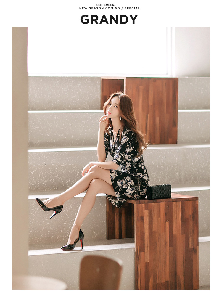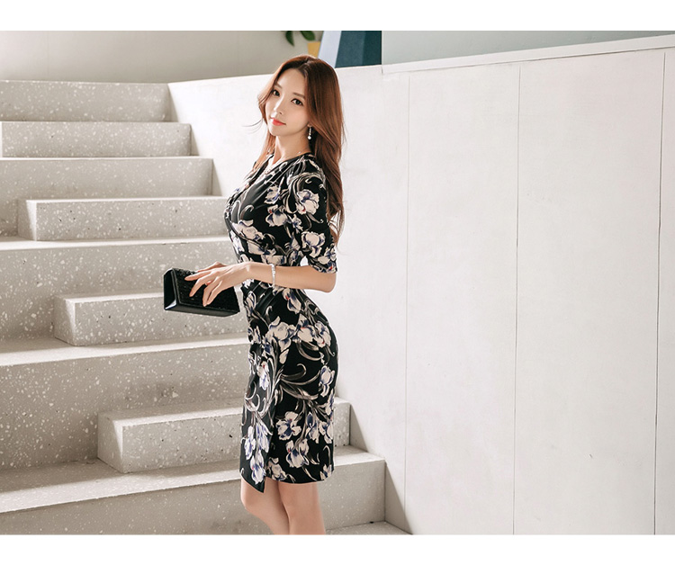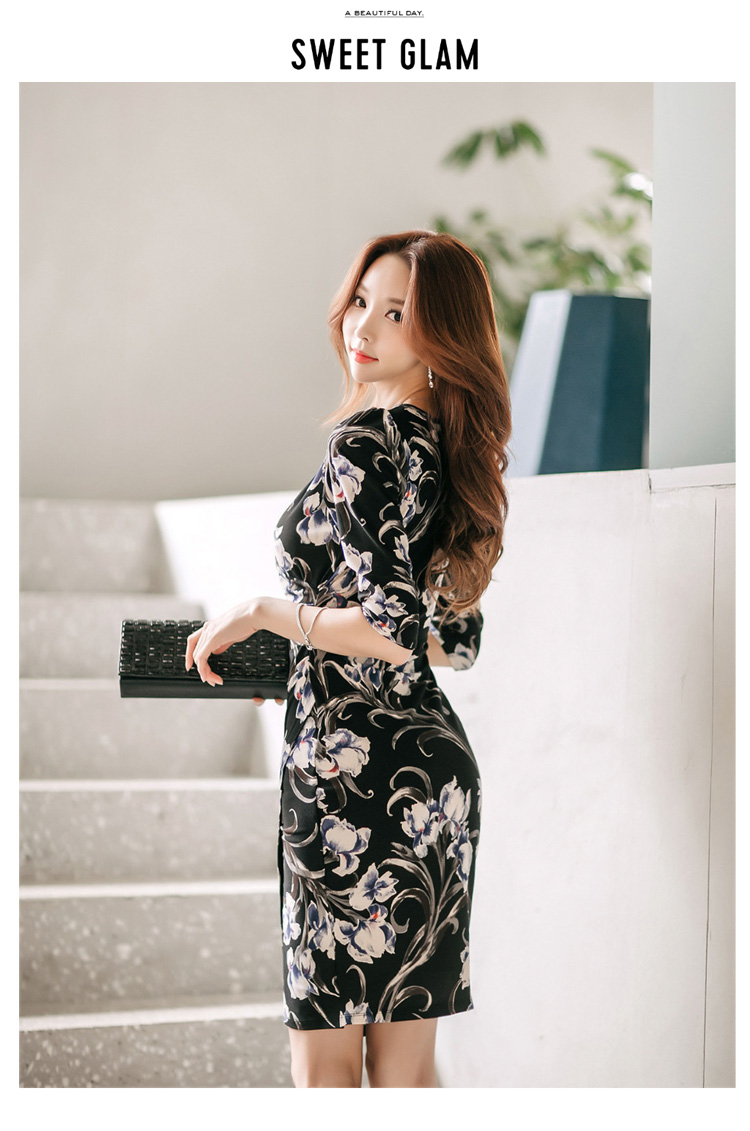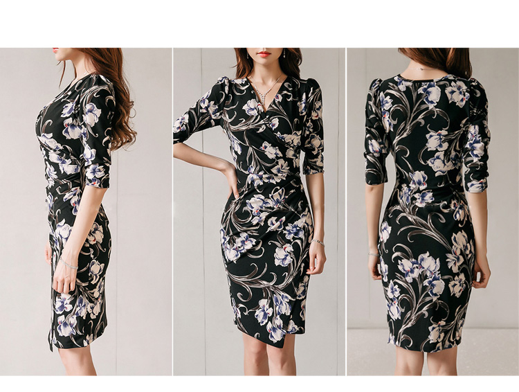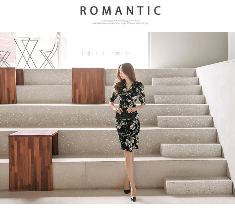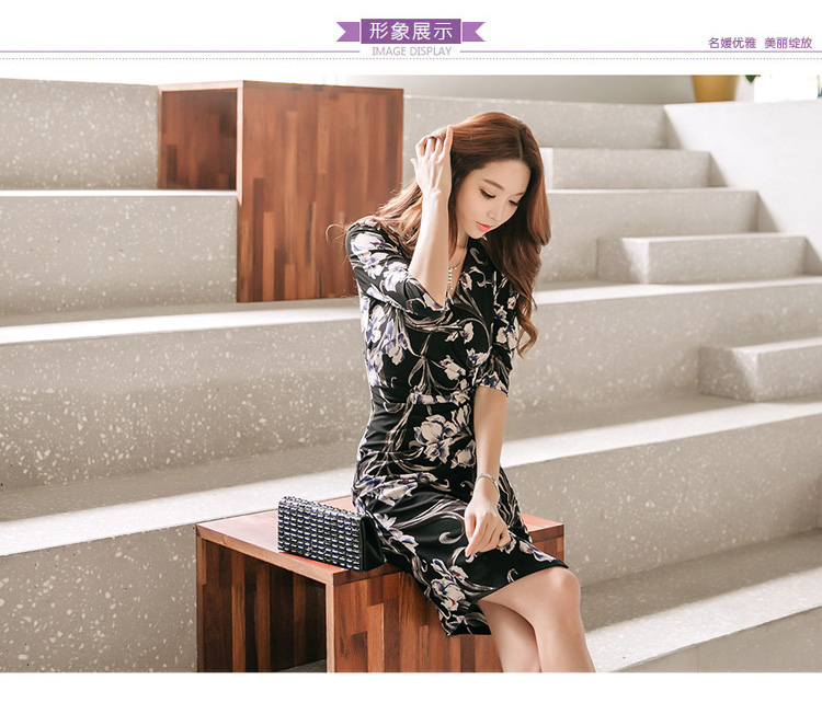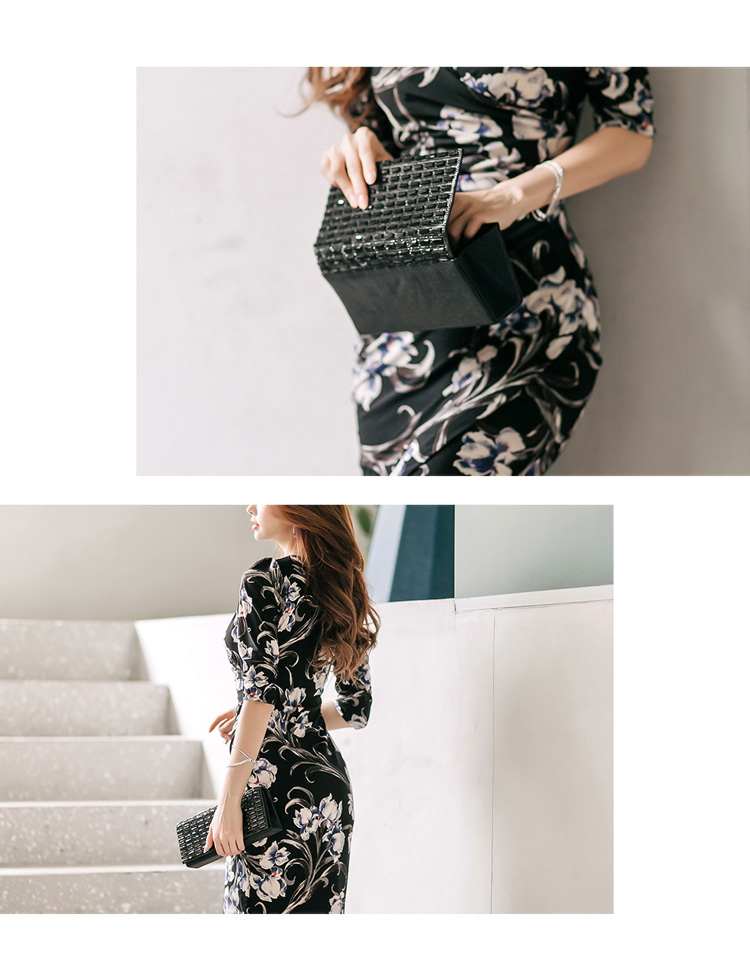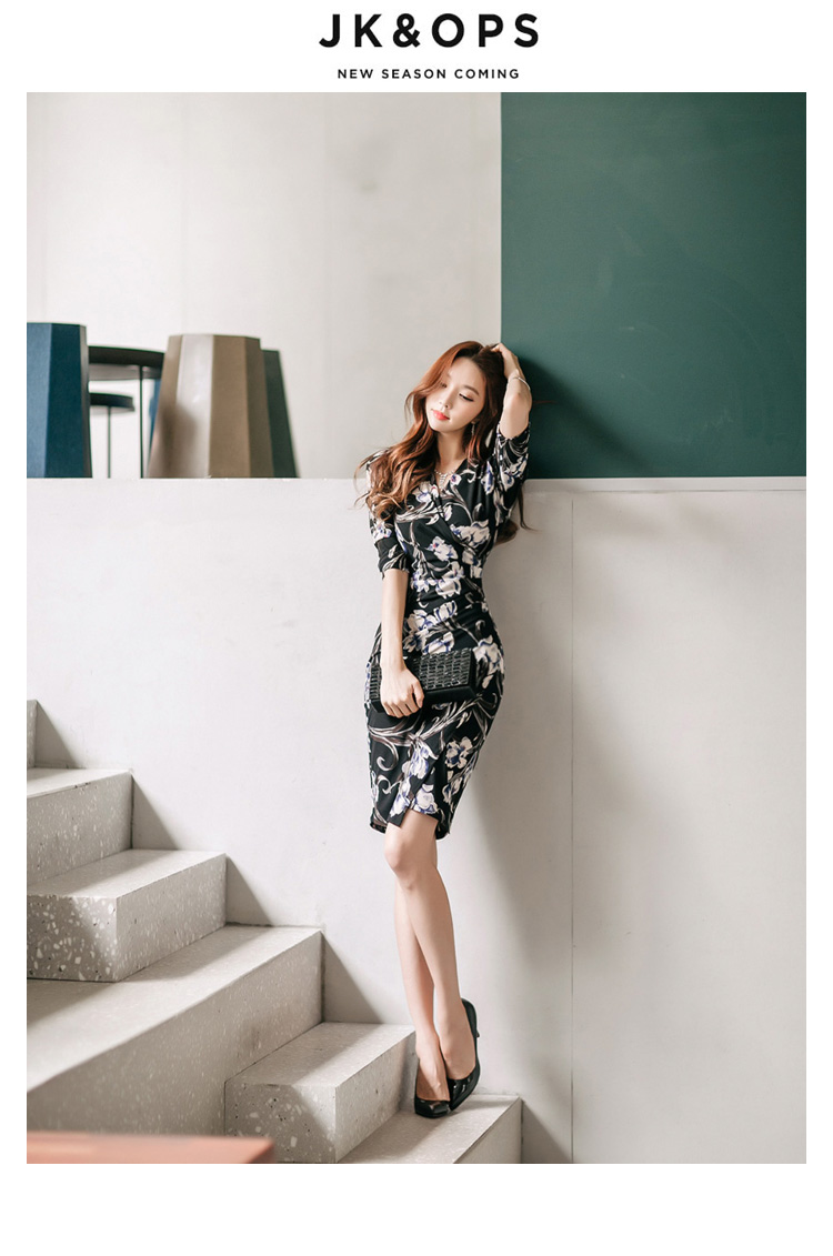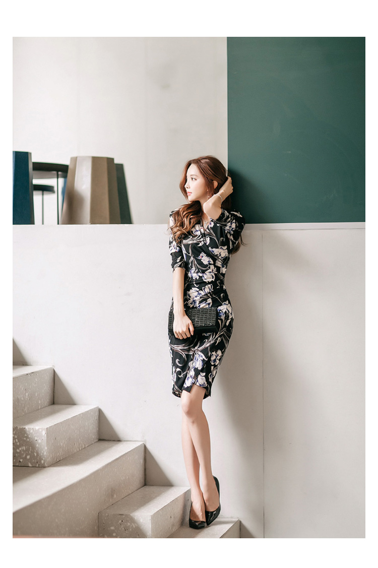 RY2658# 2026春秋新款外贸韩版气质V领中长款印花修身包臀打底裙连衣裙女