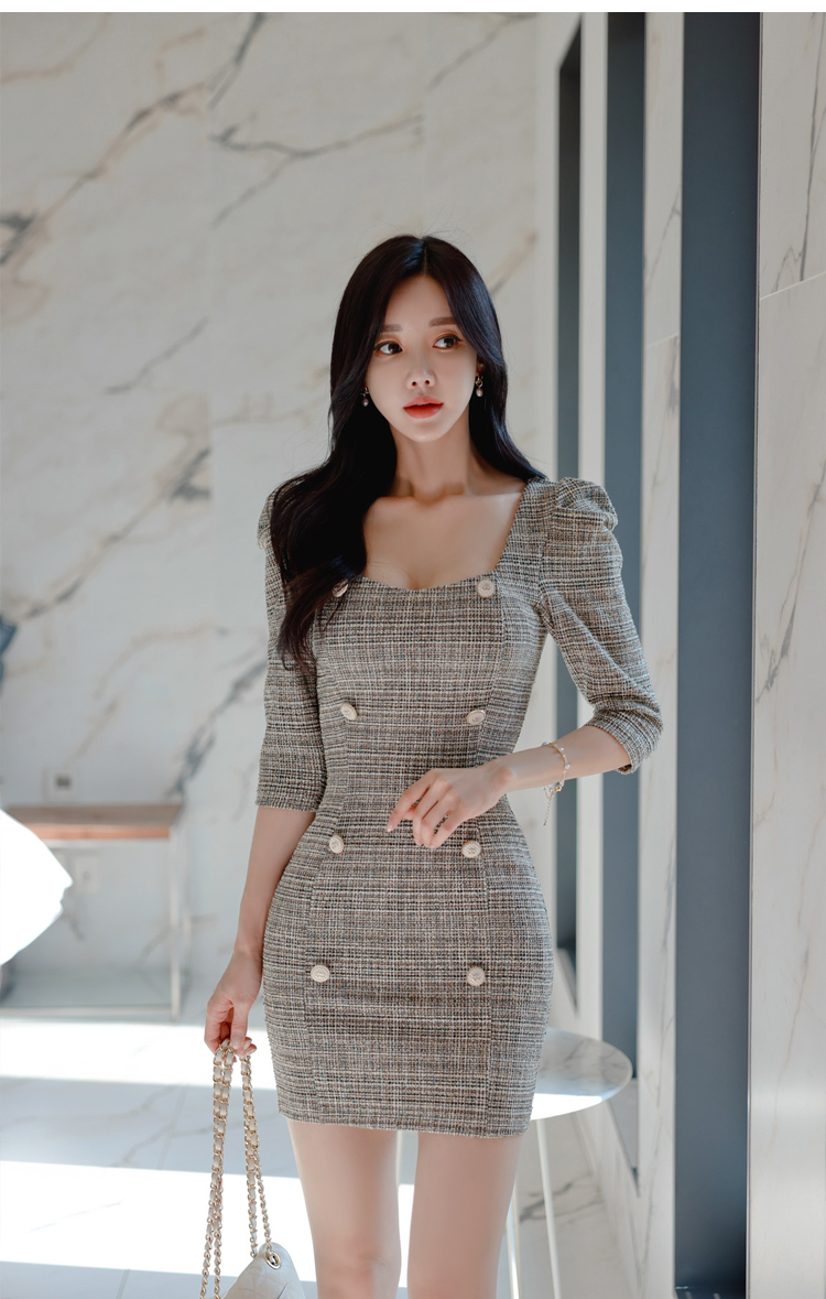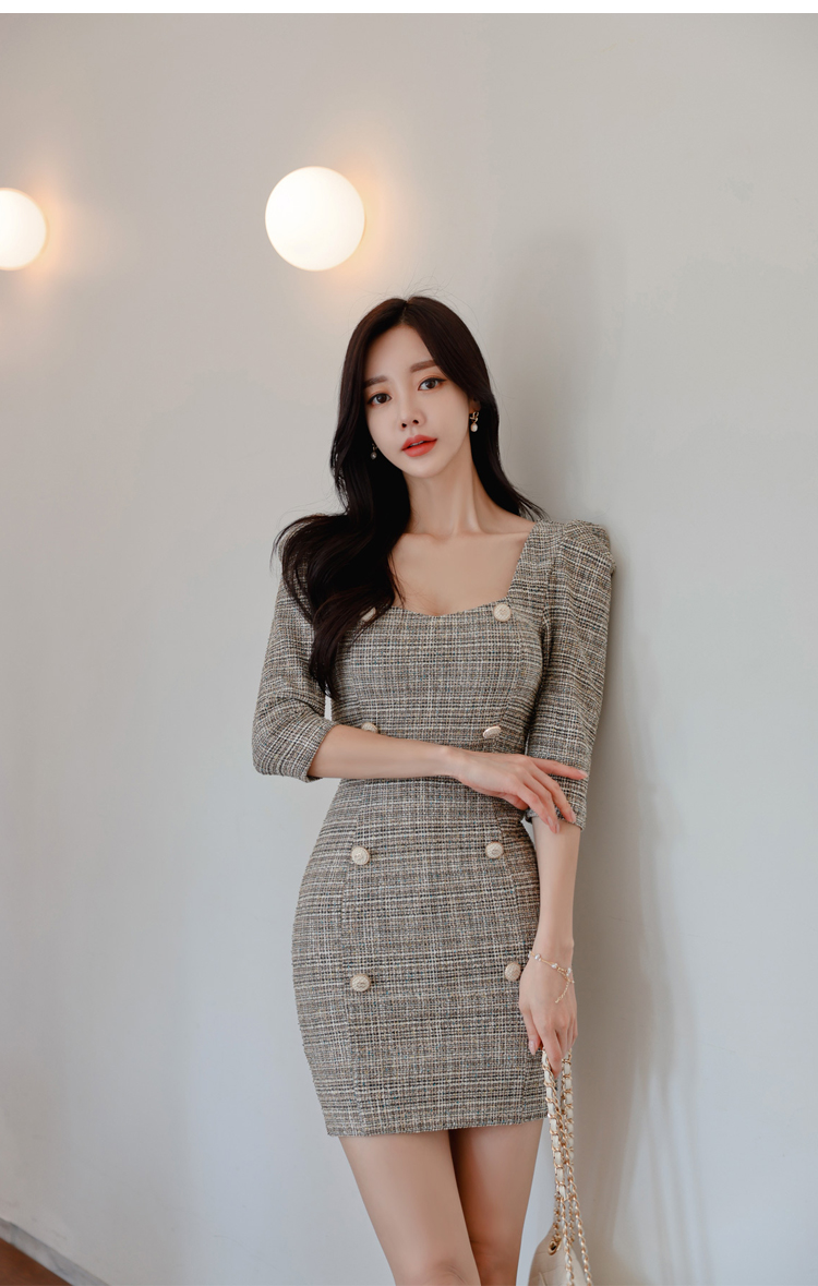 RY2659# 2026春新款韩版时尚小香风方领七分袖修身显瘦短款性感包臀连衣裙
