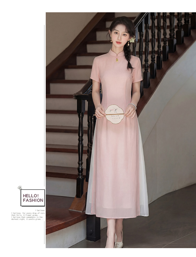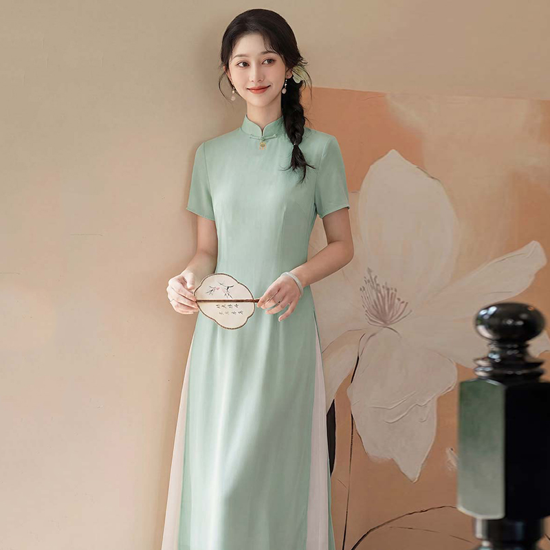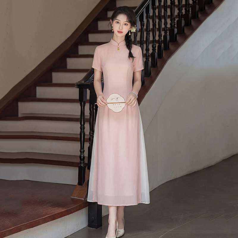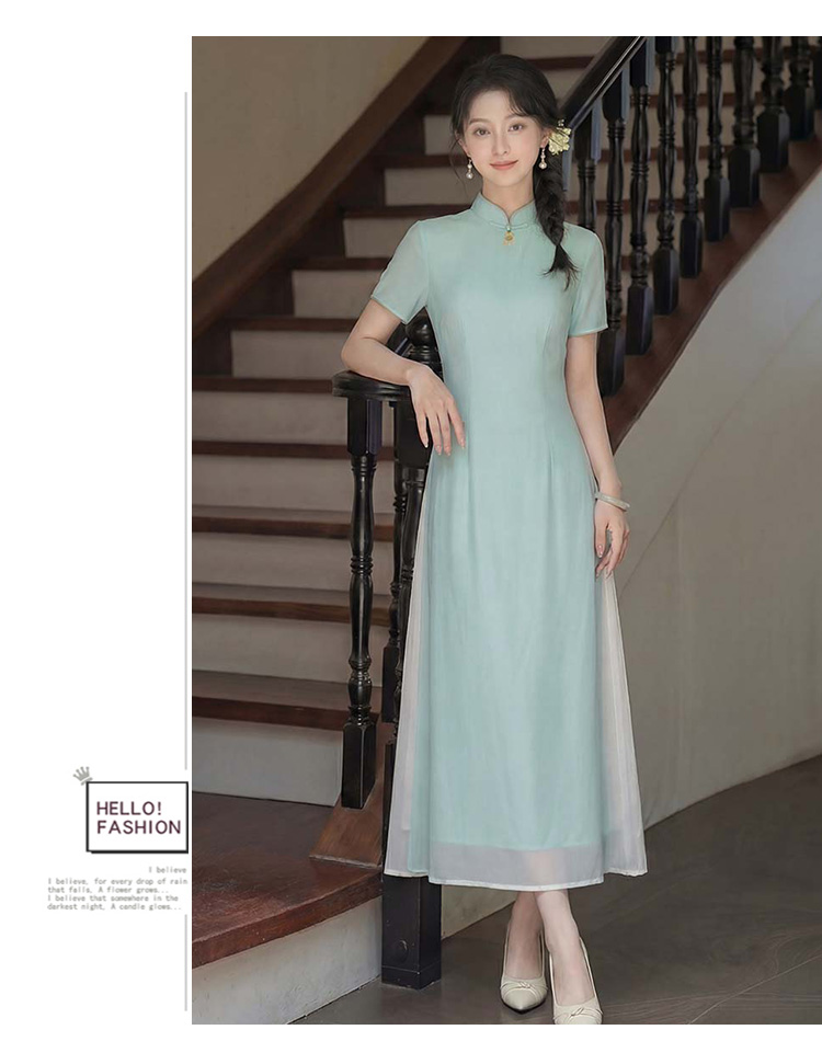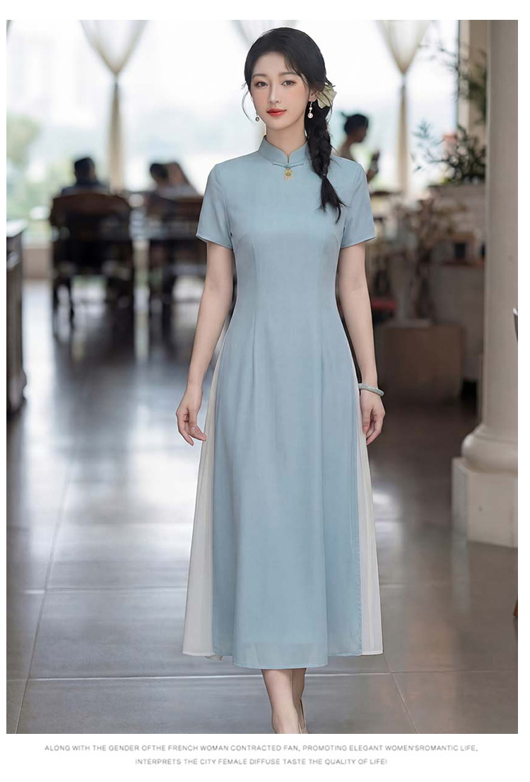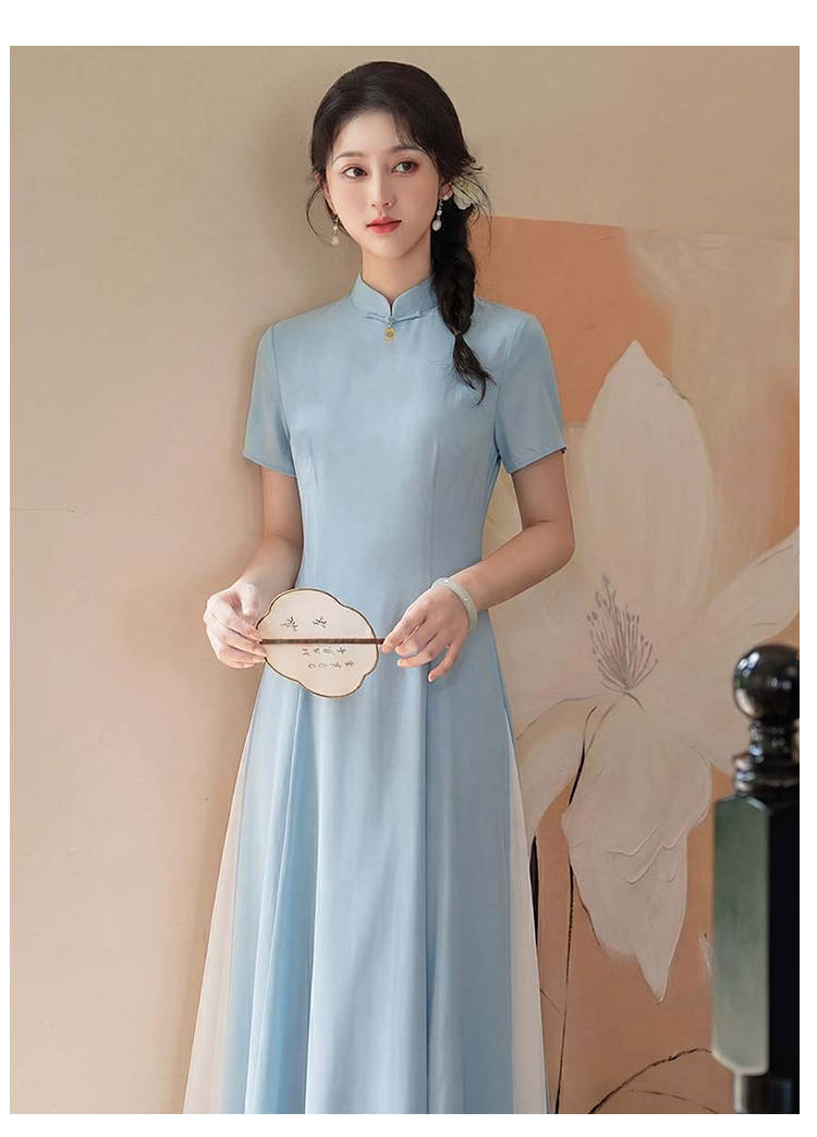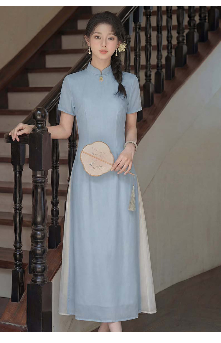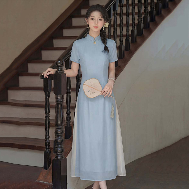 RY2663# 蓝色新中式国风高考送考旗袍薄纱连衣裙女夏气质收腰雪纺大摆长裙