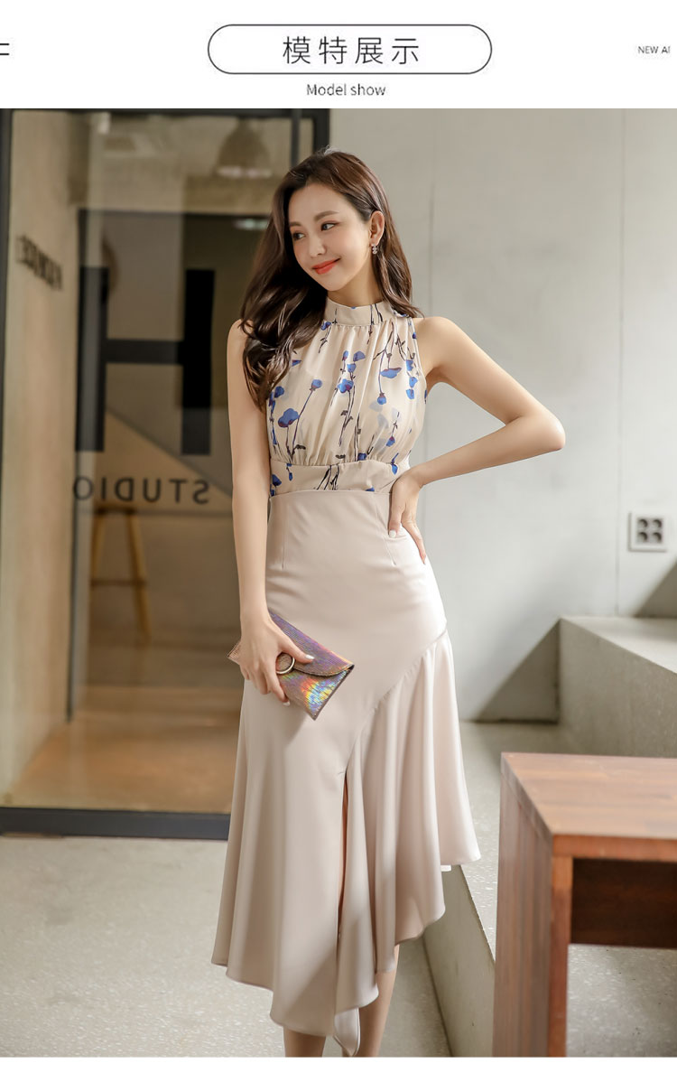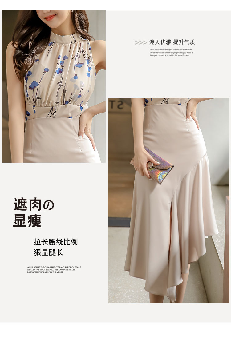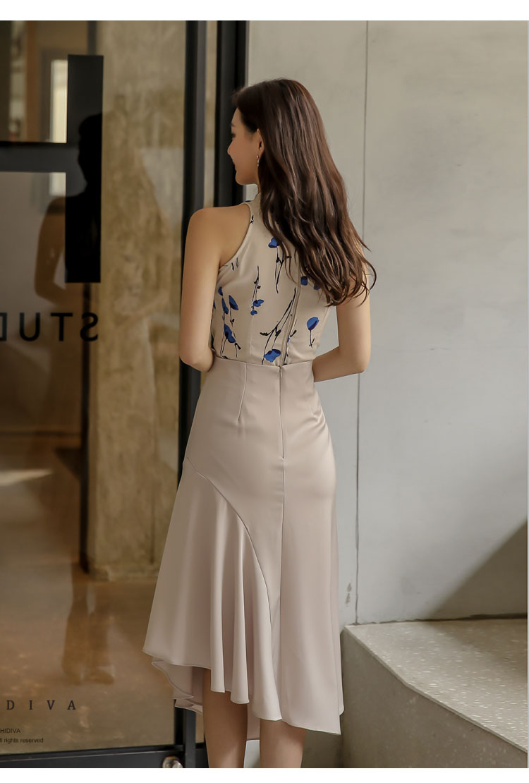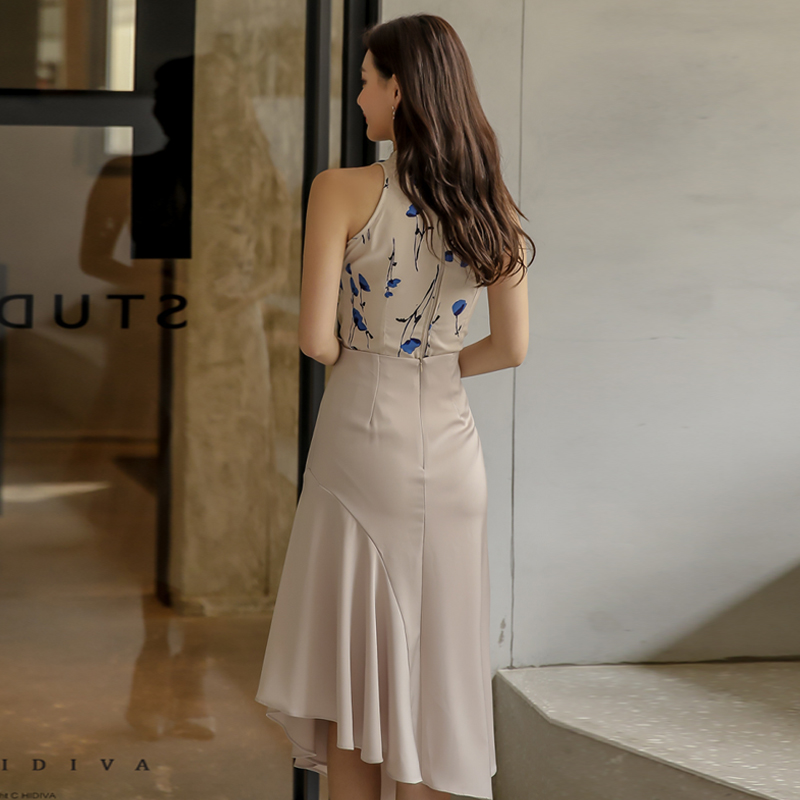 RY2671# 法式温柔风挂脖碎花裙女夏缎面质感收腰显瘦不规则鱼尾连衣裙