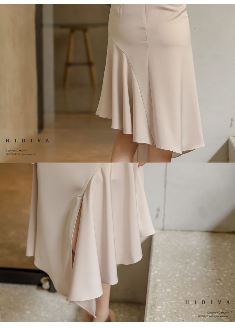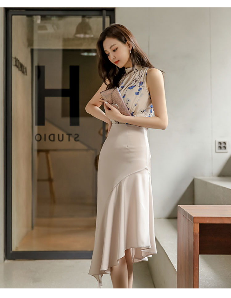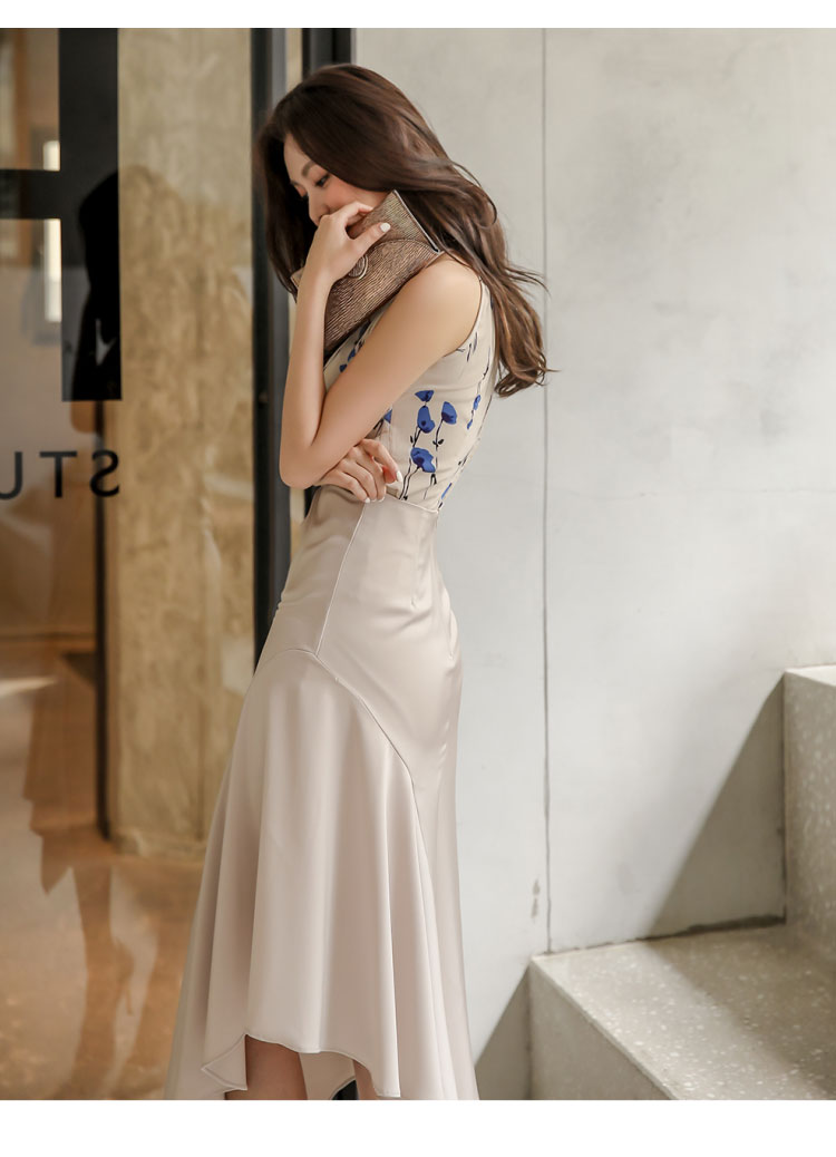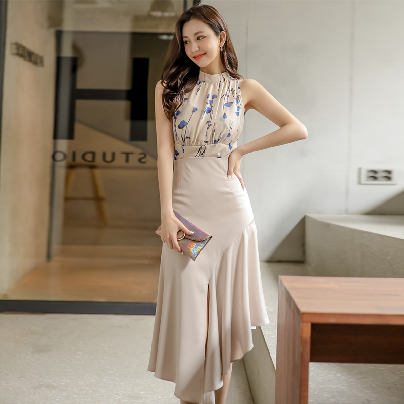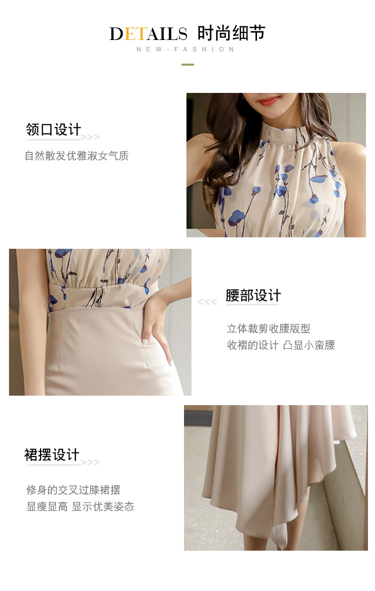 RY2671# 法式温柔风挂脖碎花裙女夏缎面质感收腰显瘦不规则鱼尾连衣裙