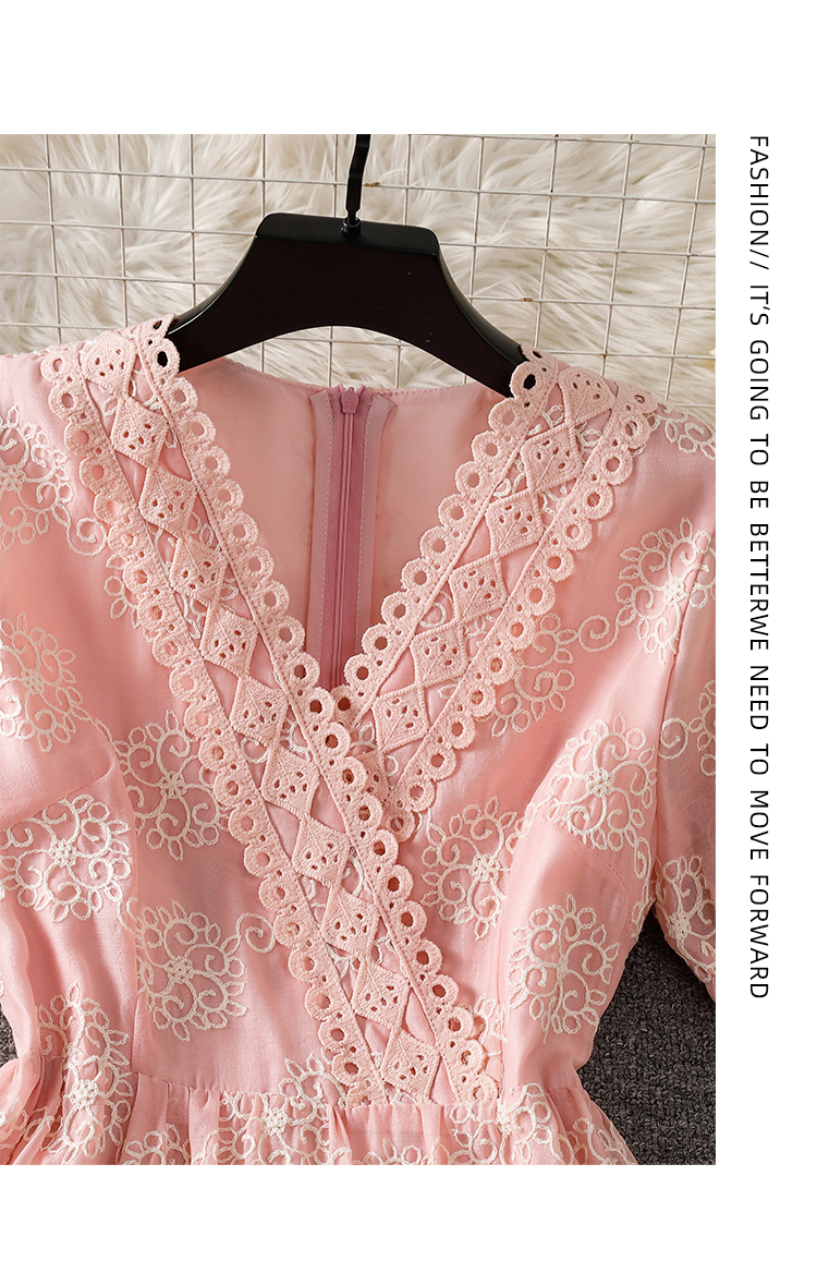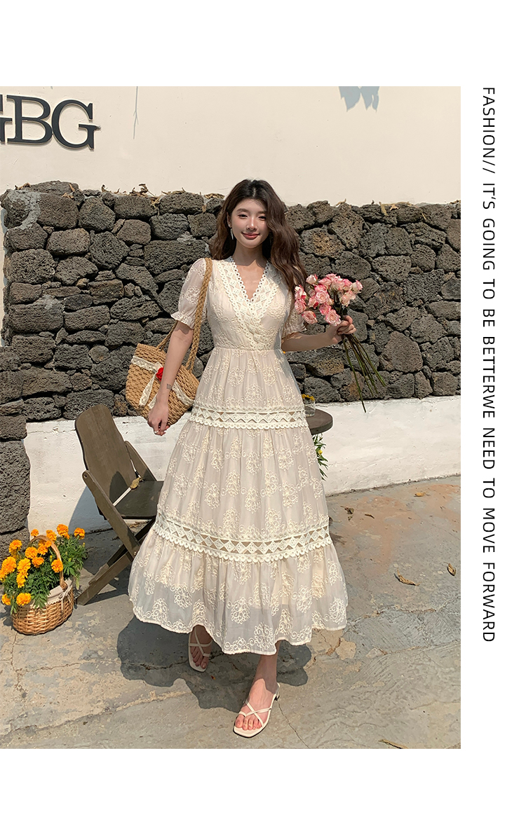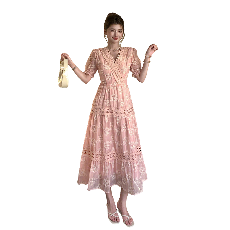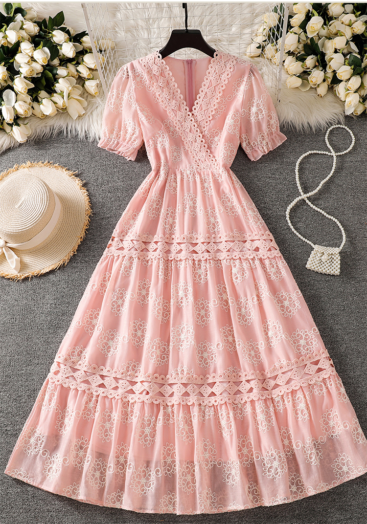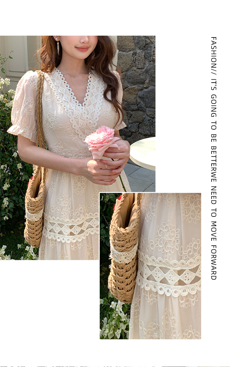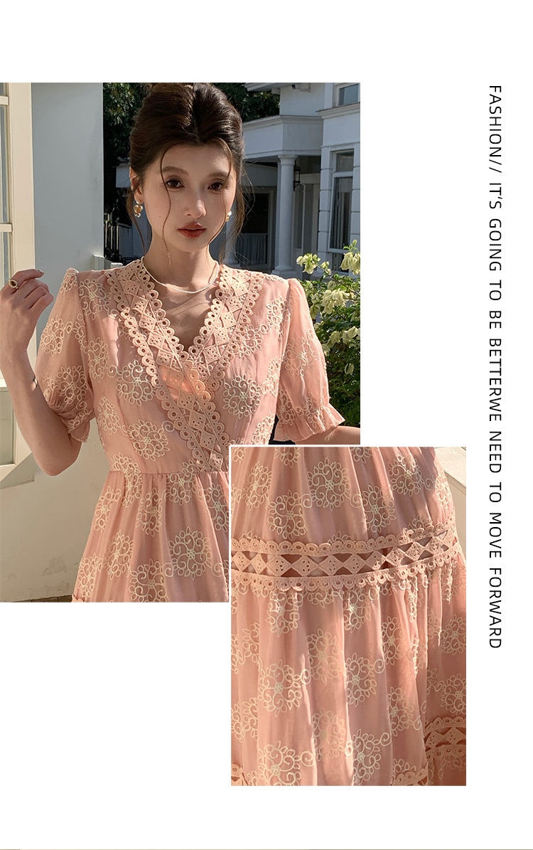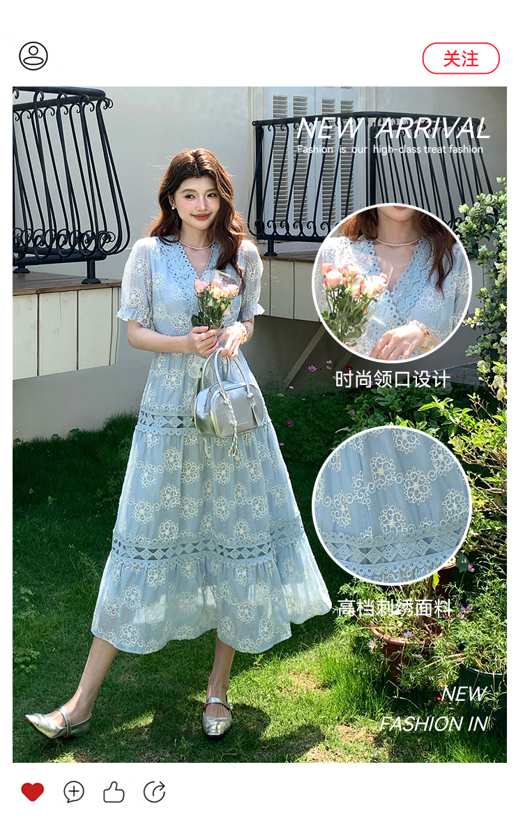 RY2698# 品质 夏季新款法式时尚刺绣拼接V领短袖收腰显瘦连衣裙
