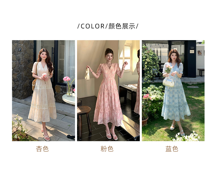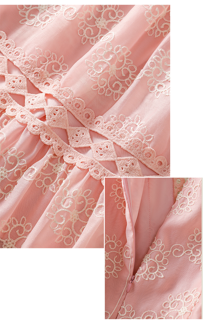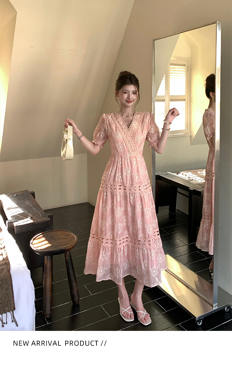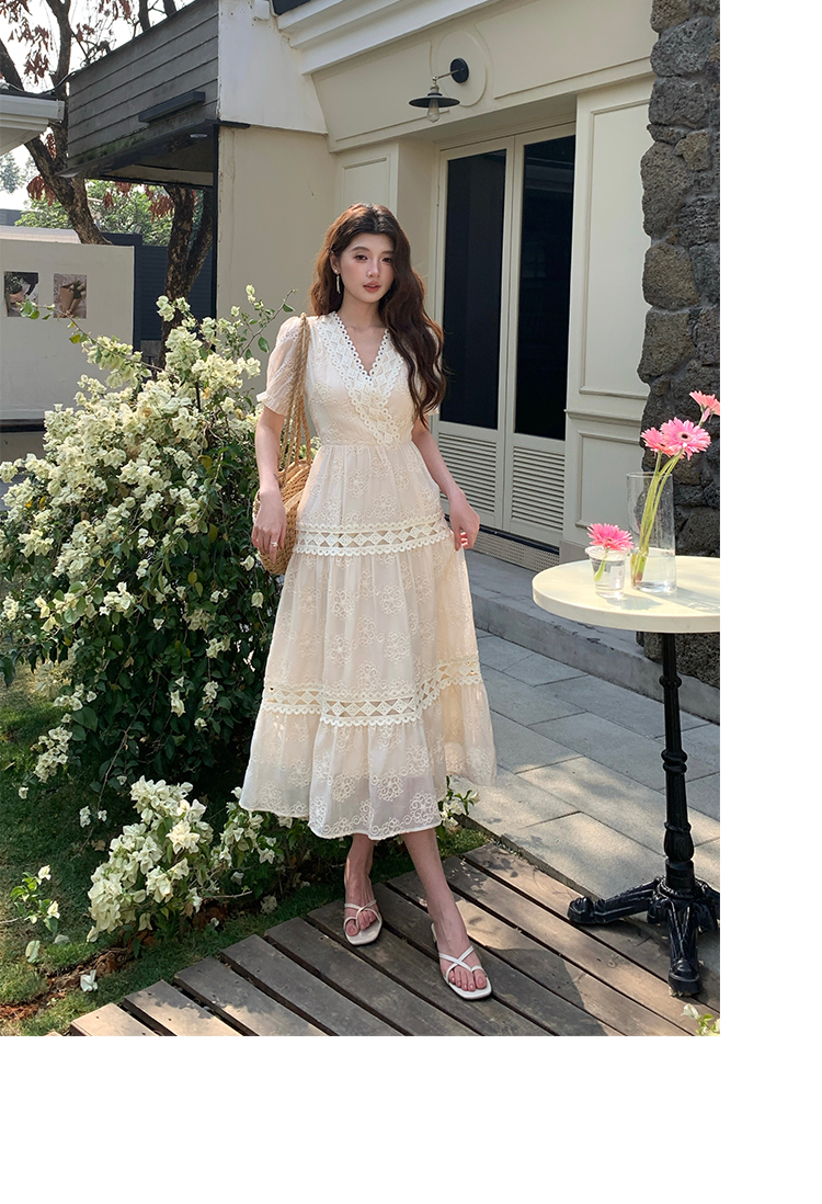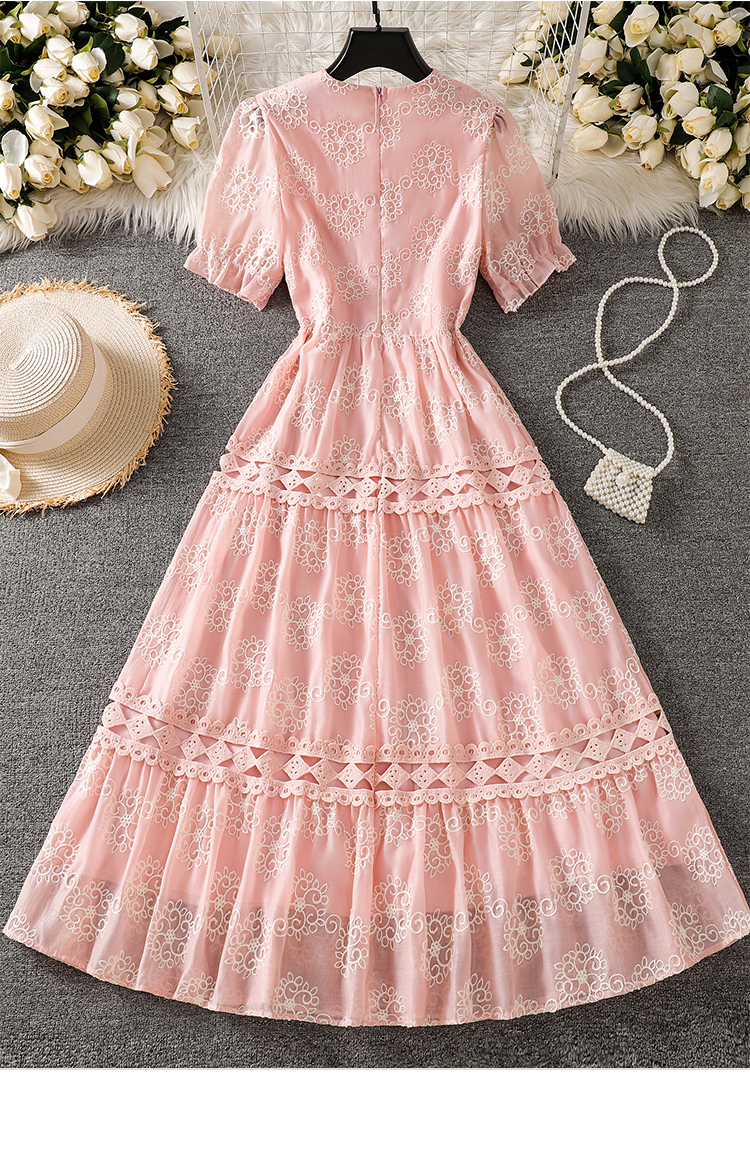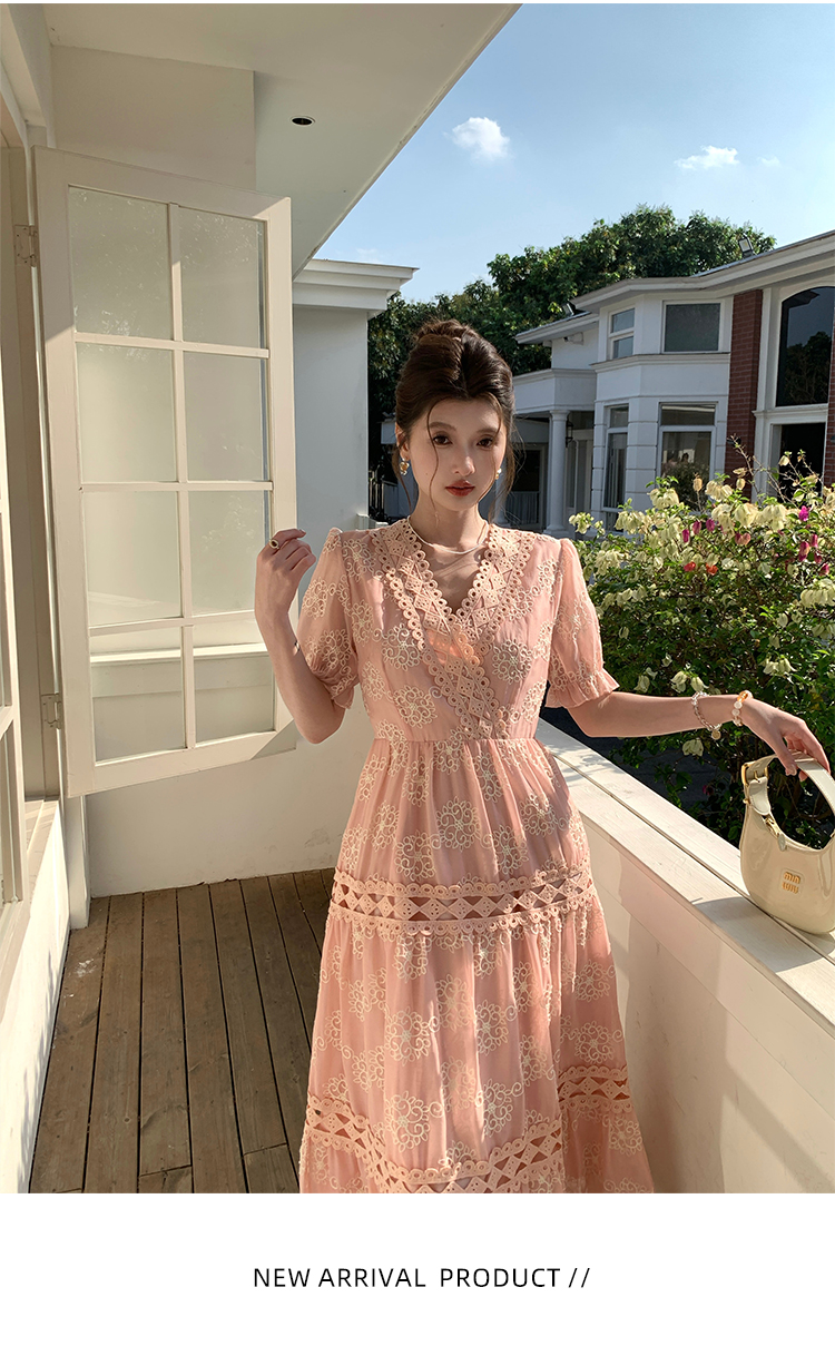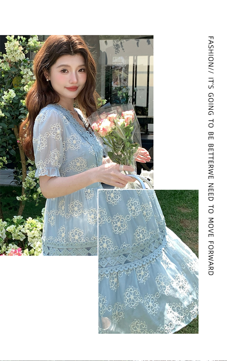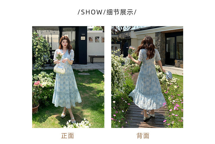 RY2698# 品质 夏季新款法式时尚刺绣拼接V领短袖收腰显瘦连衣裙