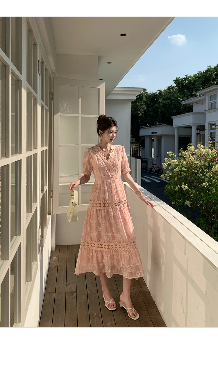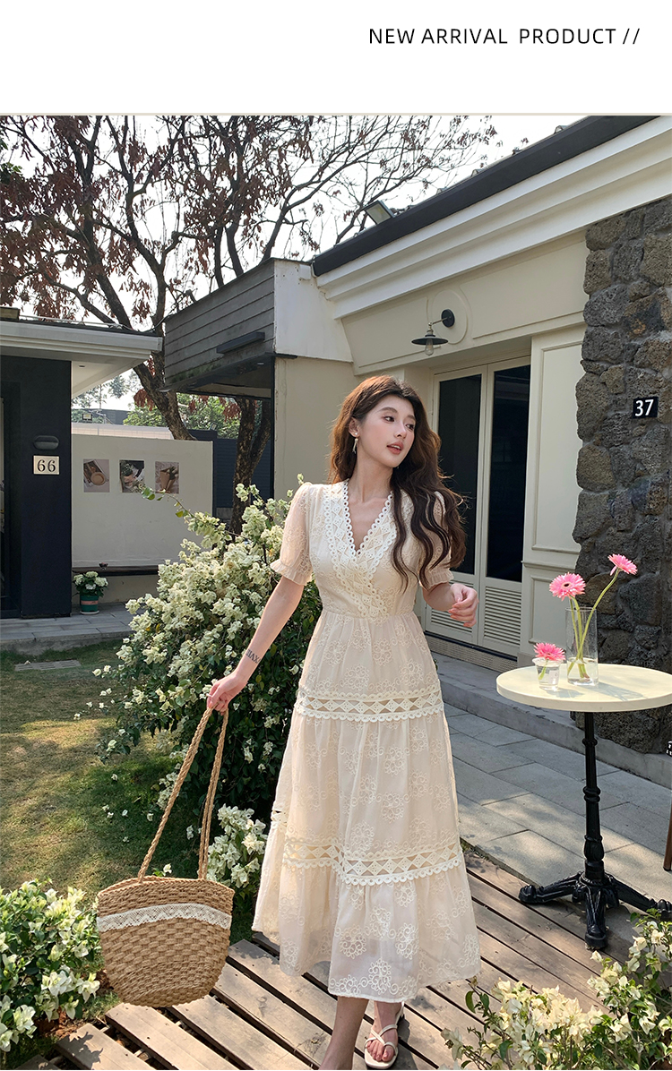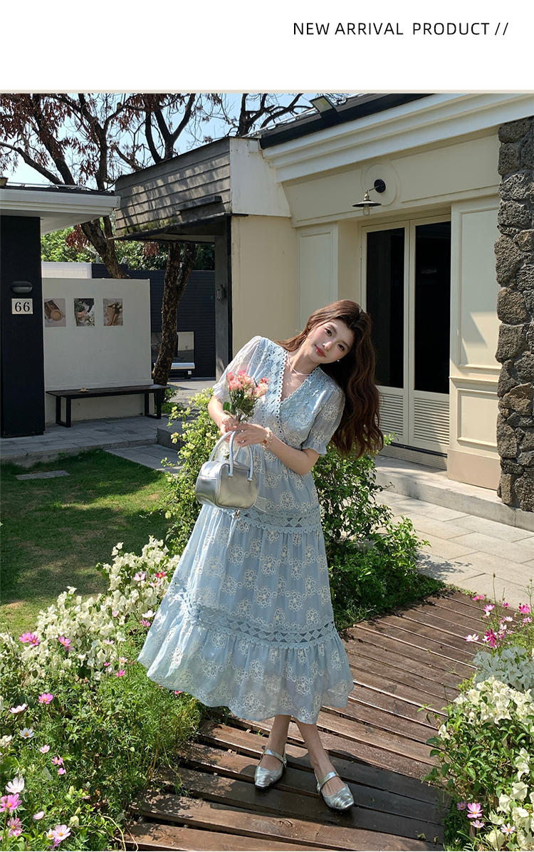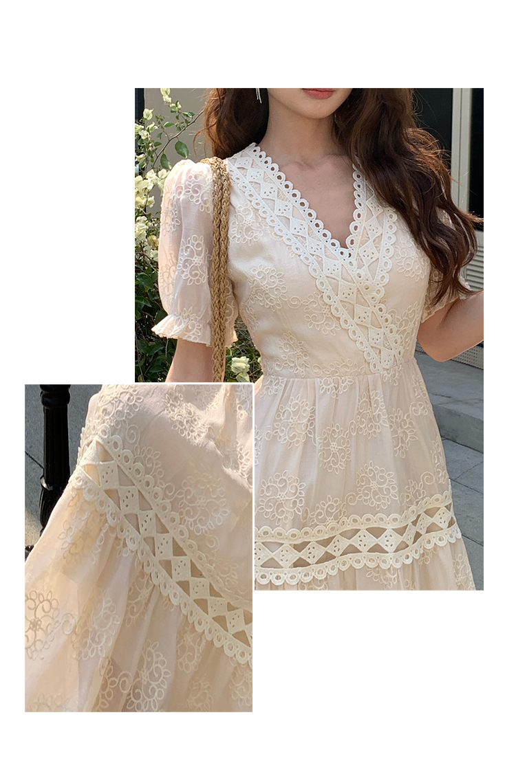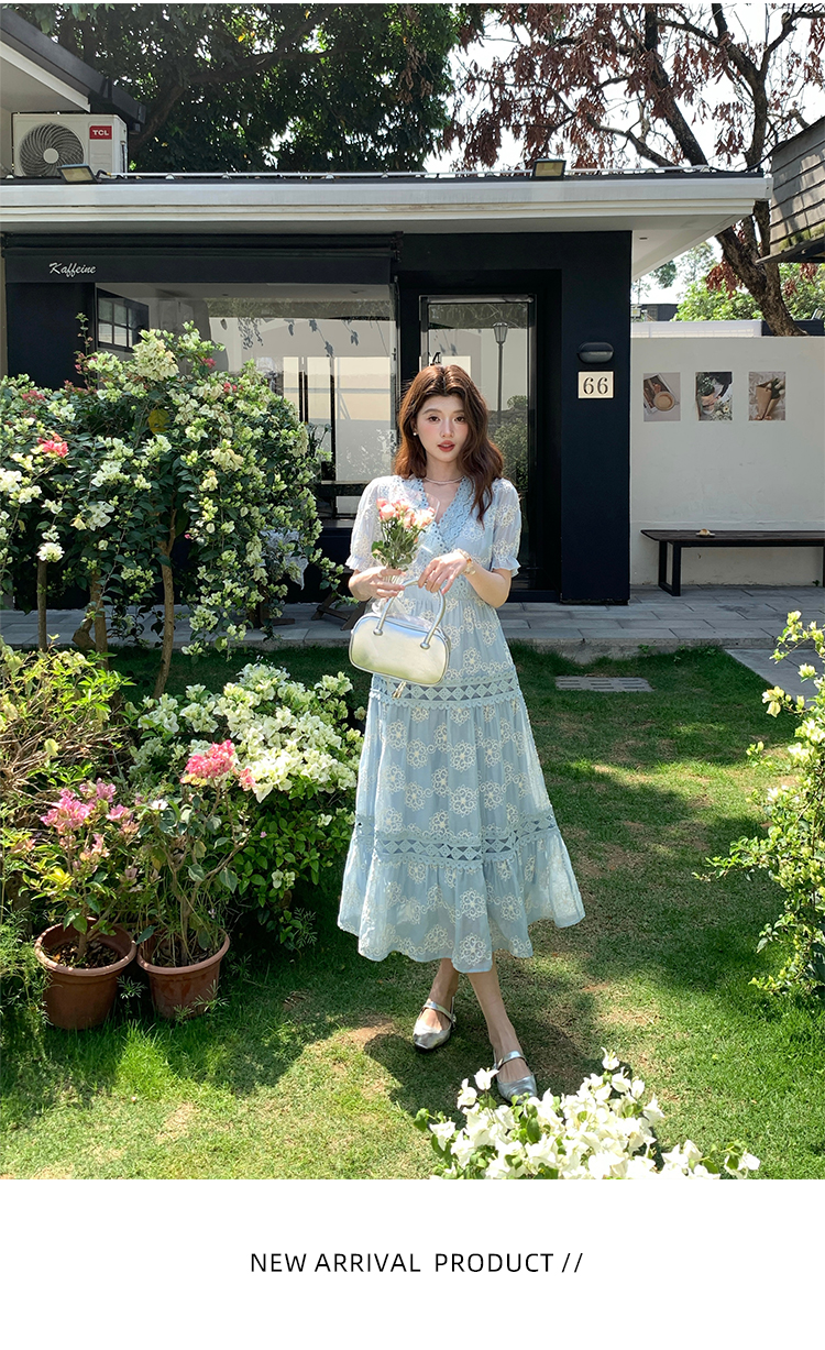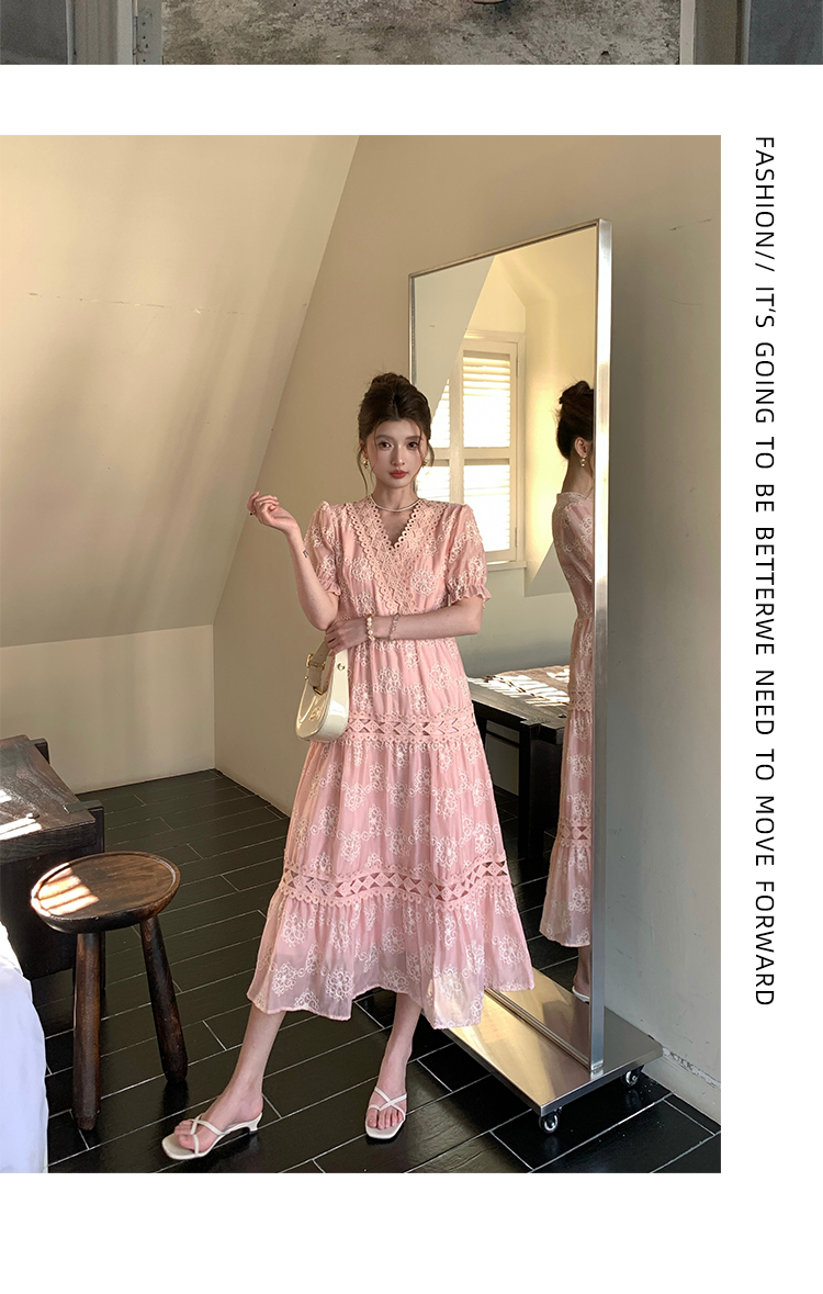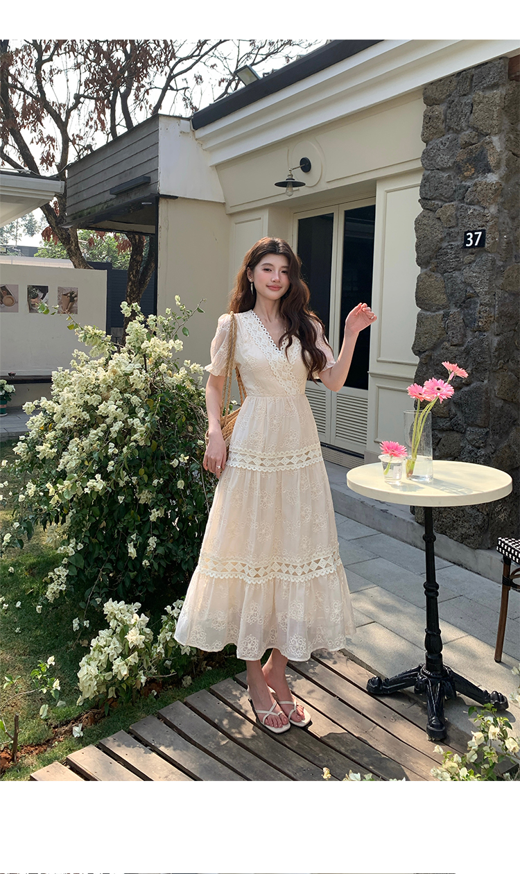 RY2698# 品质 夏季新款法式时尚刺绣拼接V领短袖收腰显瘦连衣裙