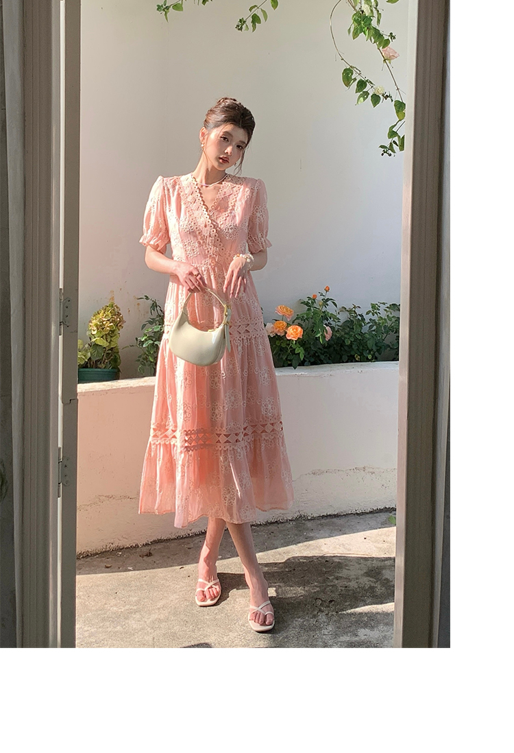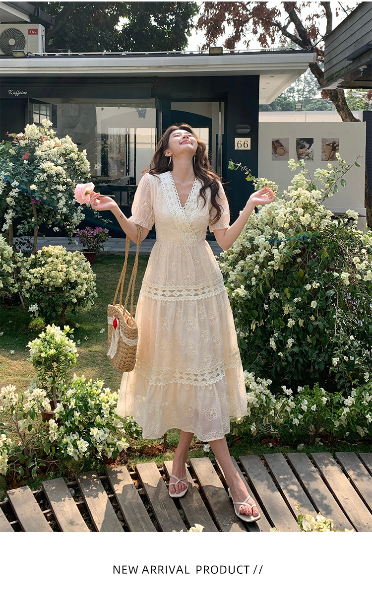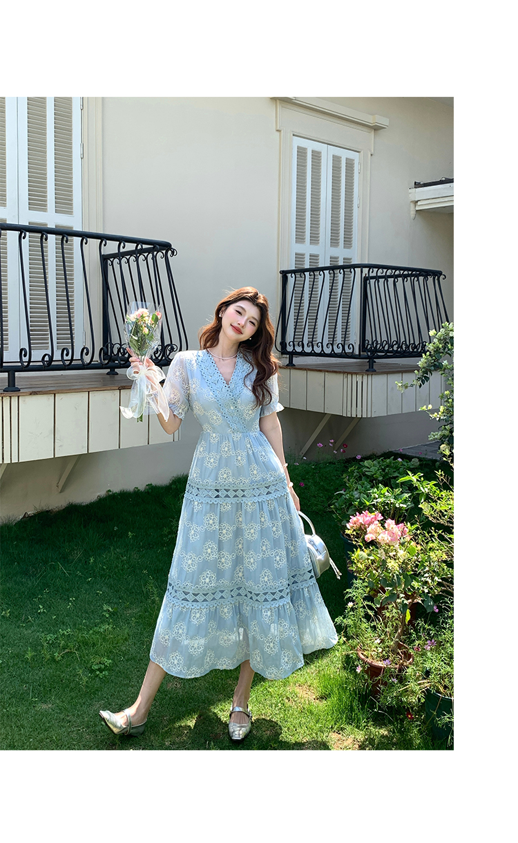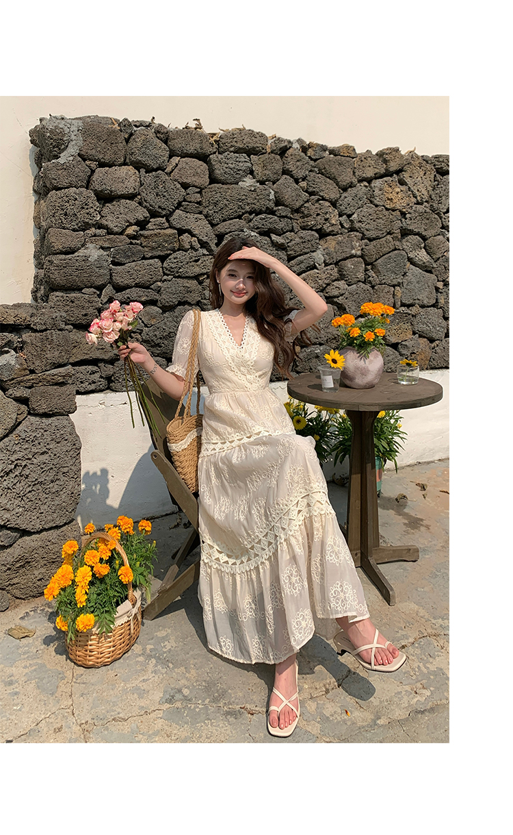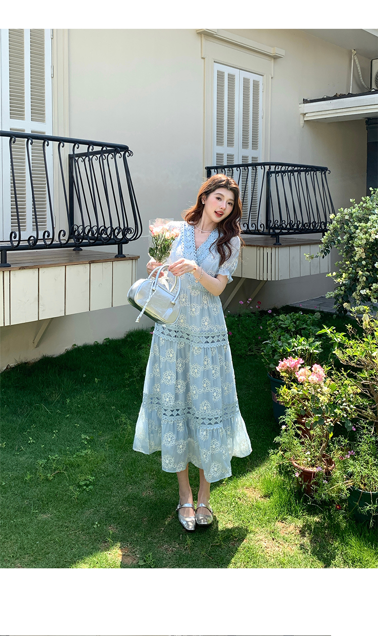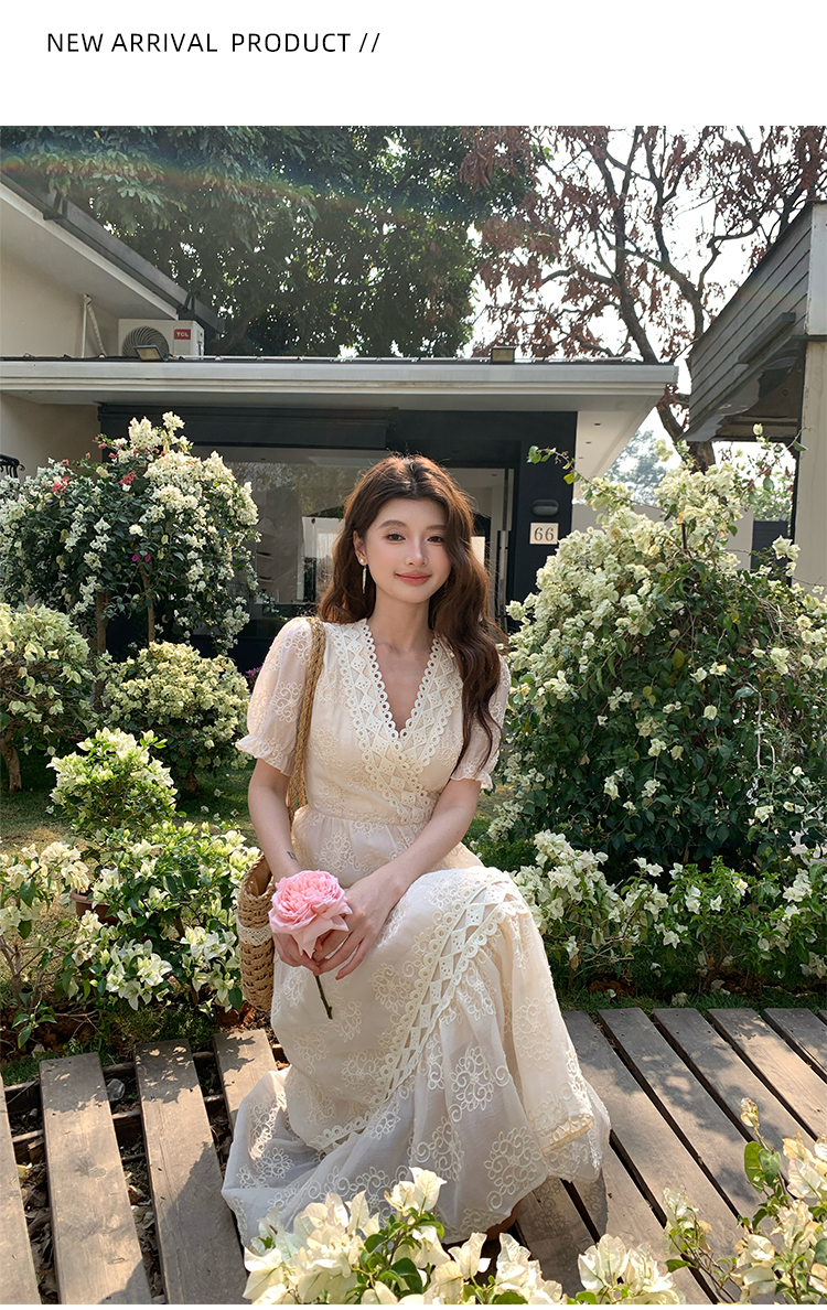 RY2698# 品质 夏季新款法式时尚刺绣拼接V领短袖收腰显瘦连衣裙