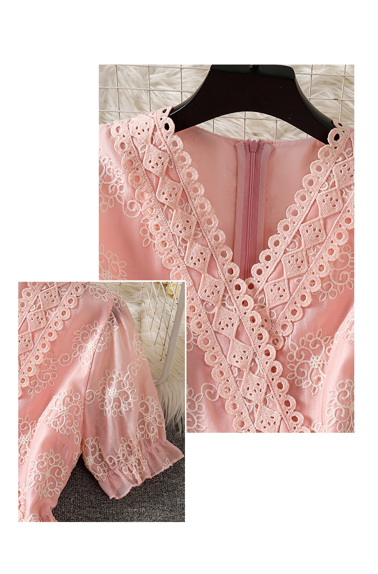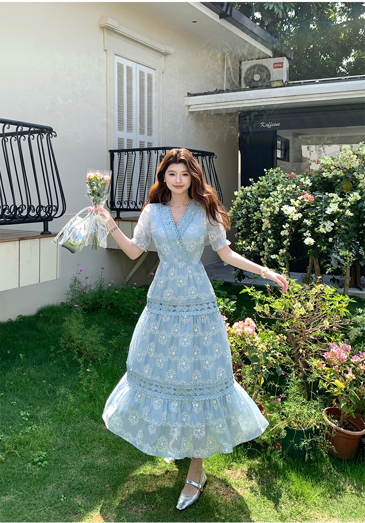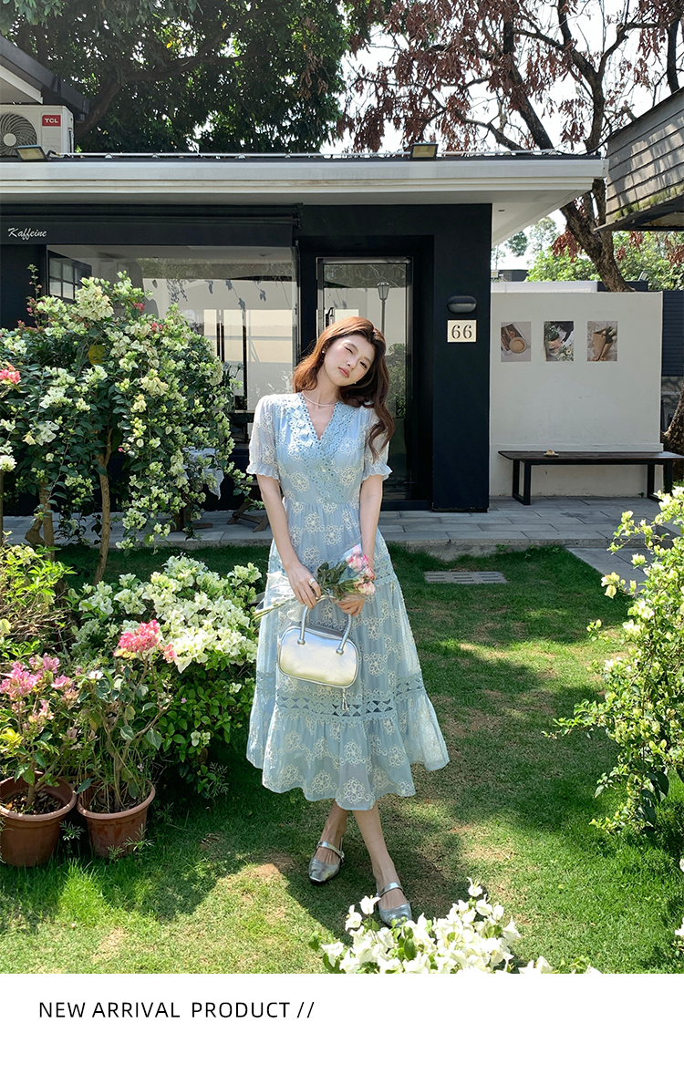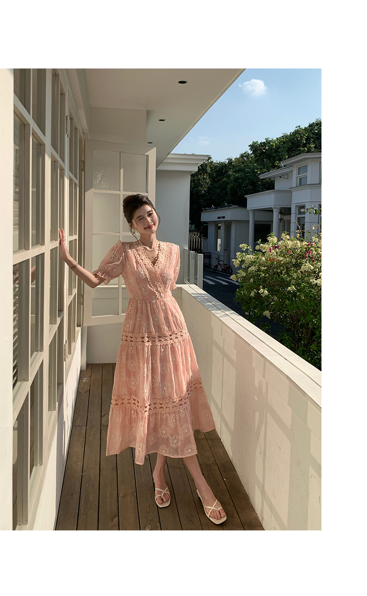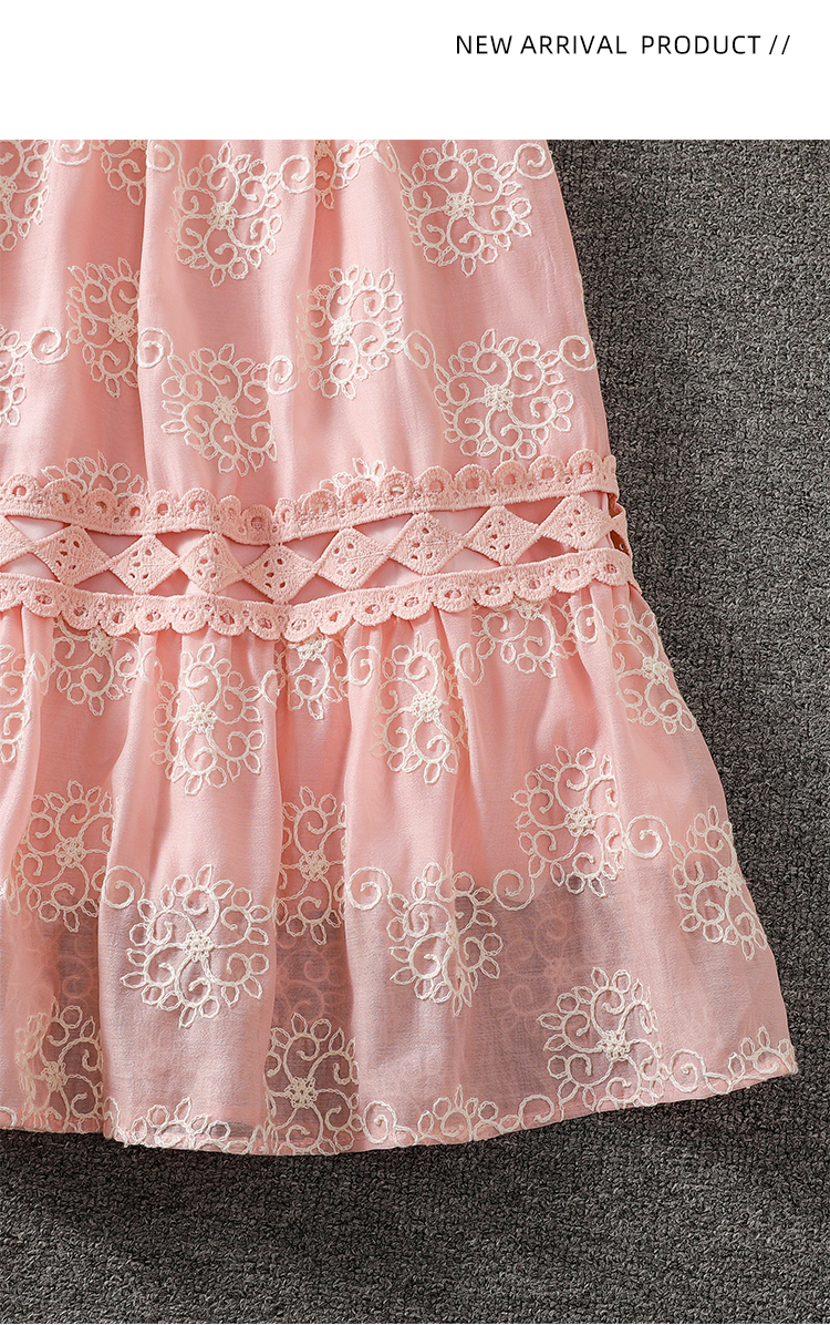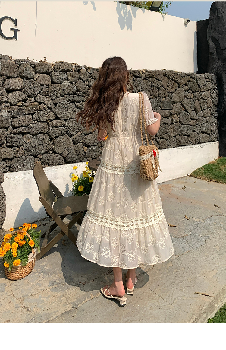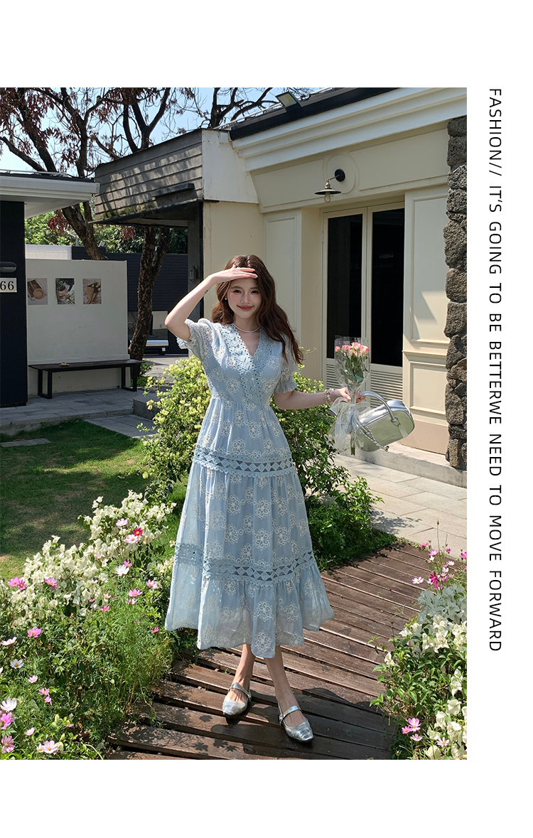 RY2698# 品质 夏季新款法式时尚刺绣拼接V领短袖收腰显瘦连衣裙
