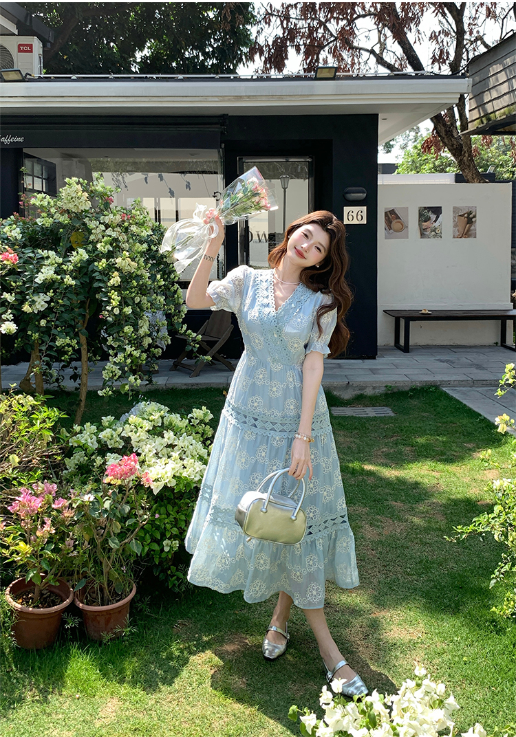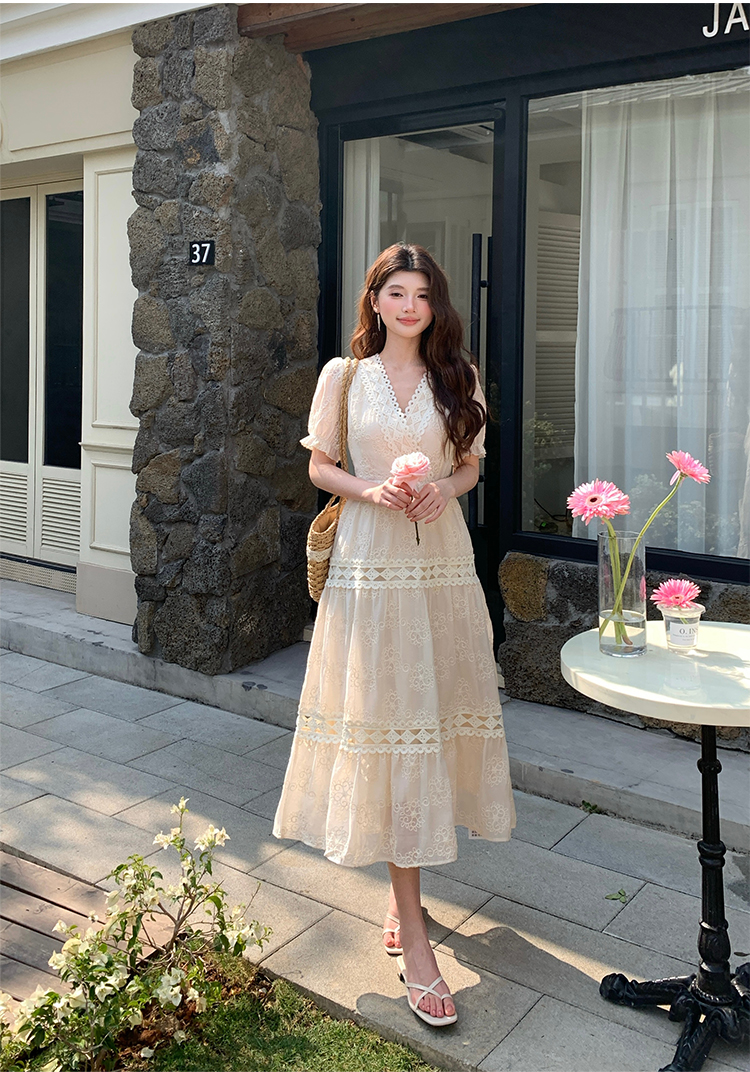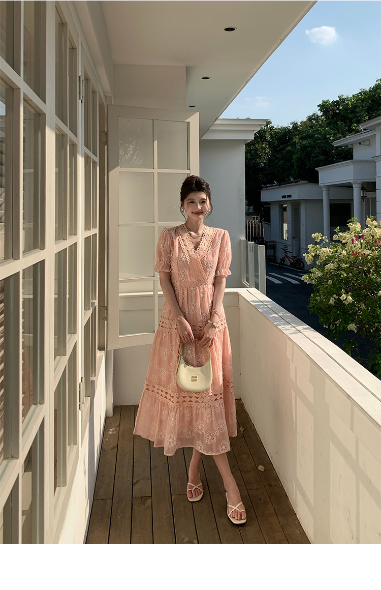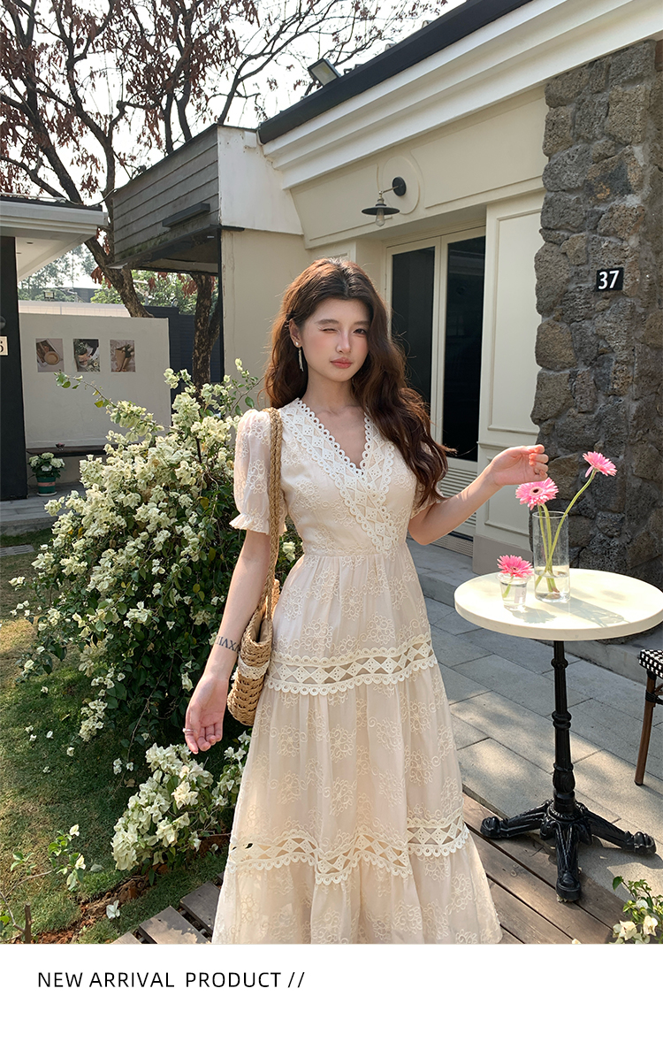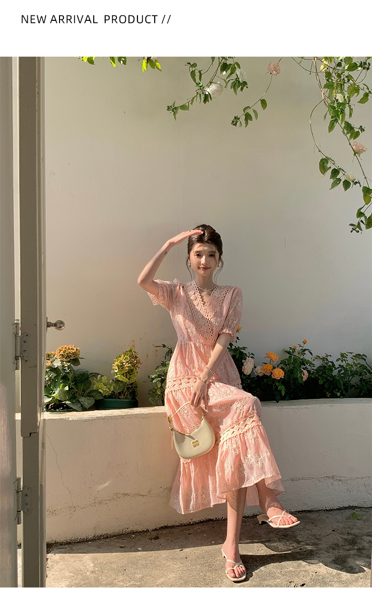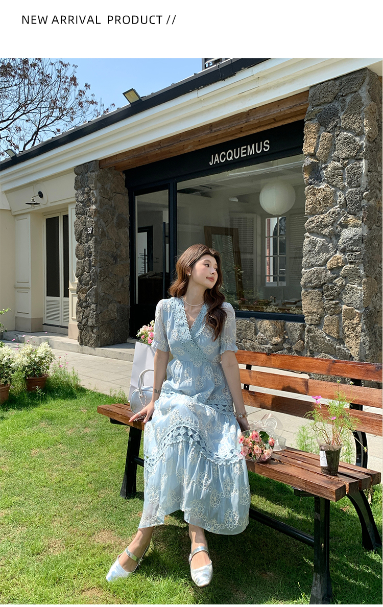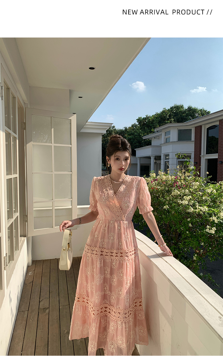RY2698# 品质 夏季新款法式时尚刺绣拼接V领短袖收腰显瘦连衣裙