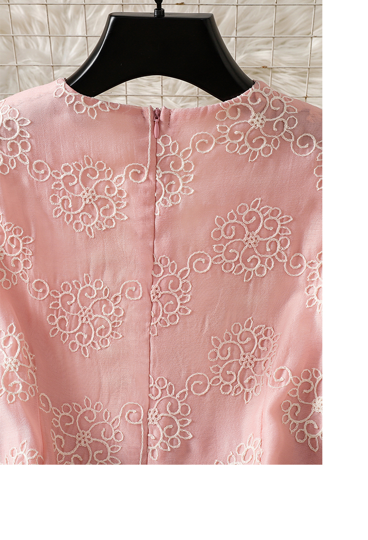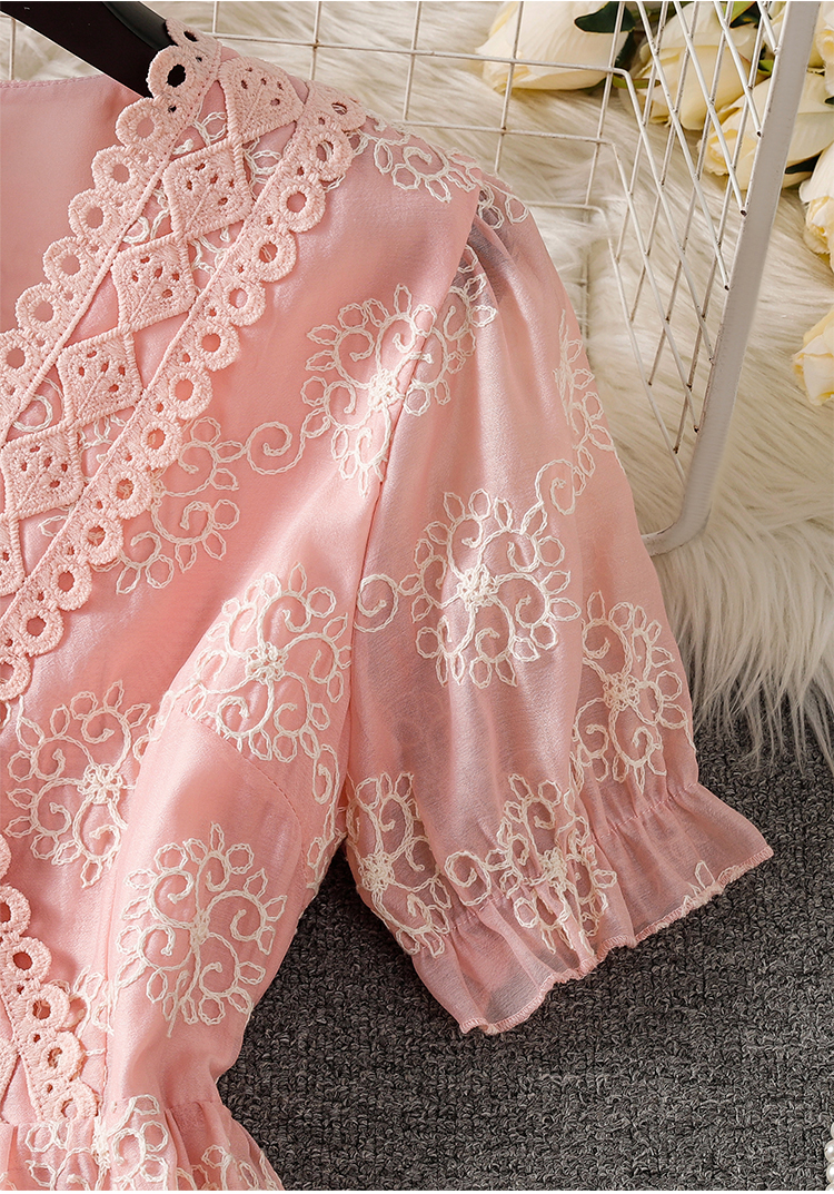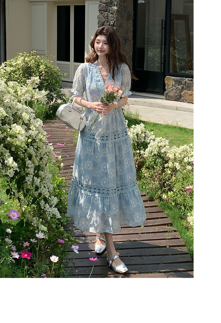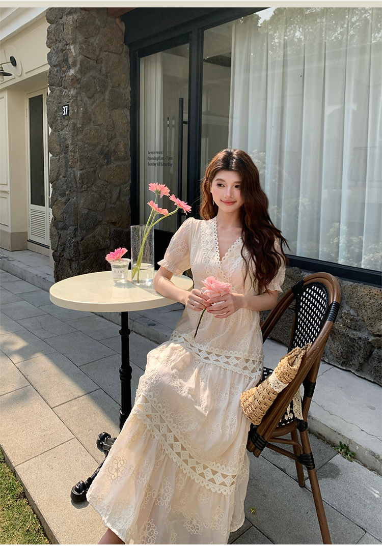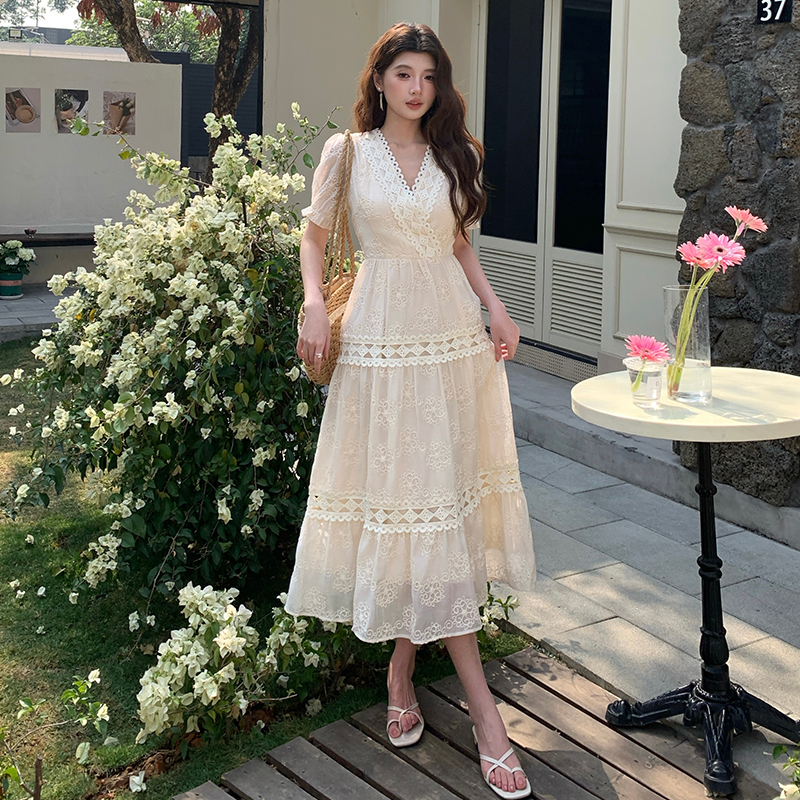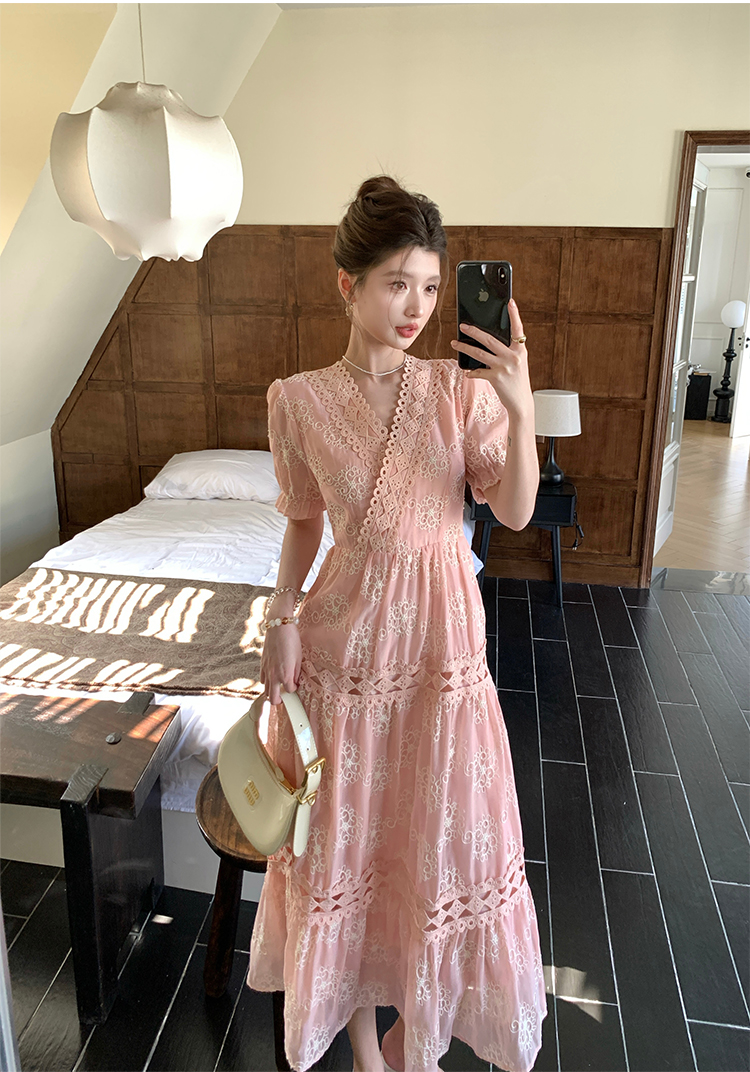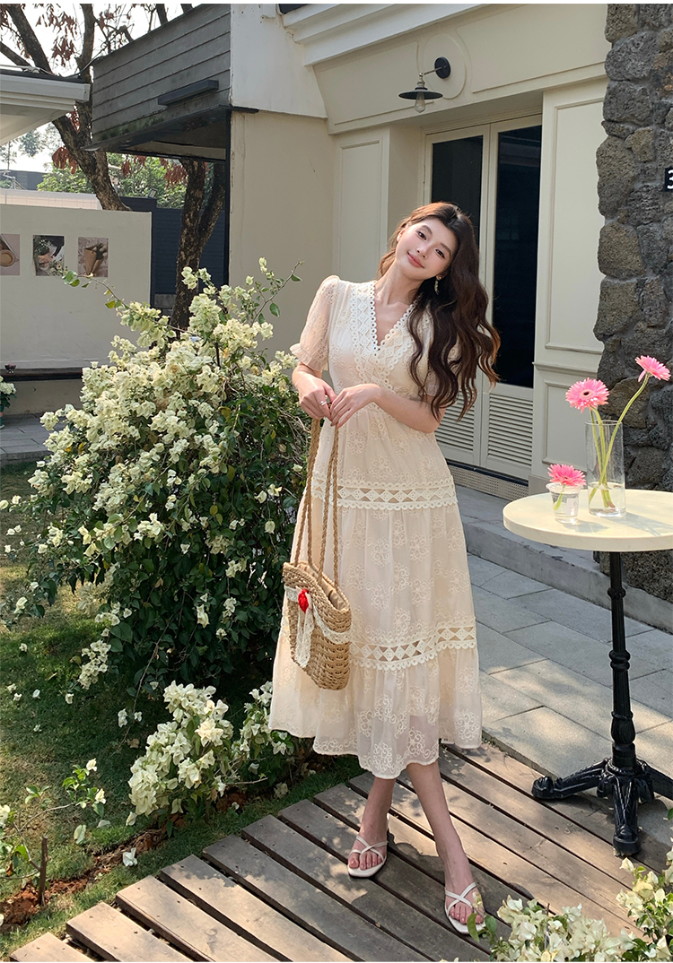 RY2698# 品质 夏季新款法式时尚刺绣拼接V领短袖收腰显瘦连衣裙