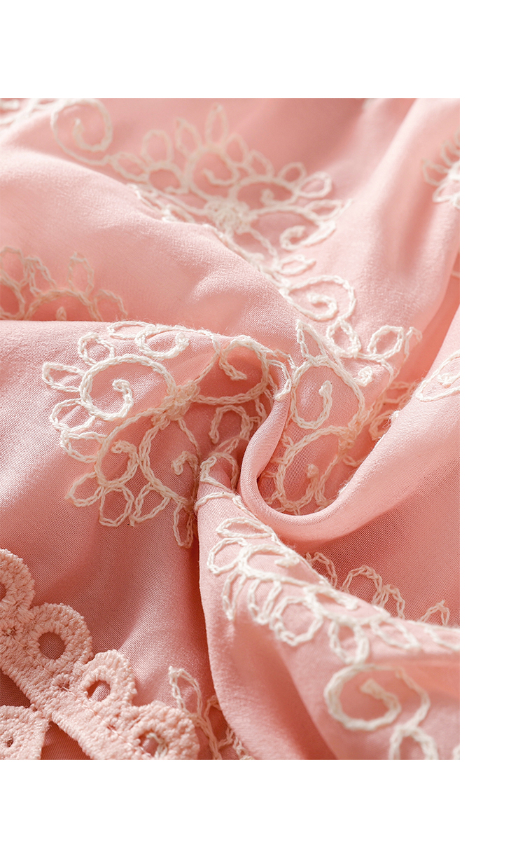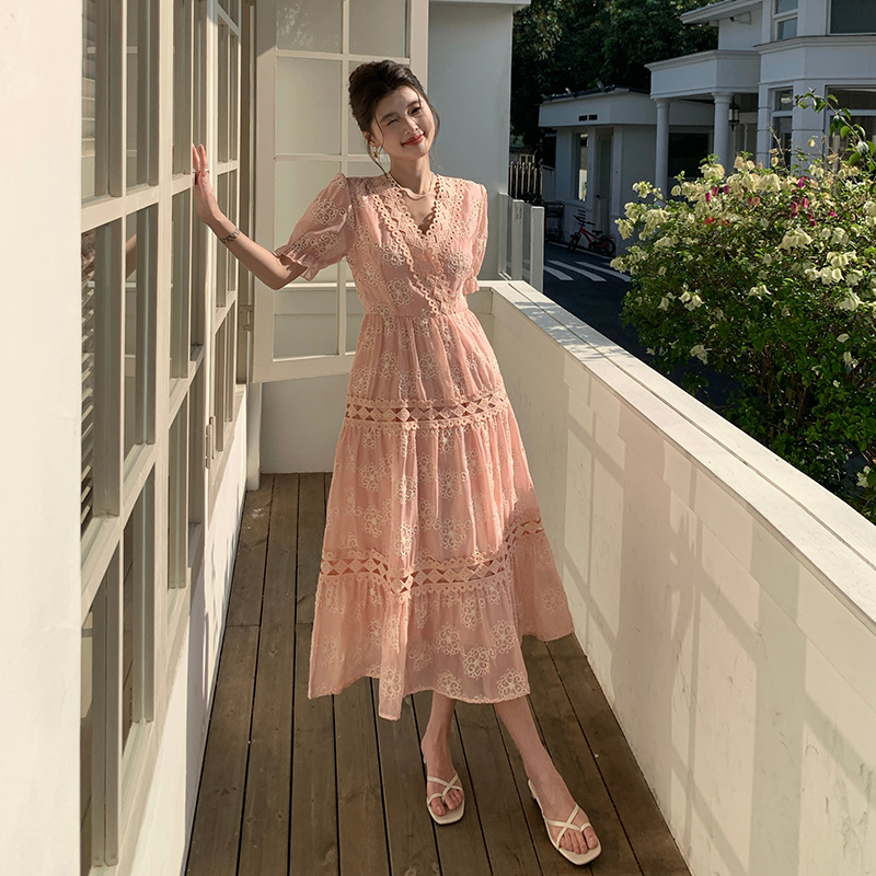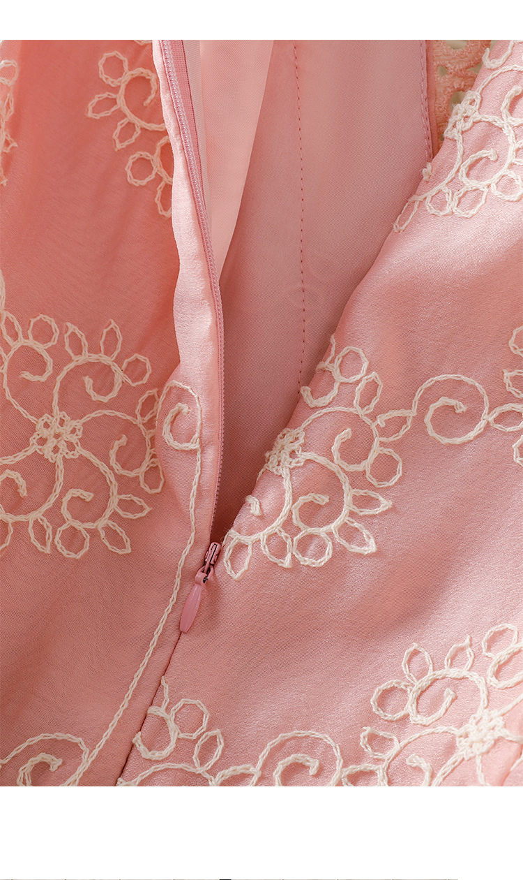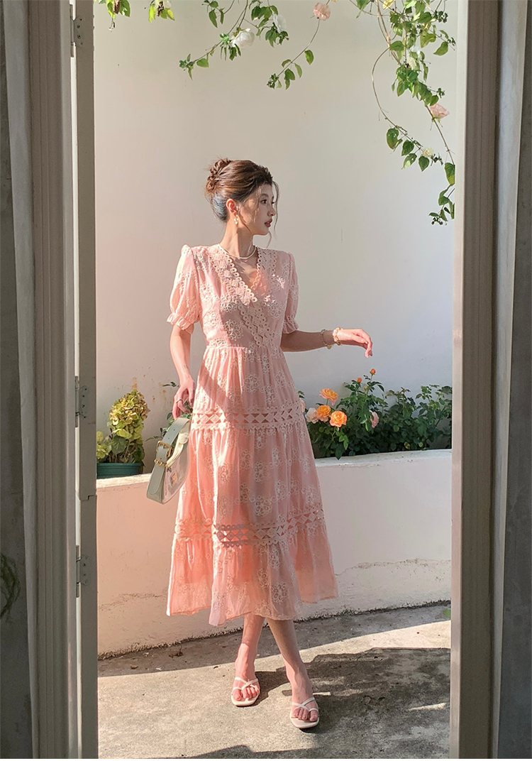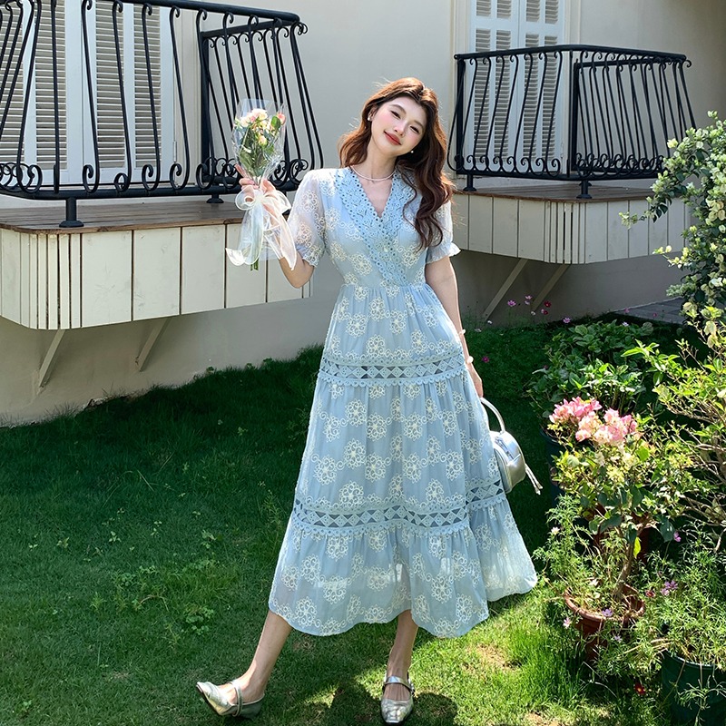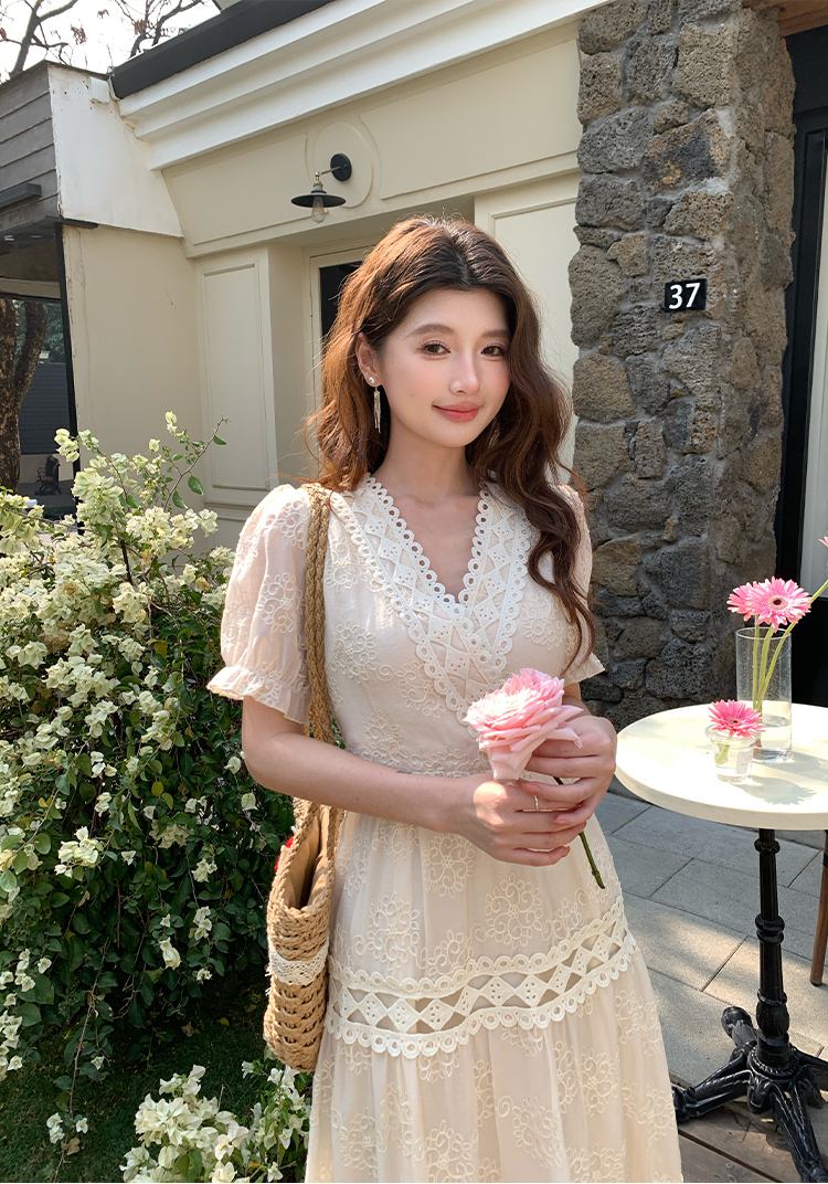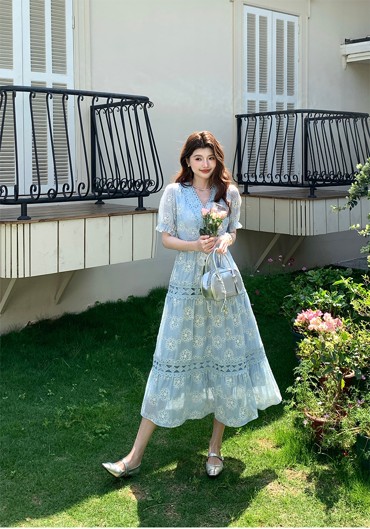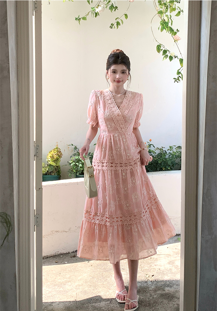 RY2698# 品质 夏季新款法式时尚刺绣拼接V领短袖收腰显瘦连衣裙