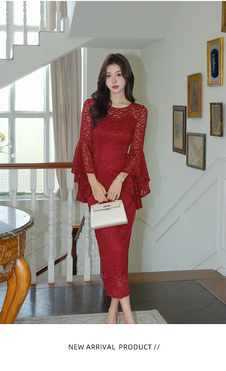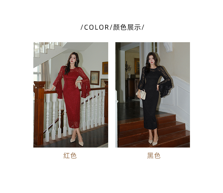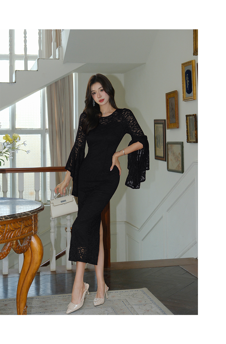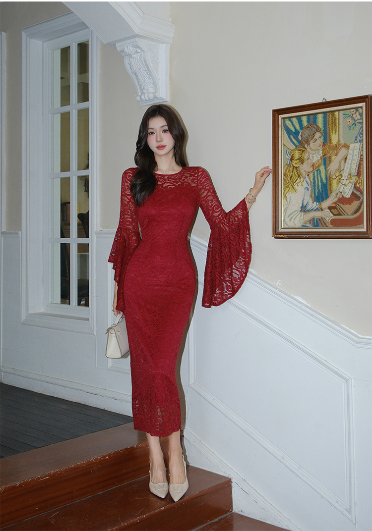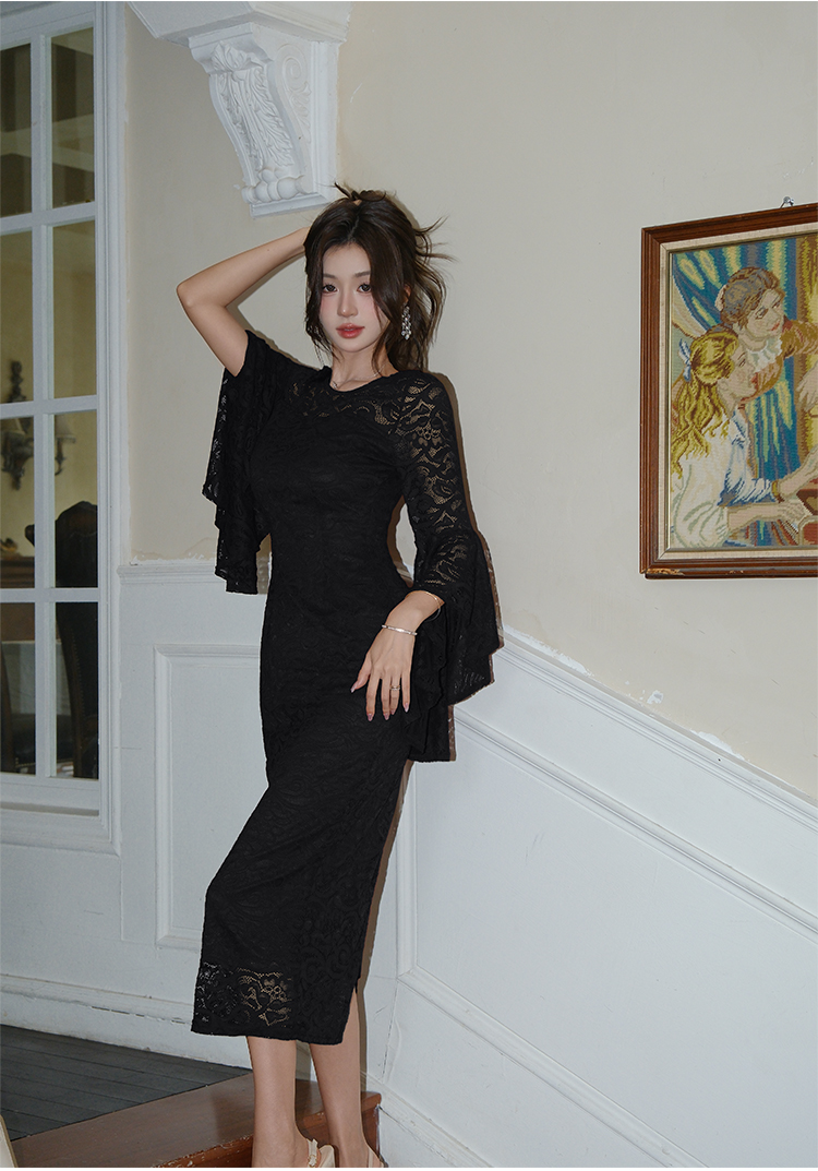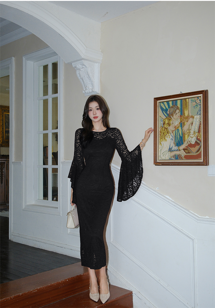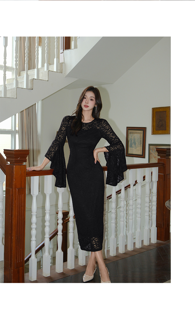RY2704# 品质 名媛纯欲性感蕾丝圆领喇叭袖收腰包臀连衣裙