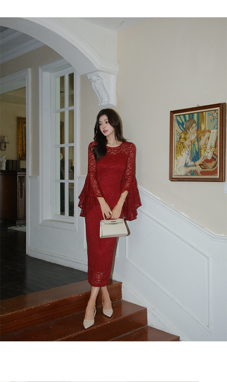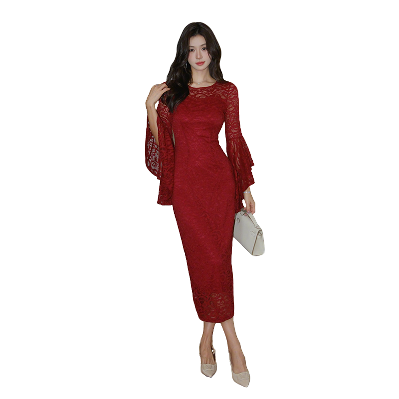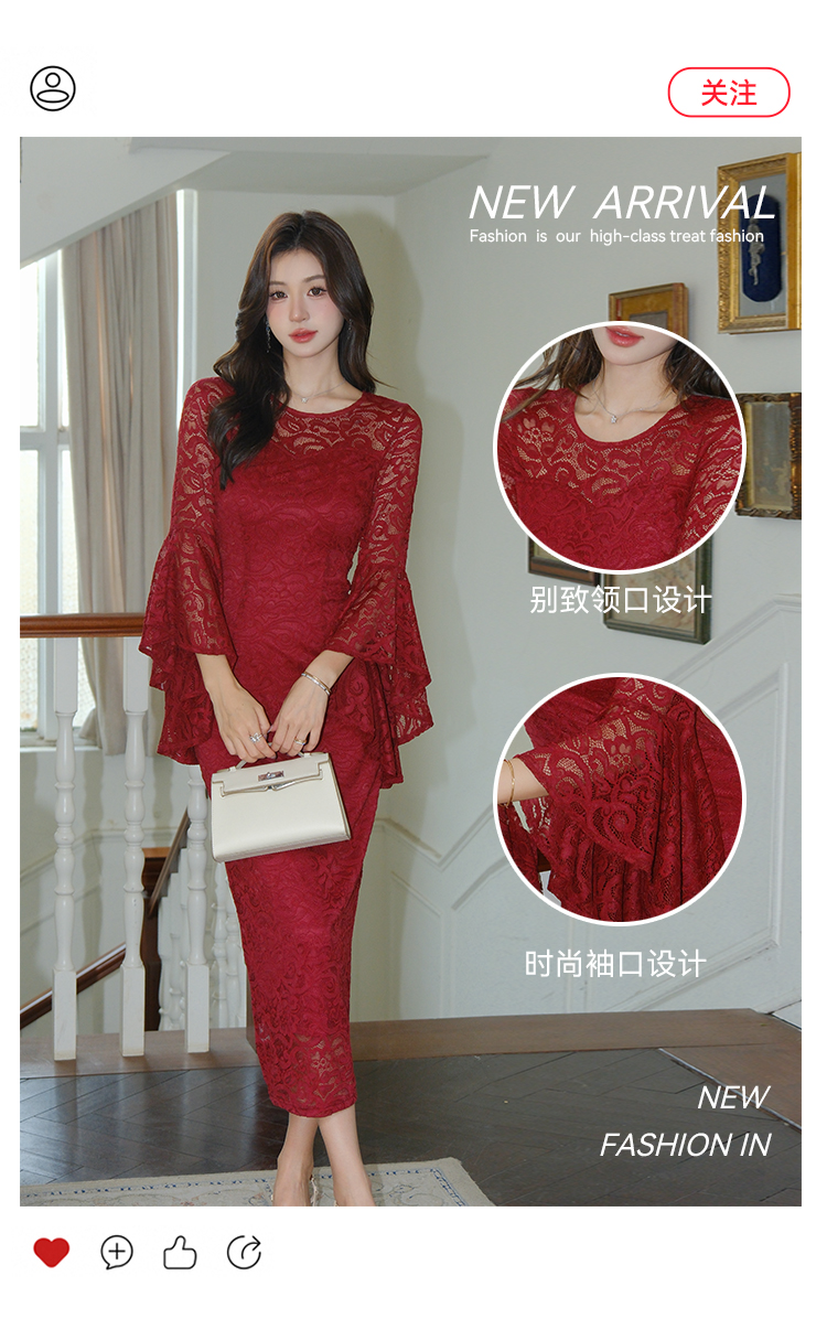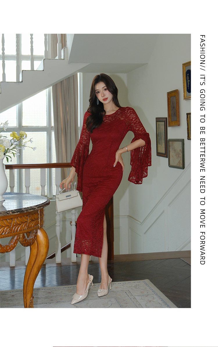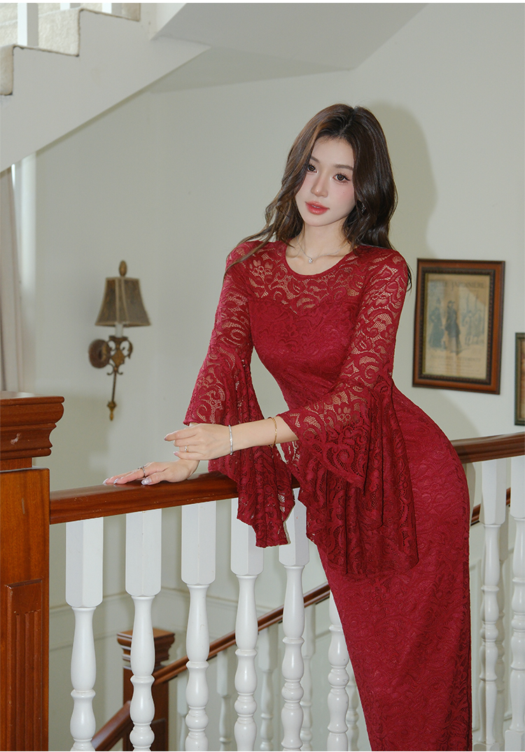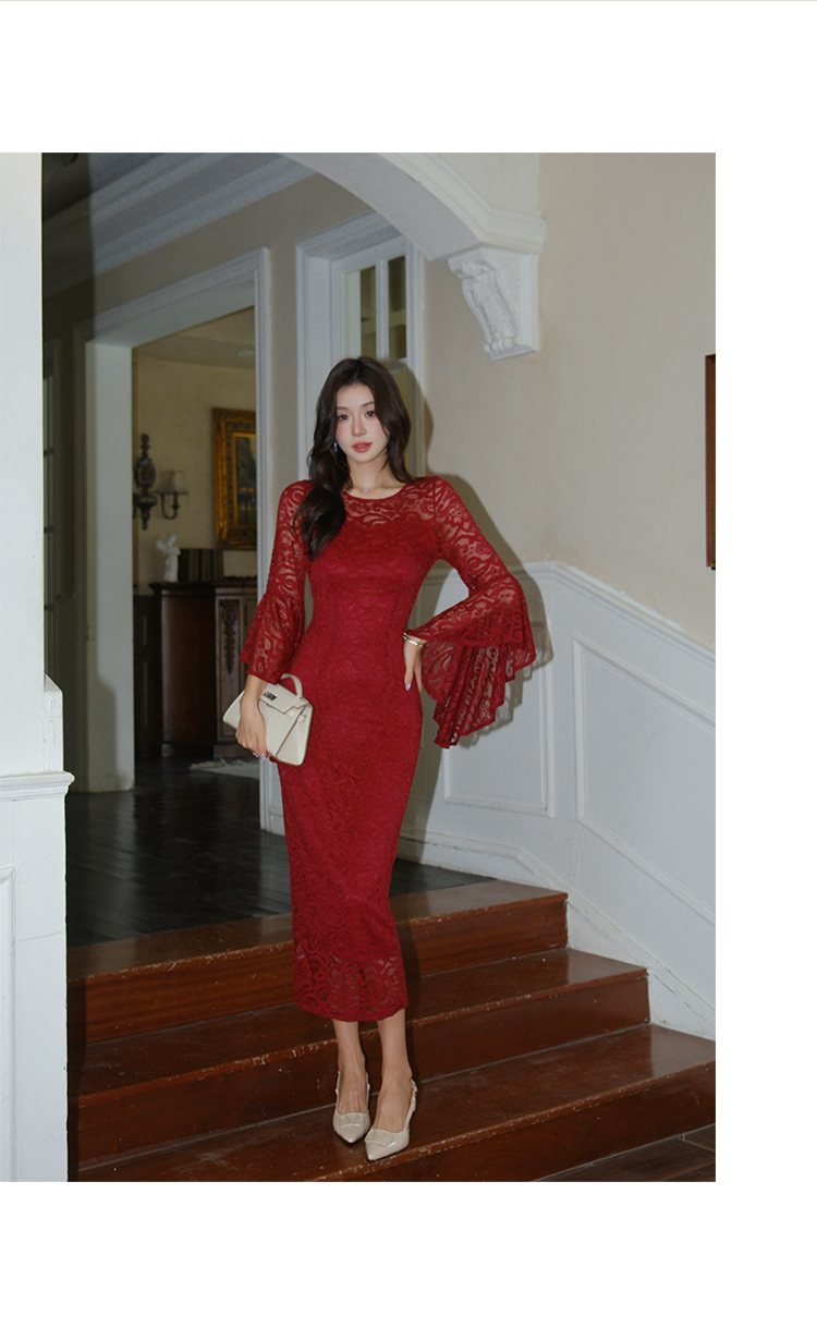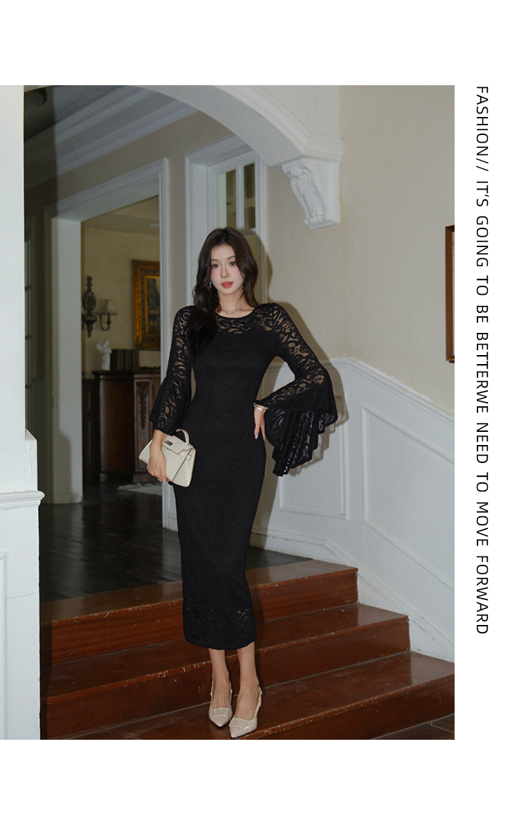 RY2704# 品质 名媛纯欲性感蕾丝圆领喇叭袖收腰包臀连衣裙