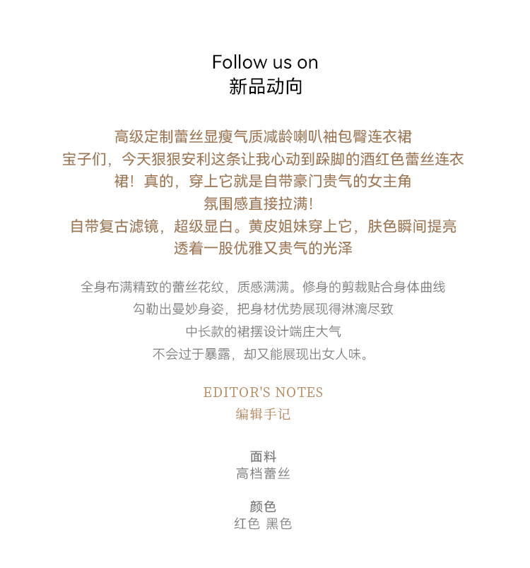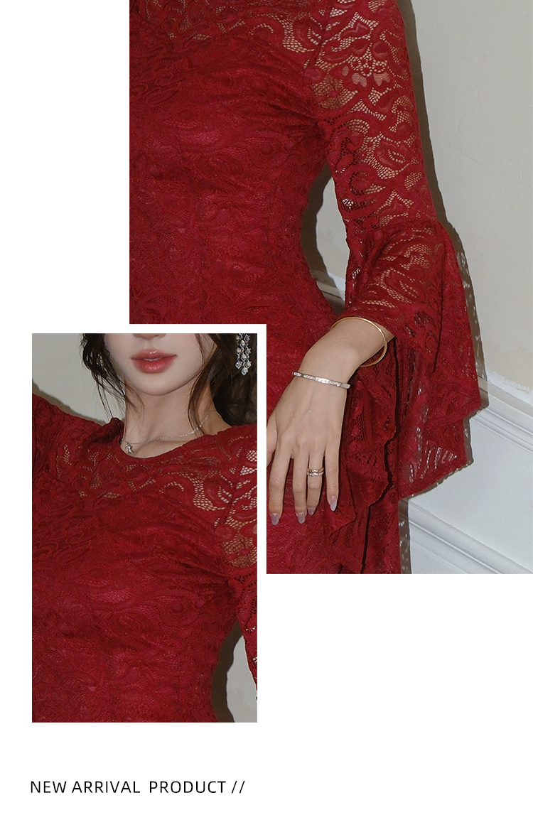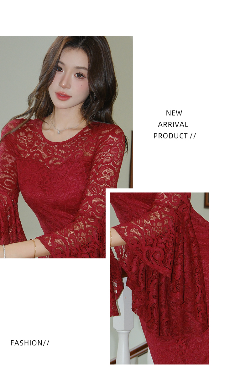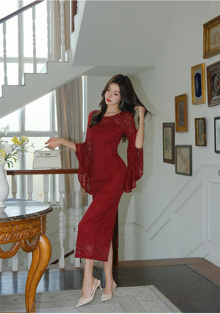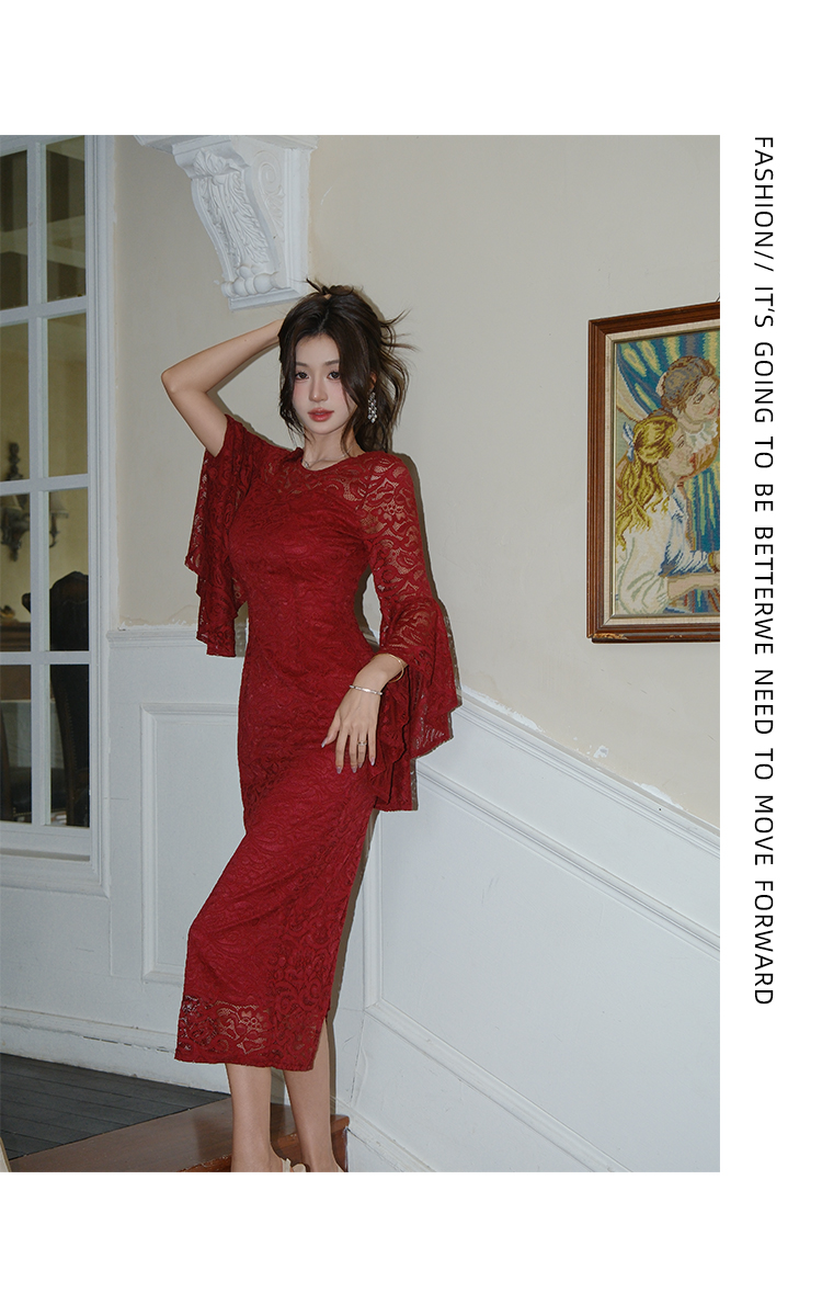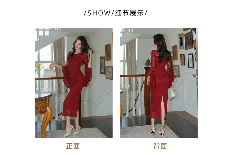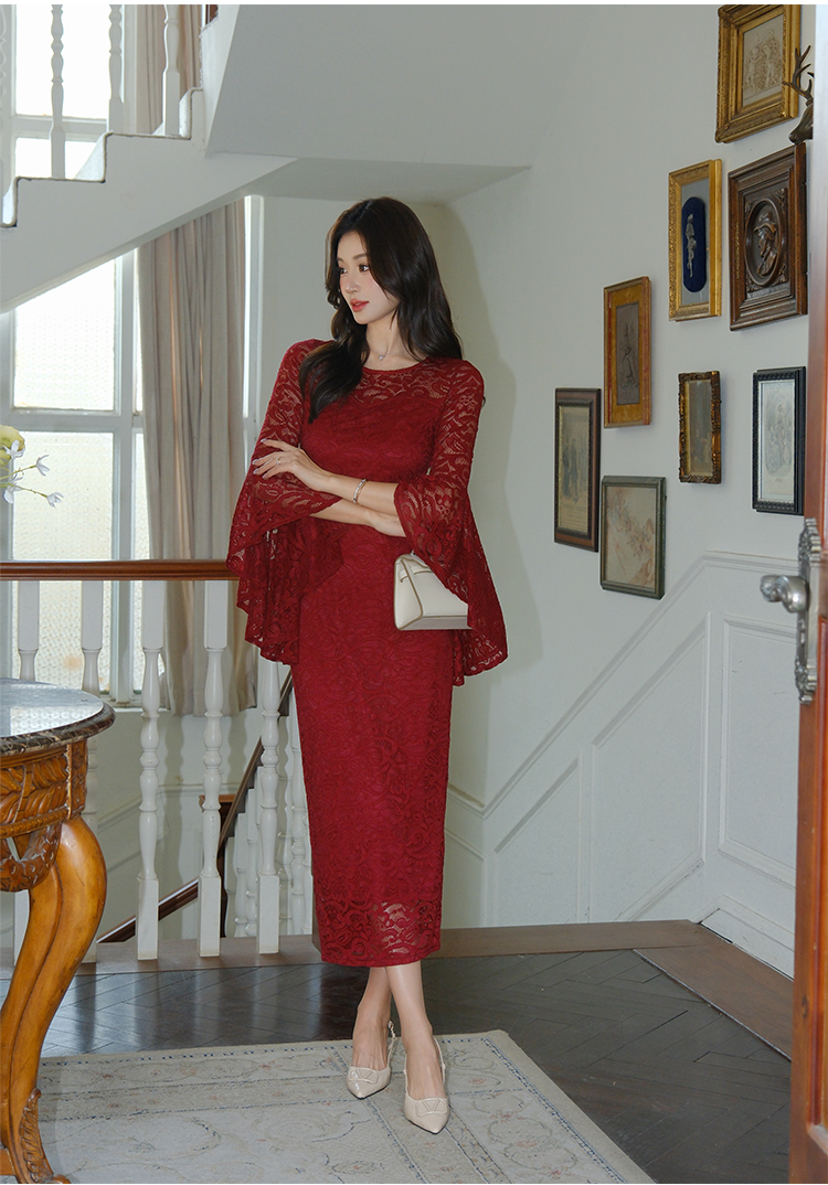 RY2704# 品质 名媛纯欲性感蕾丝圆领喇叭袖收腰包臀连衣裙