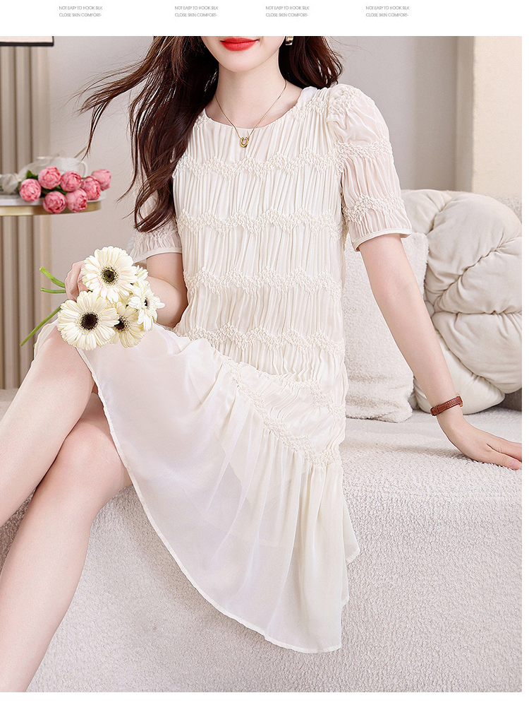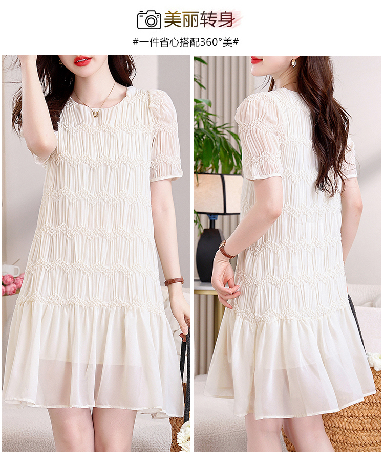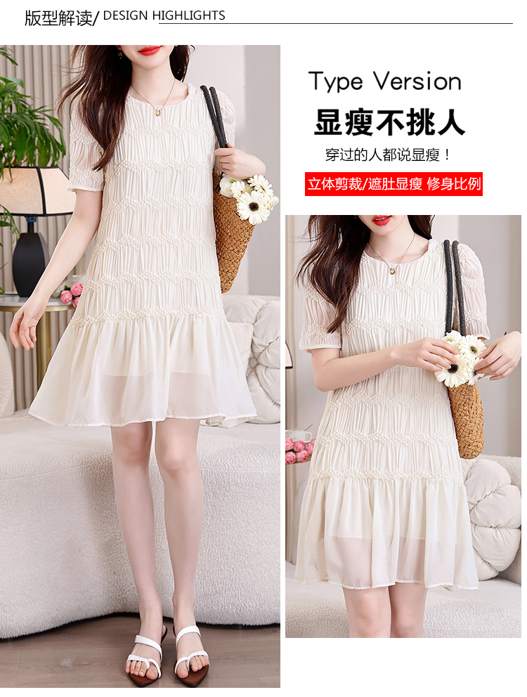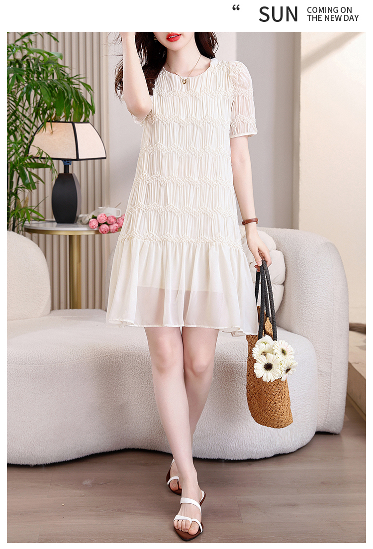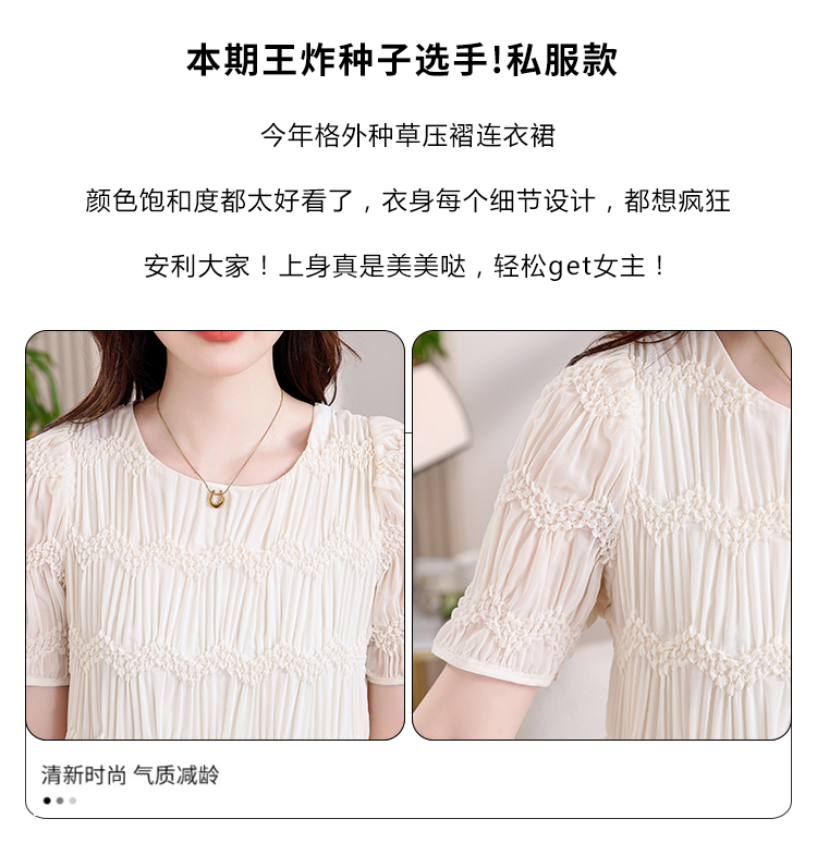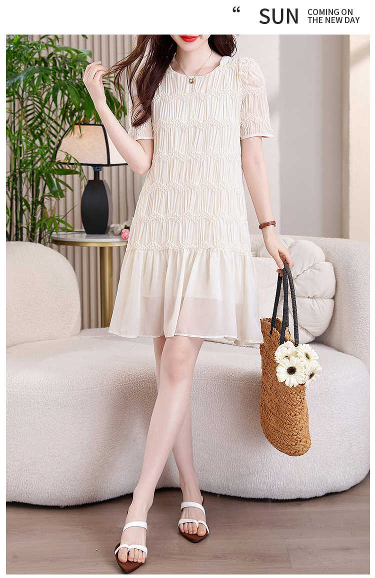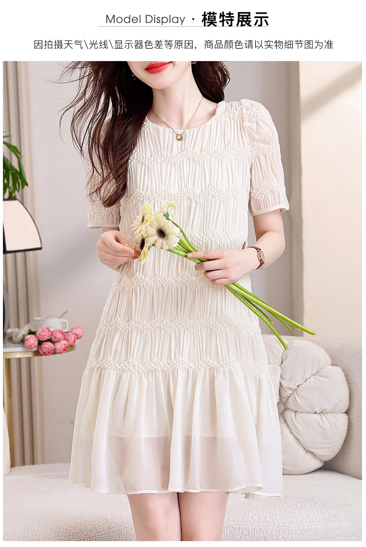 RY2710# 实拍温柔风褶皱雪纺连衣裙女夏季新款圆领泡泡袖宽松显瘦A字短裙