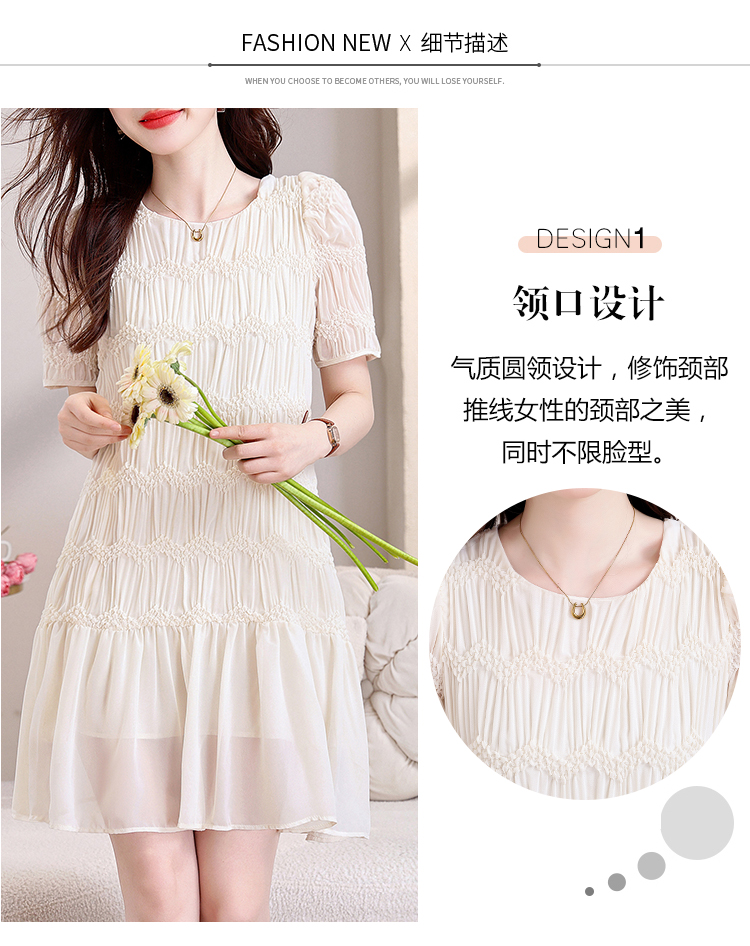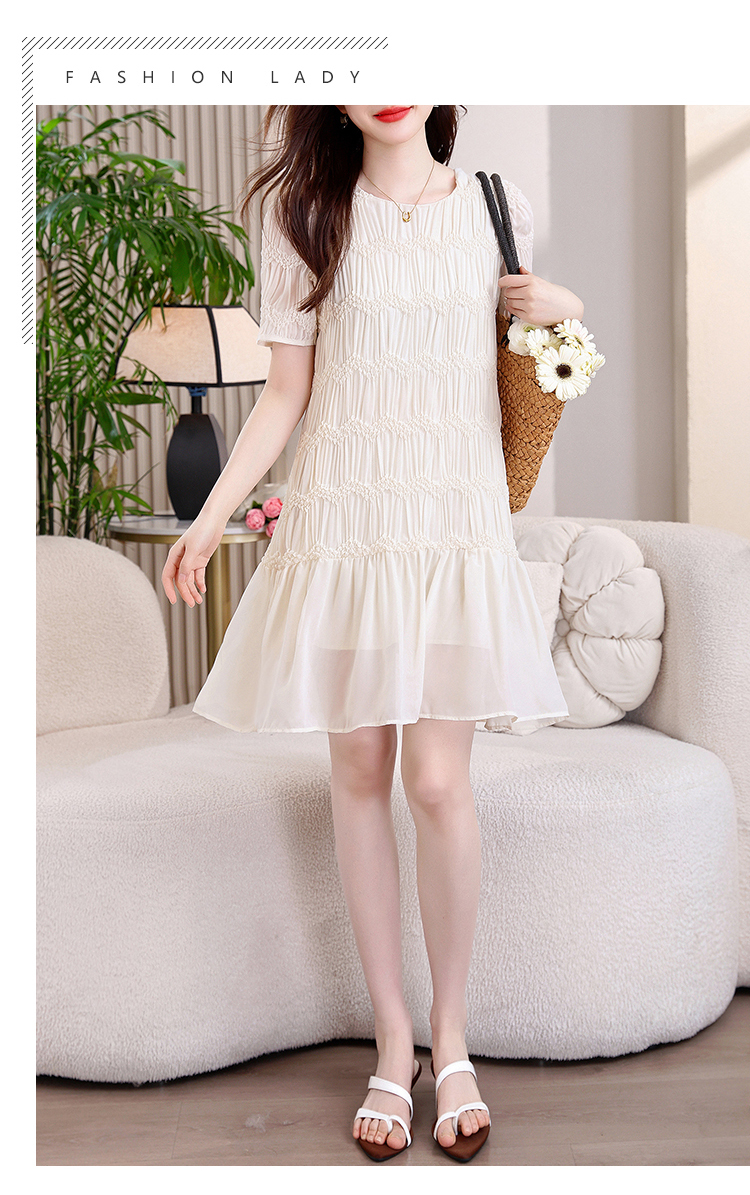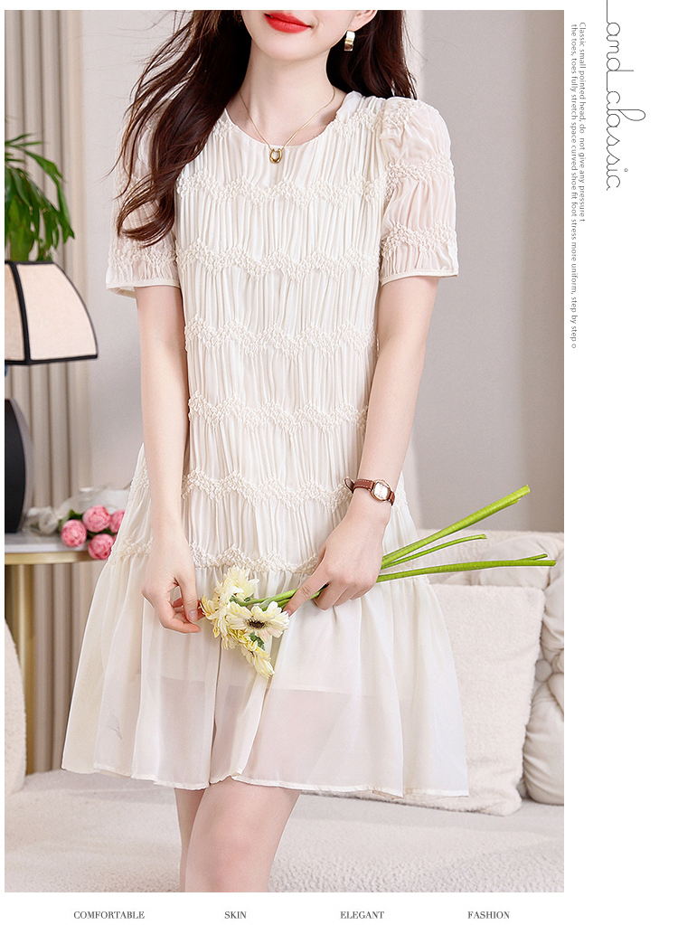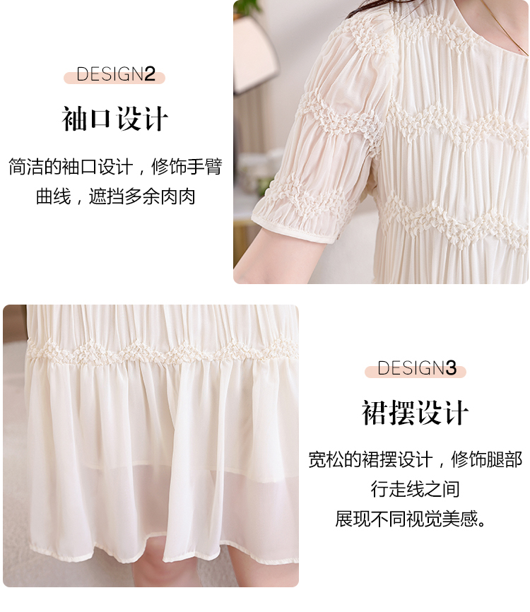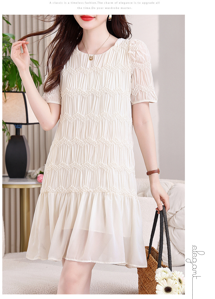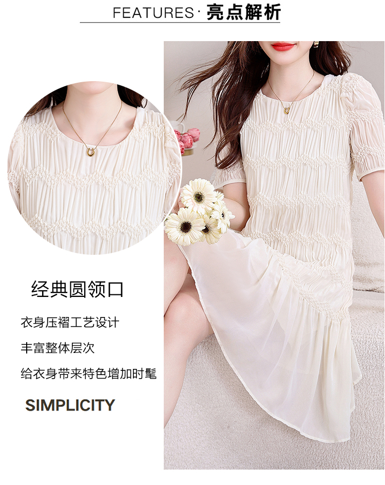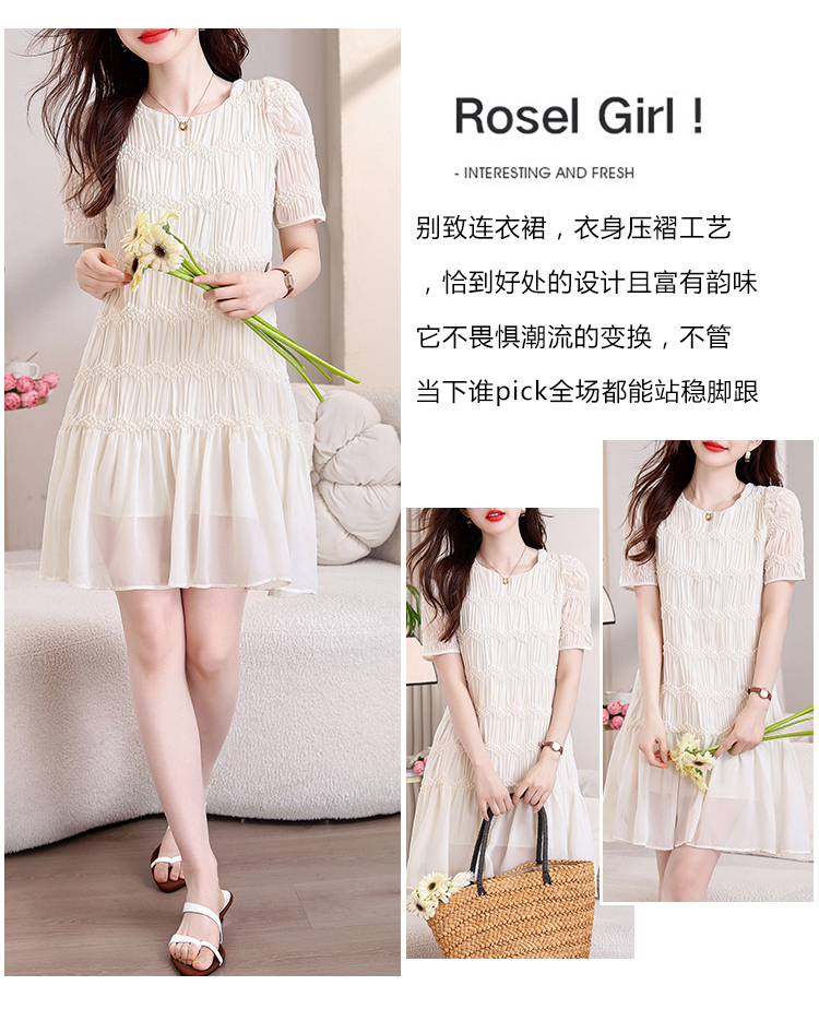 RY2710# 实拍温柔风褶皱雪纺连衣裙女夏季新款圆领泡泡袖宽松显瘦A字短裙