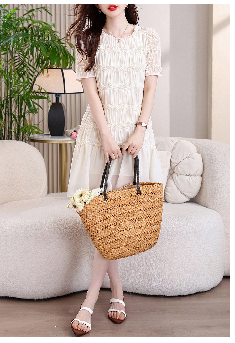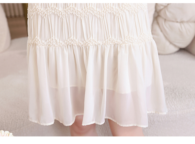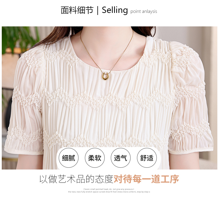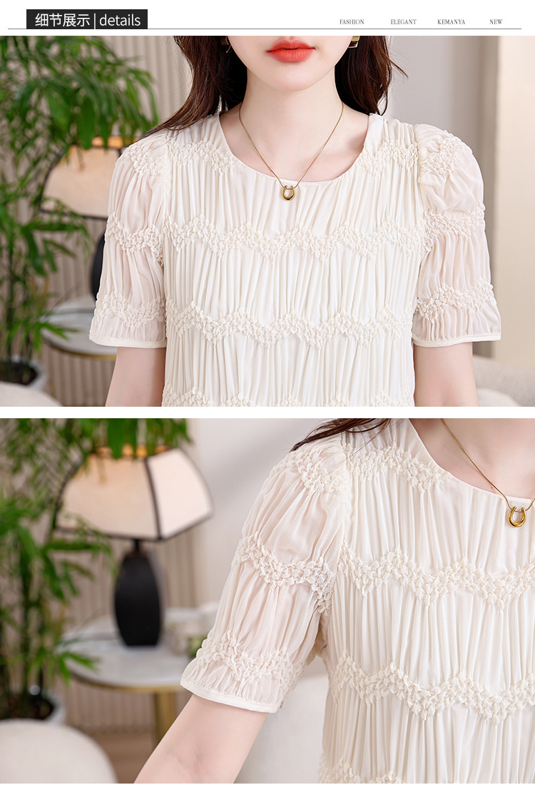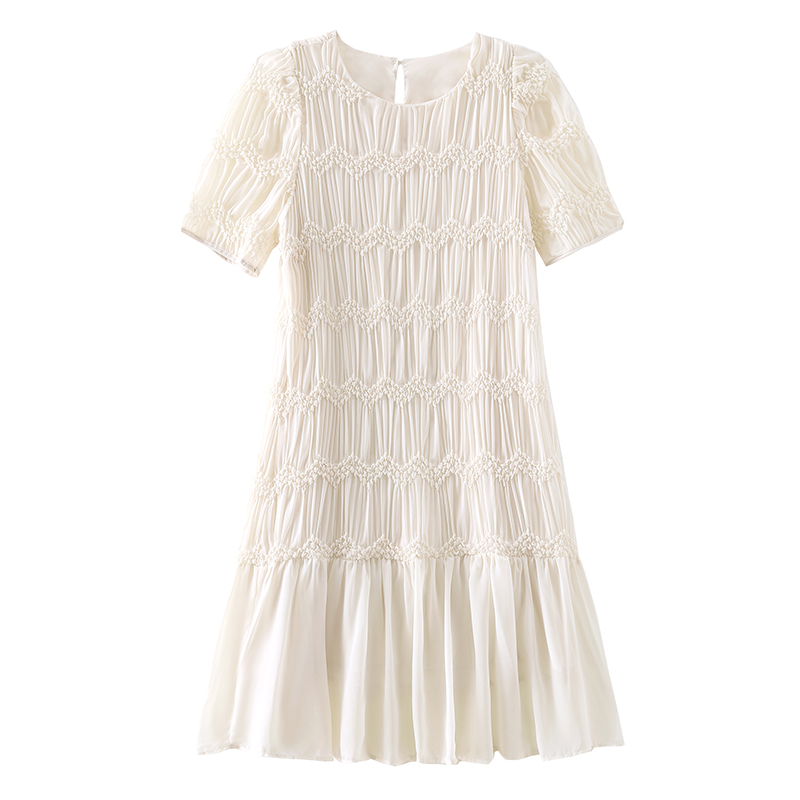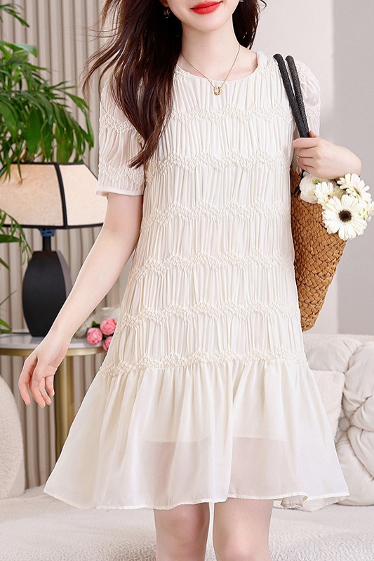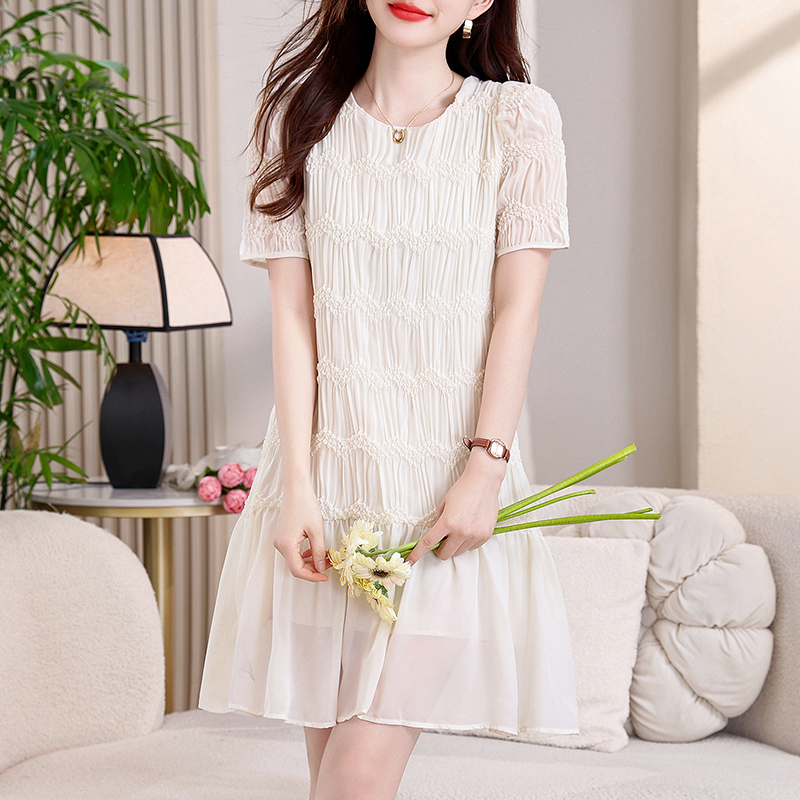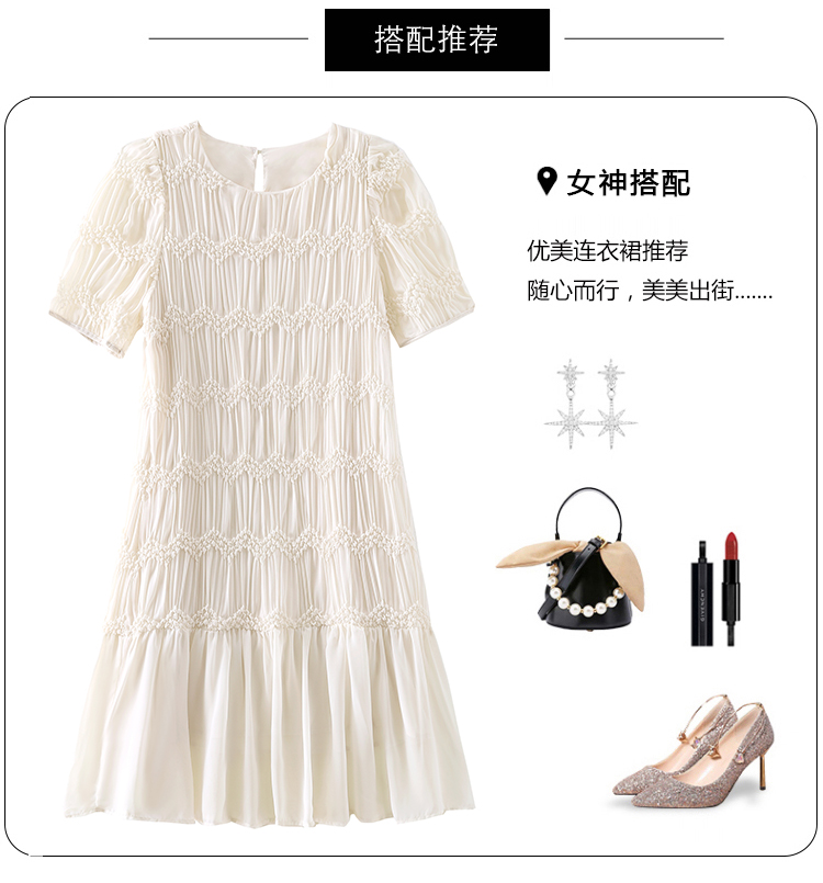 RY2710# 实拍温柔风褶皱雪纺连衣裙女夏季新款圆领泡泡袖宽松显瘦A字短裙