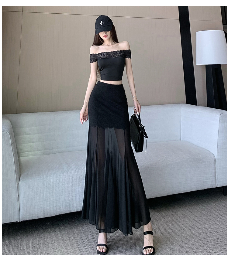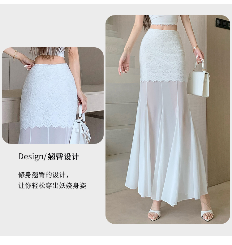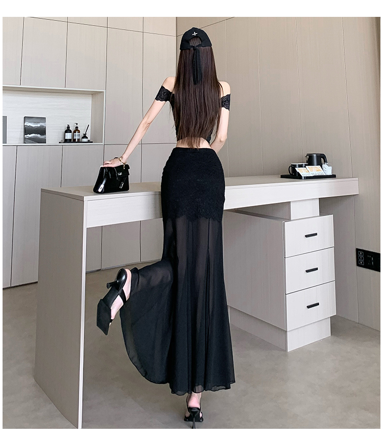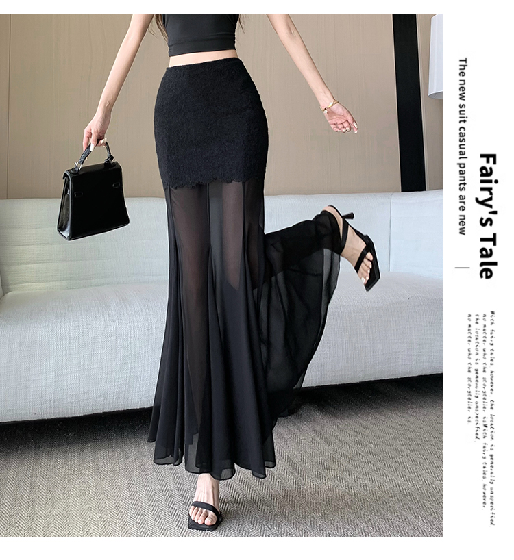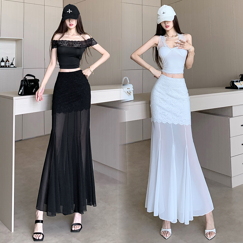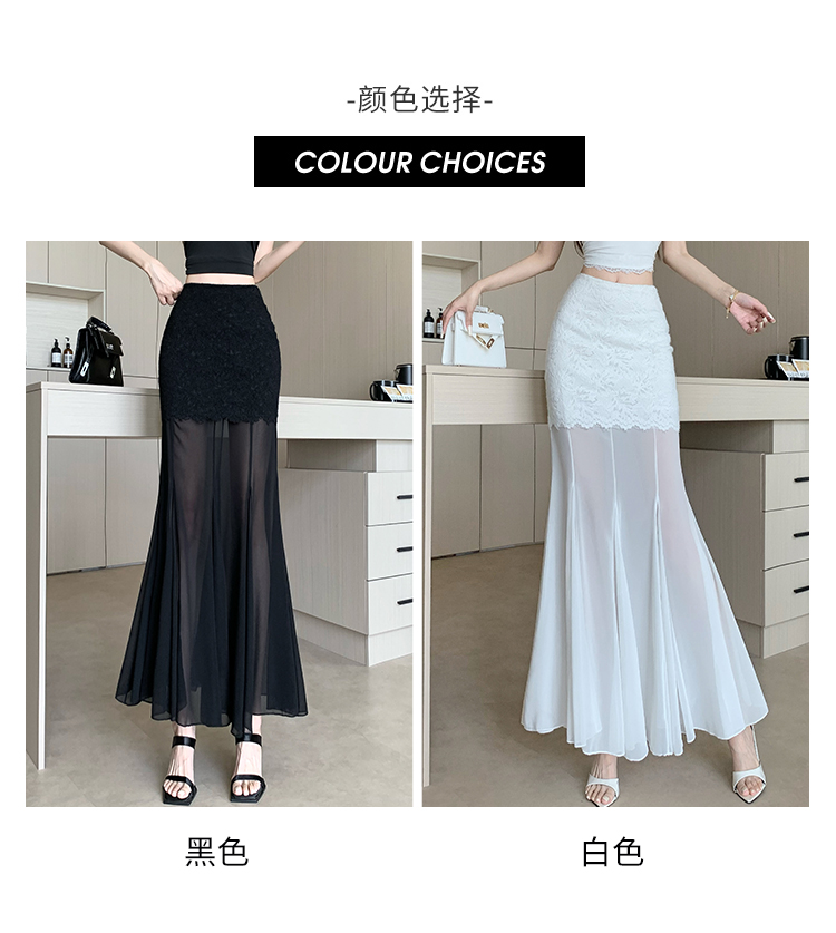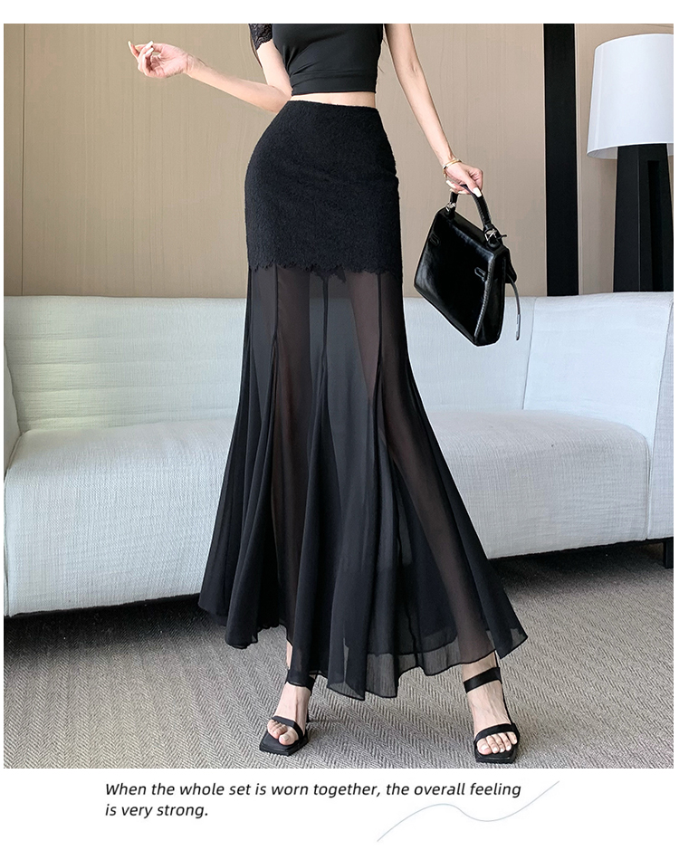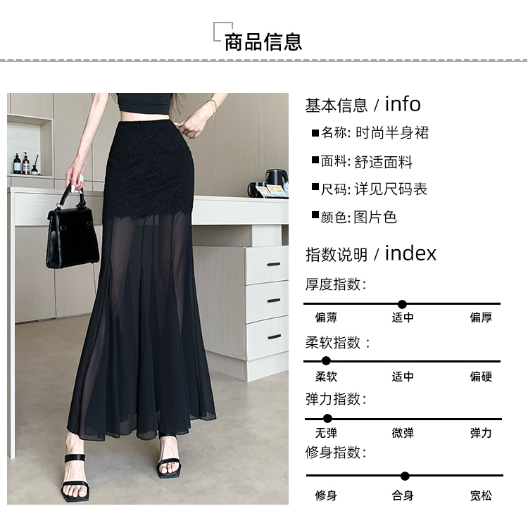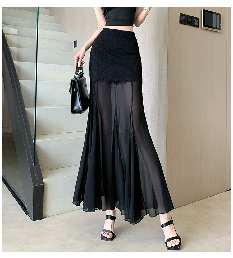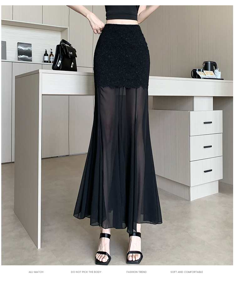 RY2848# 黑色蕾丝拼接半身裙女夏季时尚不规则网纱高腰a字垂感包臀鱼尾裙