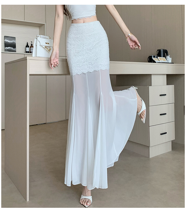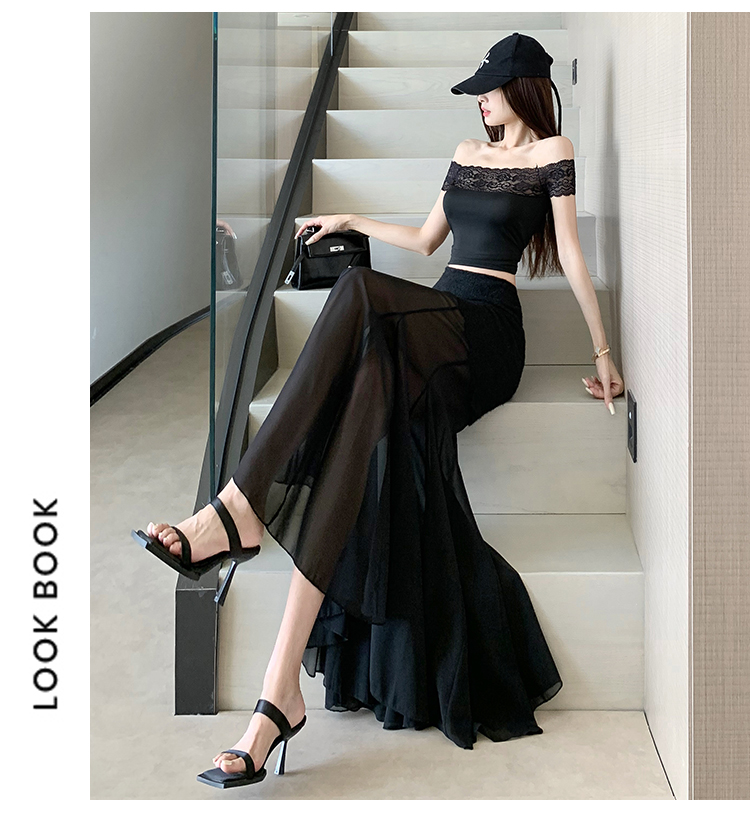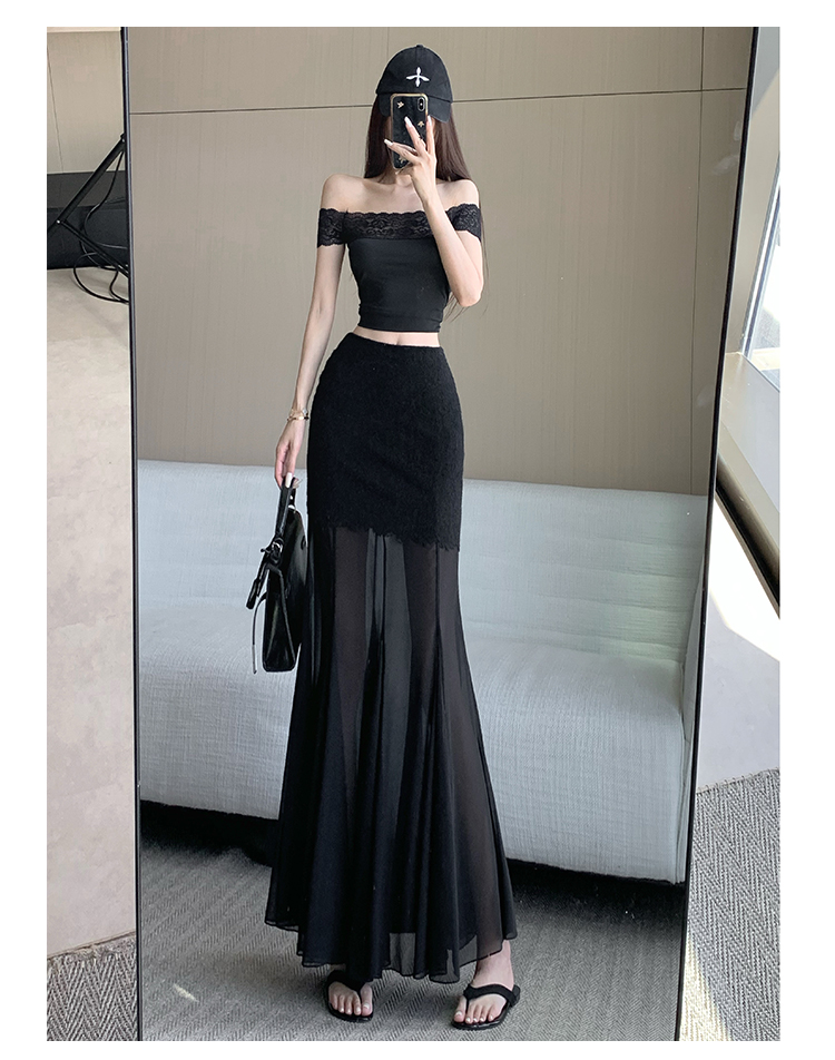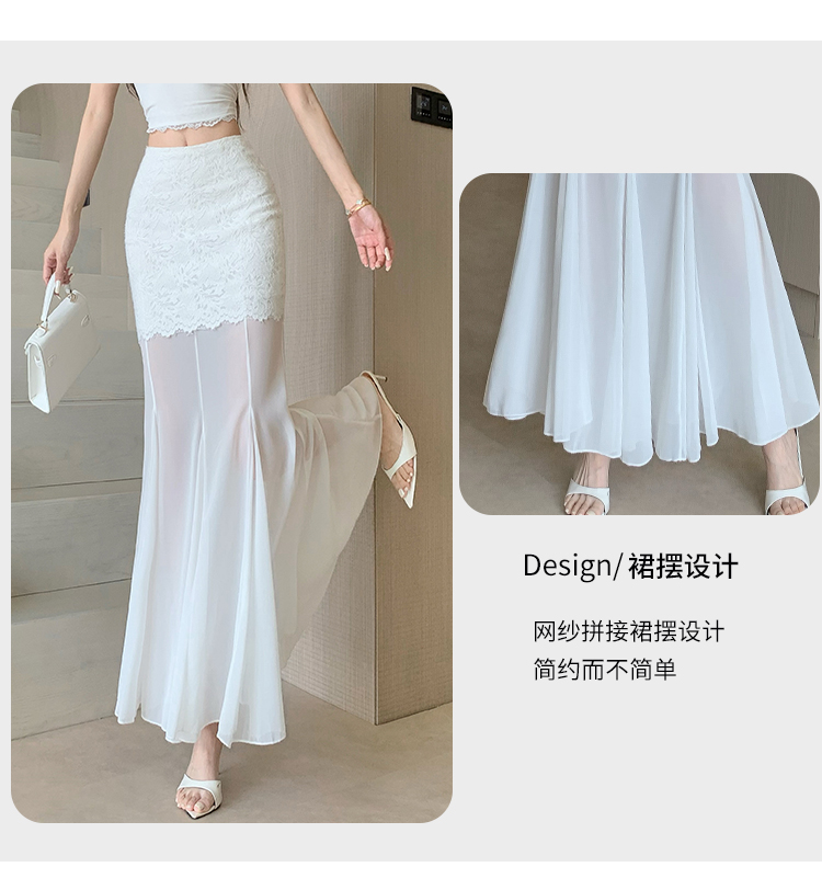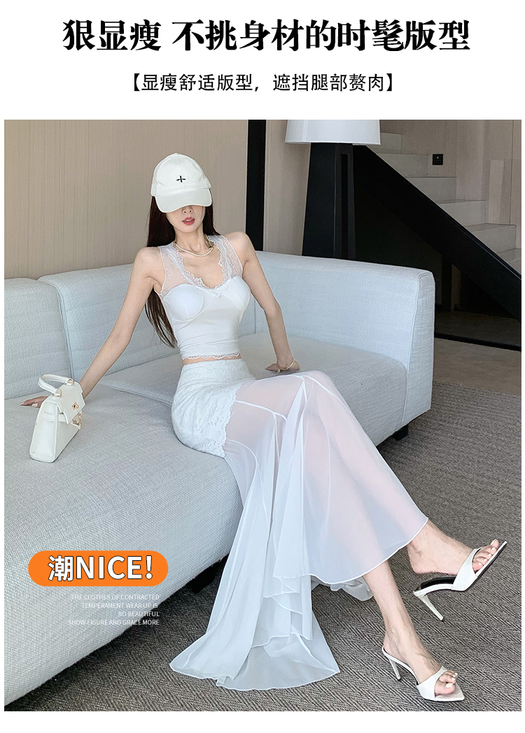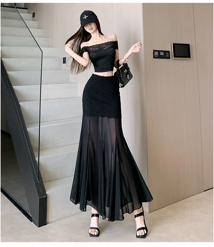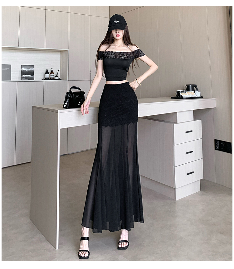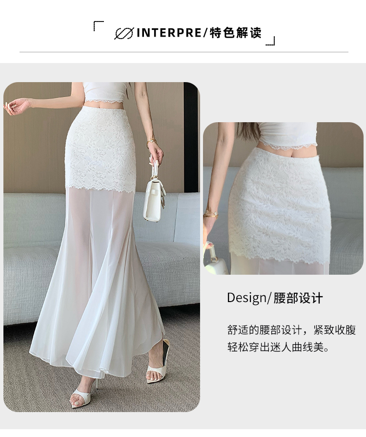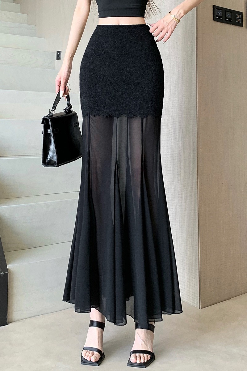 RY2848# 黑色蕾丝拼接半身裙女夏季时尚不规则网纱高腰a字垂感包臀鱼尾裙