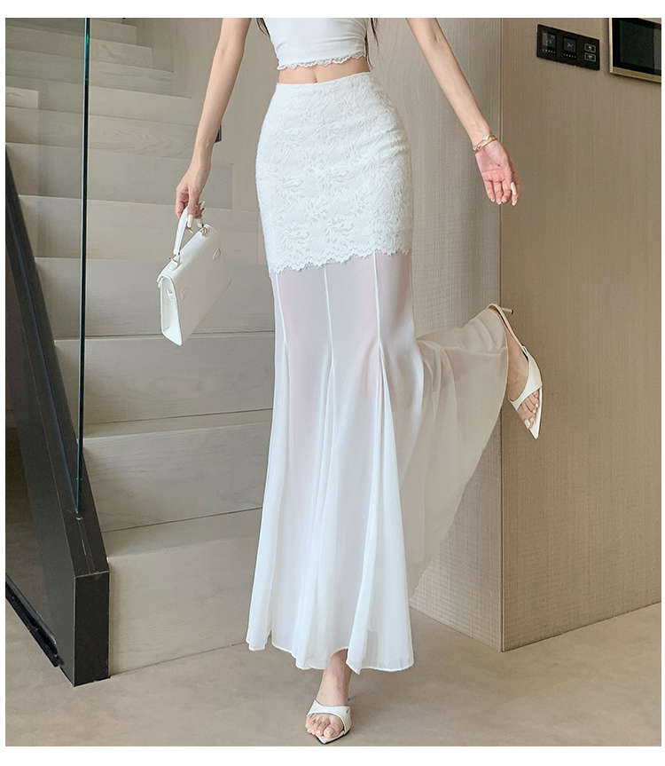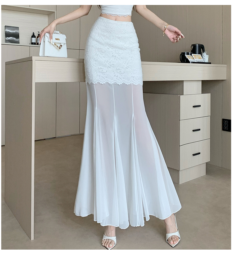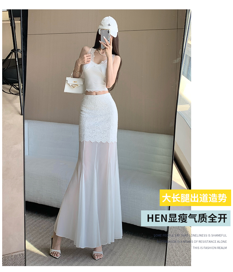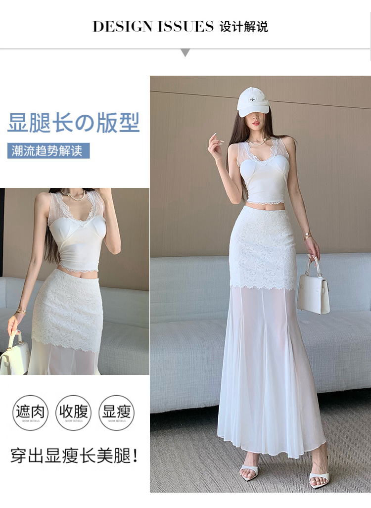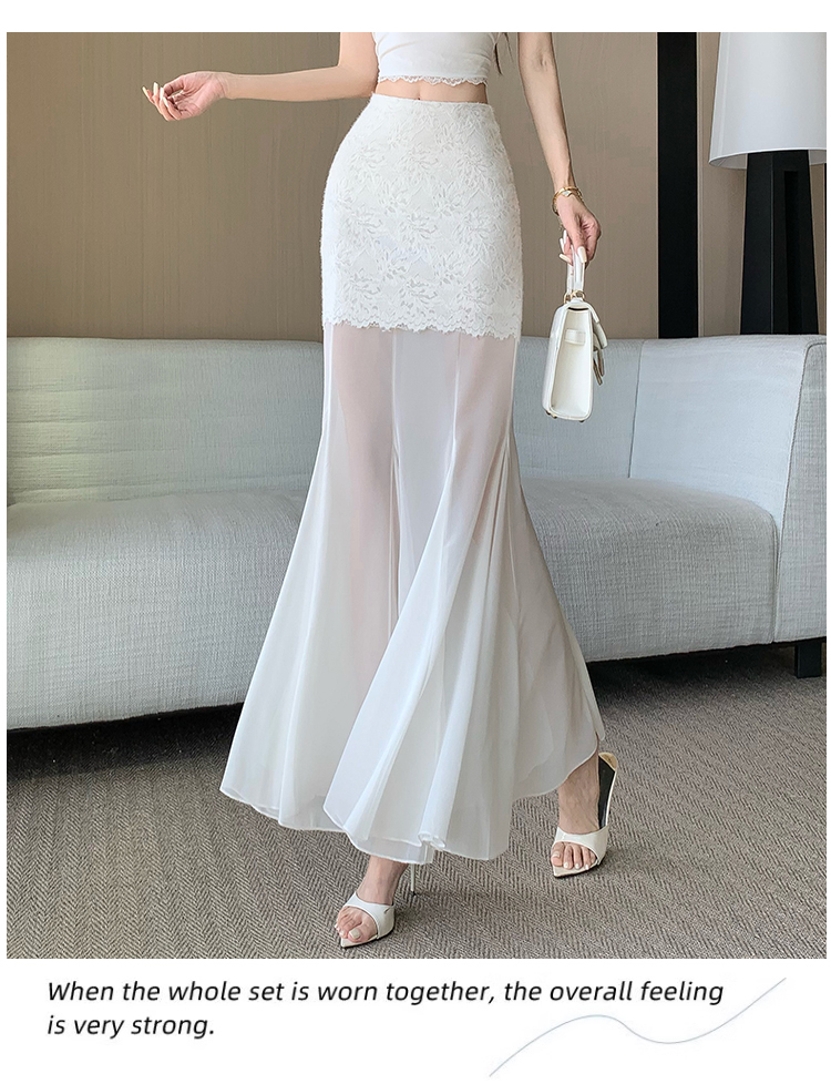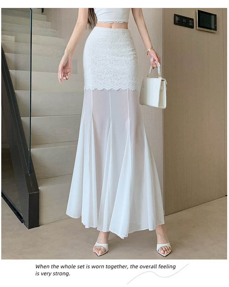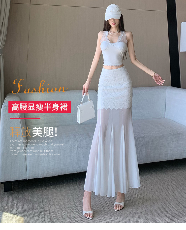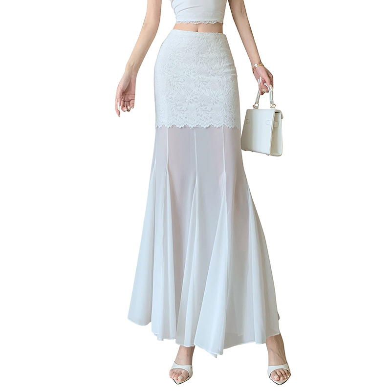 RY2848# 黑色蕾丝拼接半身裙女夏季时尚不规则网纱高腰a字垂感包臀鱼尾裙
