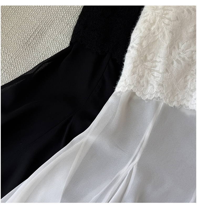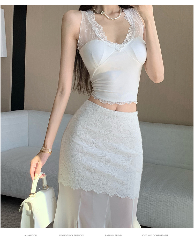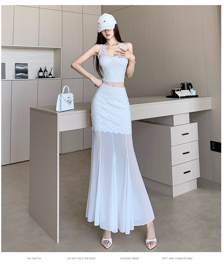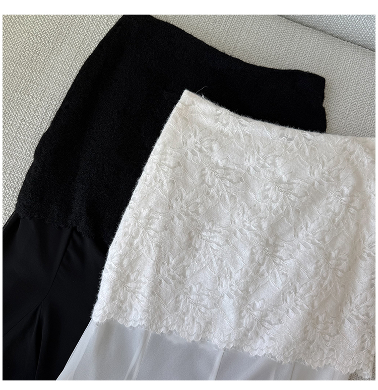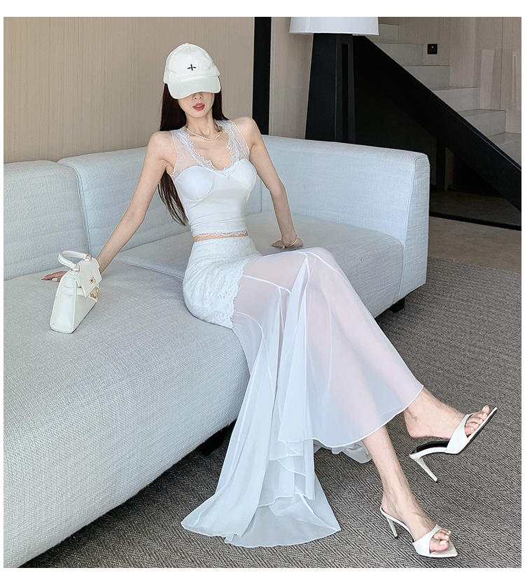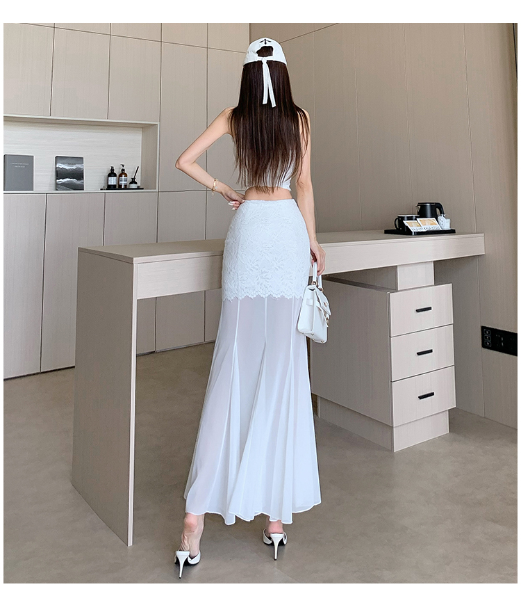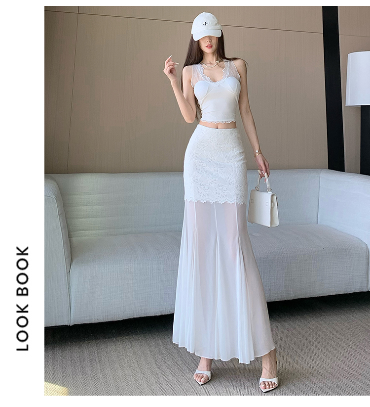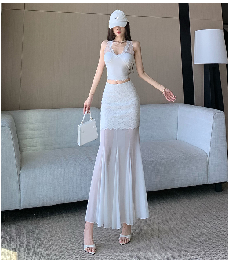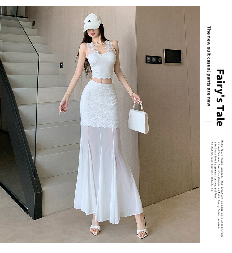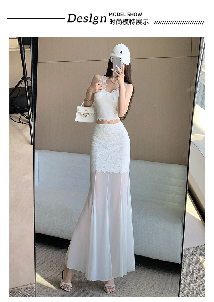 RY2848# 黑色蕾丝拼接半身裙女夏季时尚不规则网纱高腰a字垂感包臀鱼尾裙