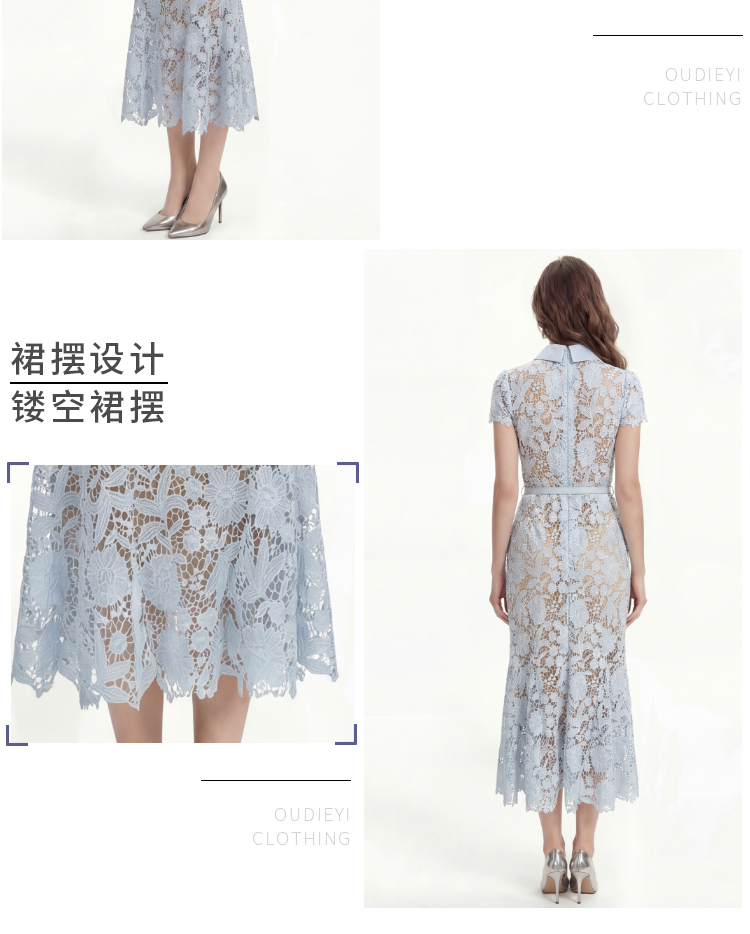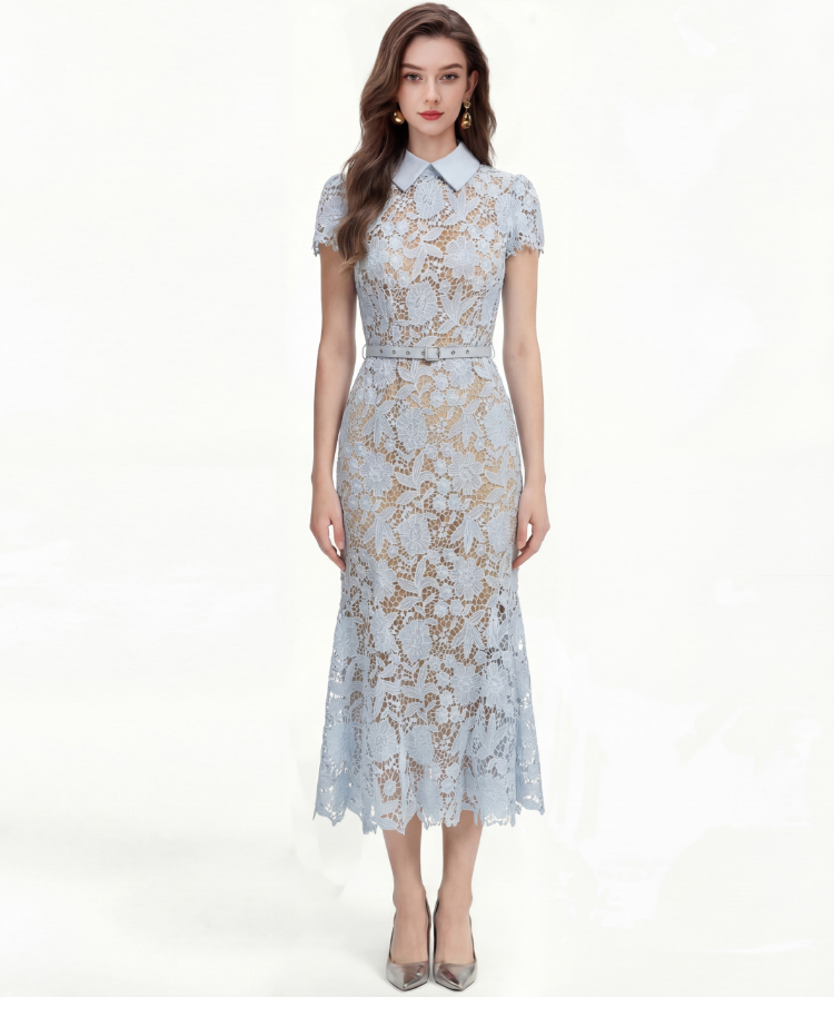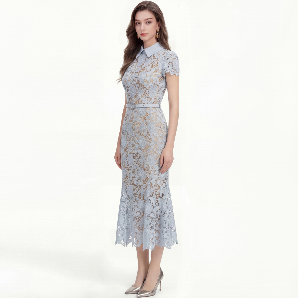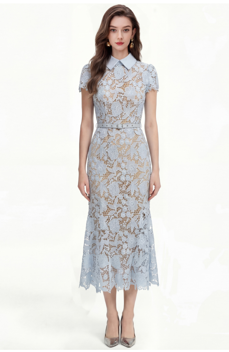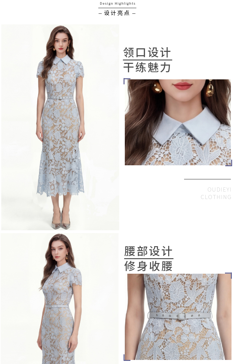 RY2851# 实拍法式高级感重工镂空花朵蕾丝衬衫领修身鱼尾连衣裙配腰带