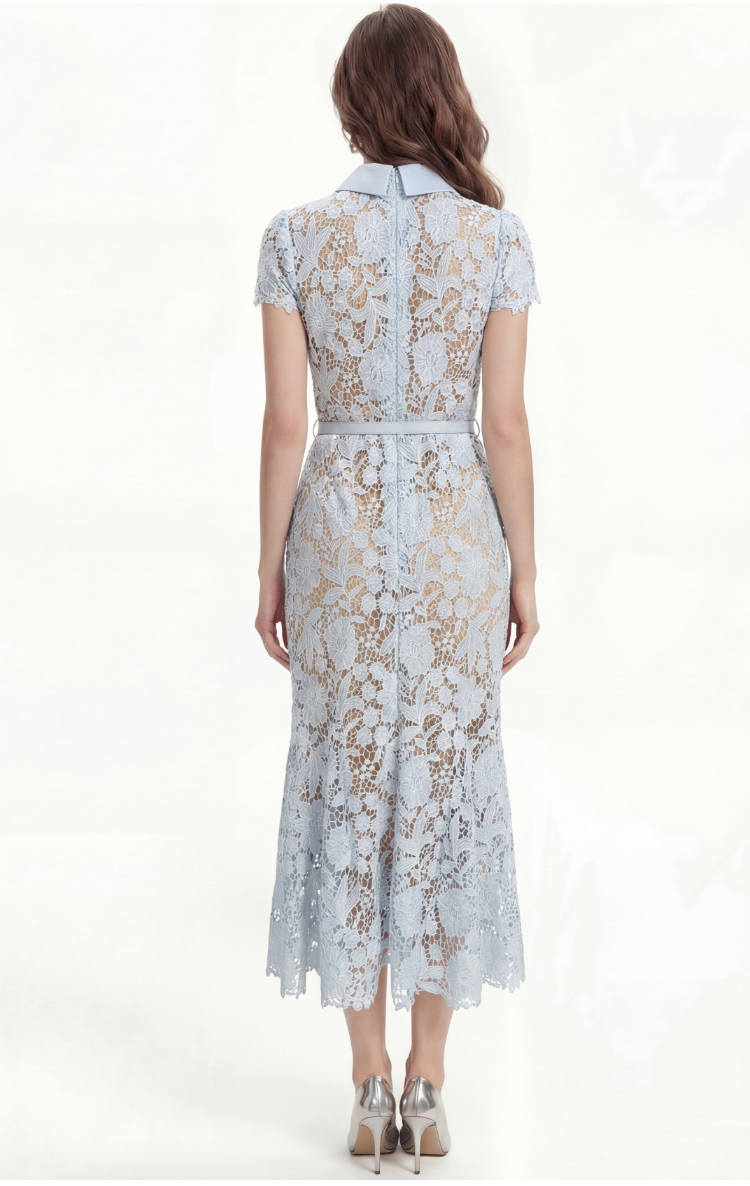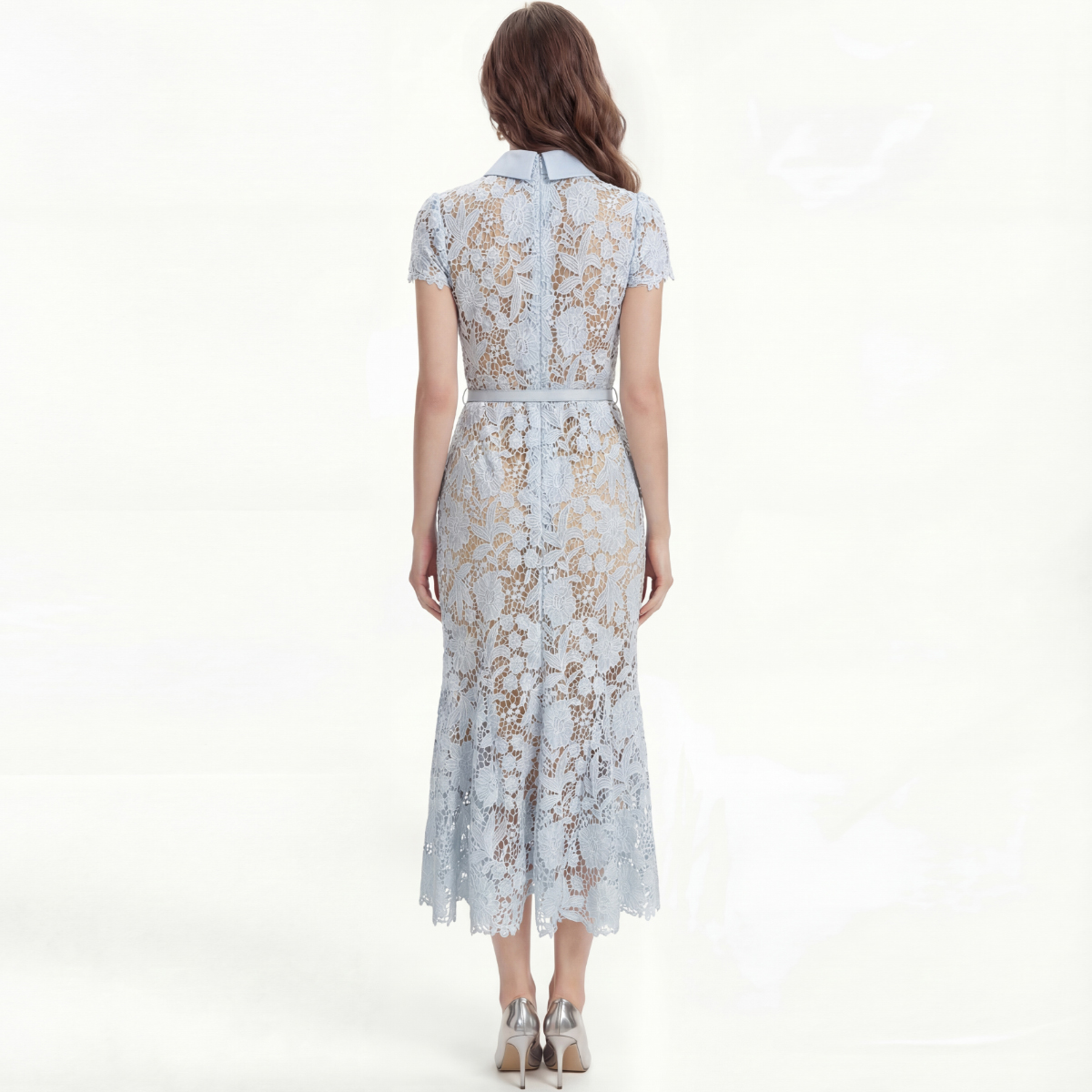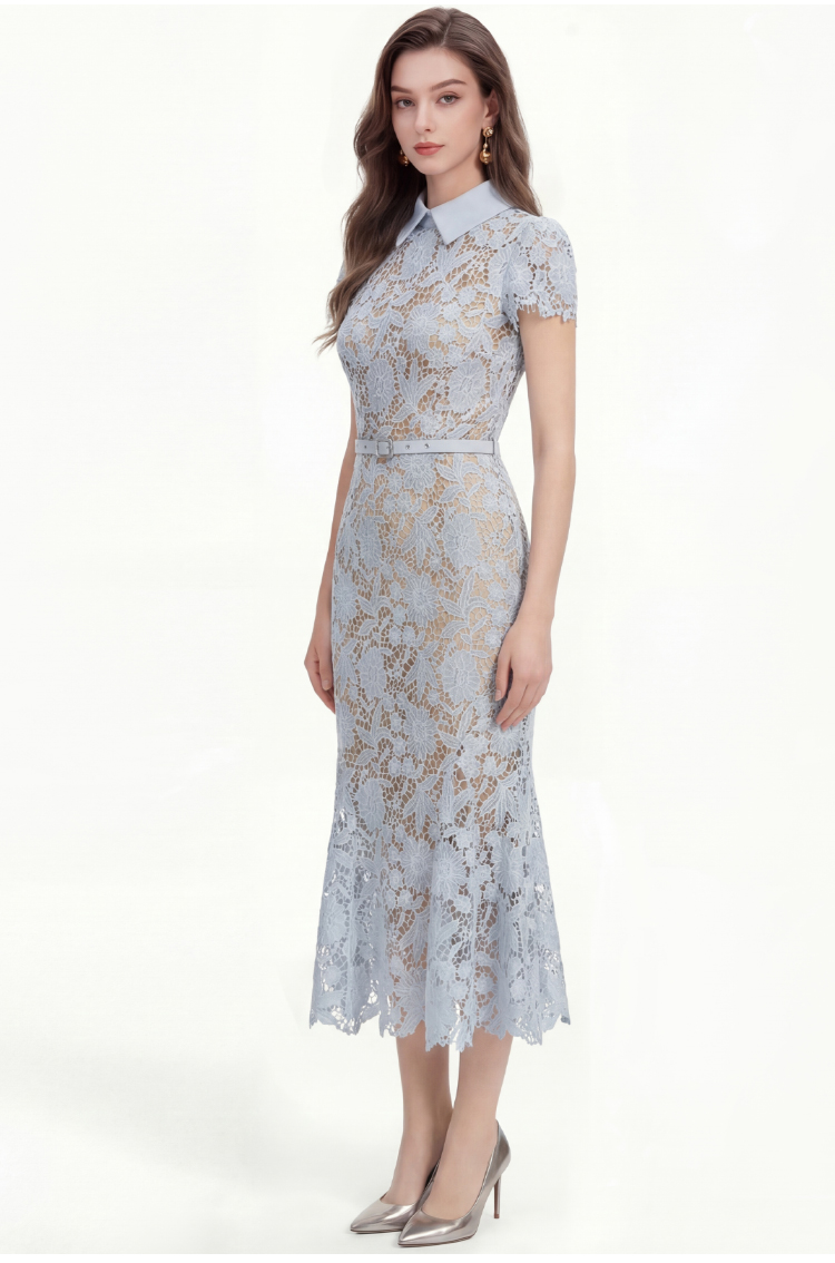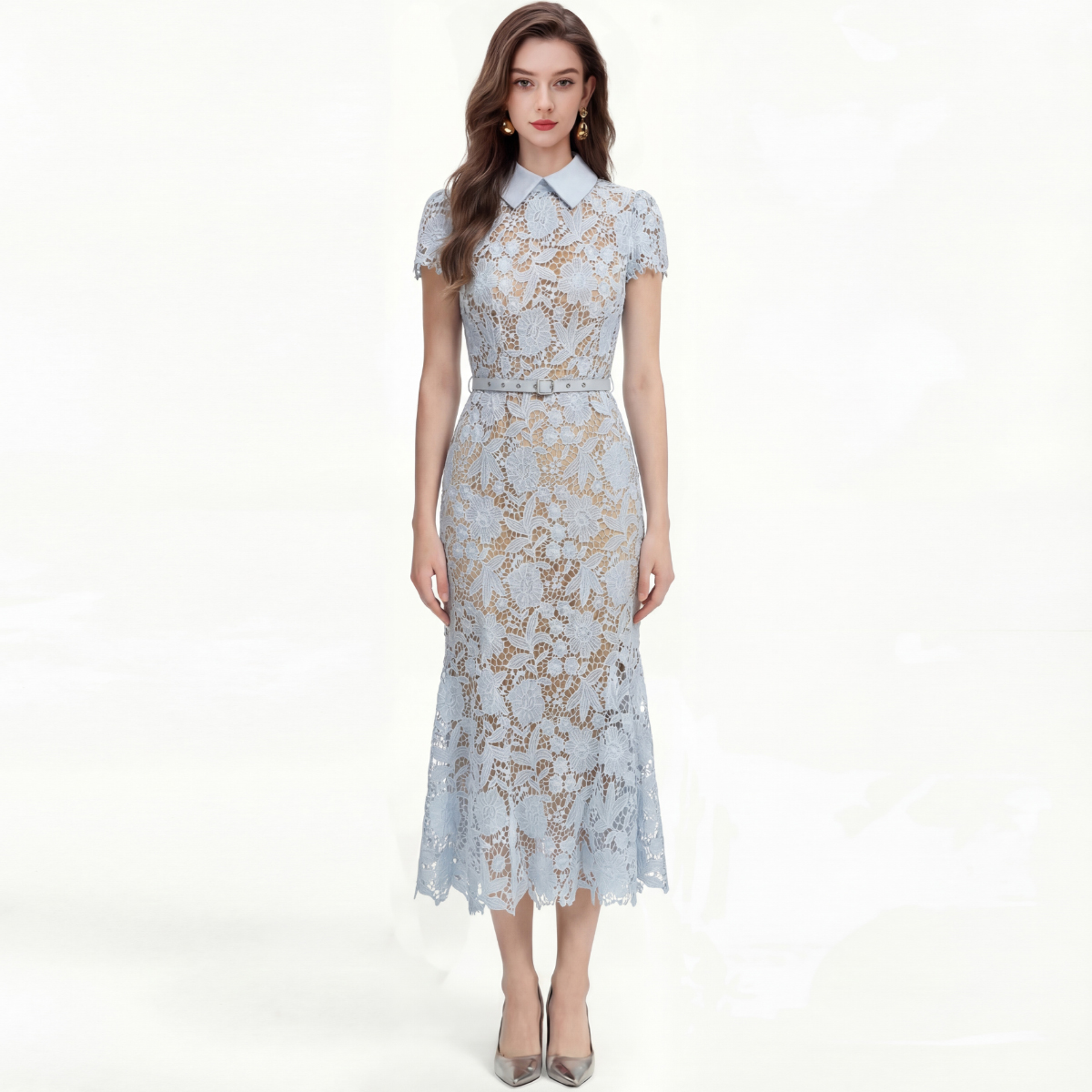 RY2851# 实拍法式高级感重工镂空花朵蕾丝衬衫领修身鱼尾连衣裙配腰带