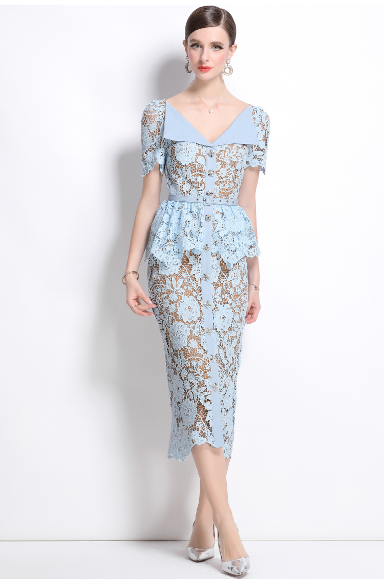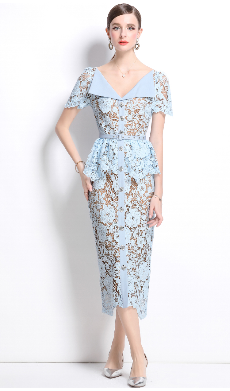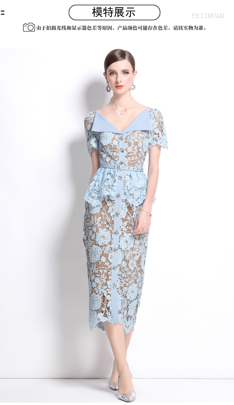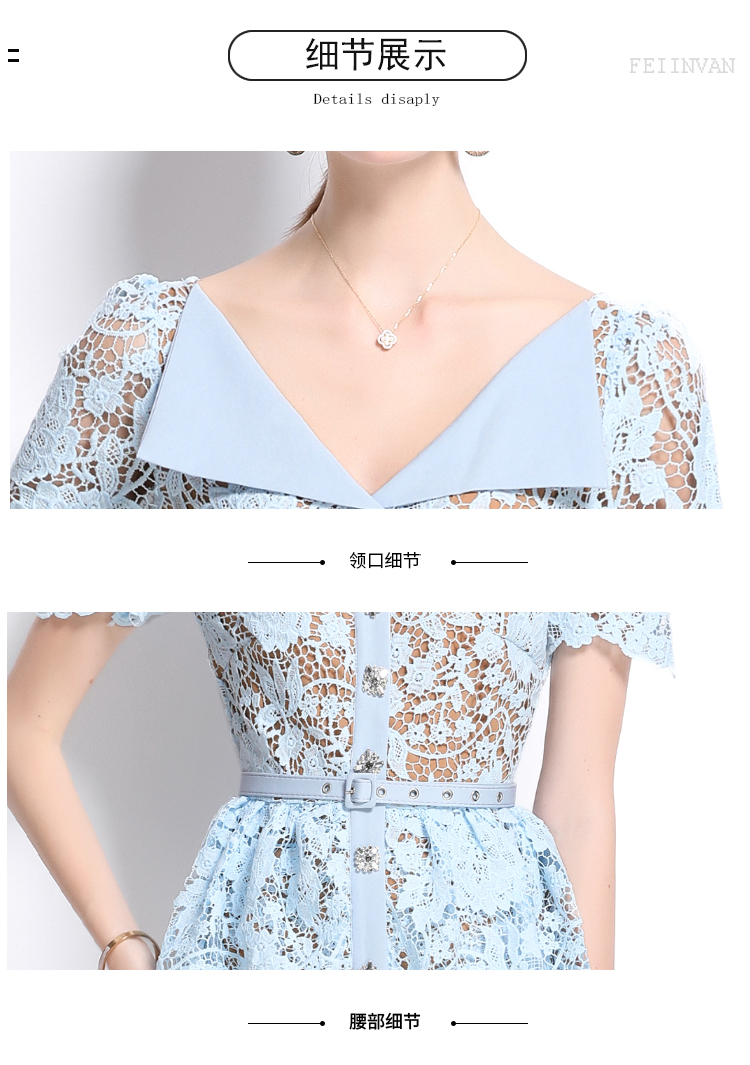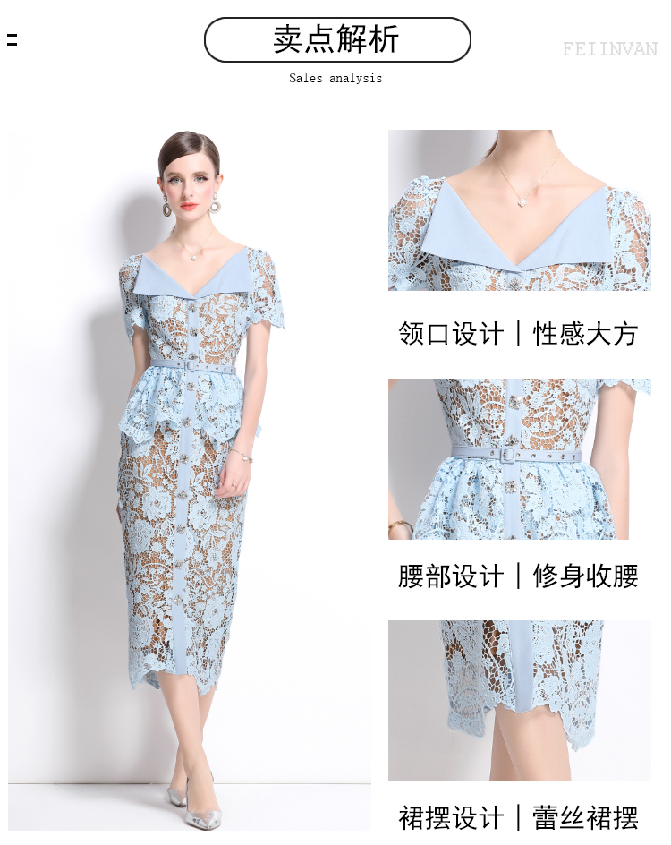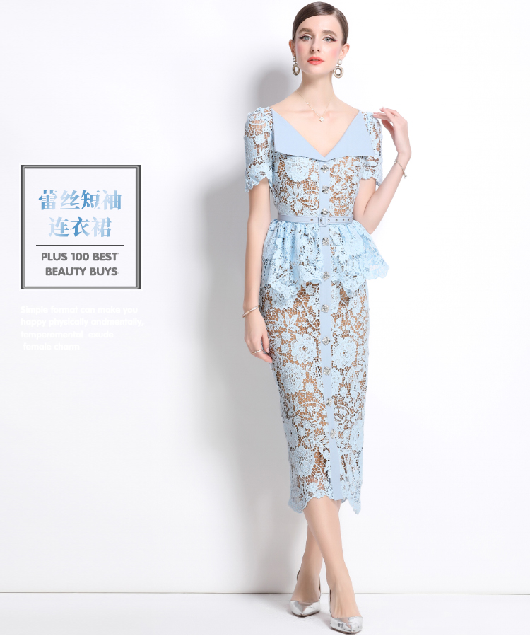 RY2853# 实拍小众气质大翻领短袖蕾丝收腰修身连衣裙礼服送腰带