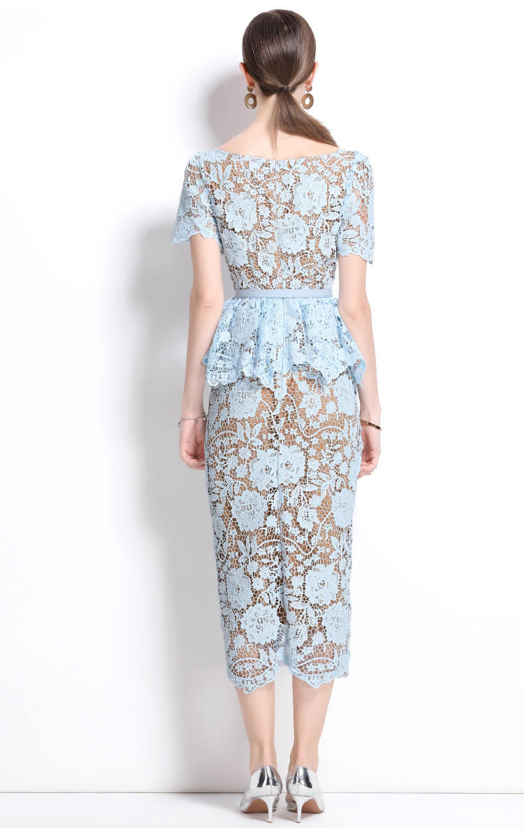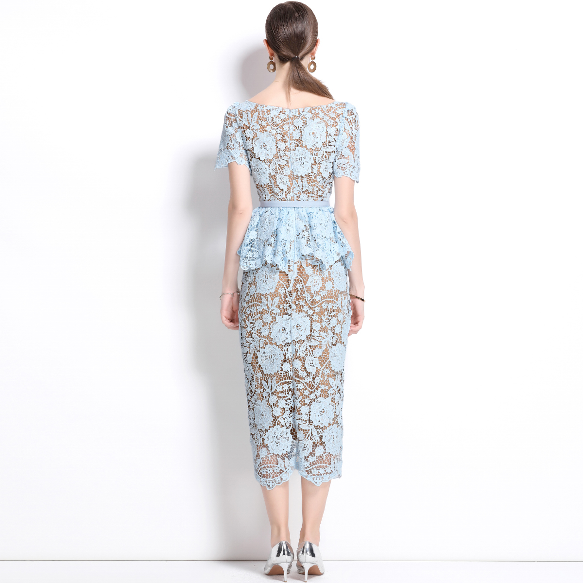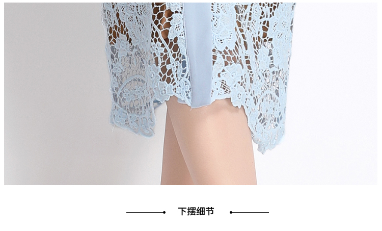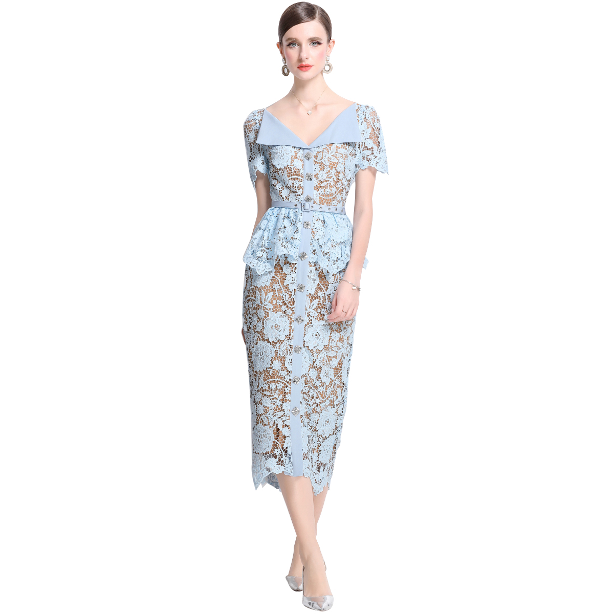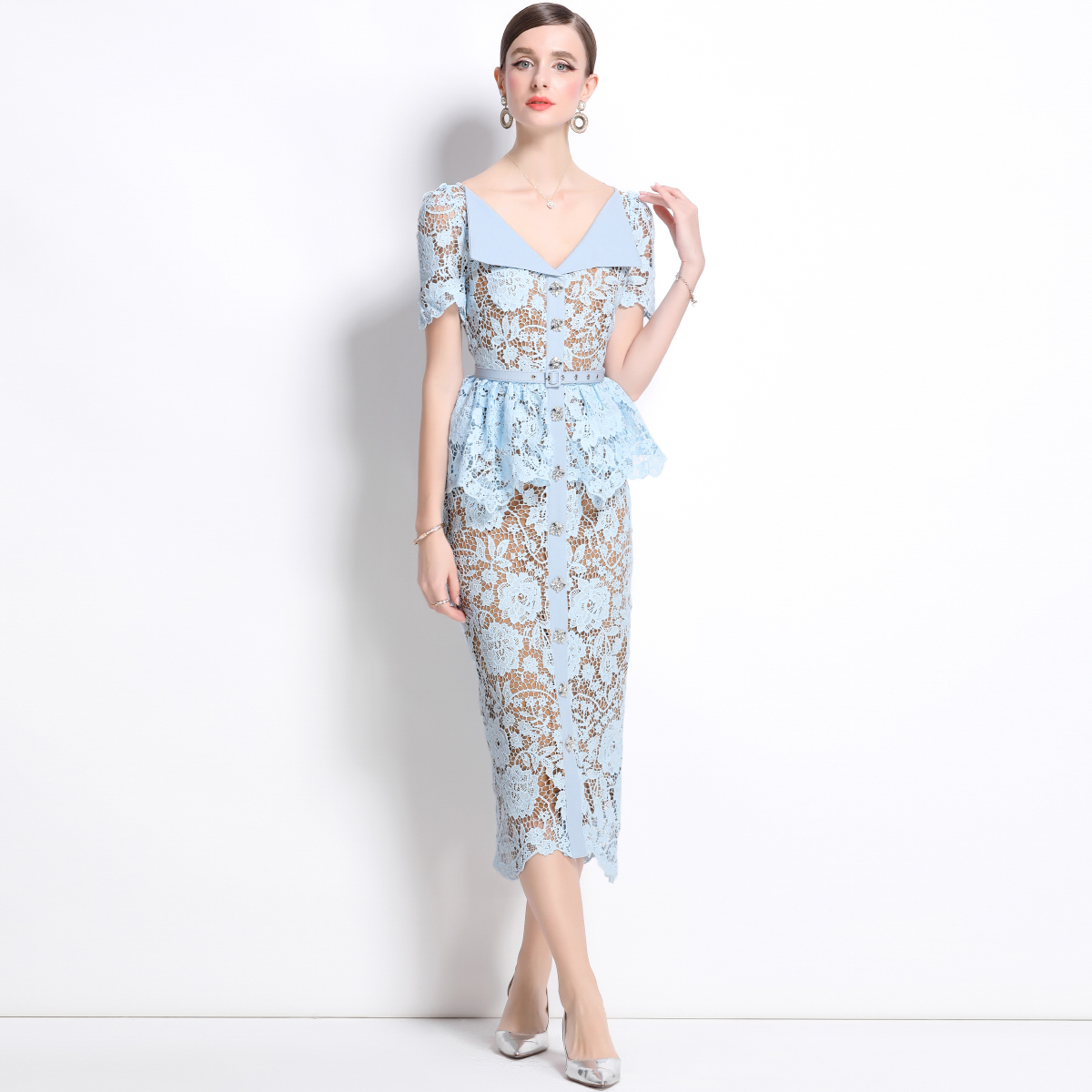 RY2853# 实拍小众气质大翻领短袖蕾丝收腰修身连衣裙礼服送腰带