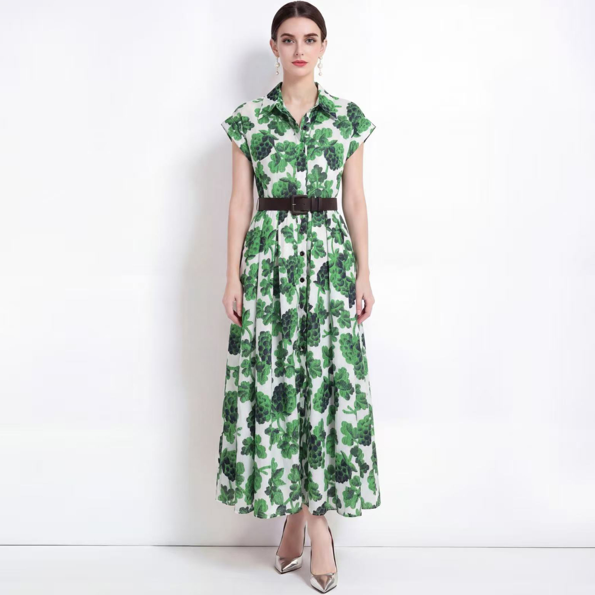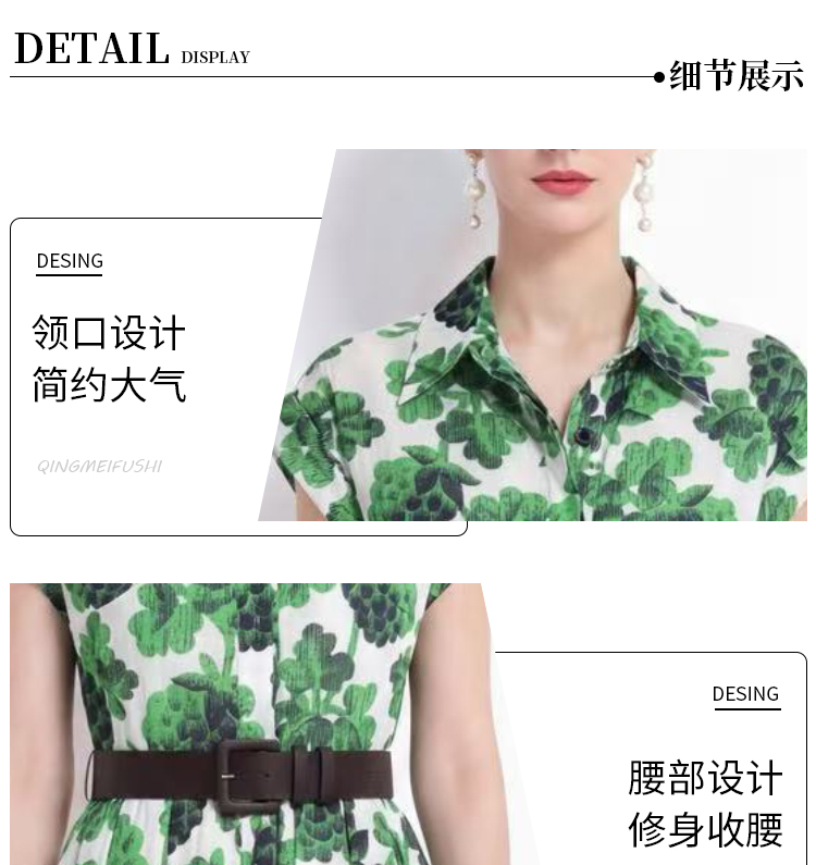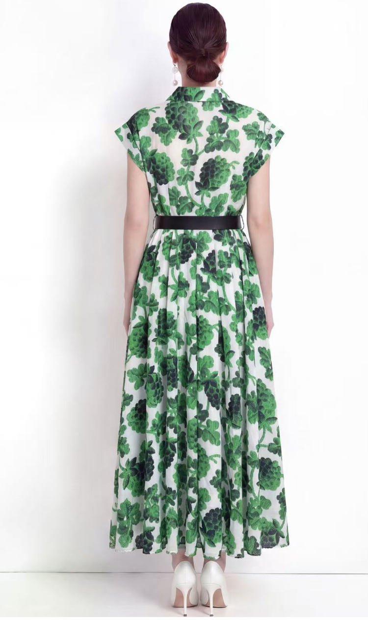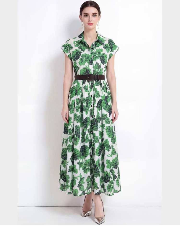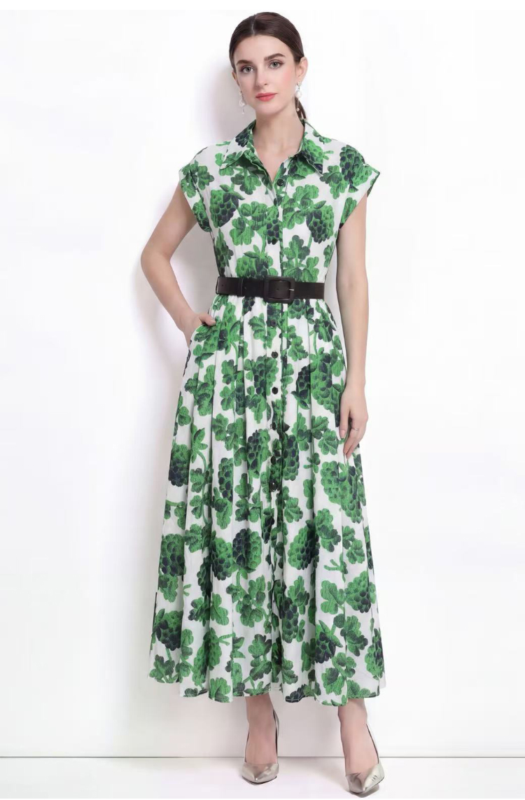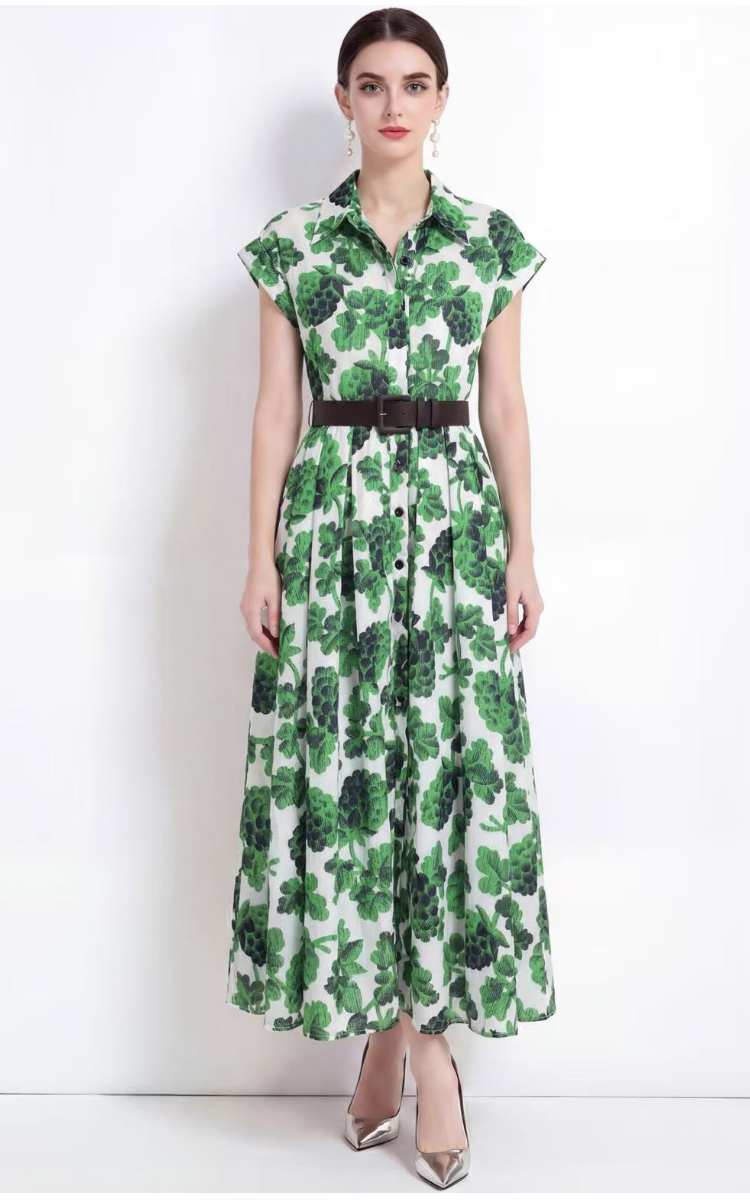 RY2857# 实拍法式优雅翻领衬衫印花收腰单排扣中长裙连衣裙配腰带