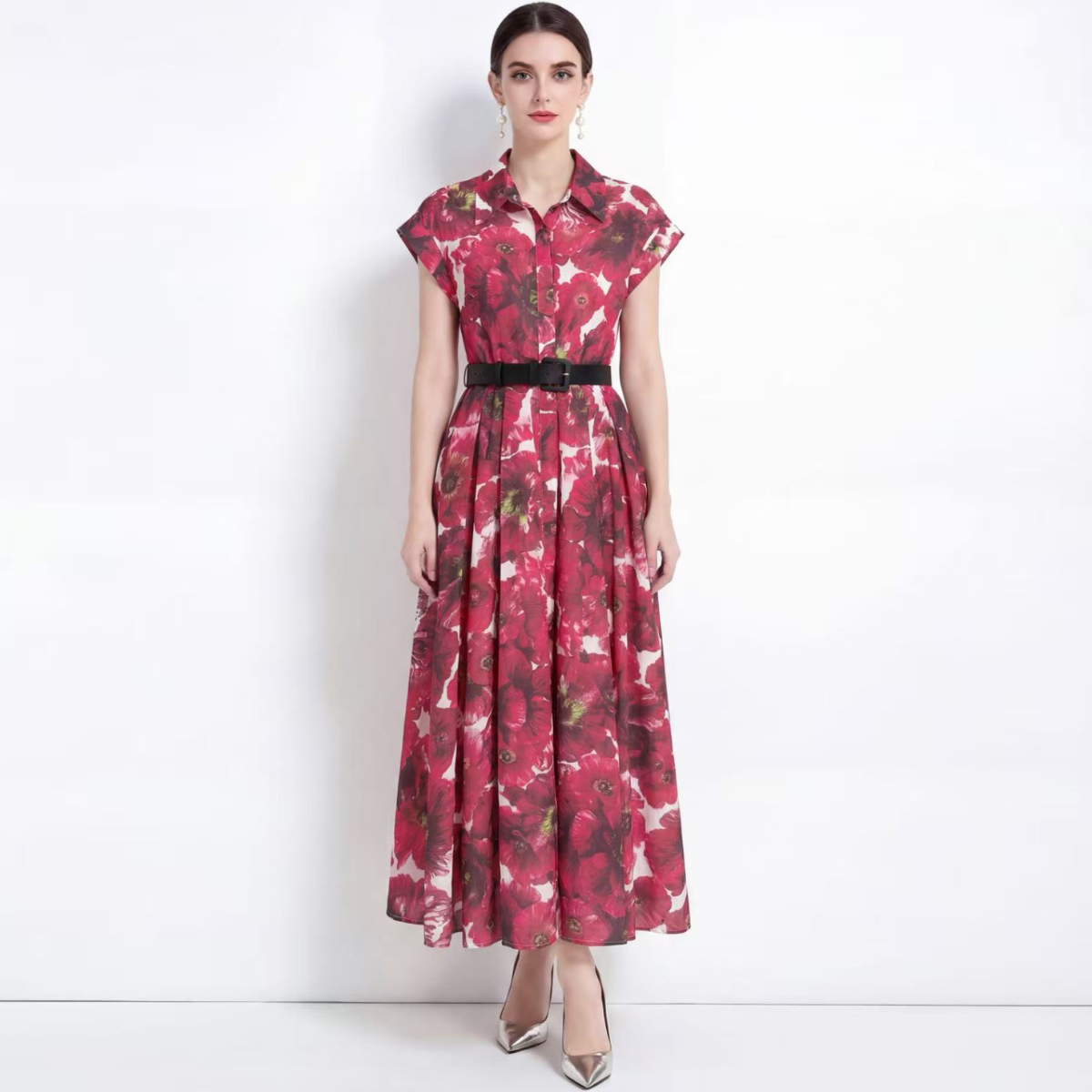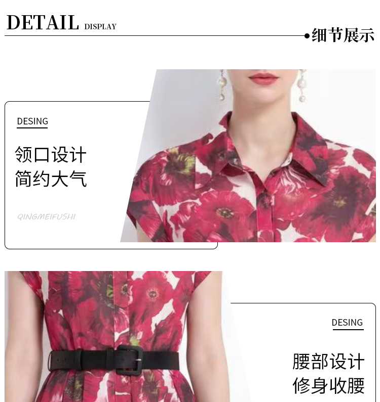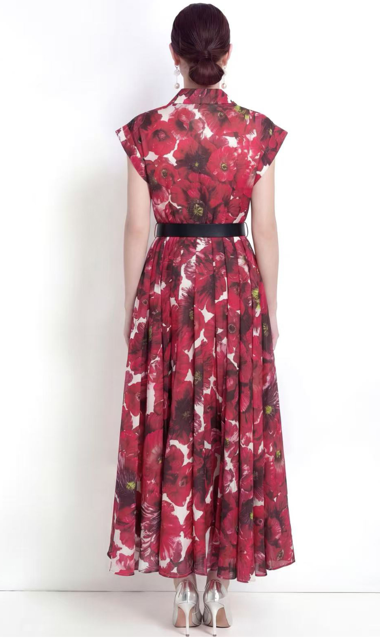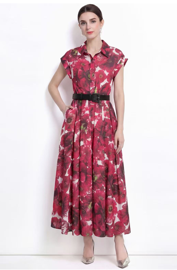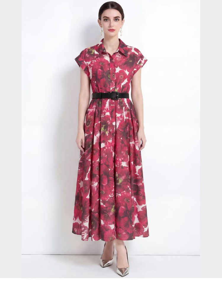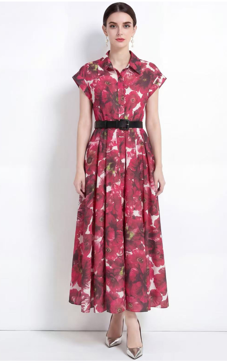 RY2858# 实拍法式优雅翻领衬衫印花收腰单排扣中长裙连衣裙配腰带