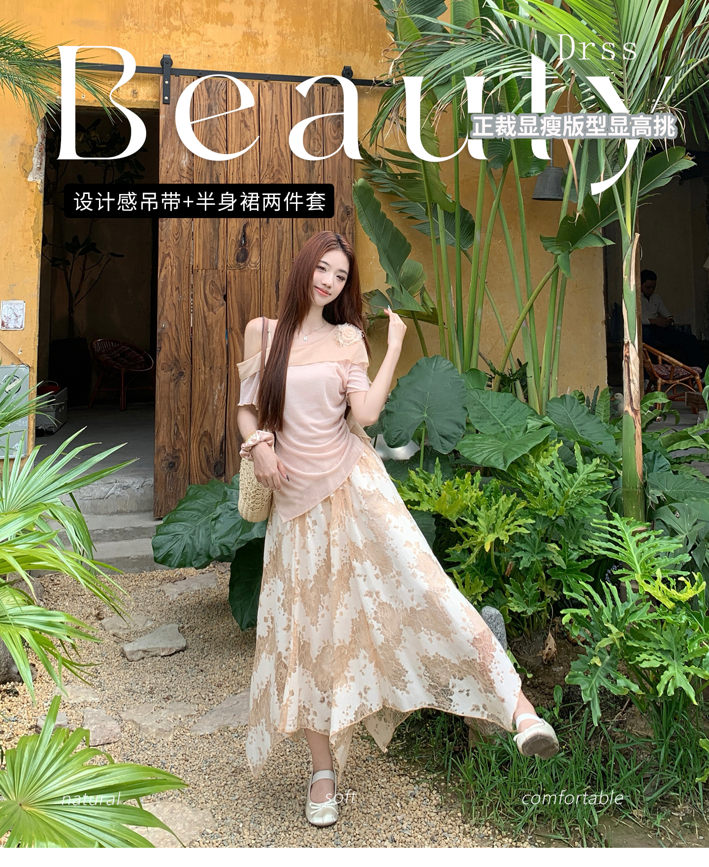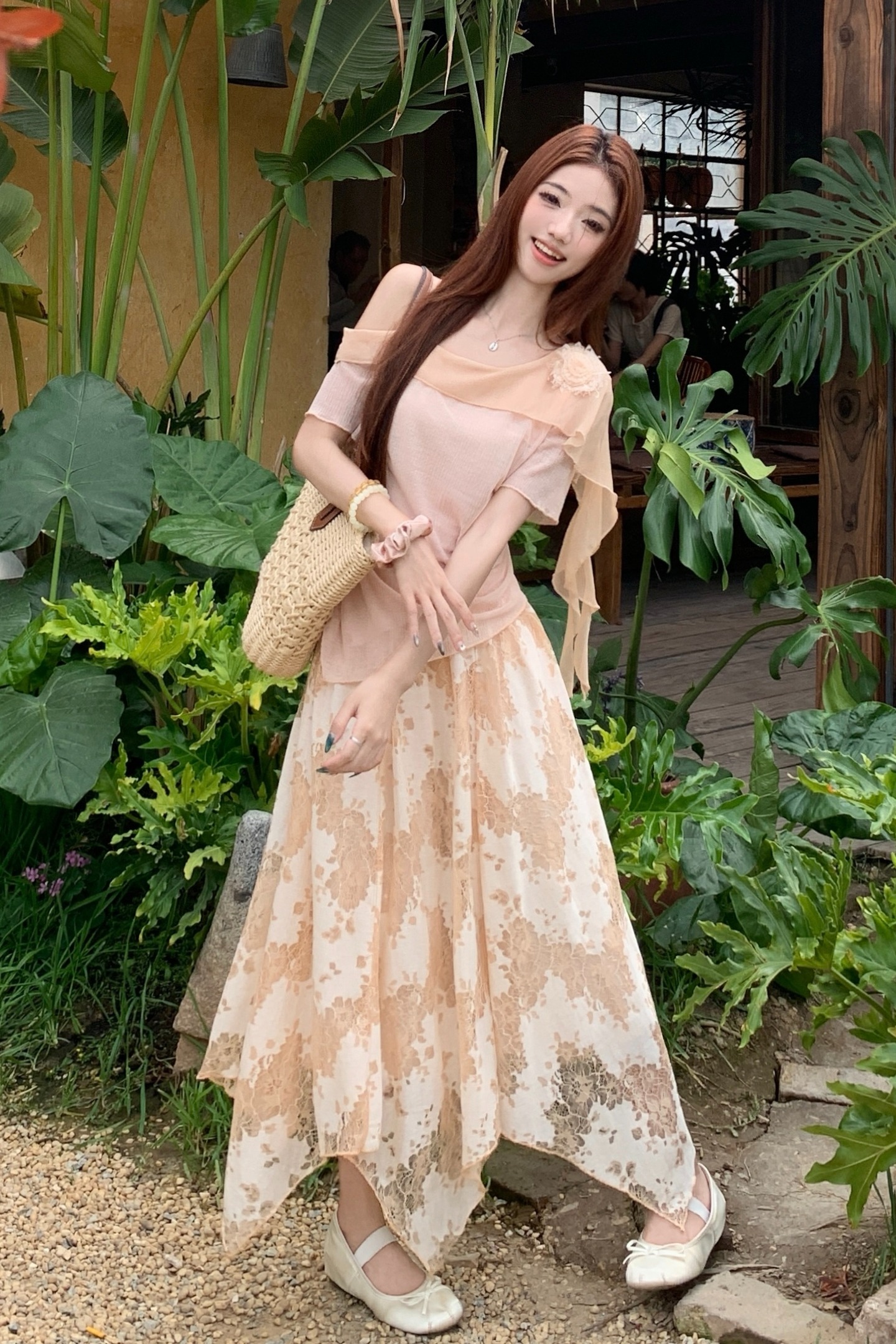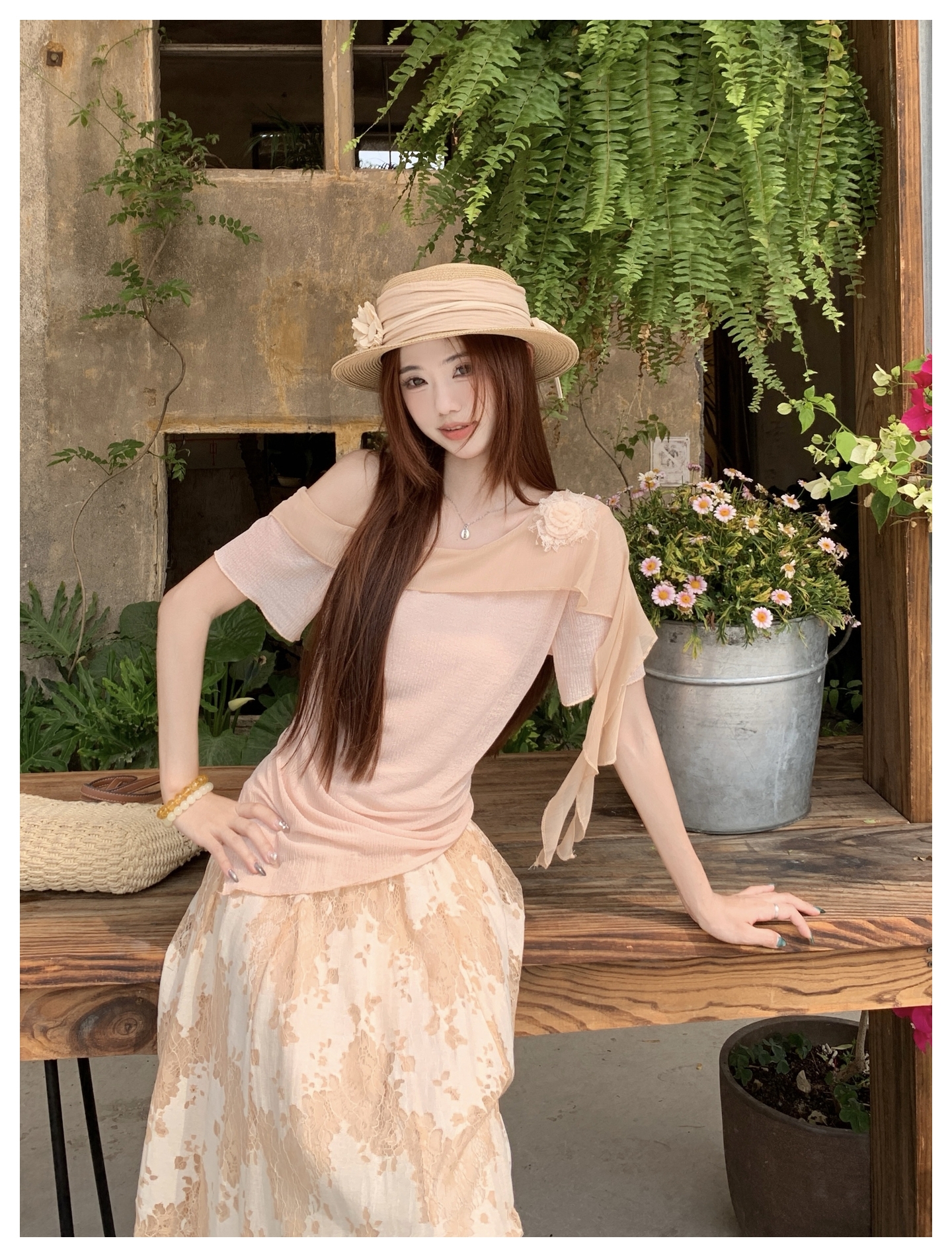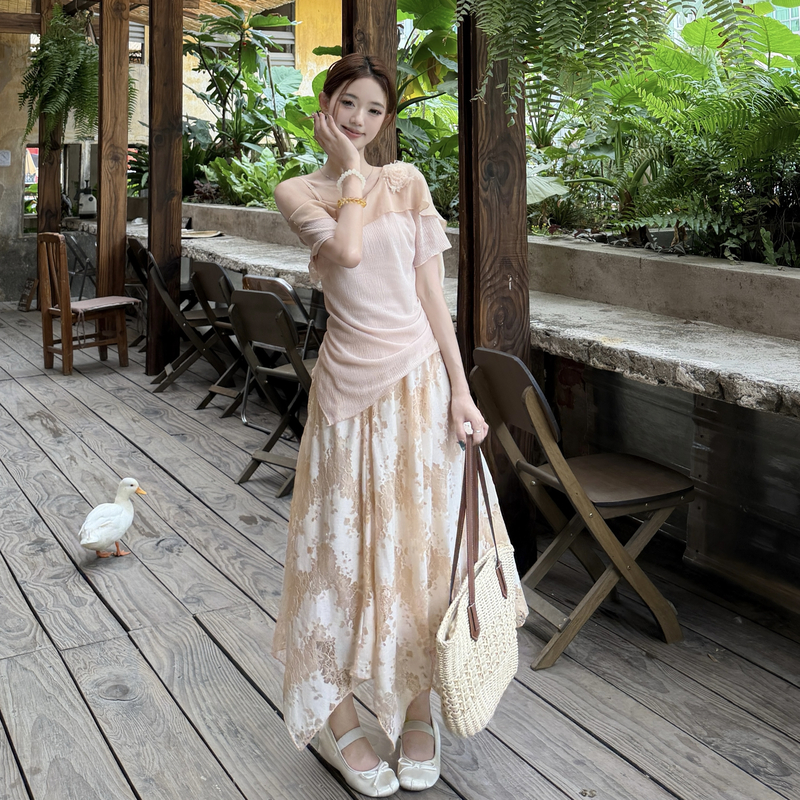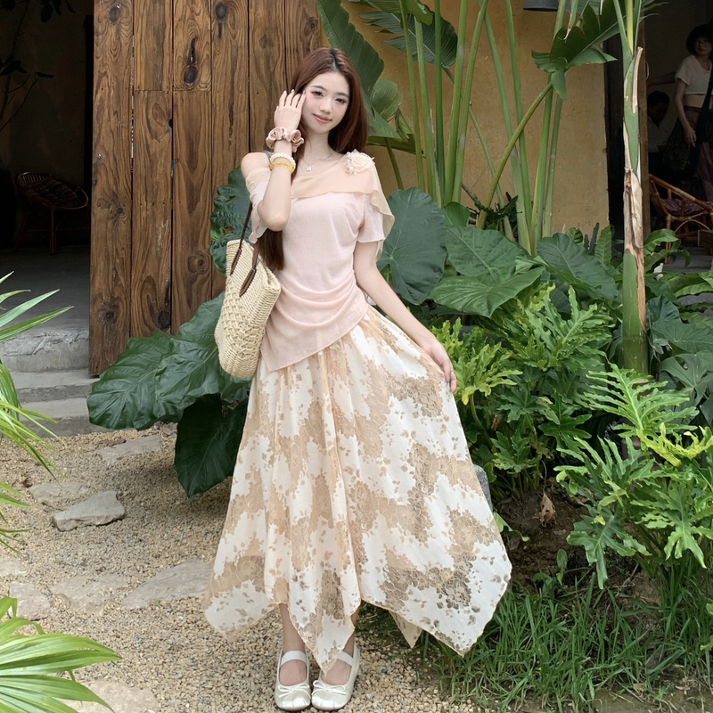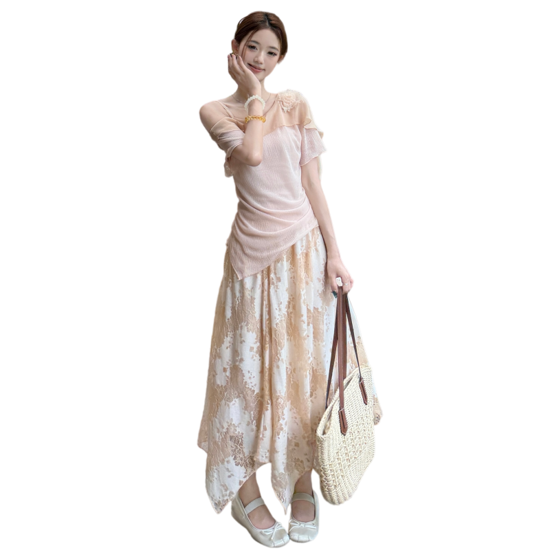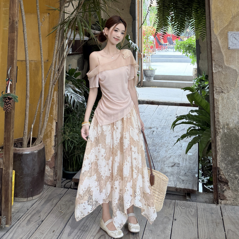 RY2859# 实拍~2026大码女装山茶花露肩上衣+蕾丝半身裙套装胖mm百搭两件套