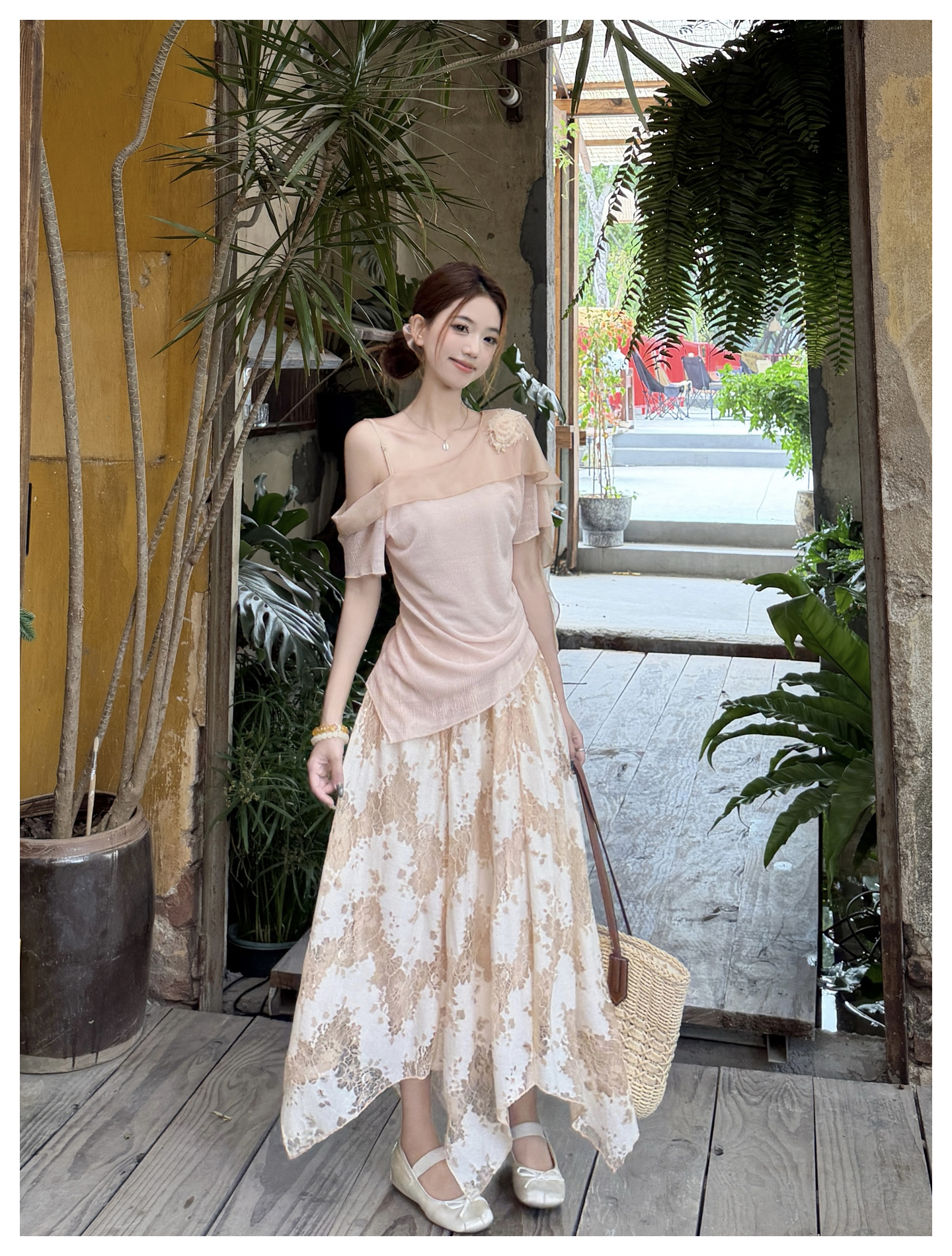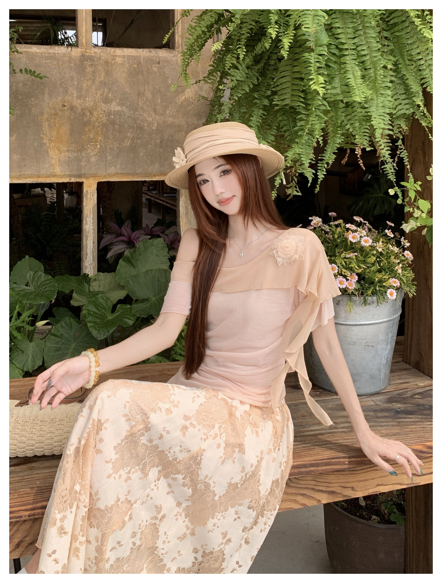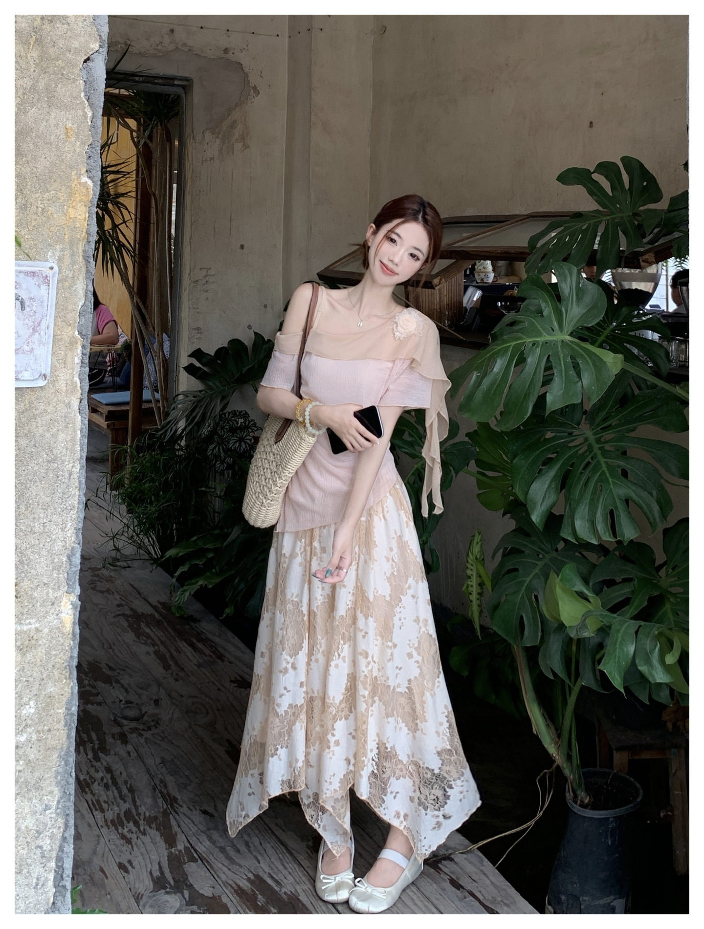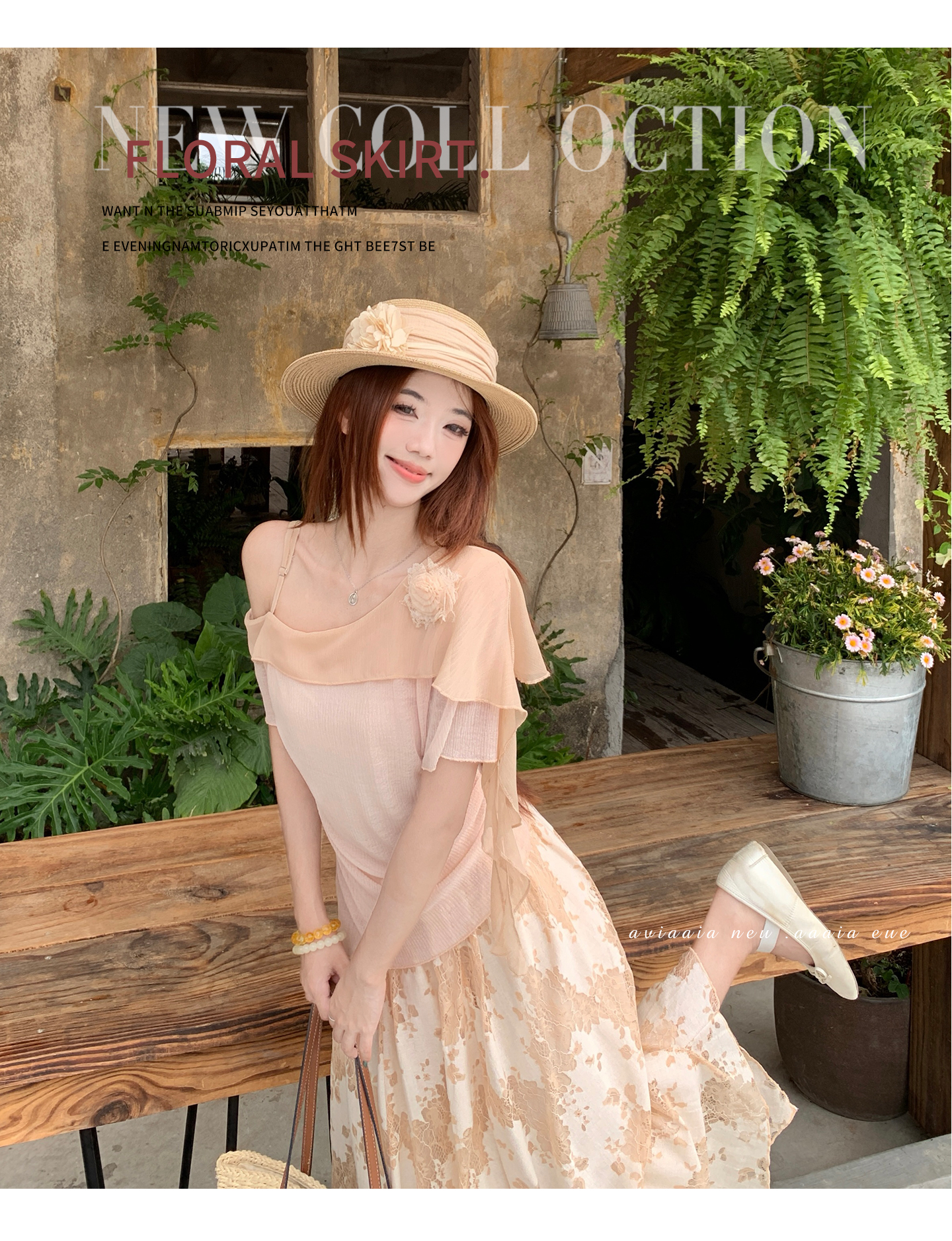 RY2859# 实拍~2026大码女装山茶花露肩上衣+蕾丝半身裙套装胖mm百搭两件套