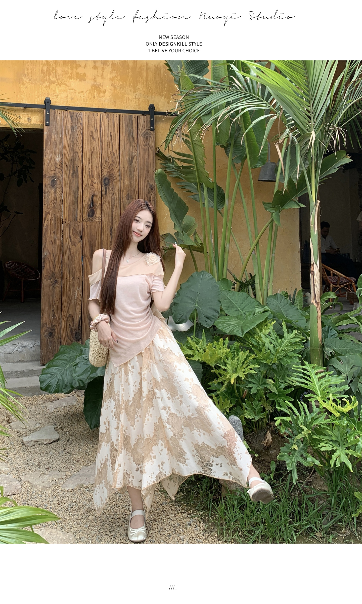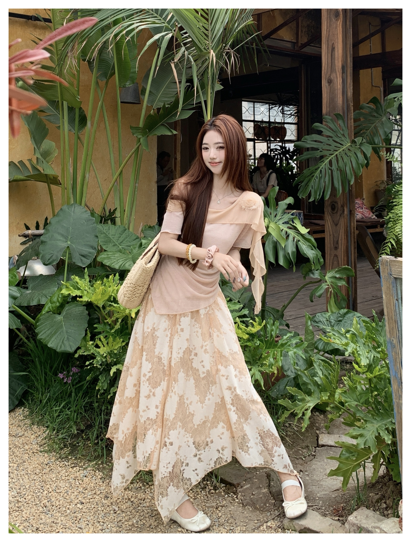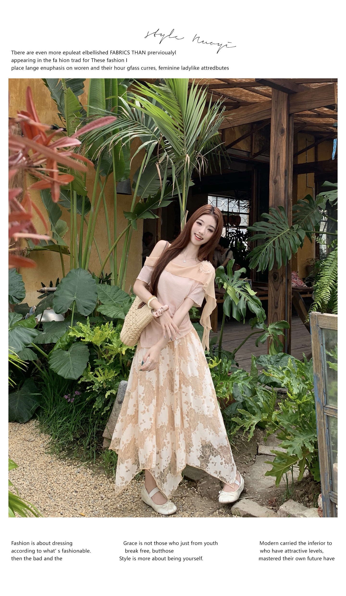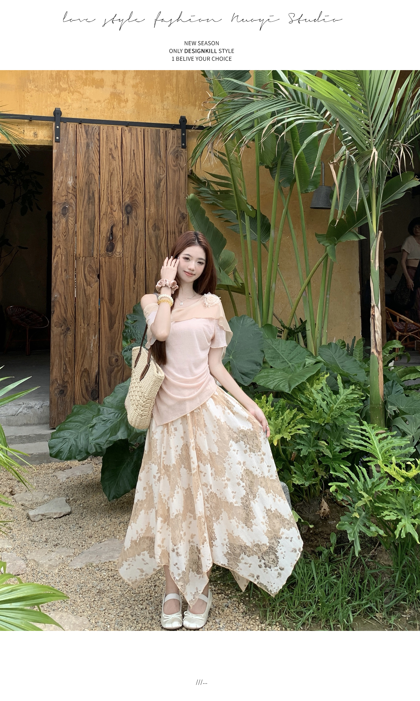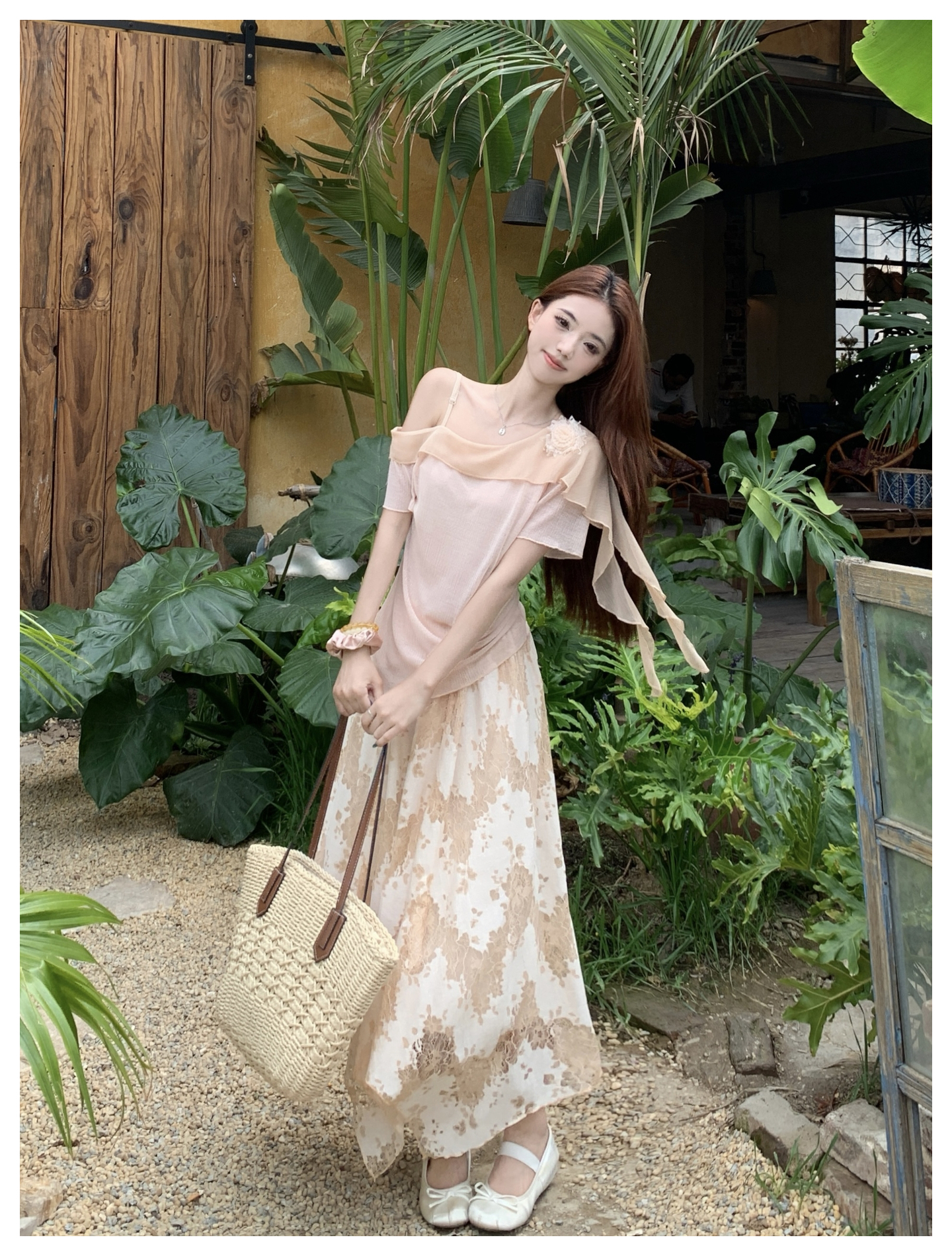 RY2859# 实拍~2026大码女装山茶花露肩上衣+蕾丝半身裙套装胖mm百搭两件套