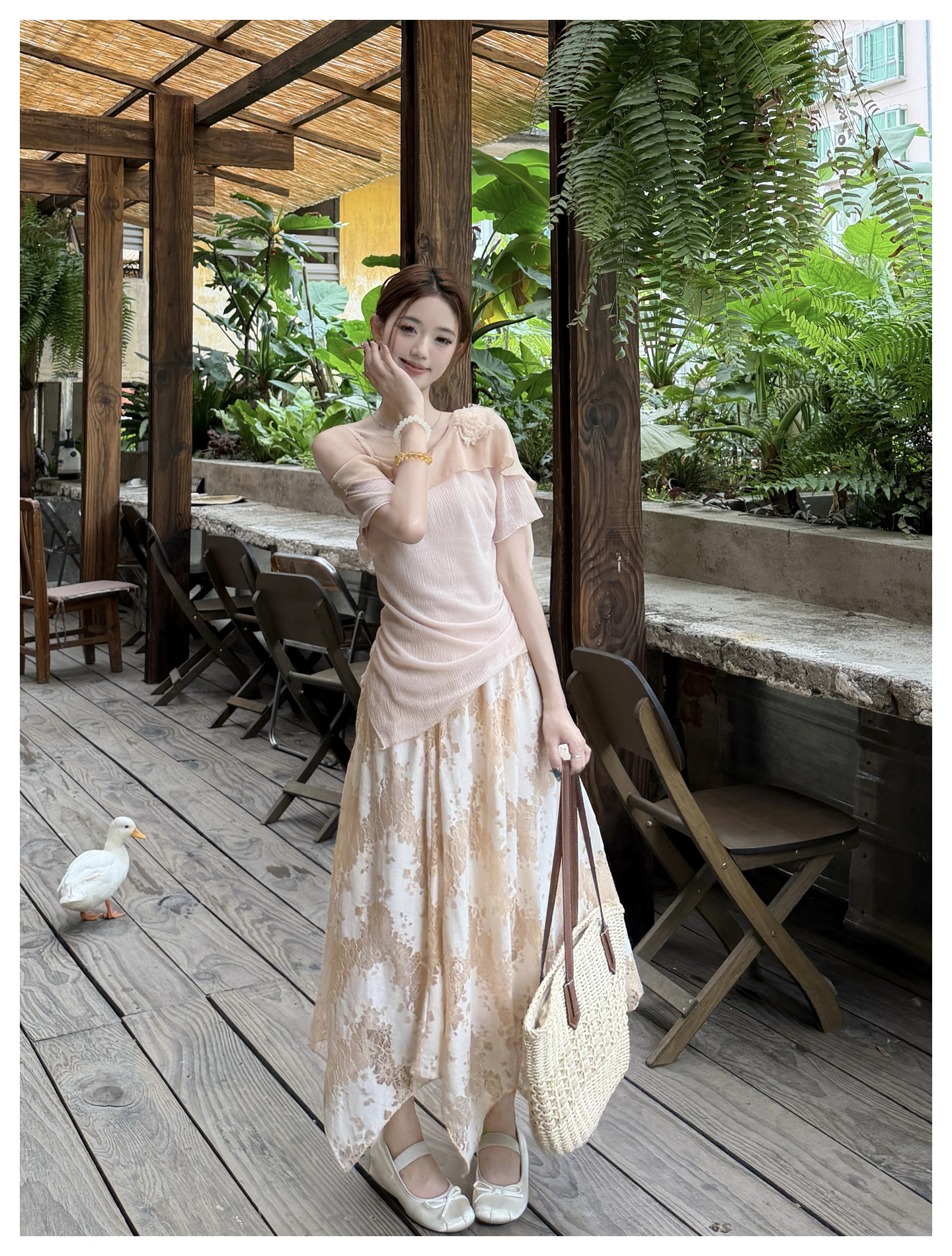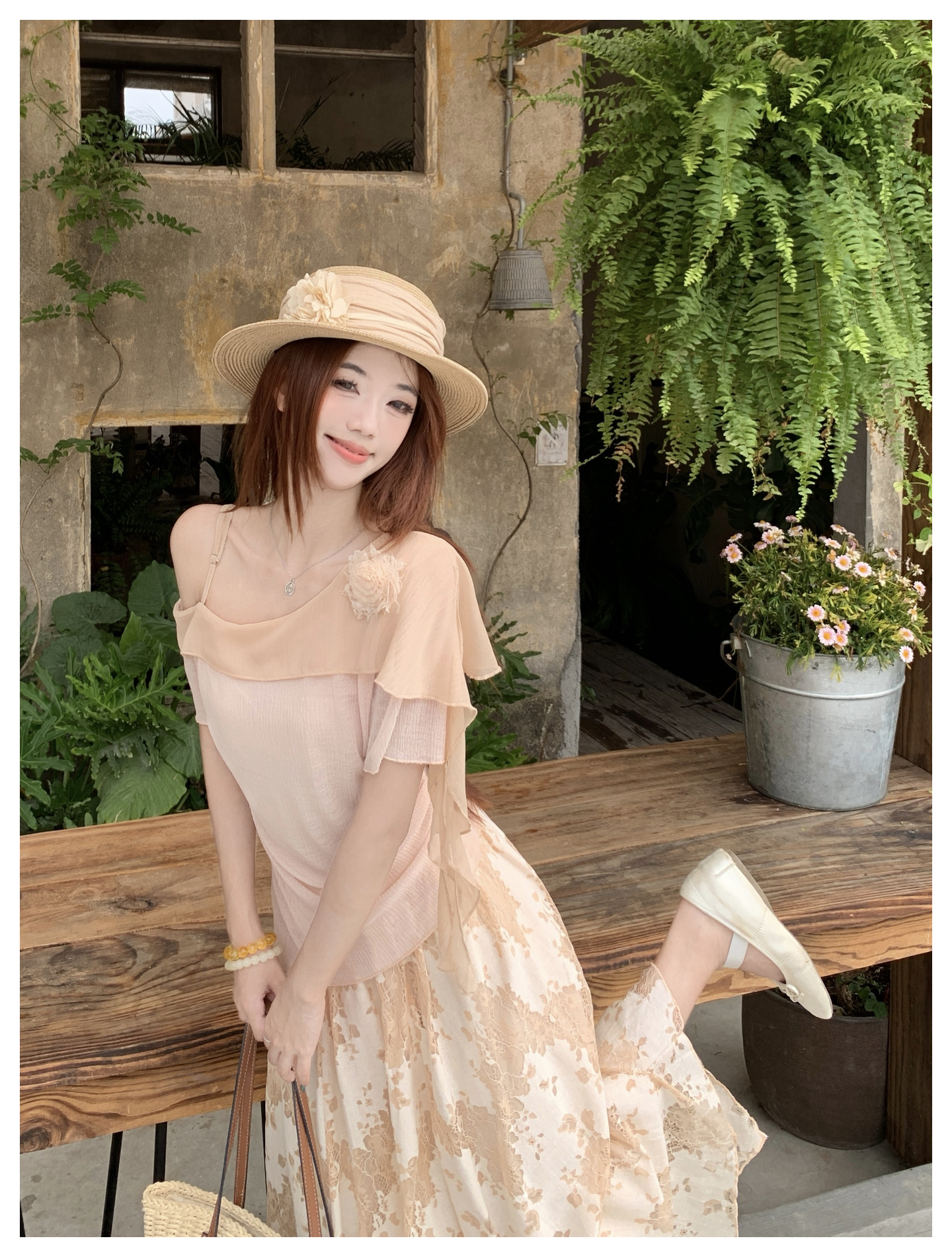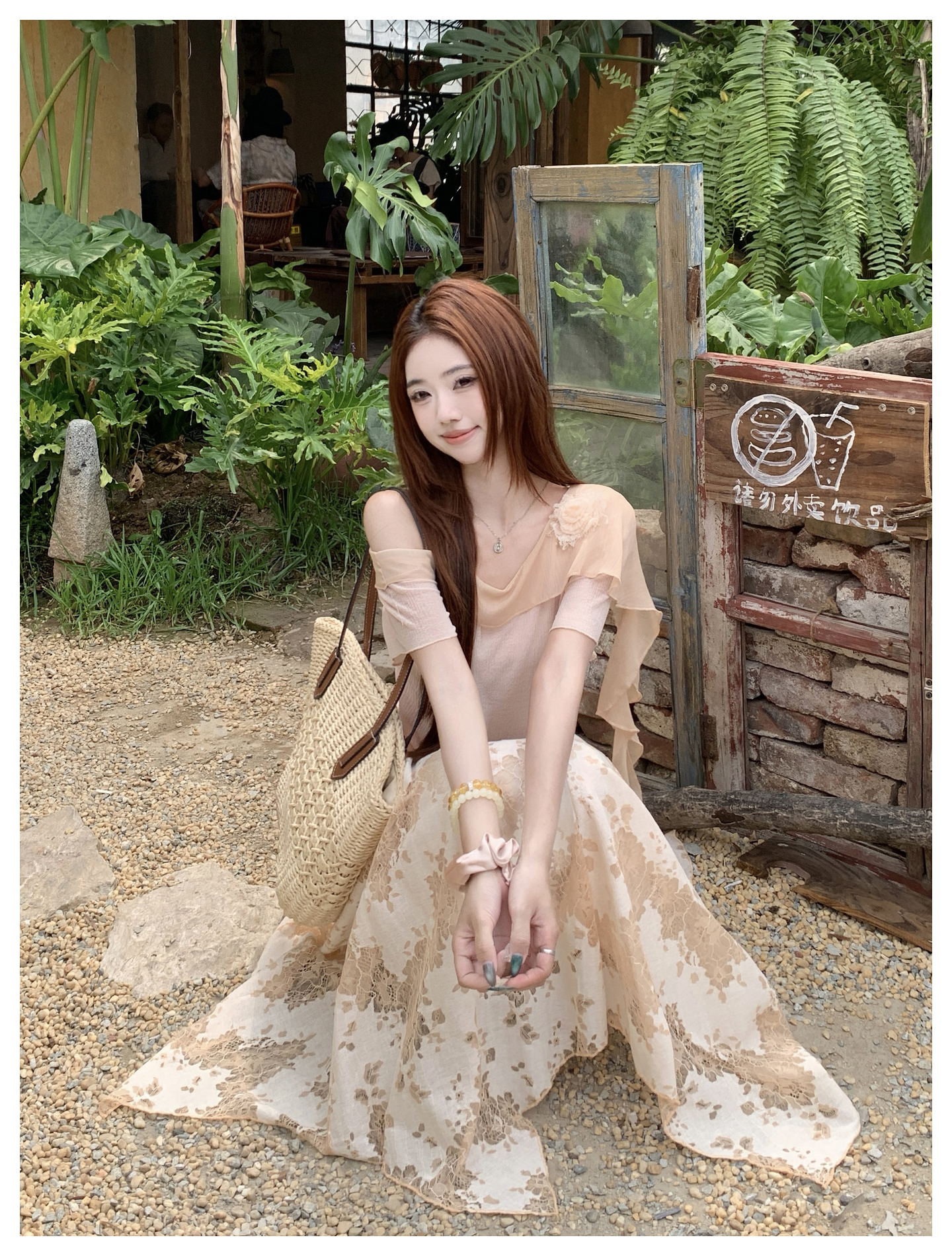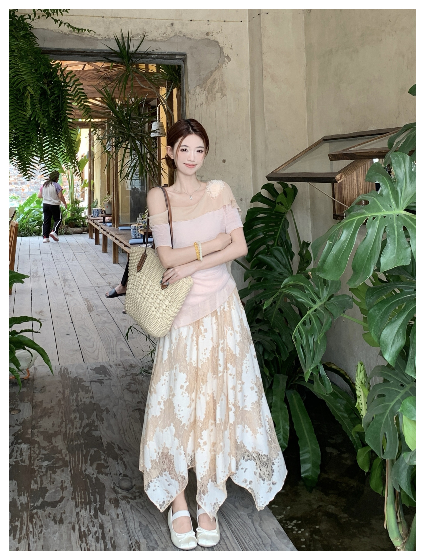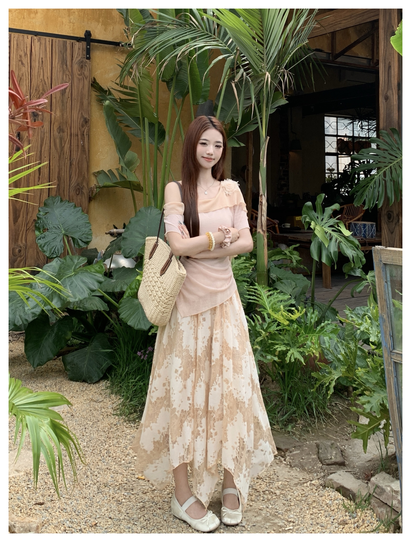 RY2859# 实拍~2026大码女装山茶花露肩上衣+蕾丝半身裙套装胖mm百搭两件套