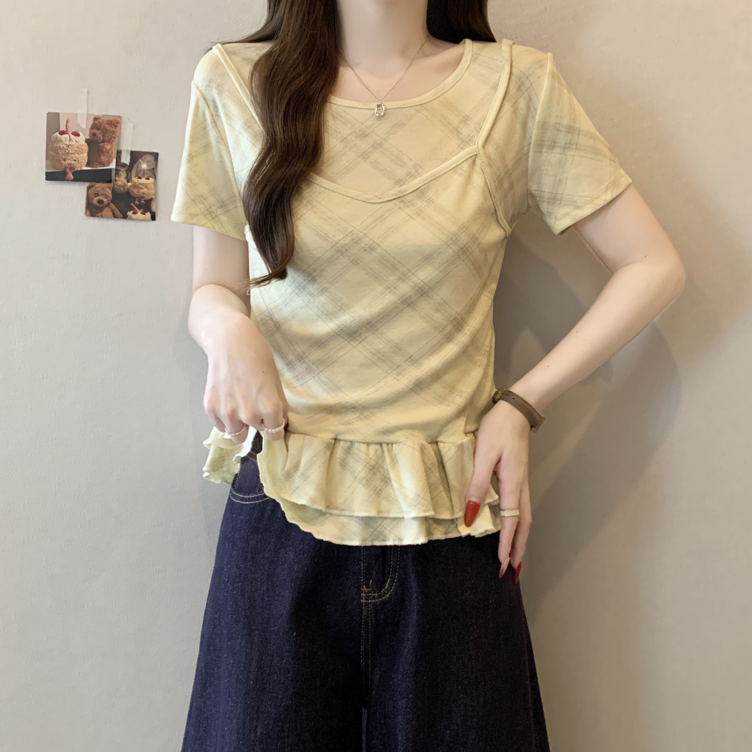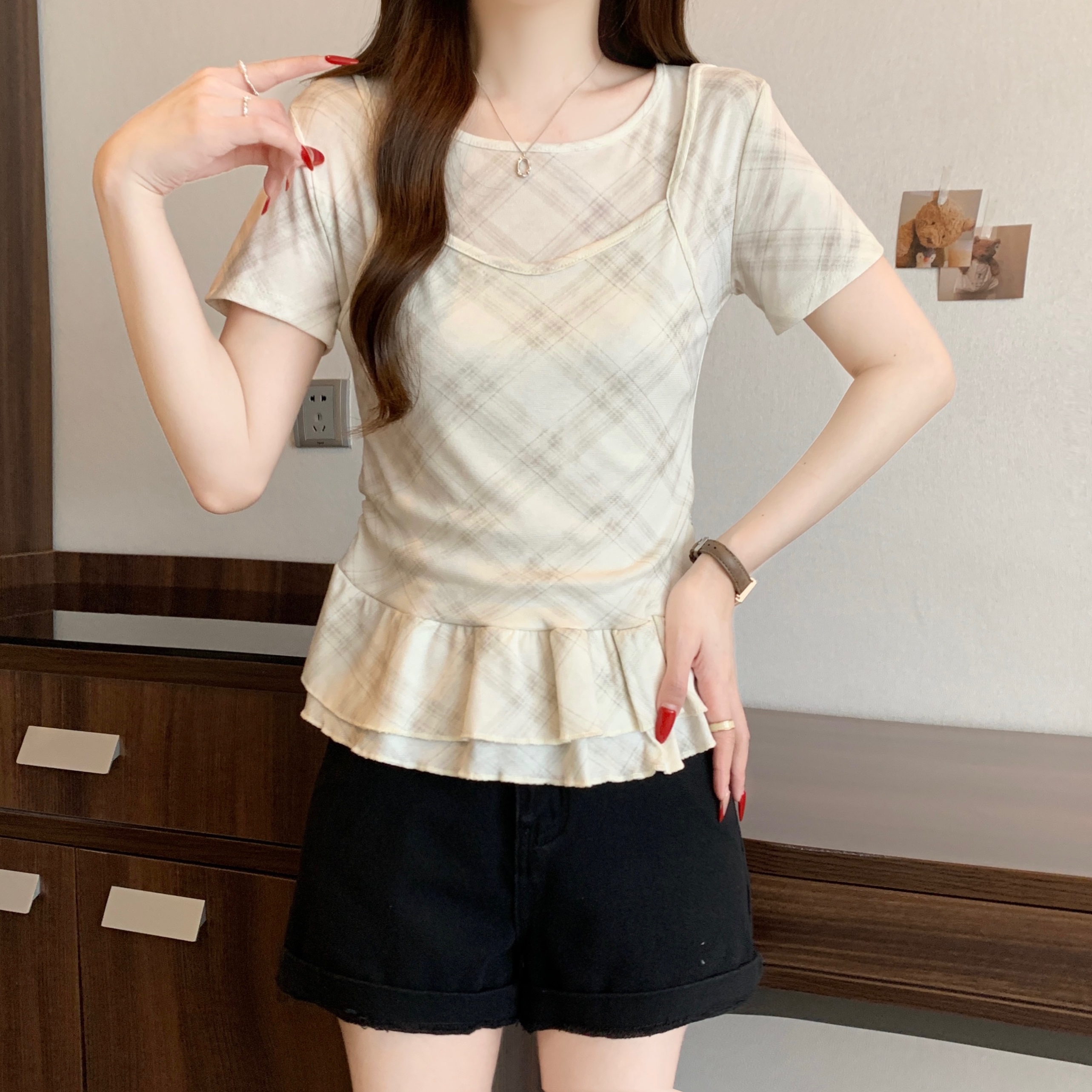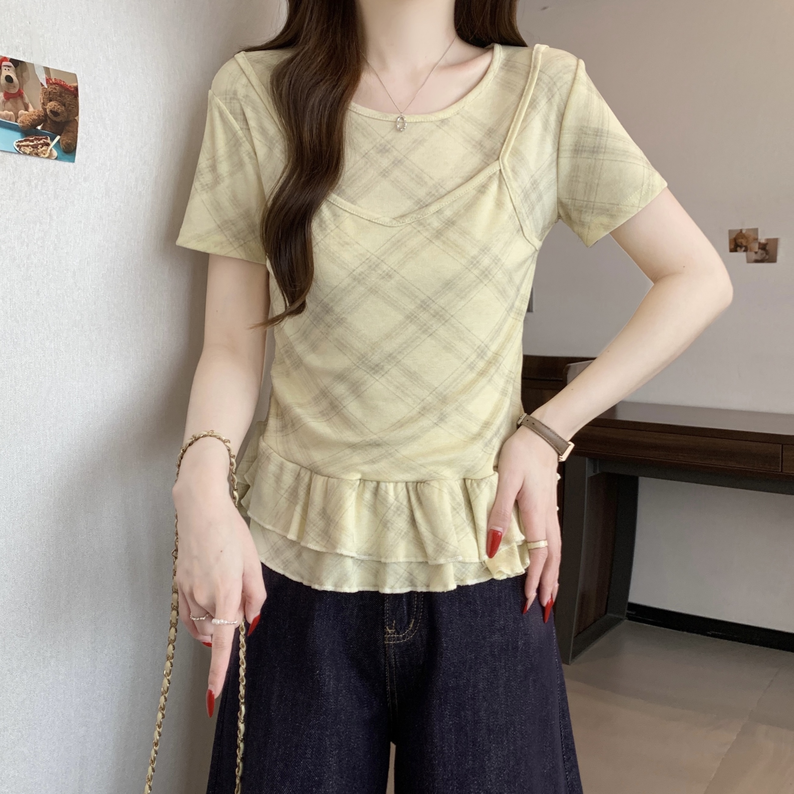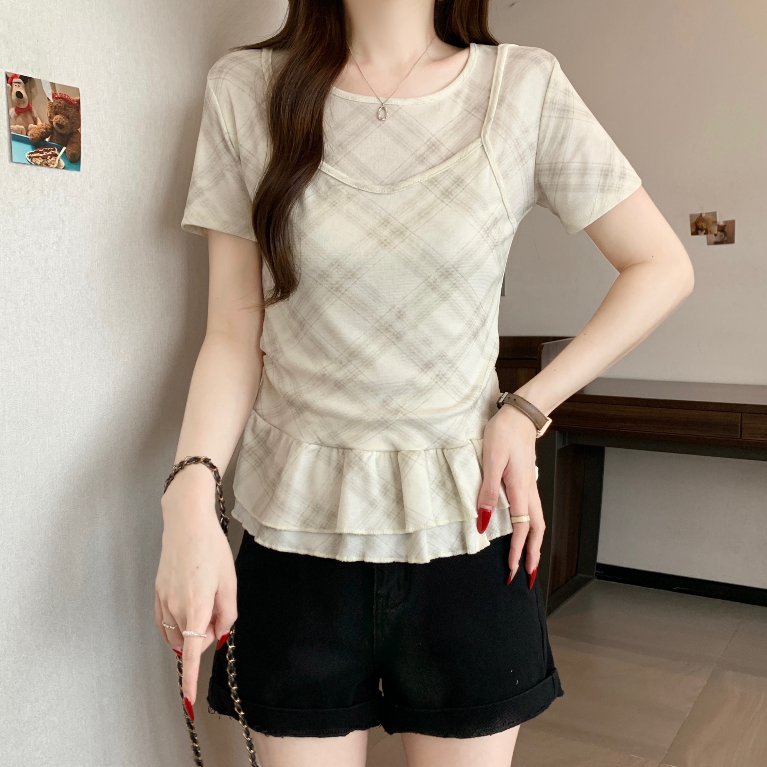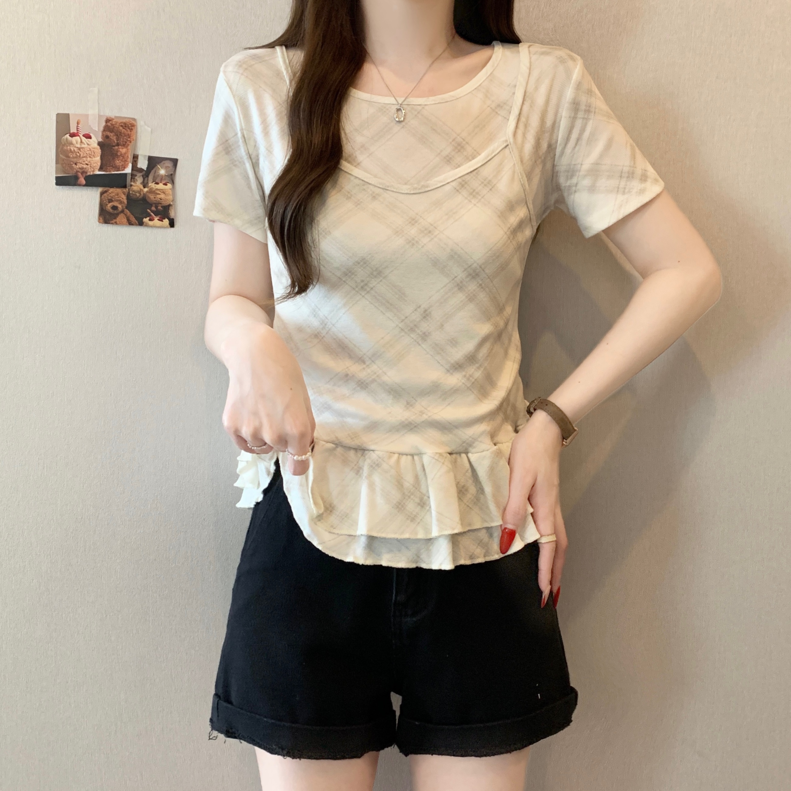 RY2860# 实拍~2026大码格子拼接短袖上衣夏季新款假两件显瘦正肩t恤