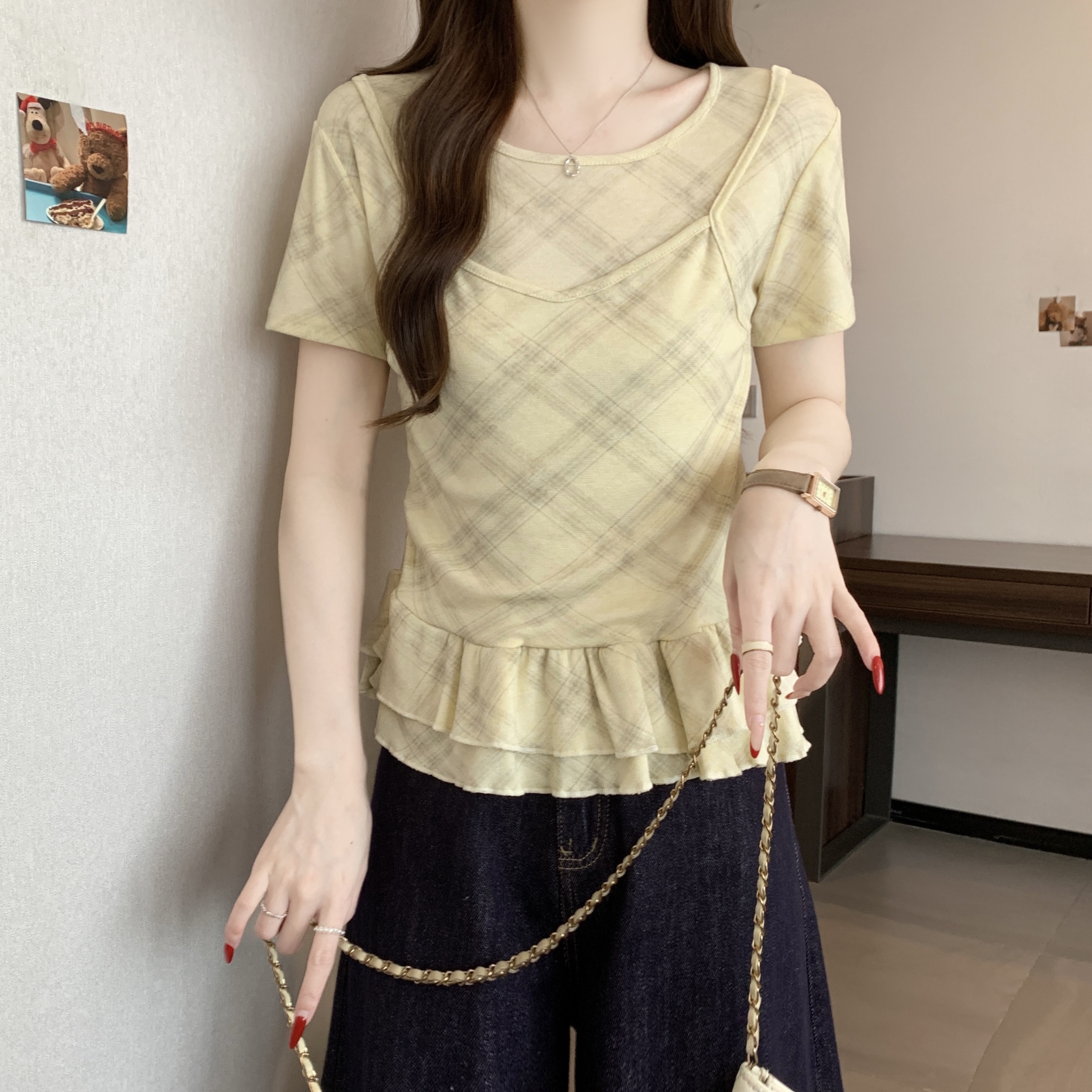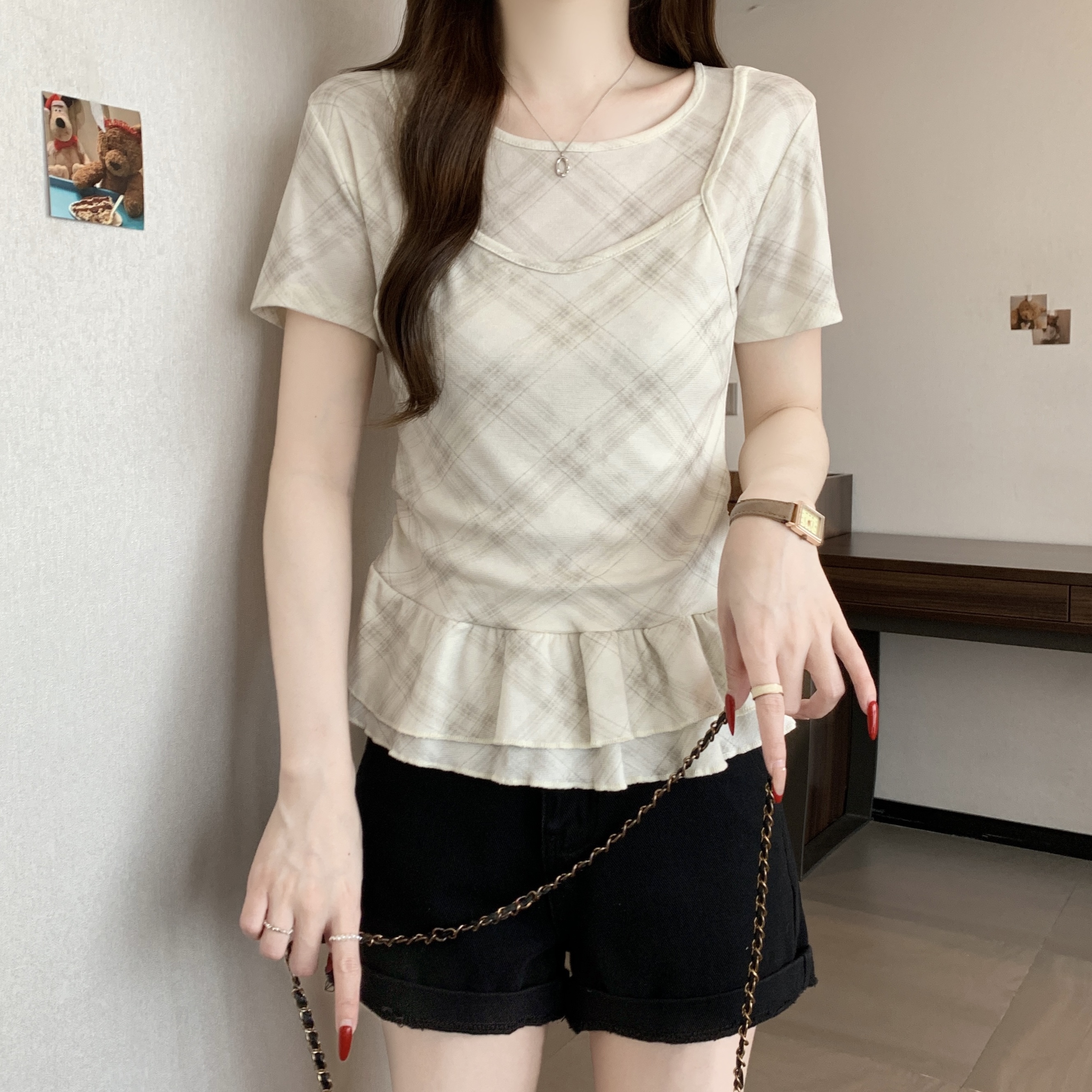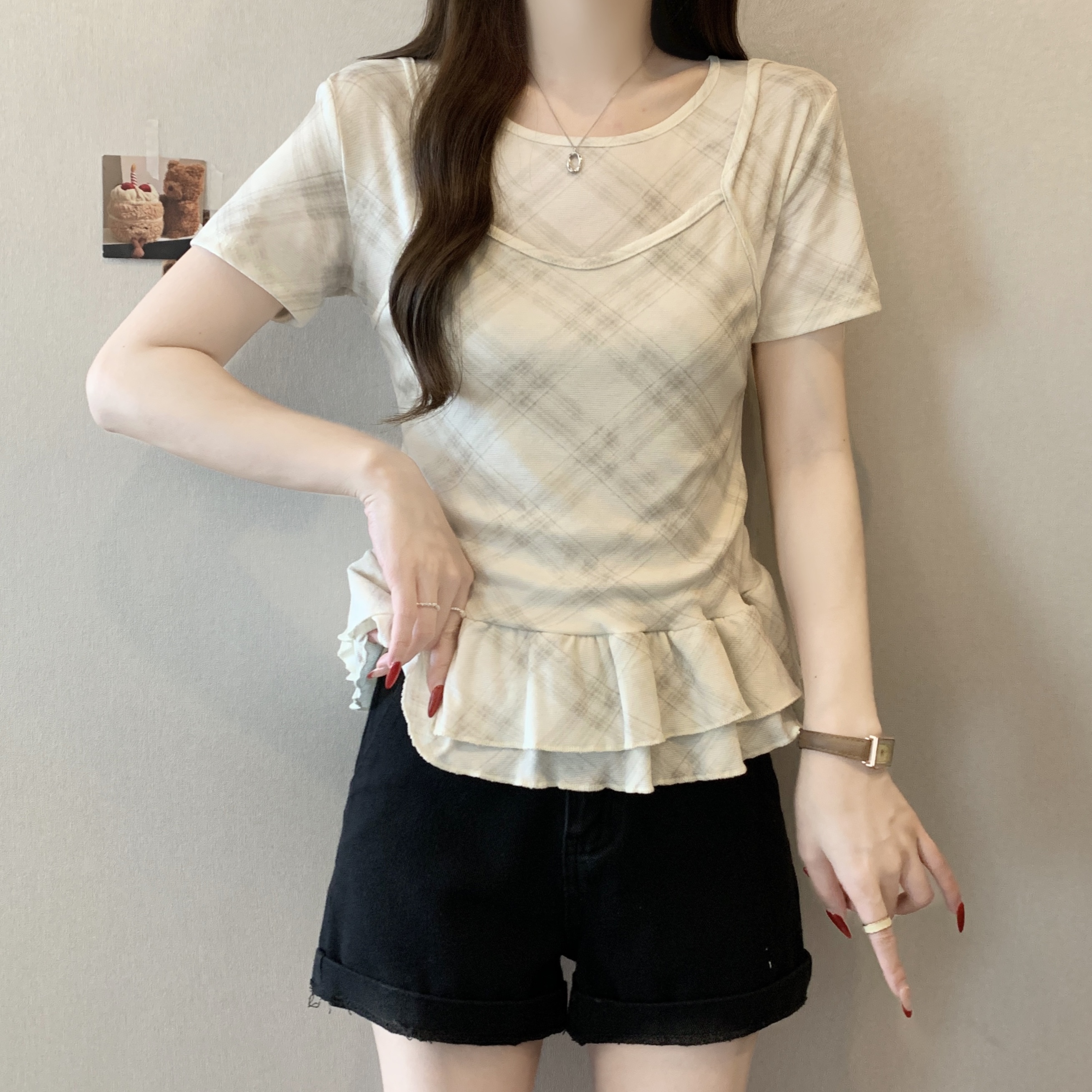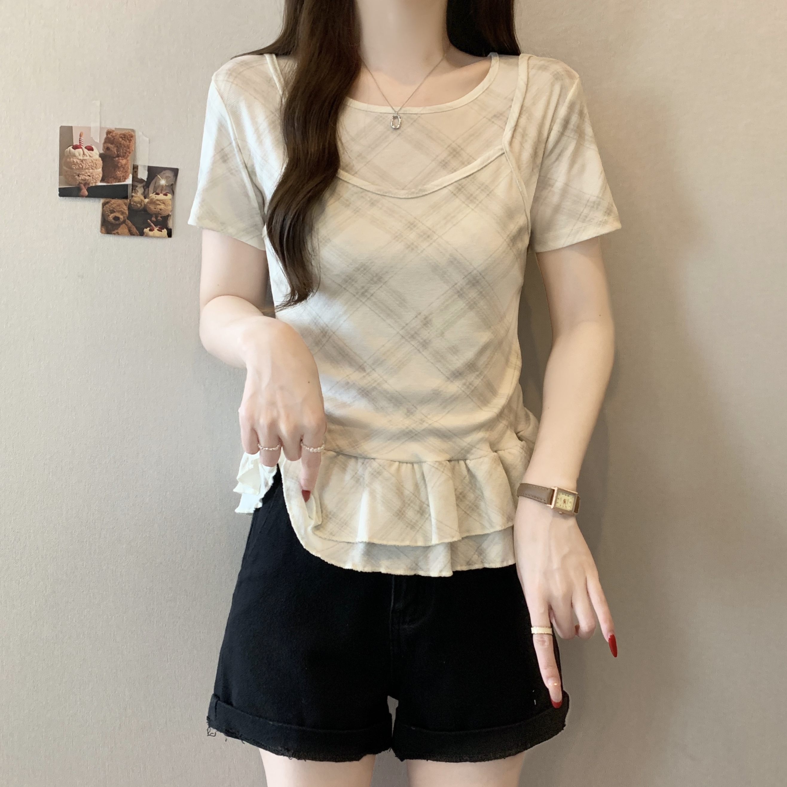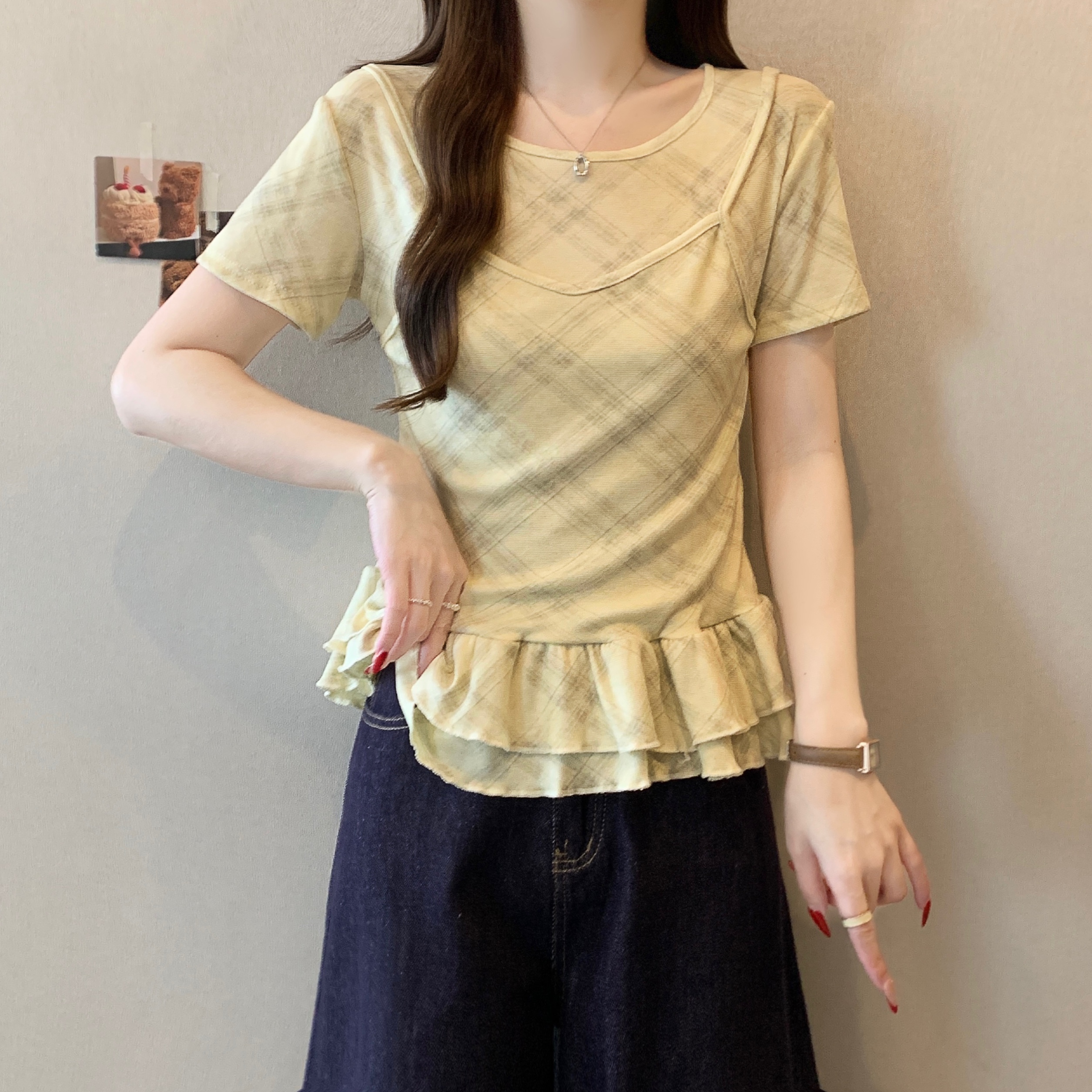 RY2860# 实拍~2026大码格子拼接短袖上衣夏季新款假两件显瘦正肩t恤