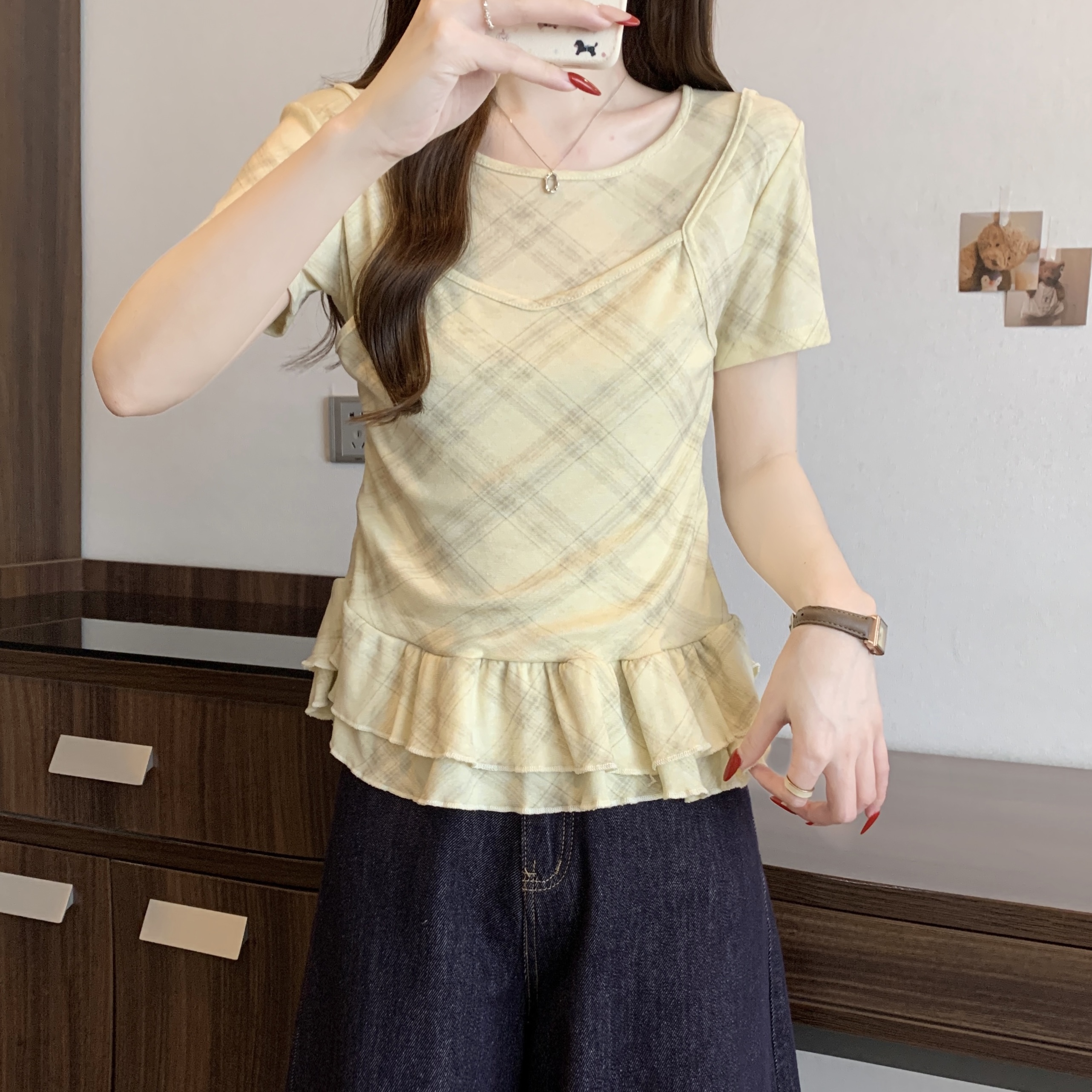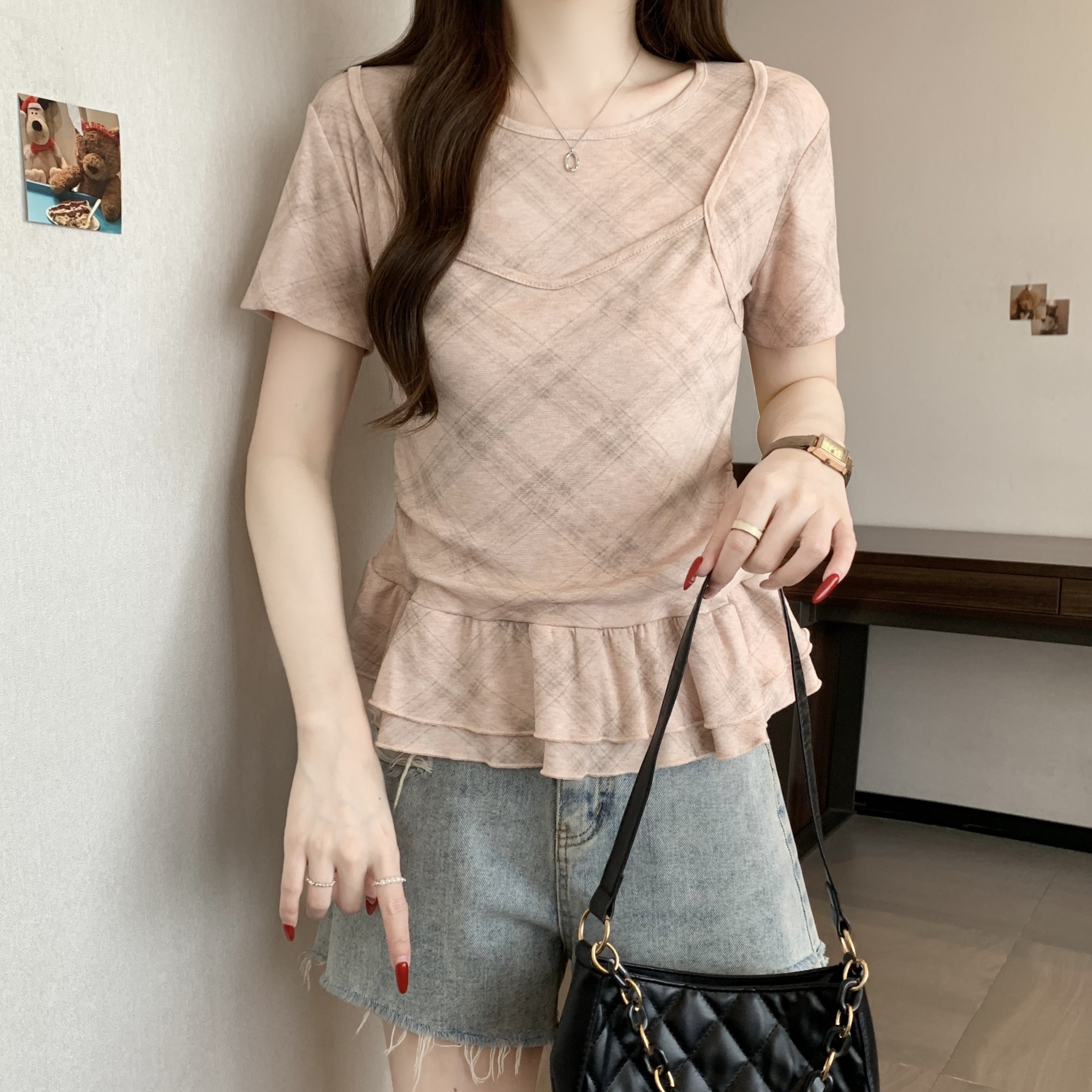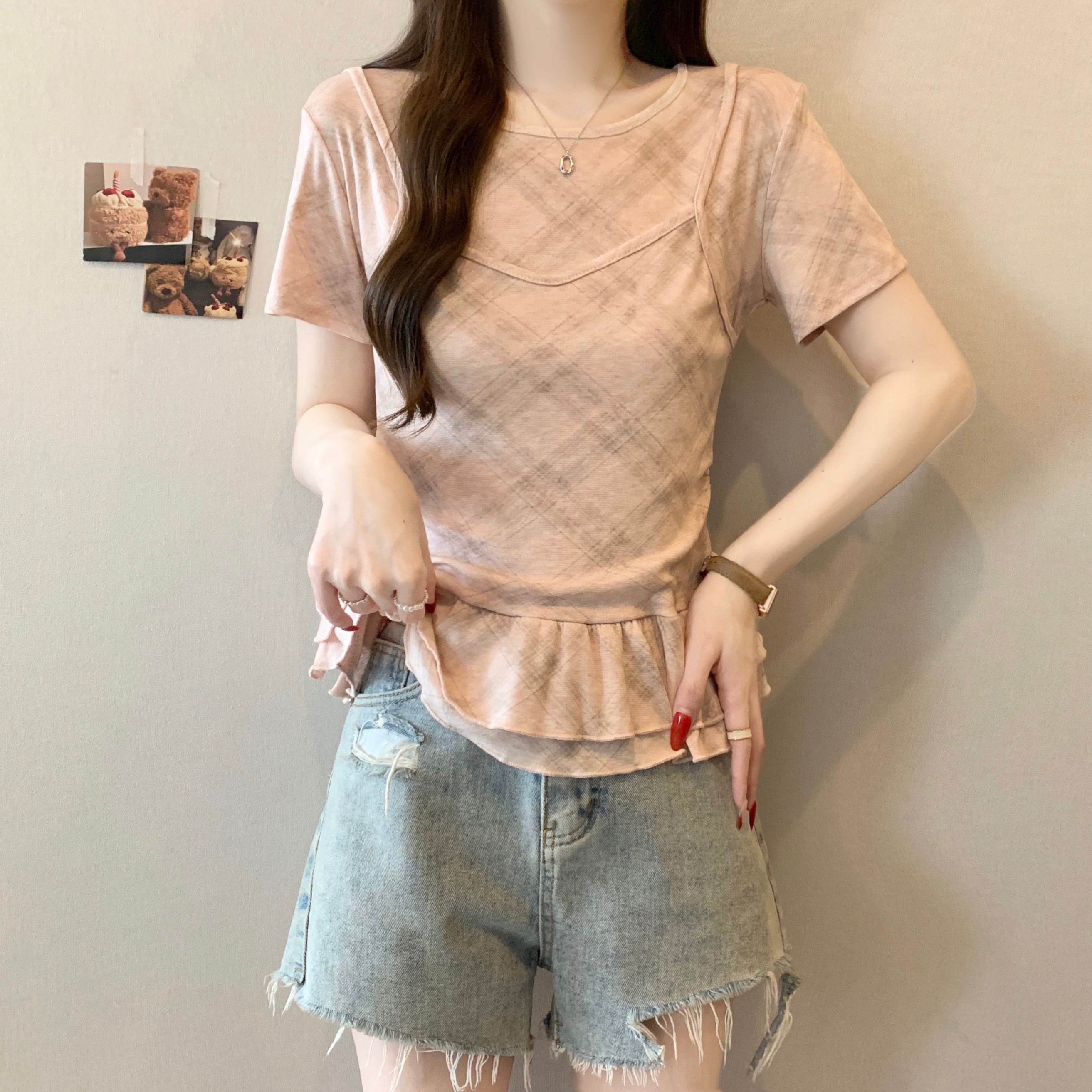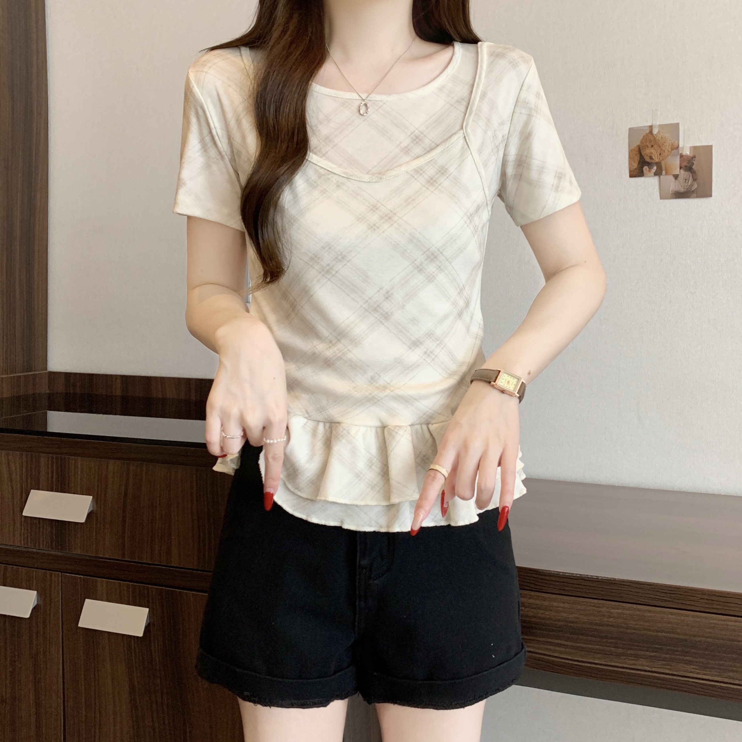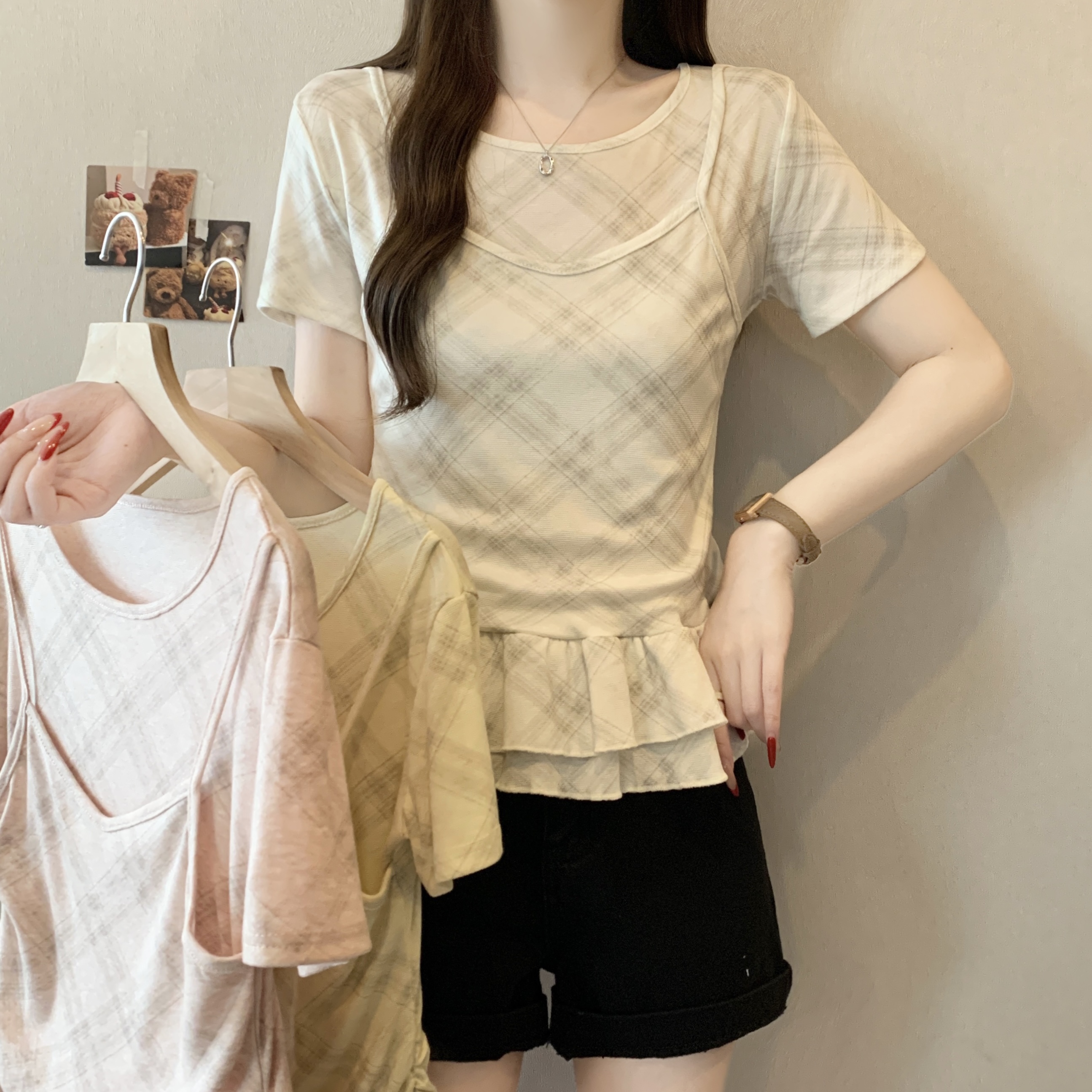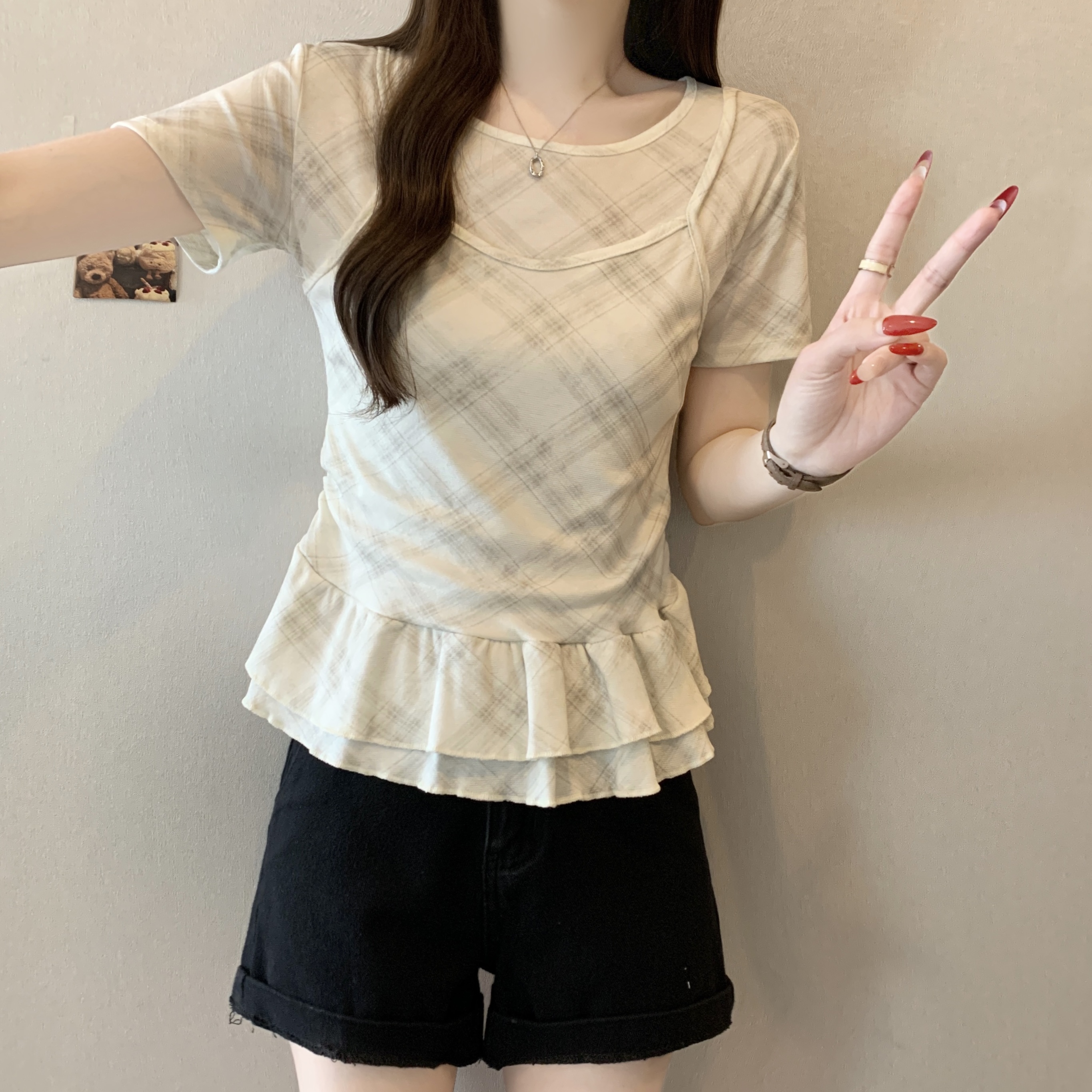 RY2860# 实拍~2026大码格子拼接短袖上衣夏季新款假两件显瘦正肩t恤