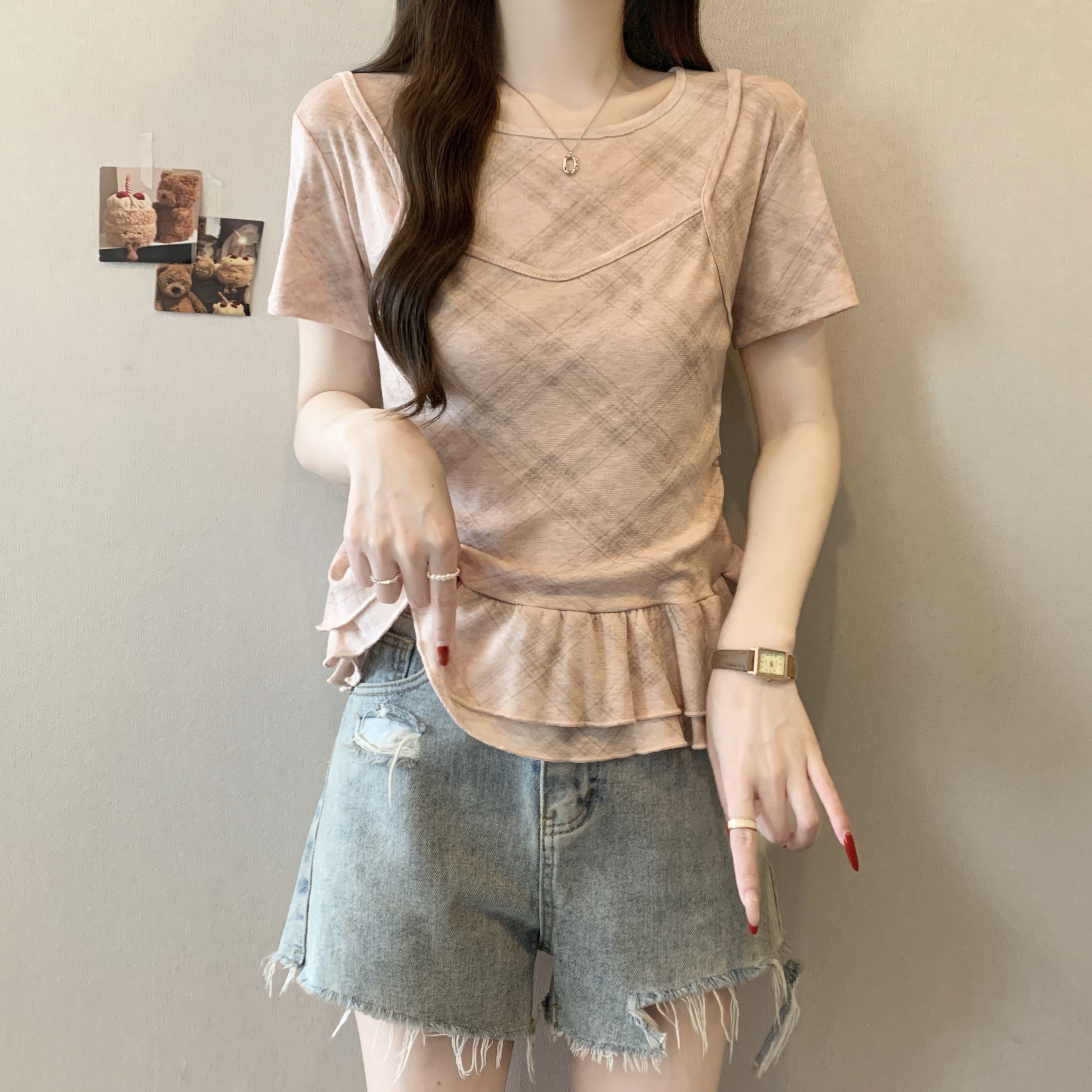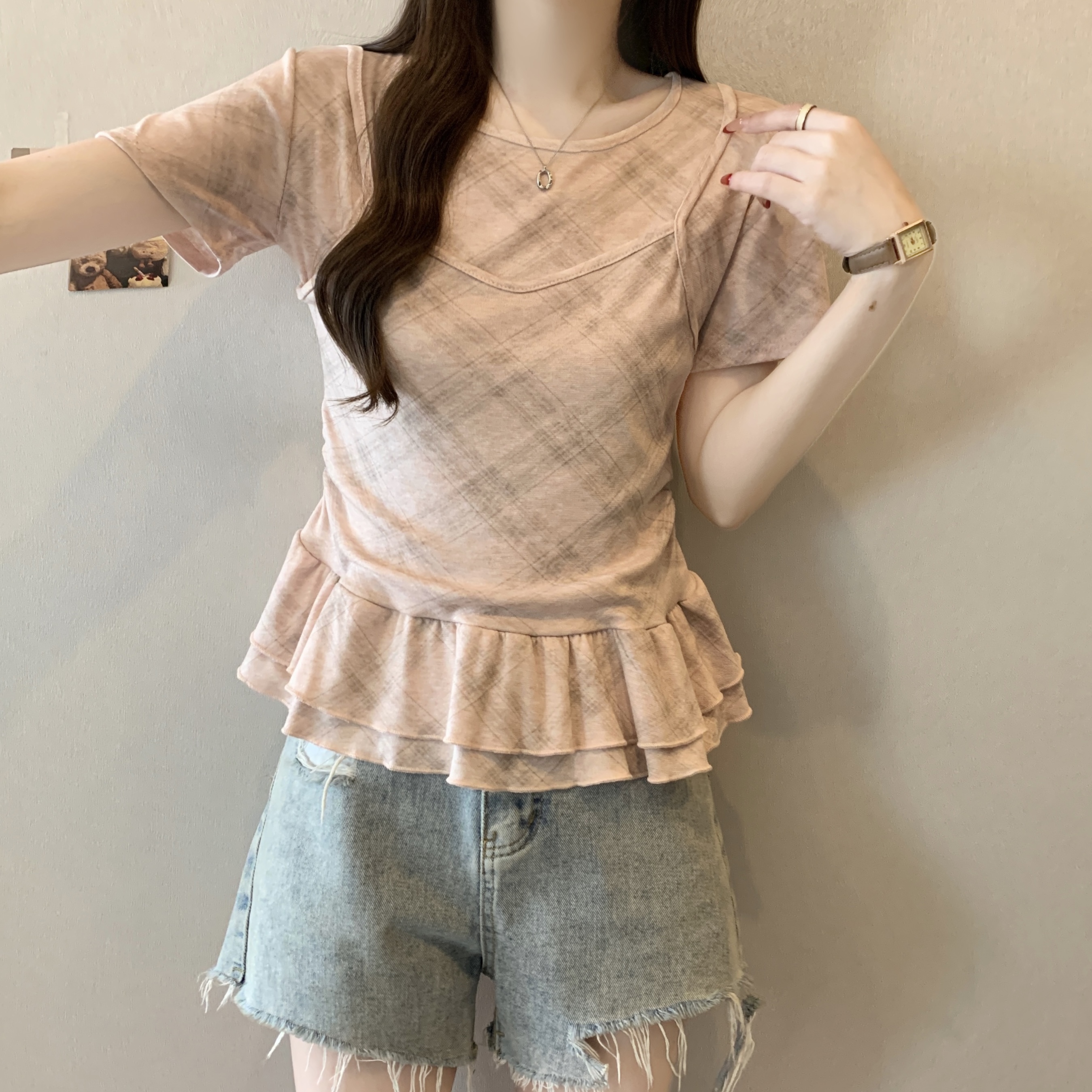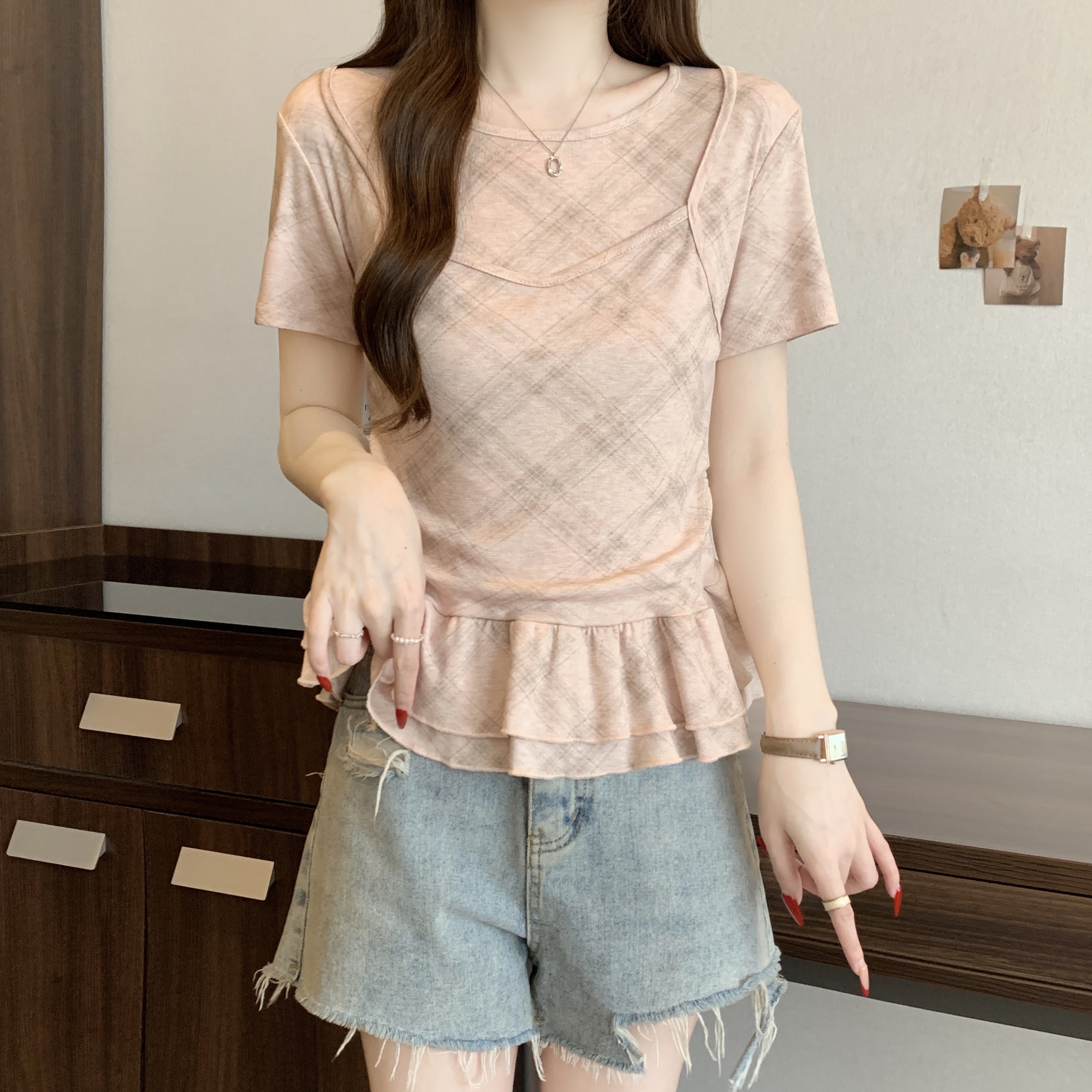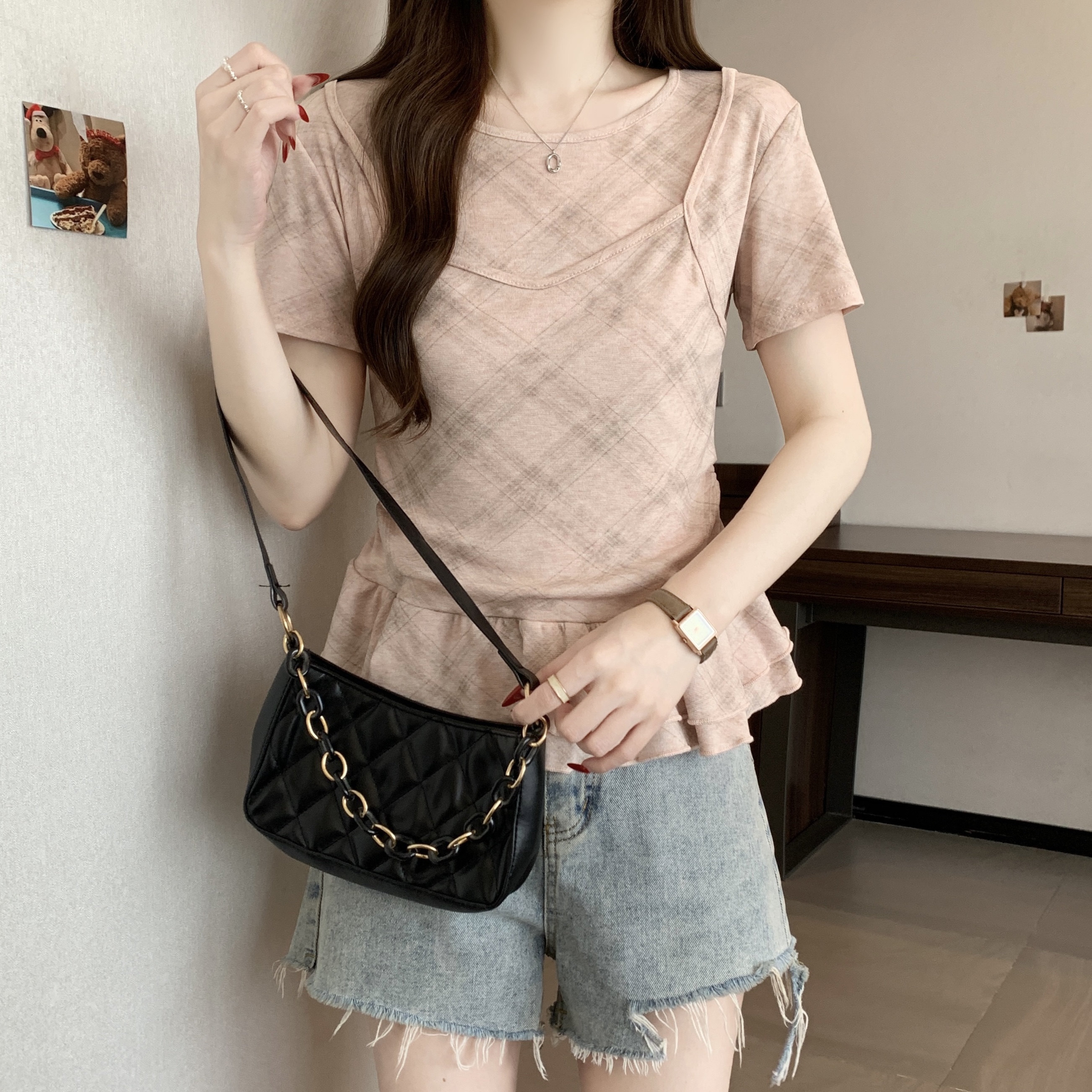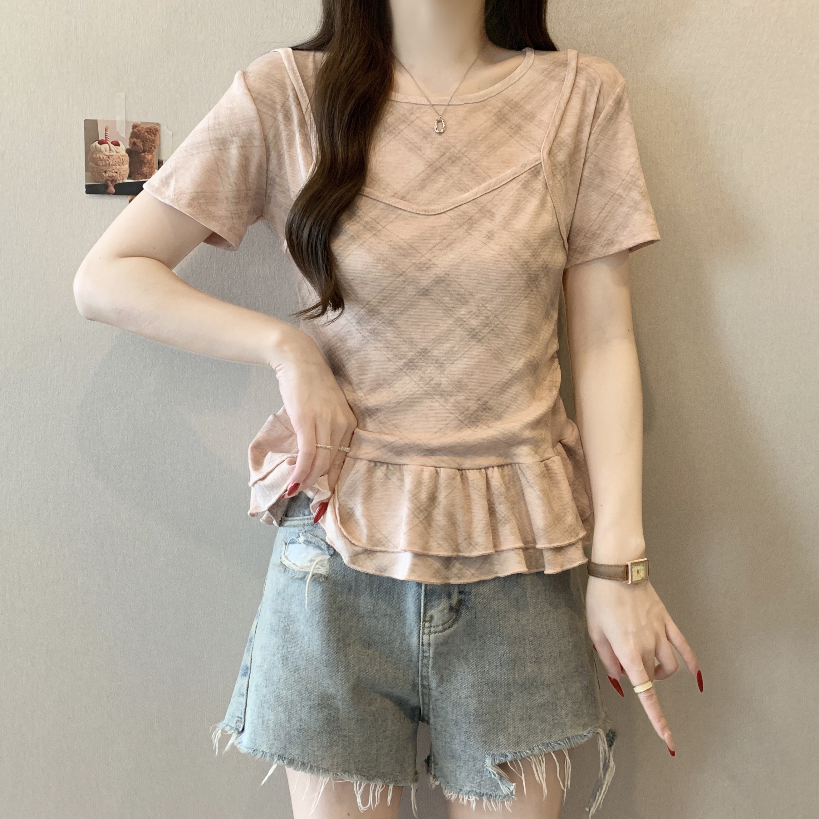 RY2860# 实拍~2026大码格子拼接短袖上衣夏季新款假两件显瘦正肩t恤