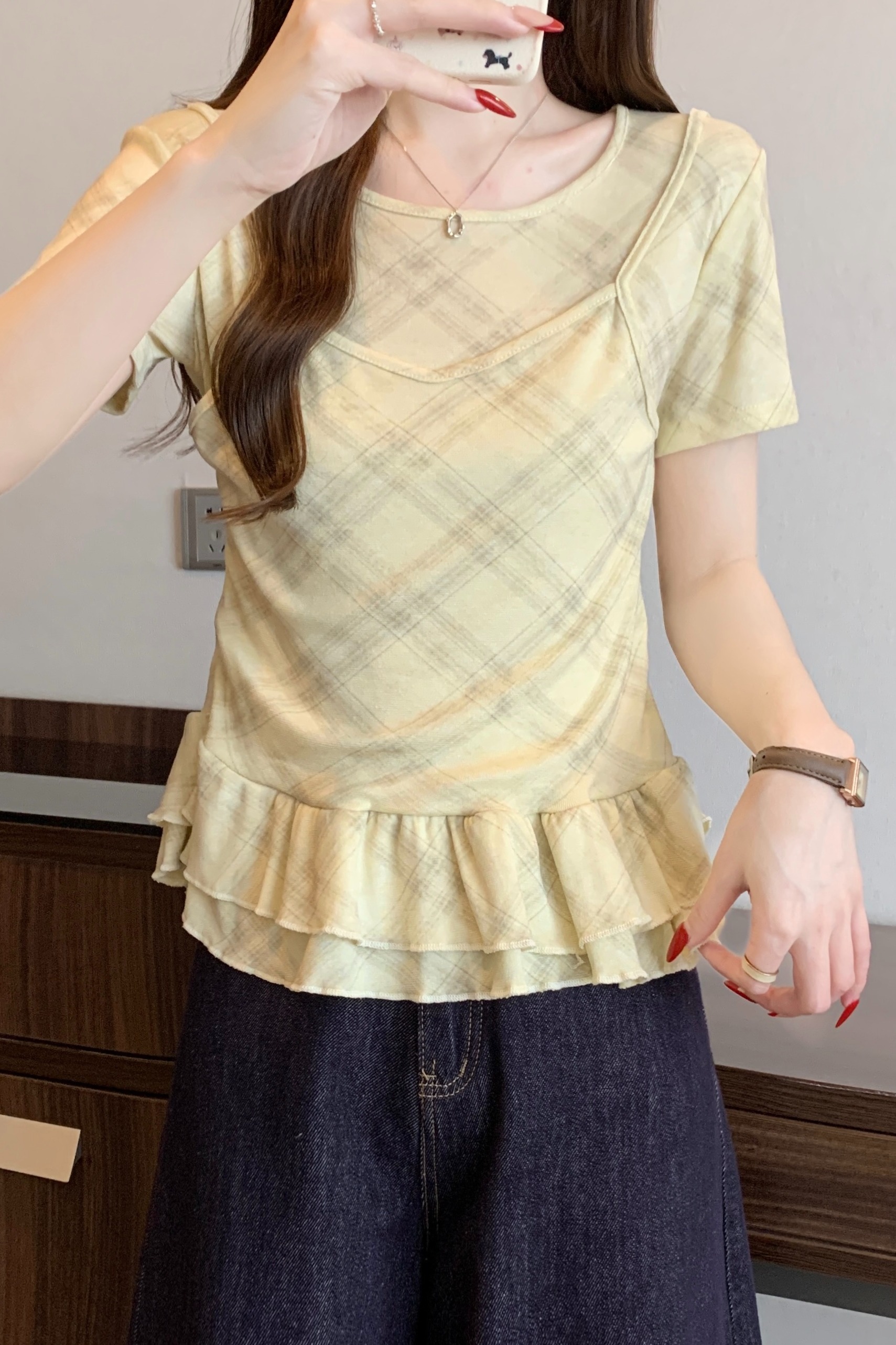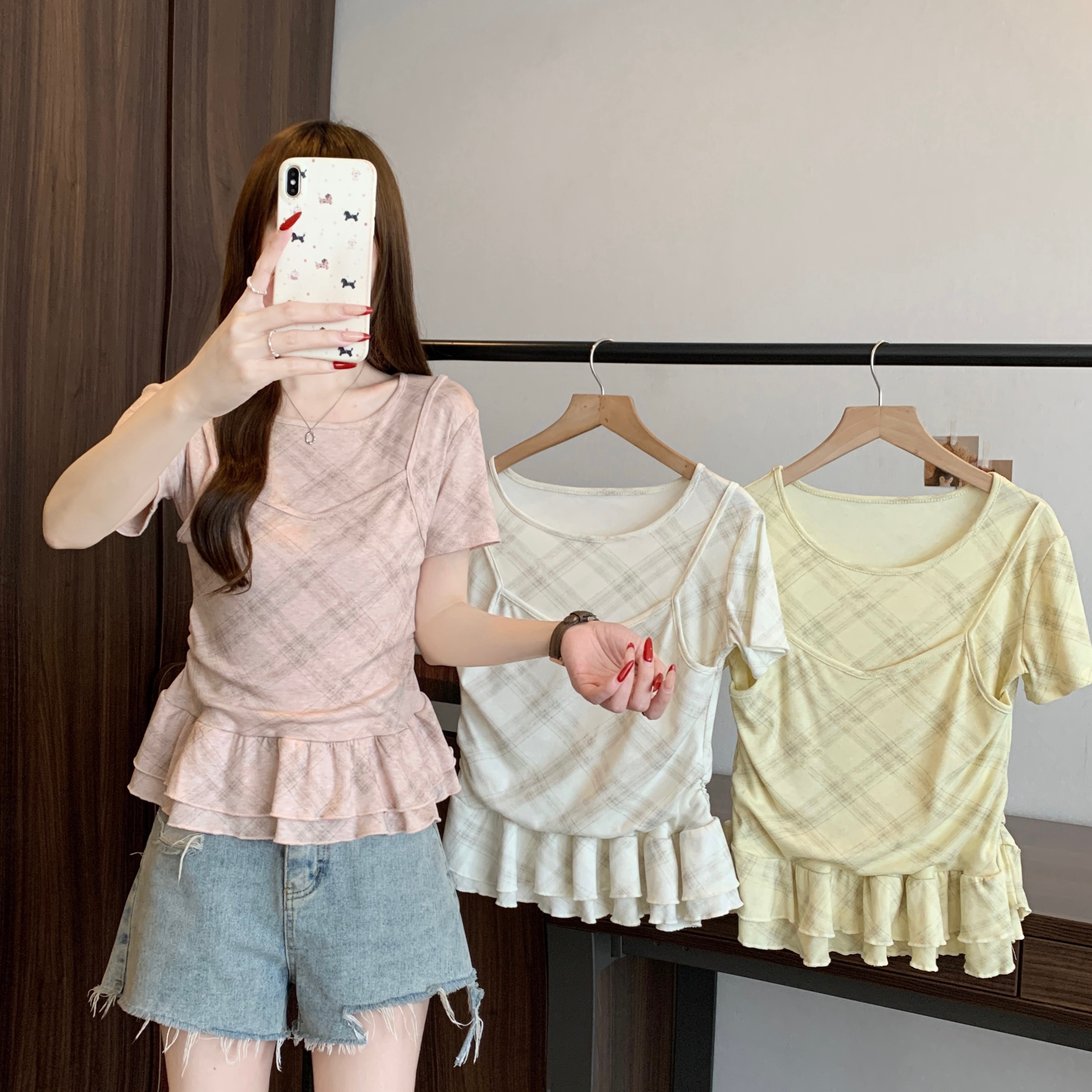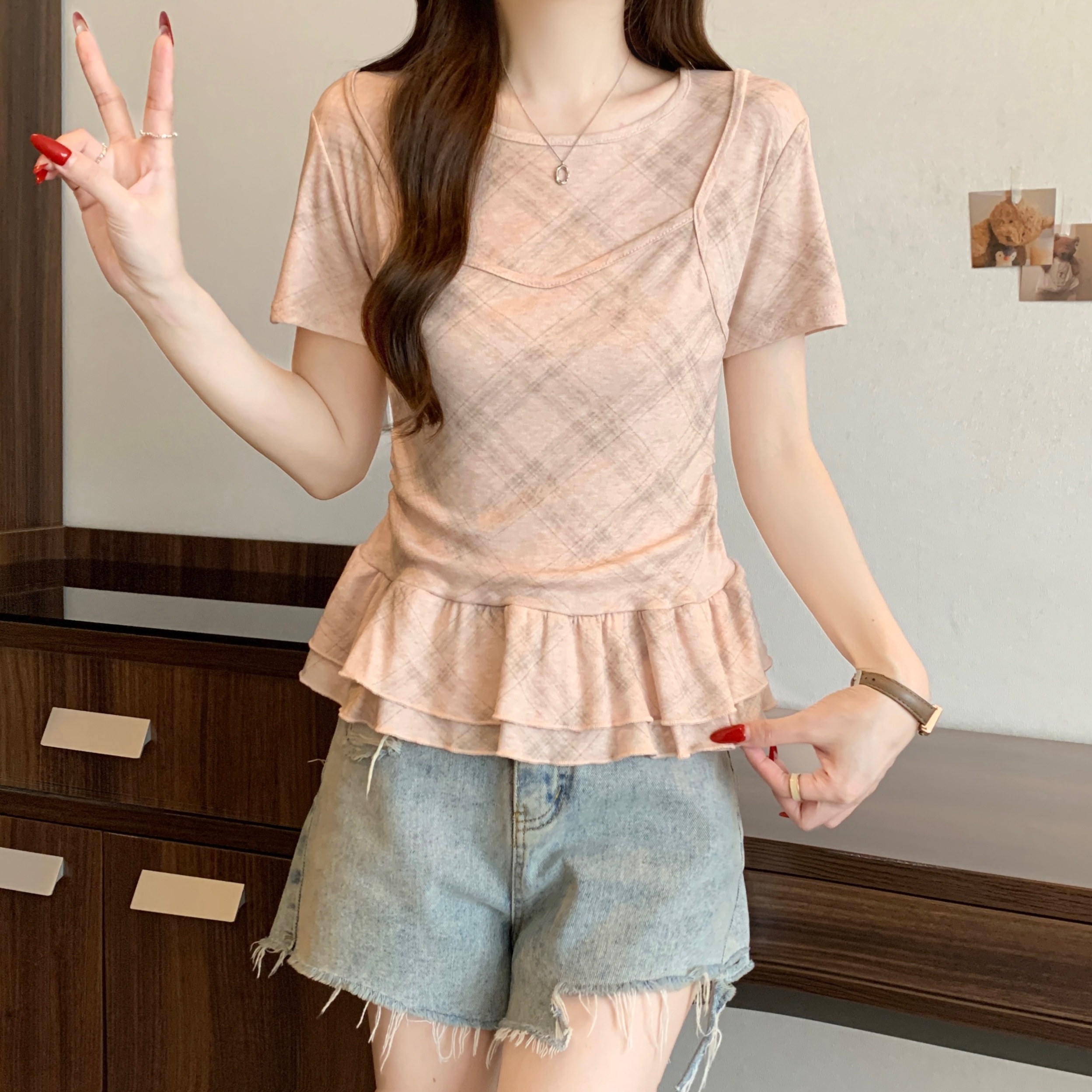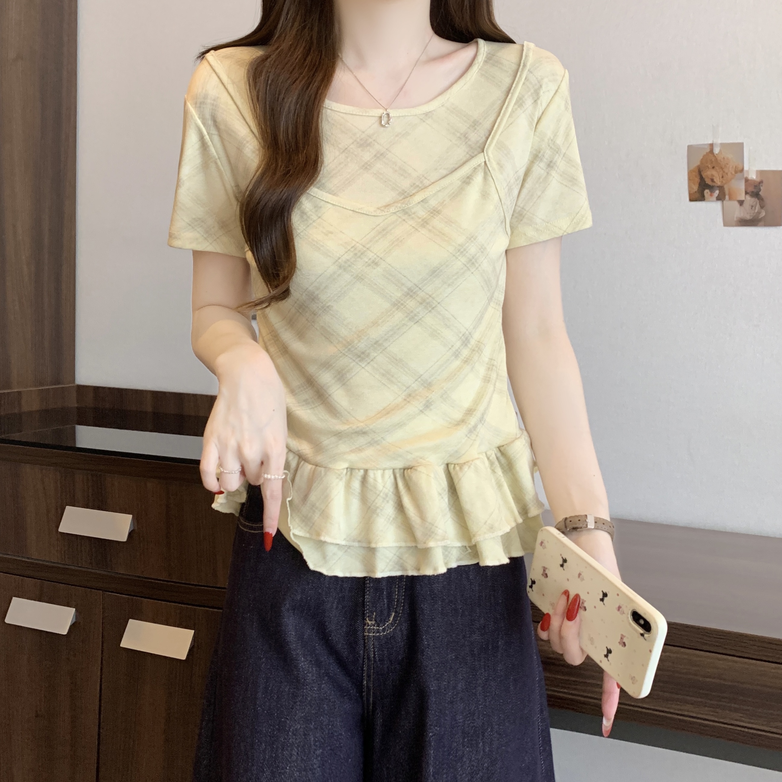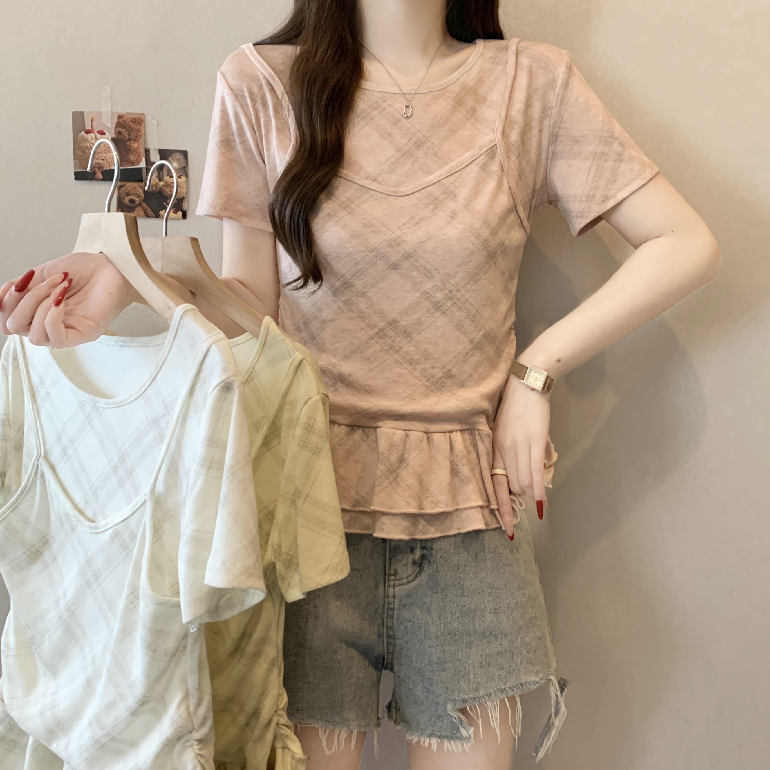 RY2860# 实拍~2026大码格子拼接短袖上衣夏季新款假两件显瘦正肩t恤