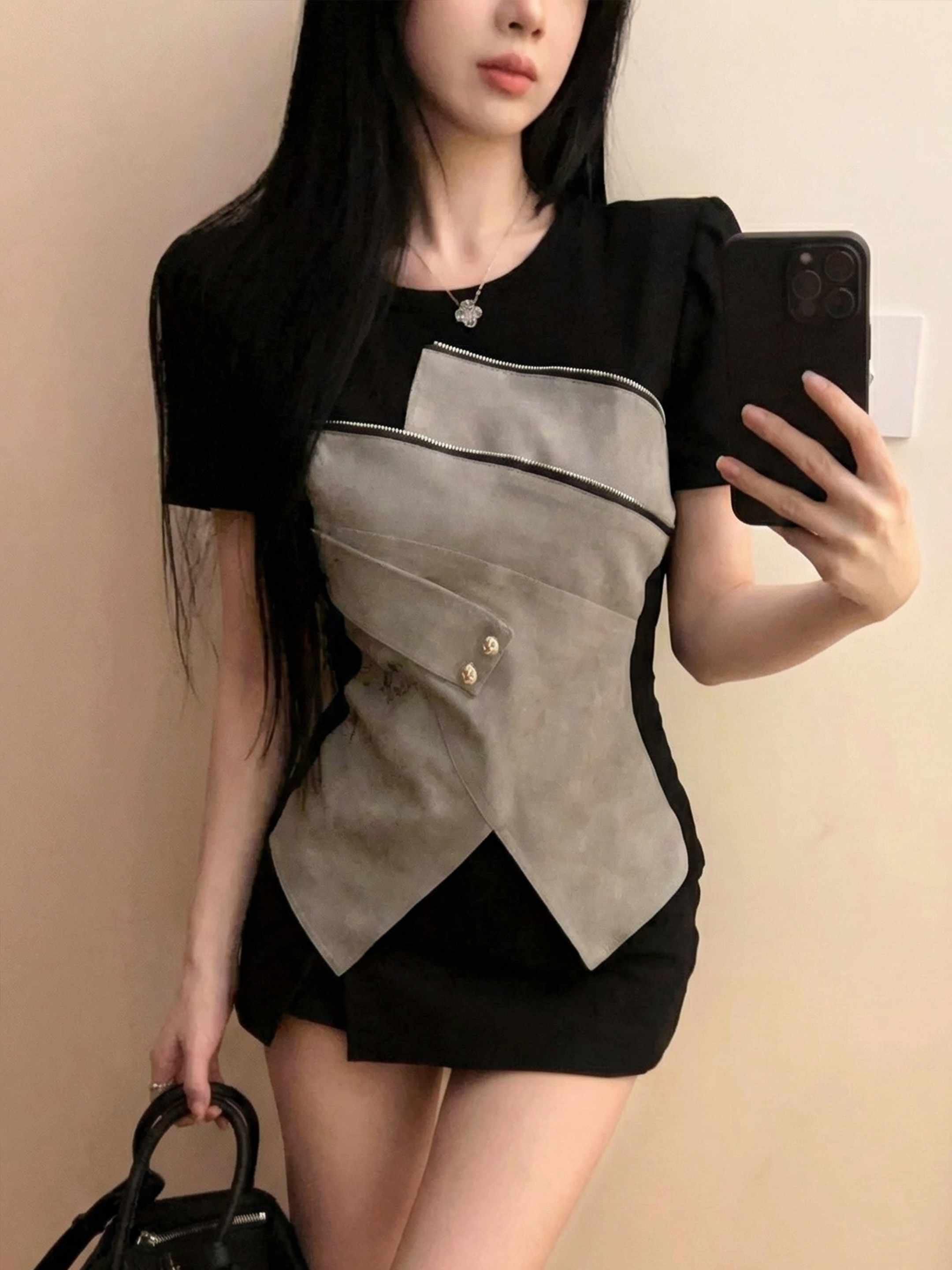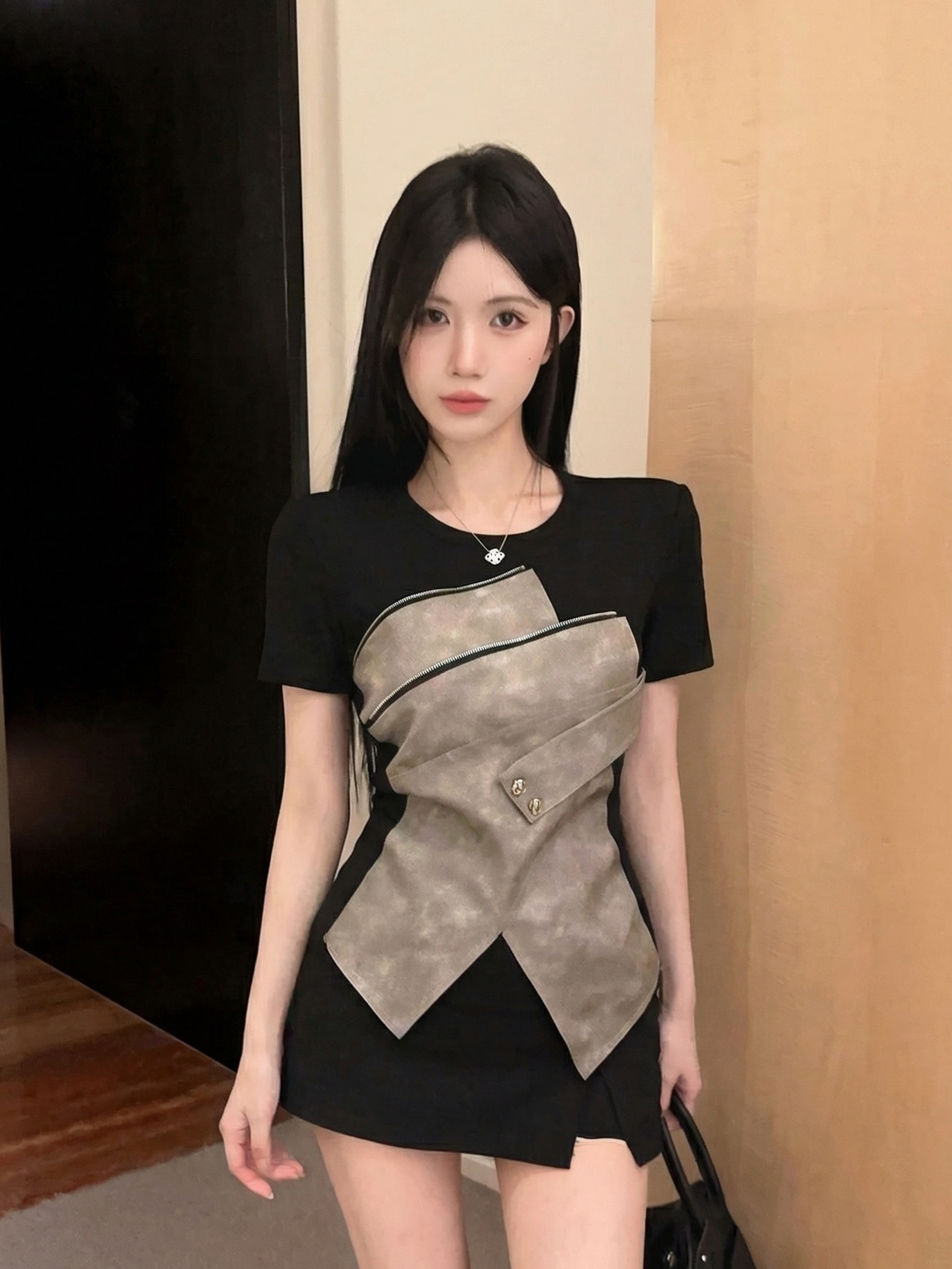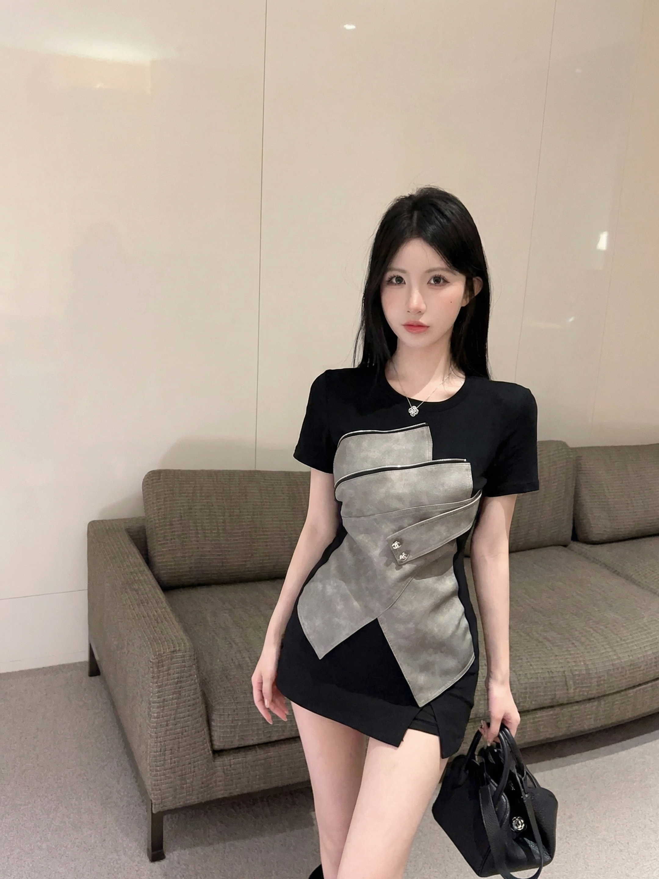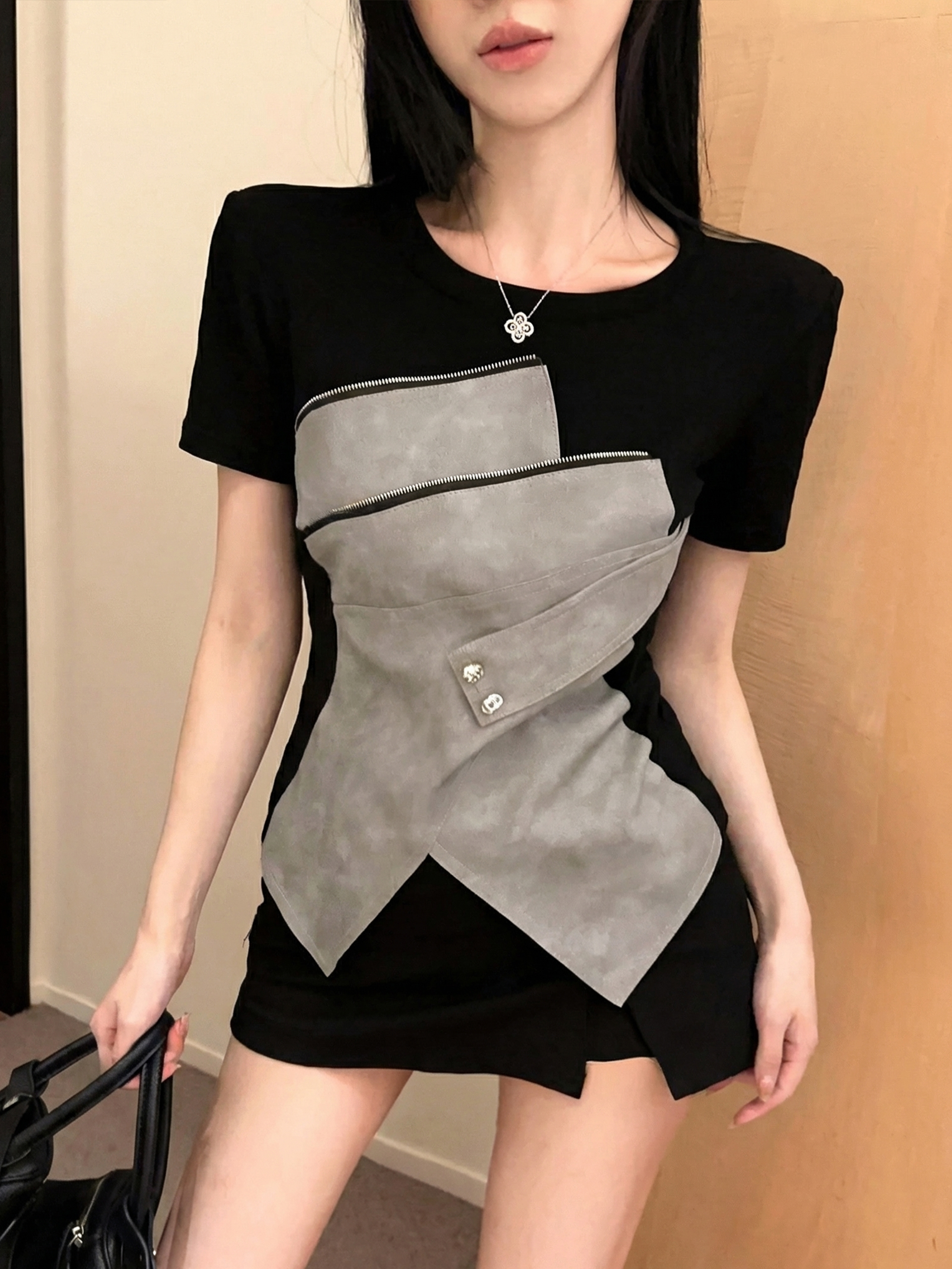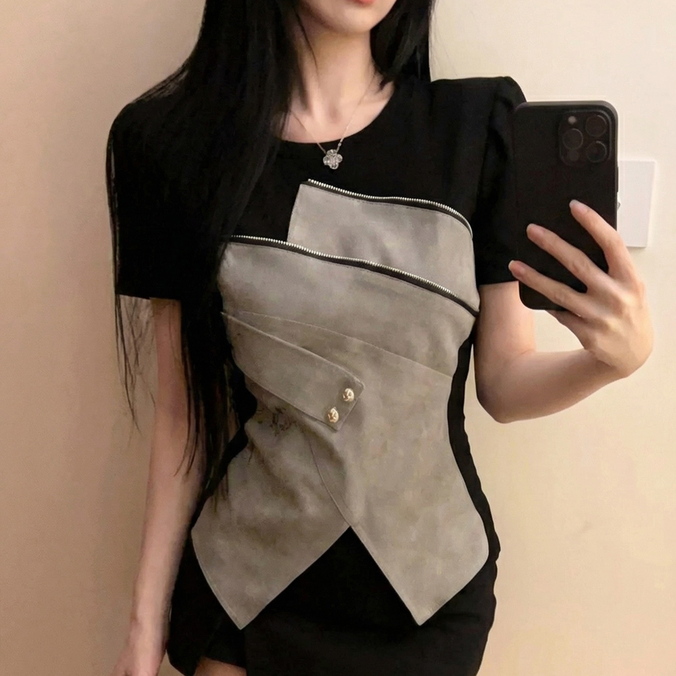 RY2894# 实拍实价 不规则拼接圆领短袖T恤夏季新款垫肩设计感打底衫上衣
