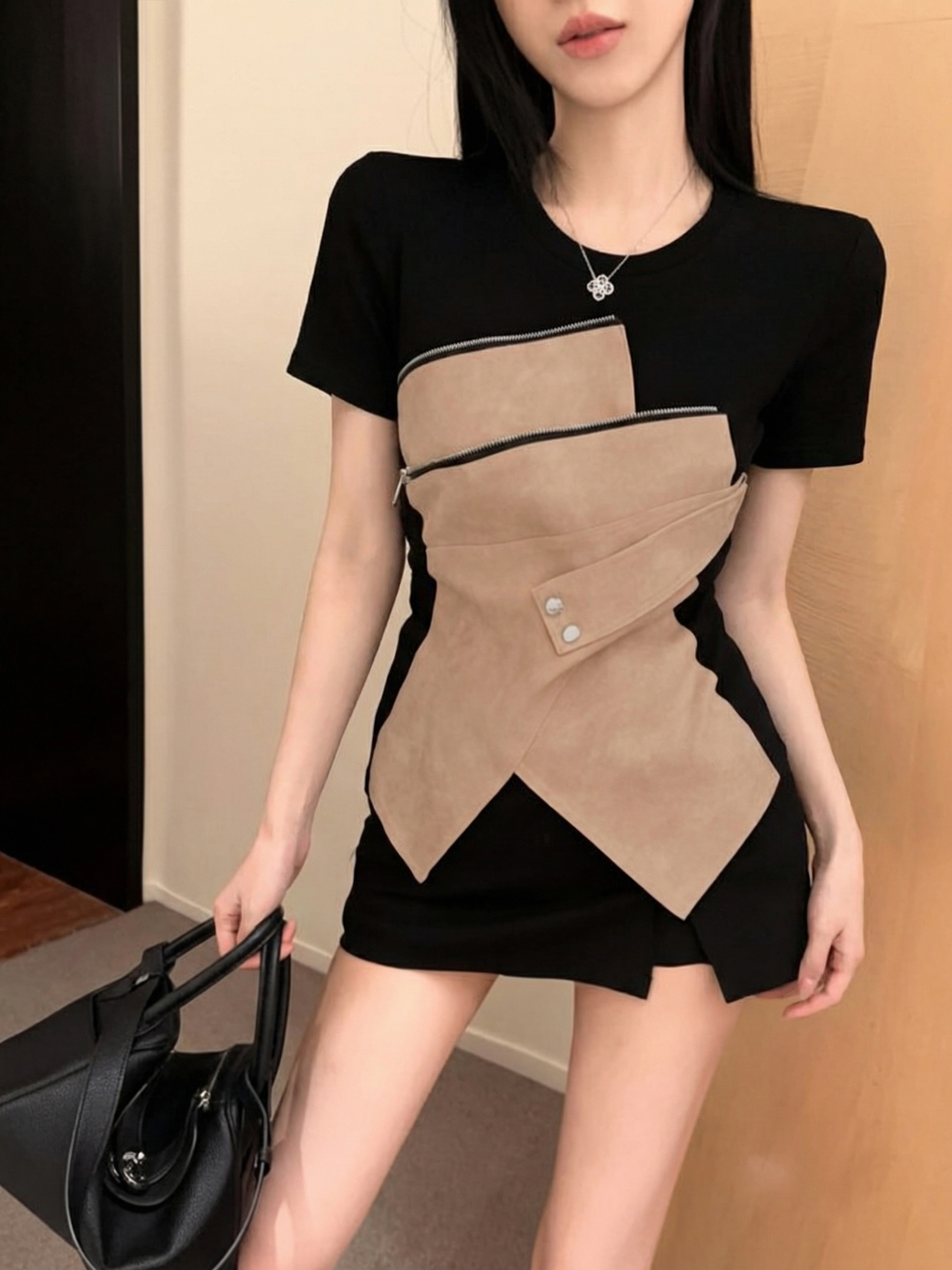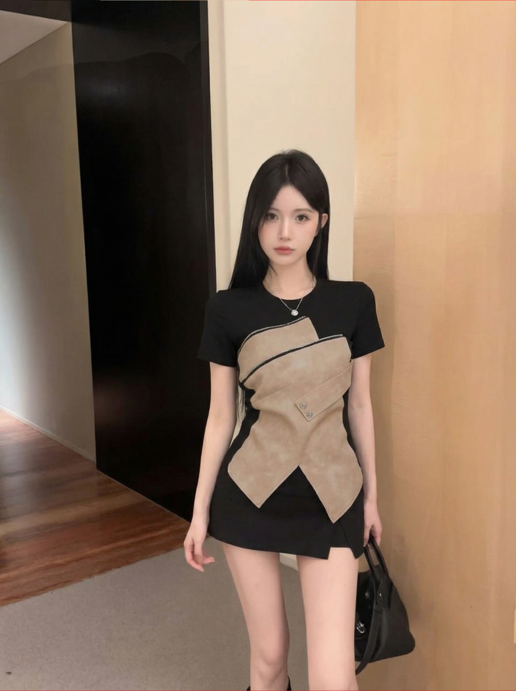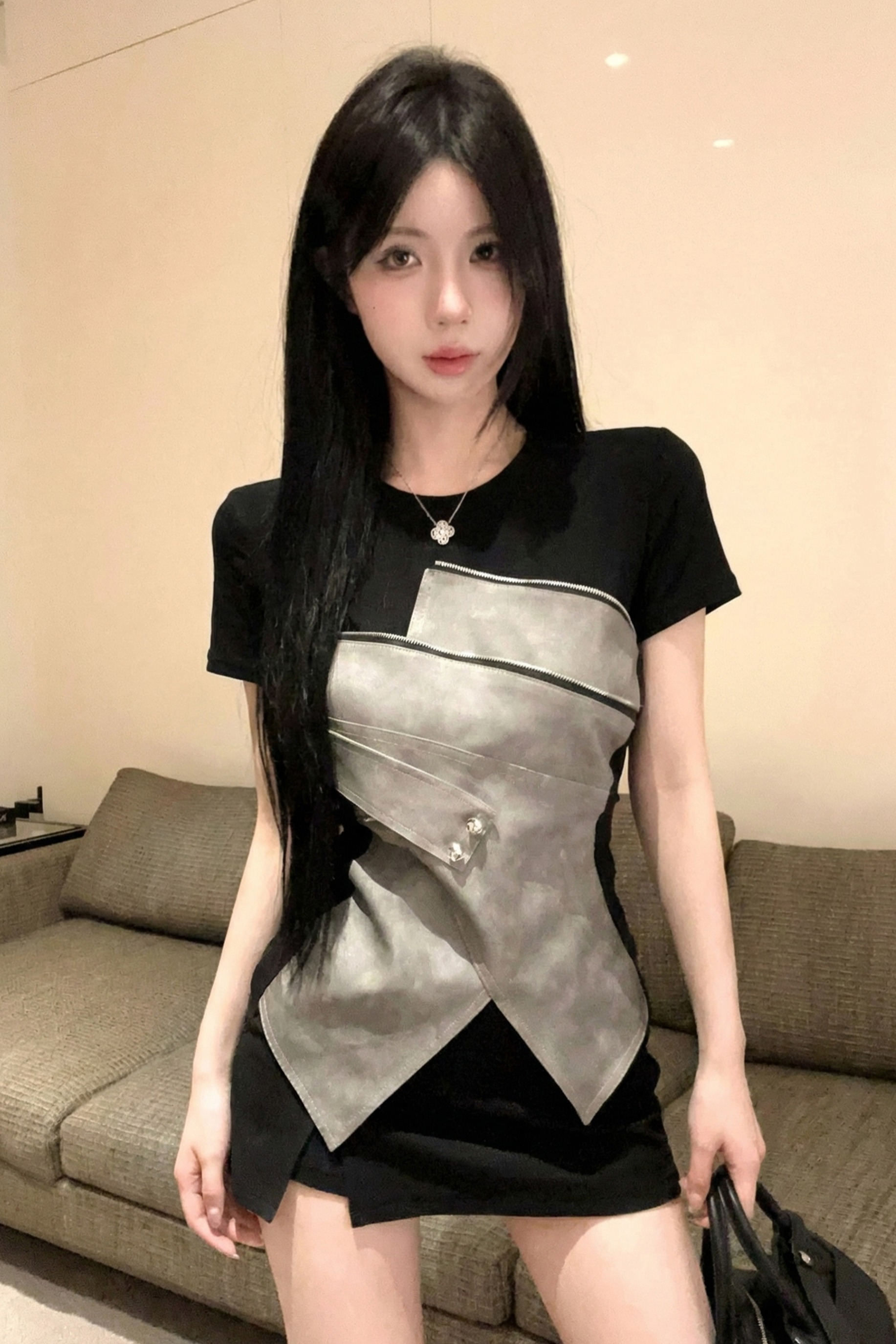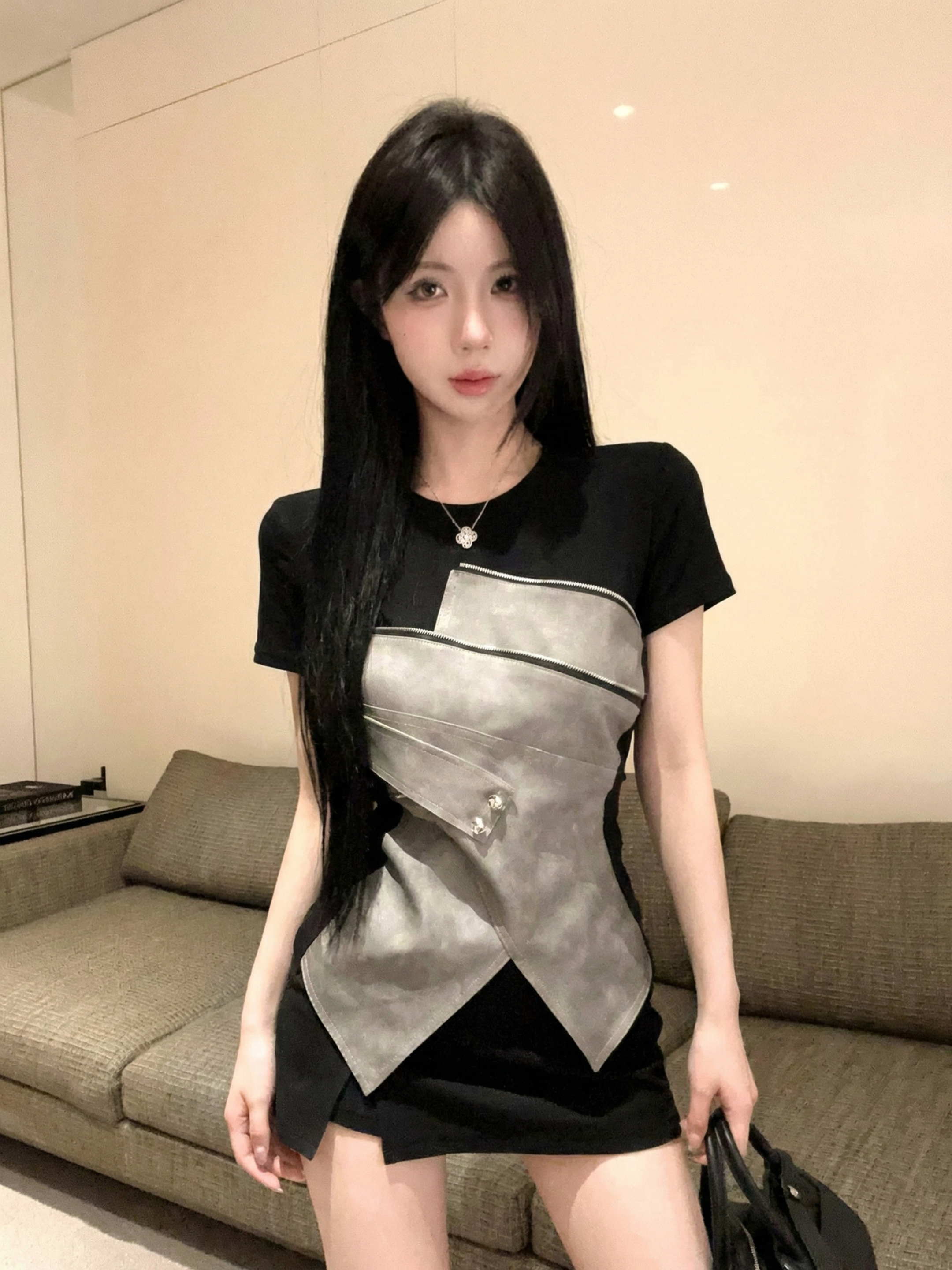 RY2894# 实拍实价 不规则拼接圆领短袖T恤夏季新款垫肩设计感打底衫上衣