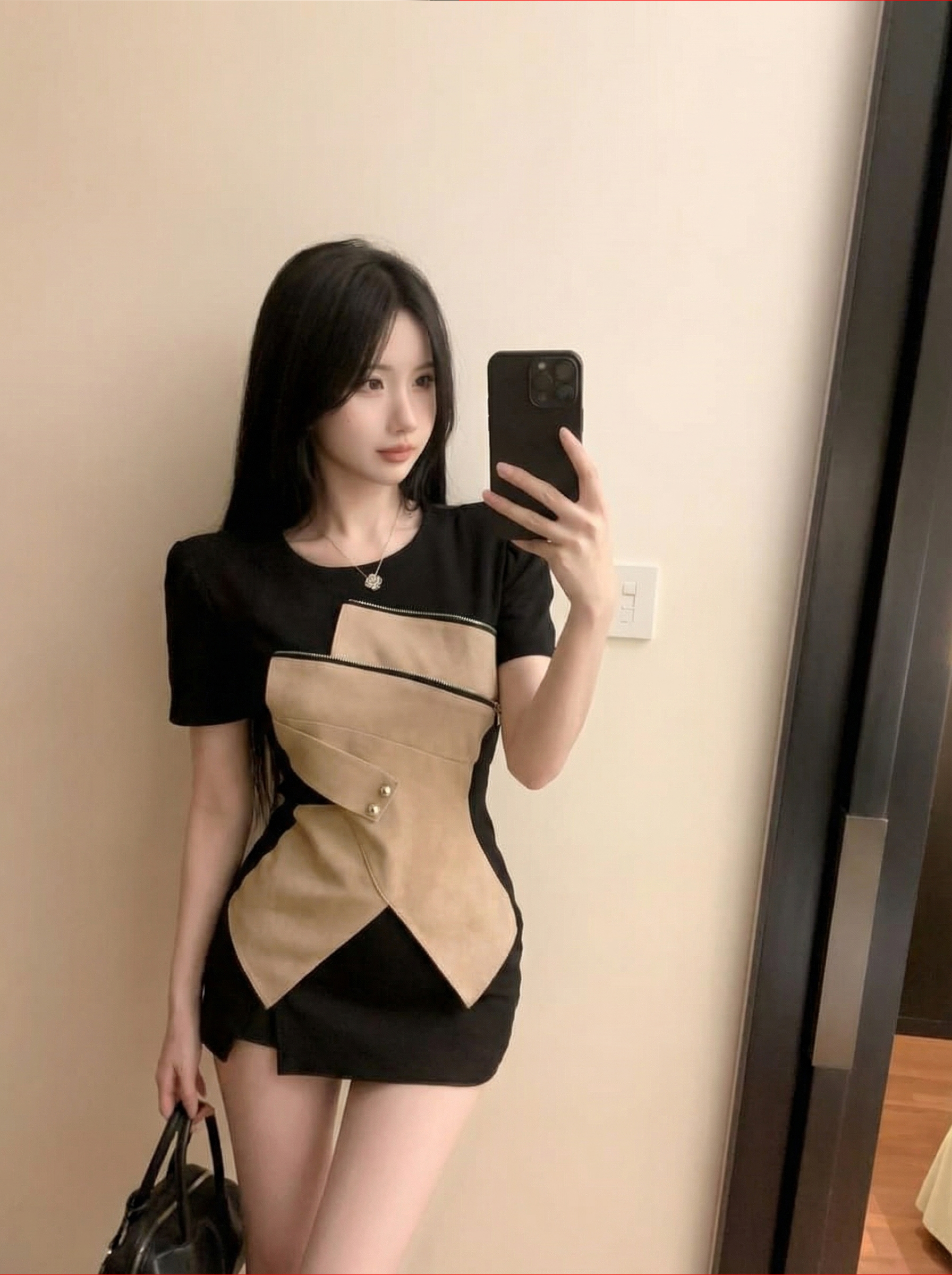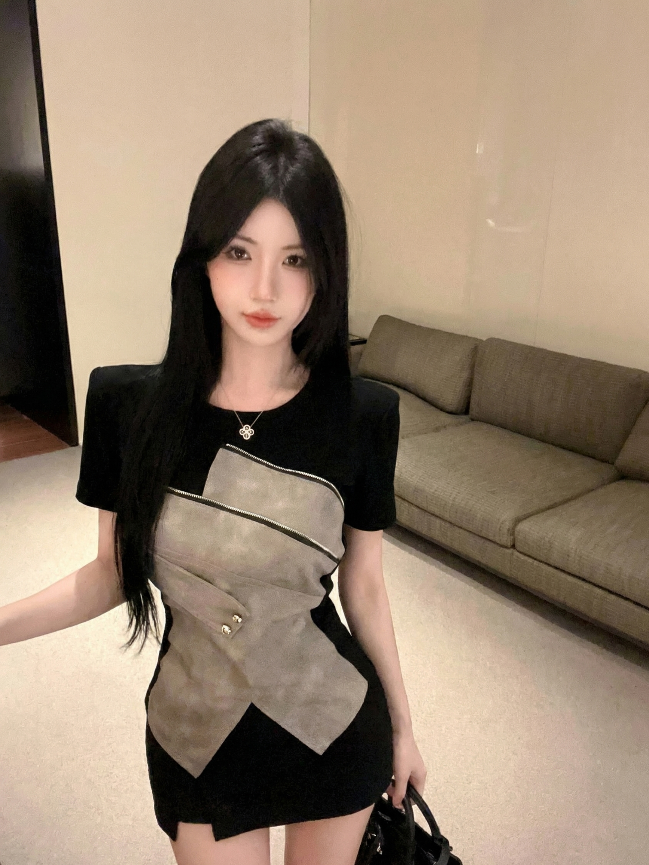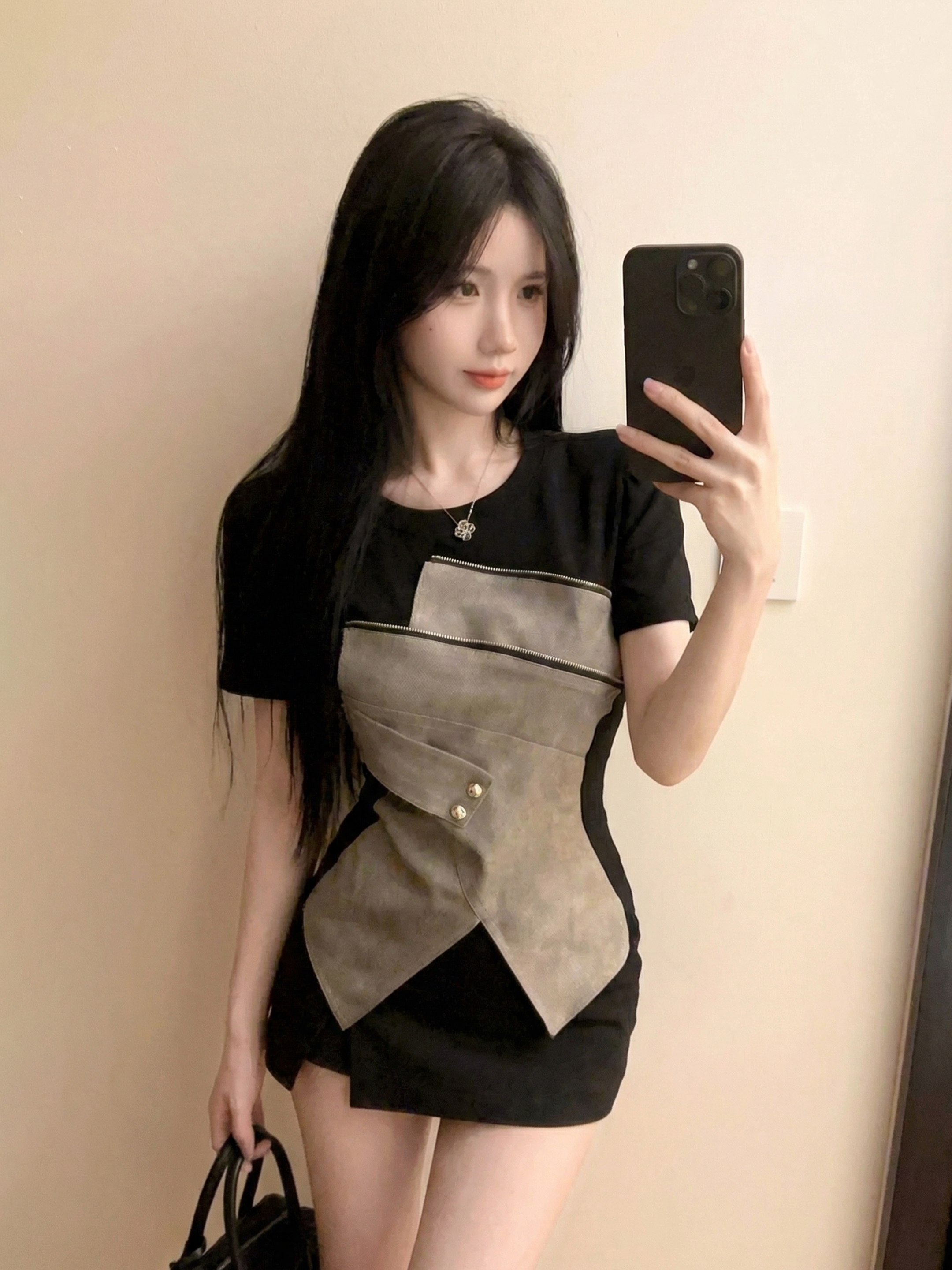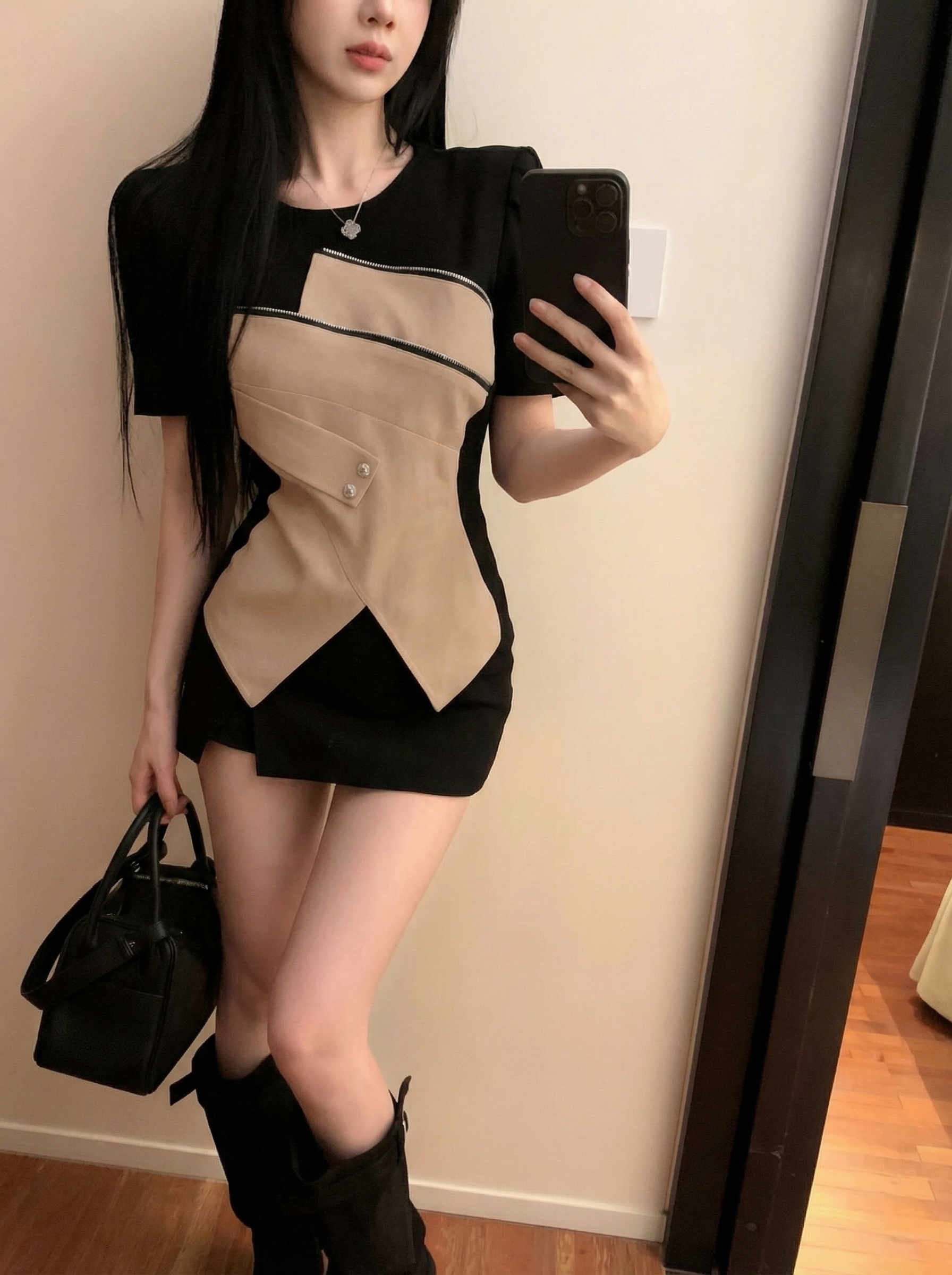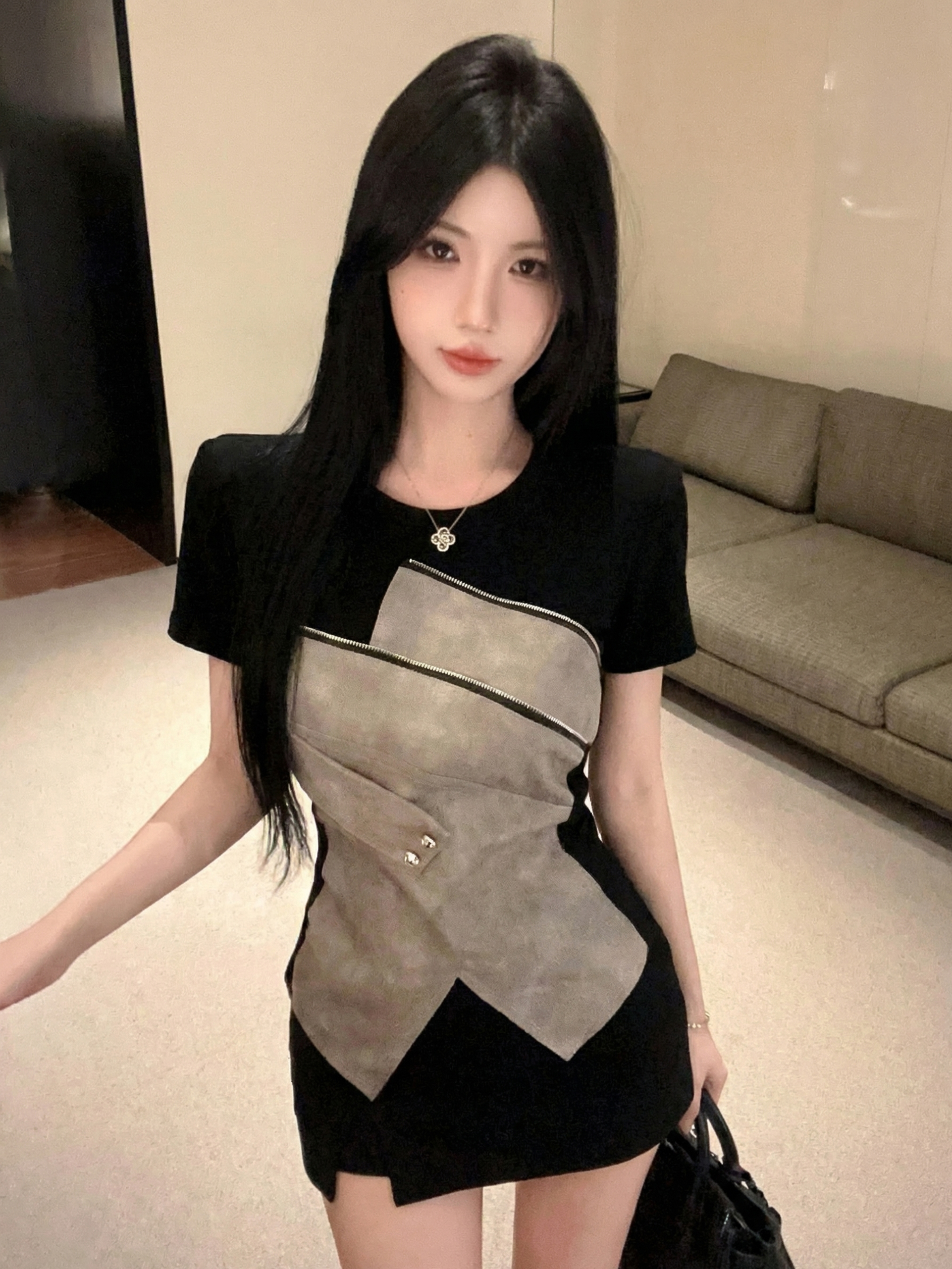 RY2894# 实拍实价 不规则拼接圆领短袖T恤夏季新款垫肩设计感打底衫上衣