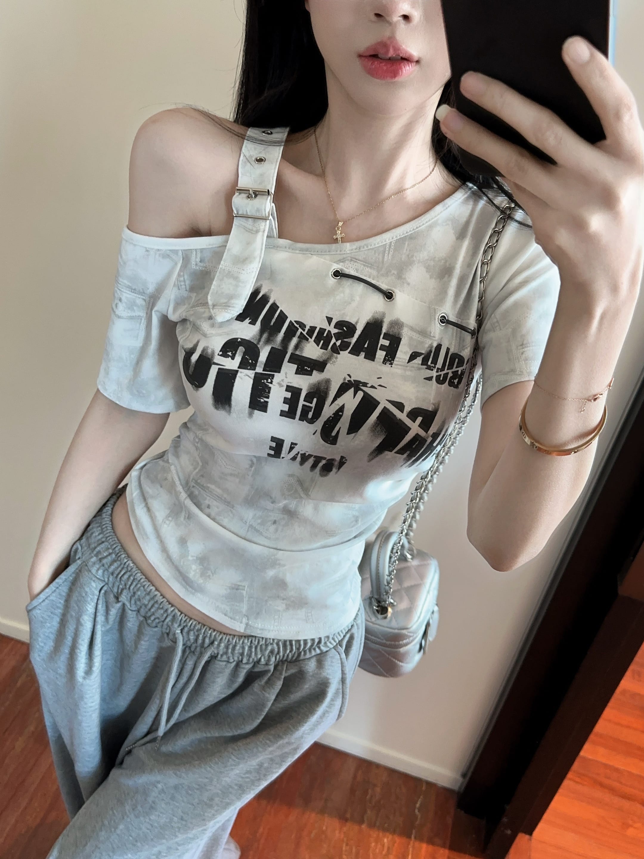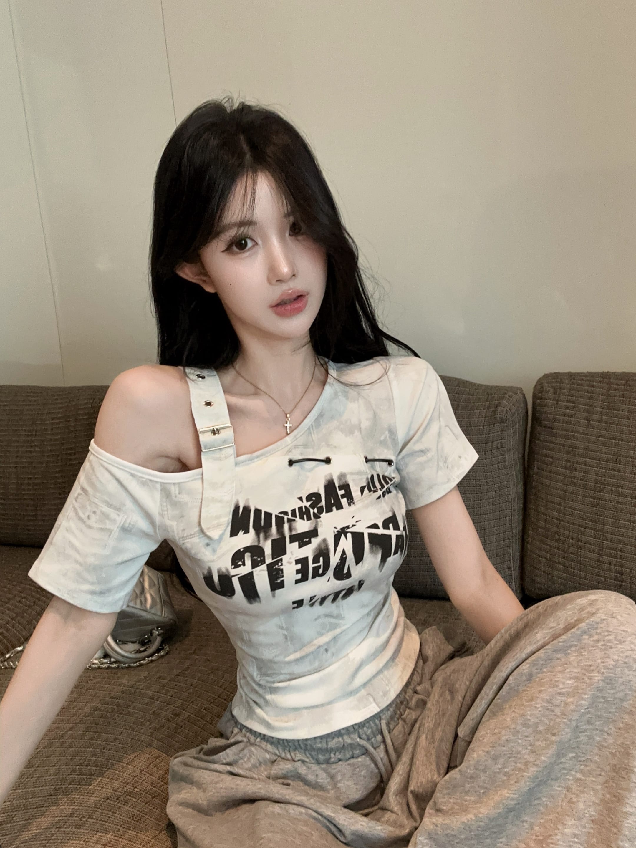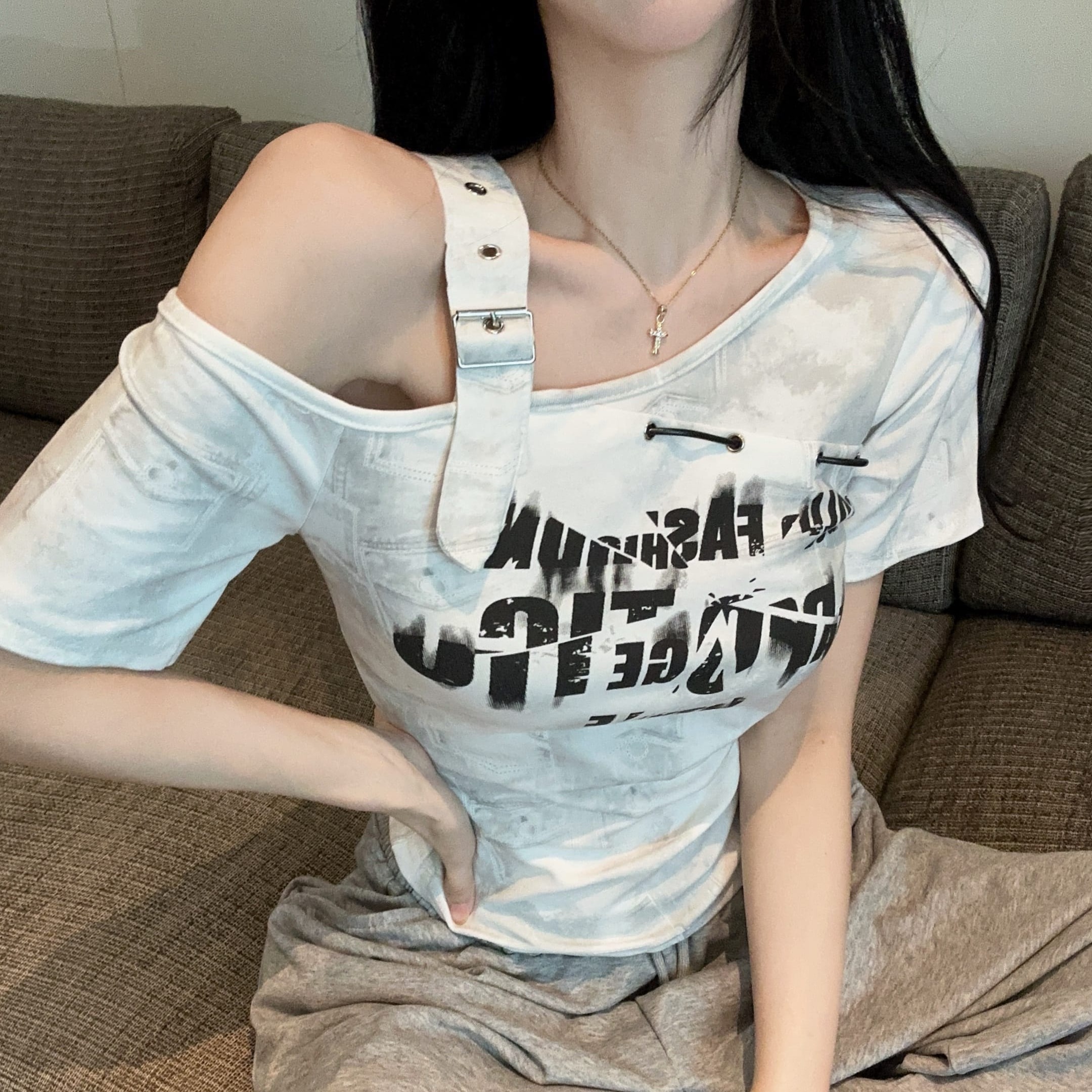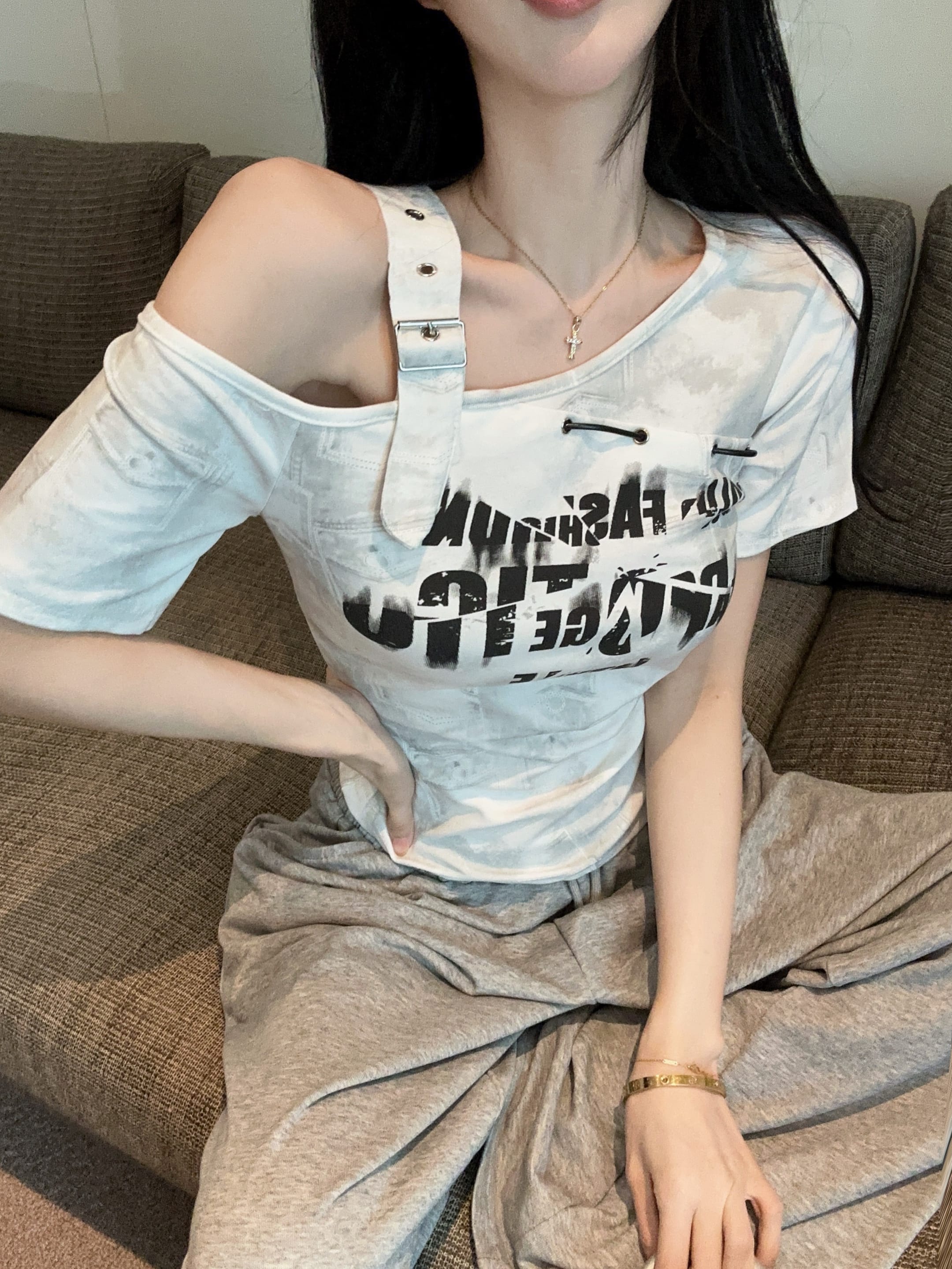 RY2895# 实拍实价 夏季新款设计感字母印花露肩斜领短袖T恤女修身小众上衣