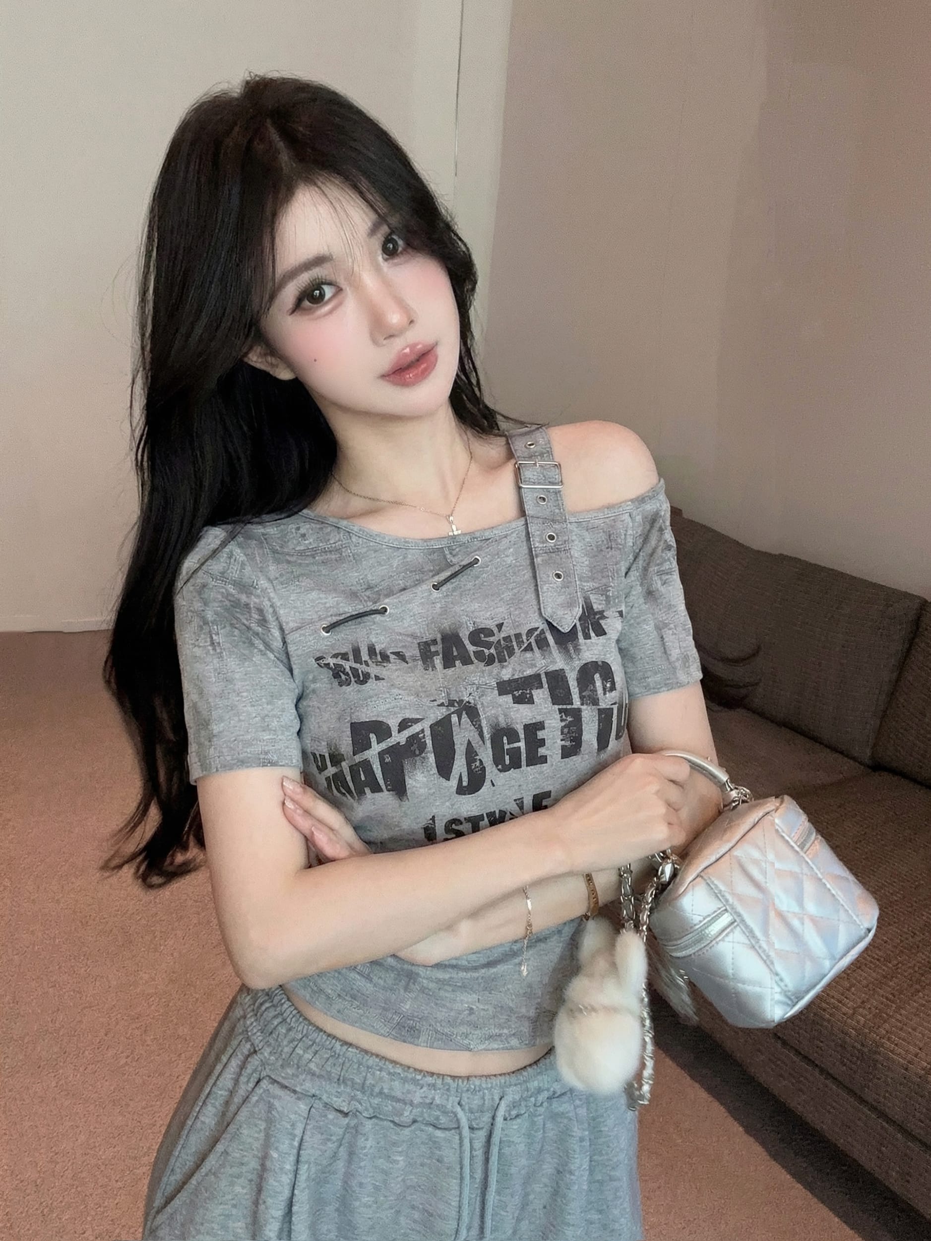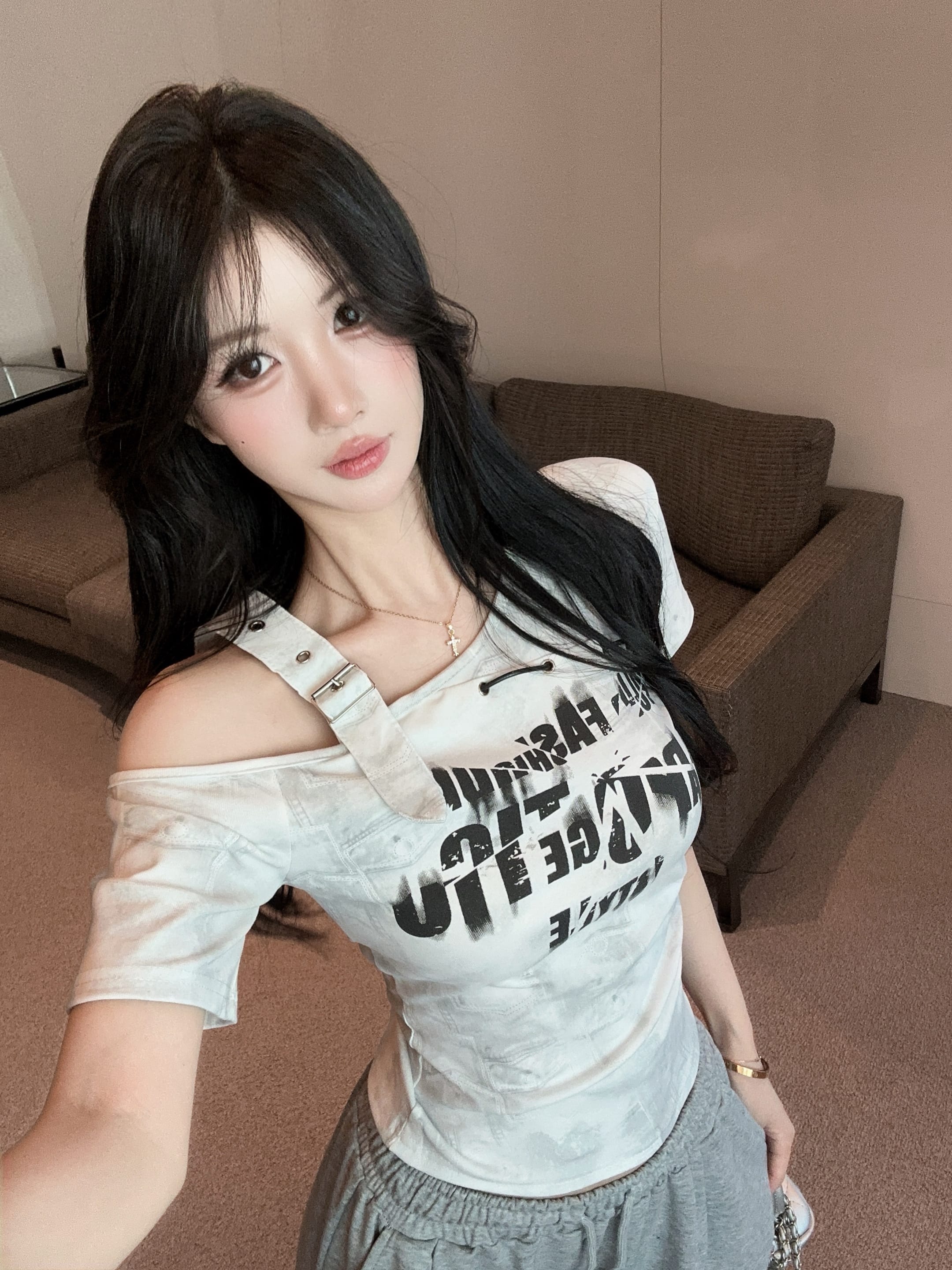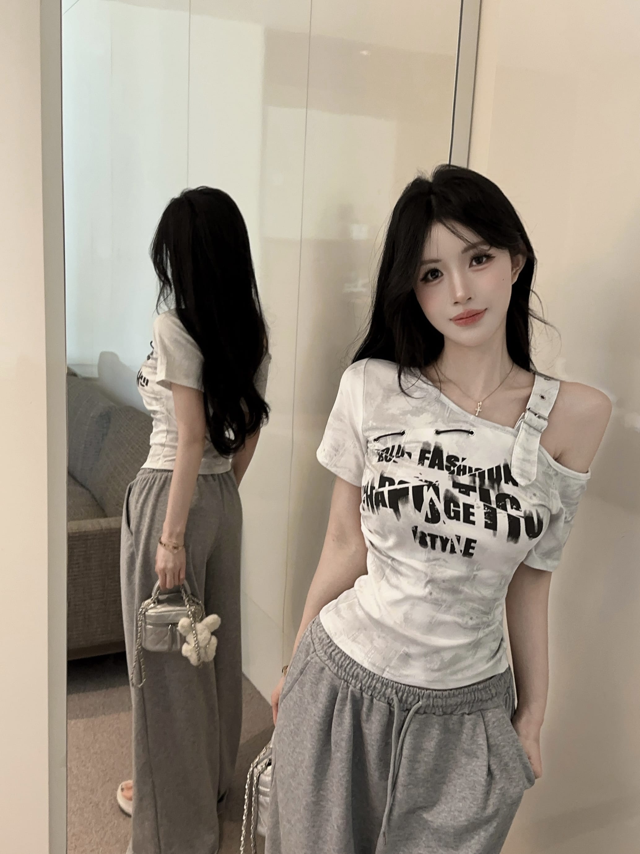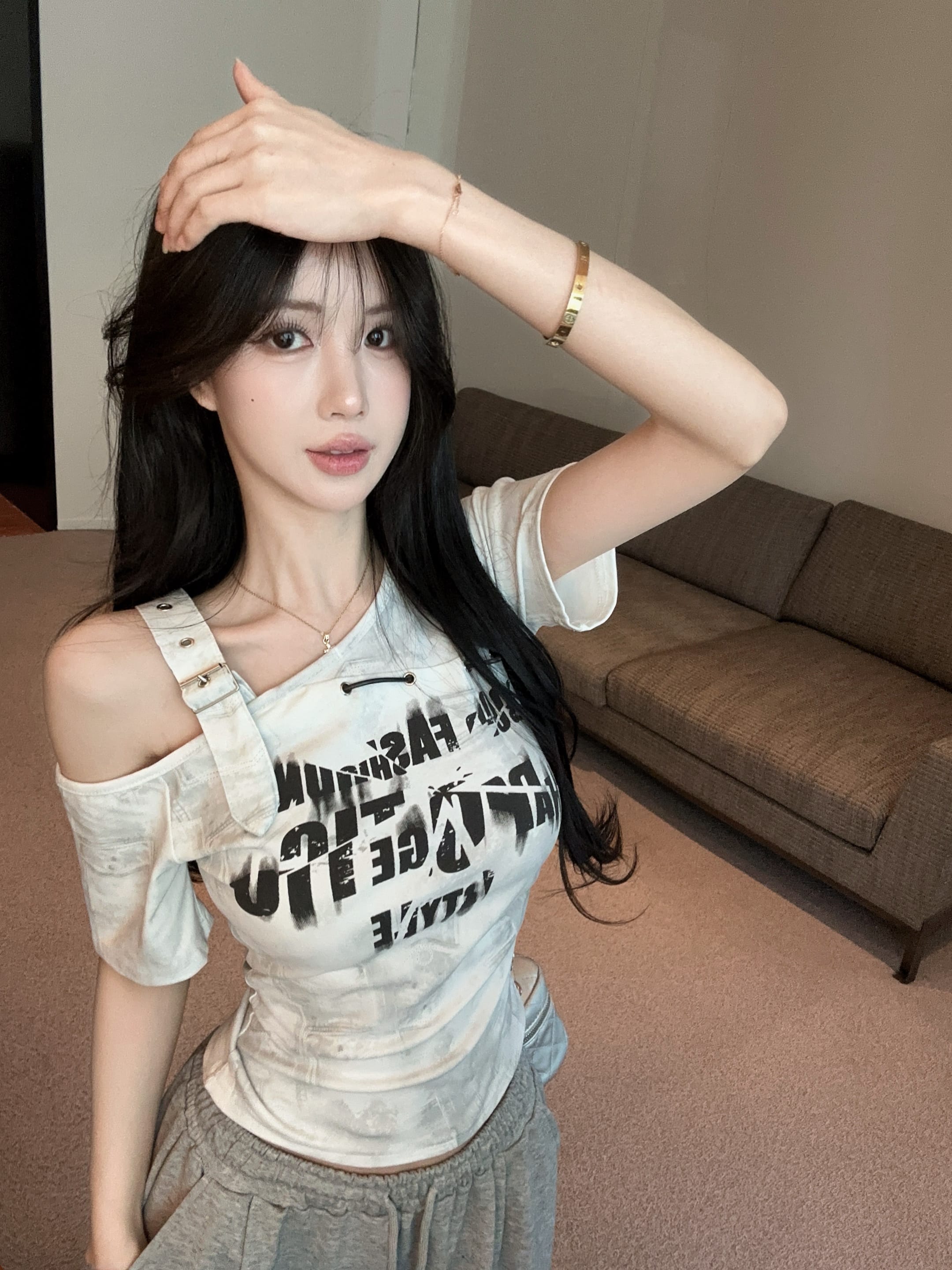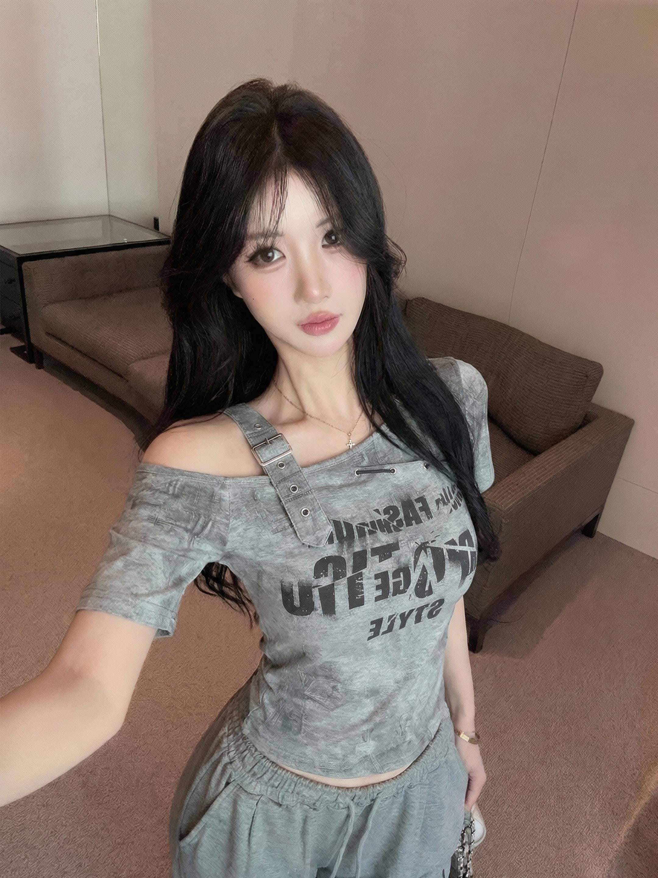 RY2895# 实拍实价 夏季新款设计感字母印花露肩斜领短袖T恤女修身小众上衣