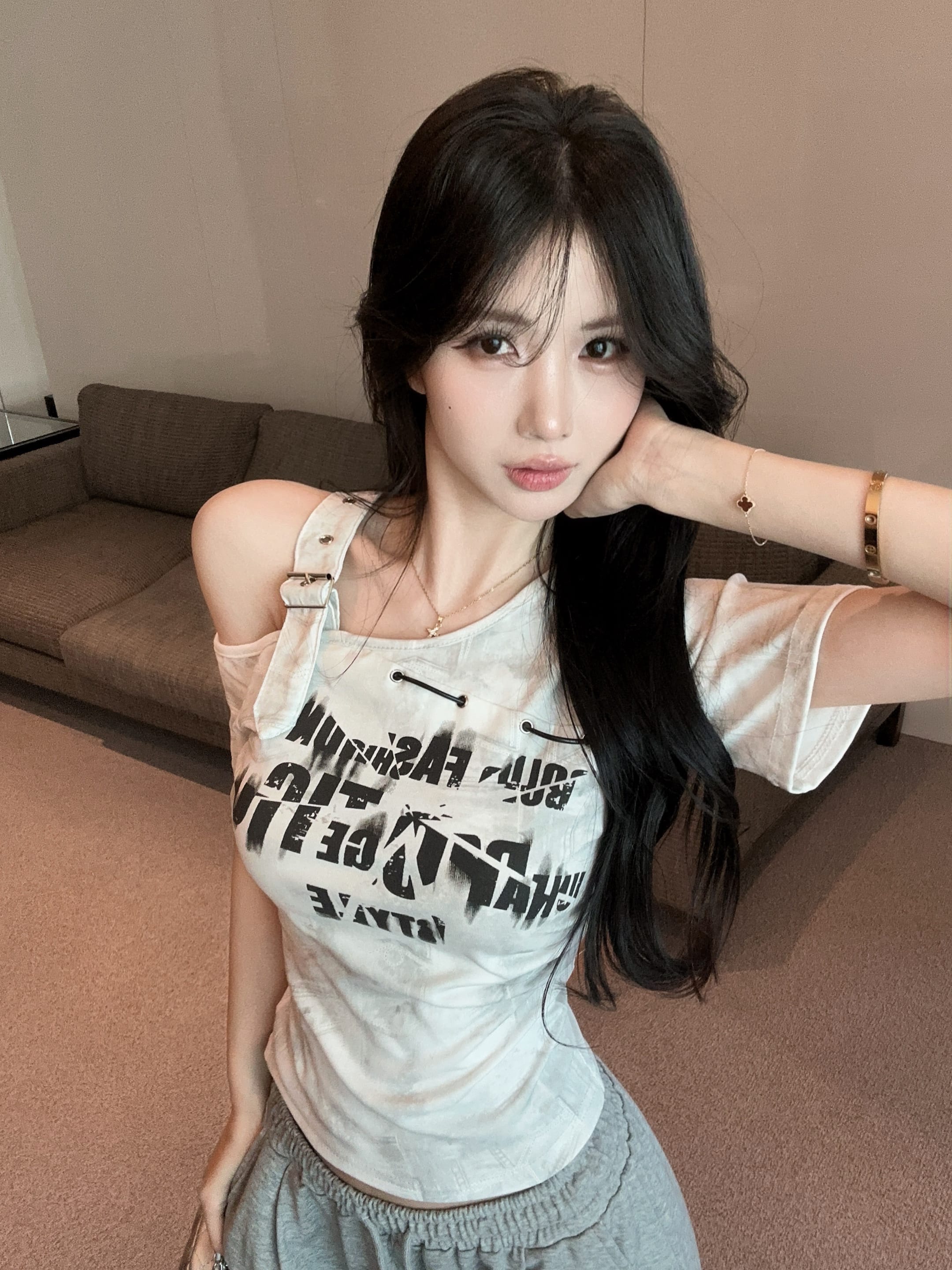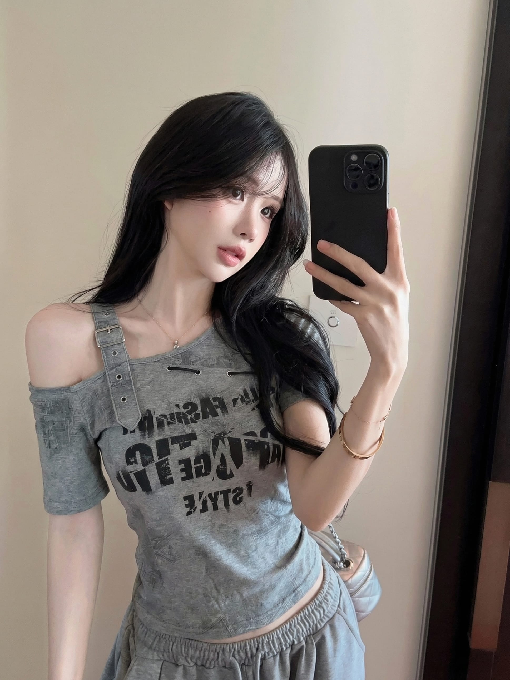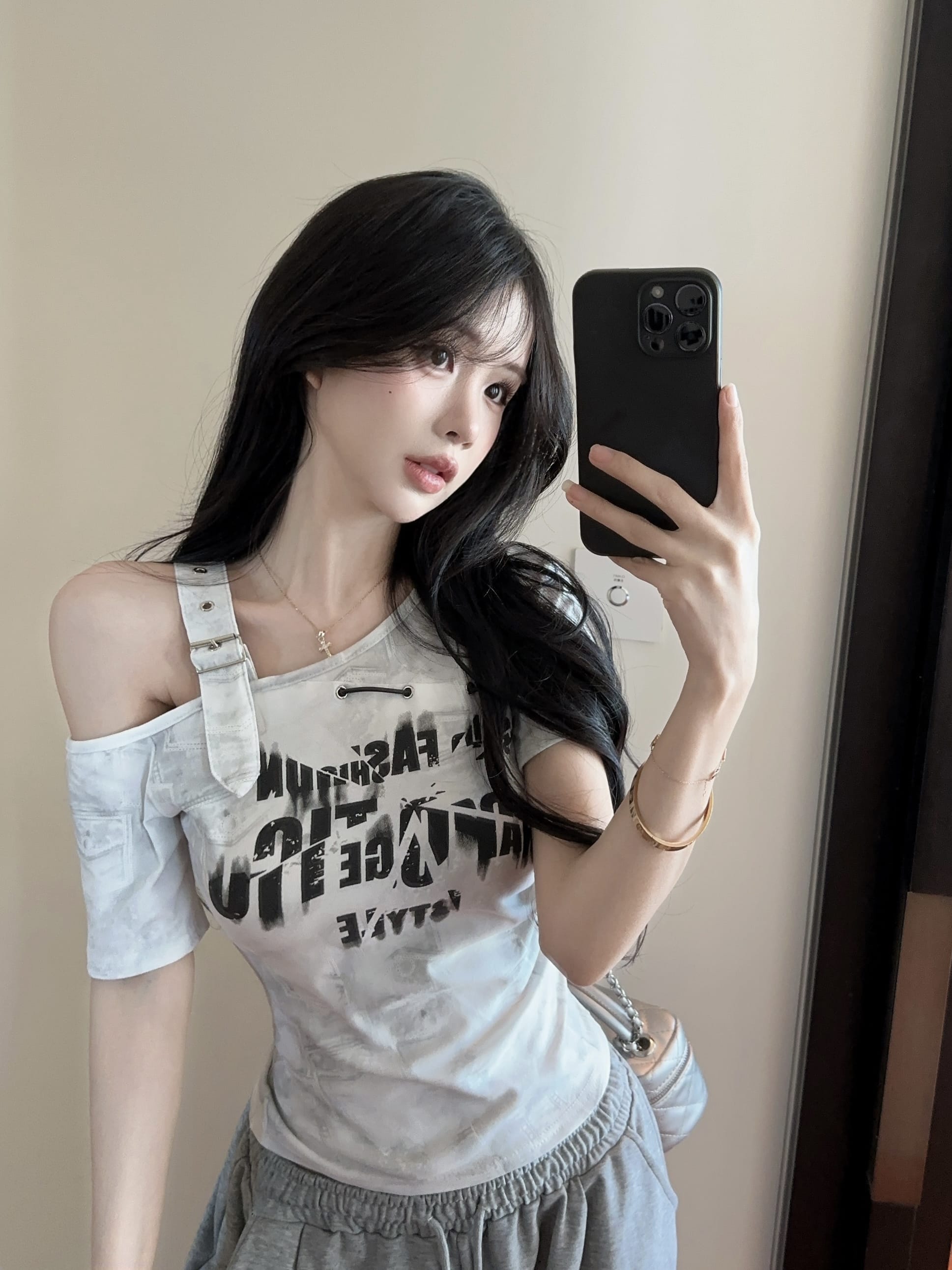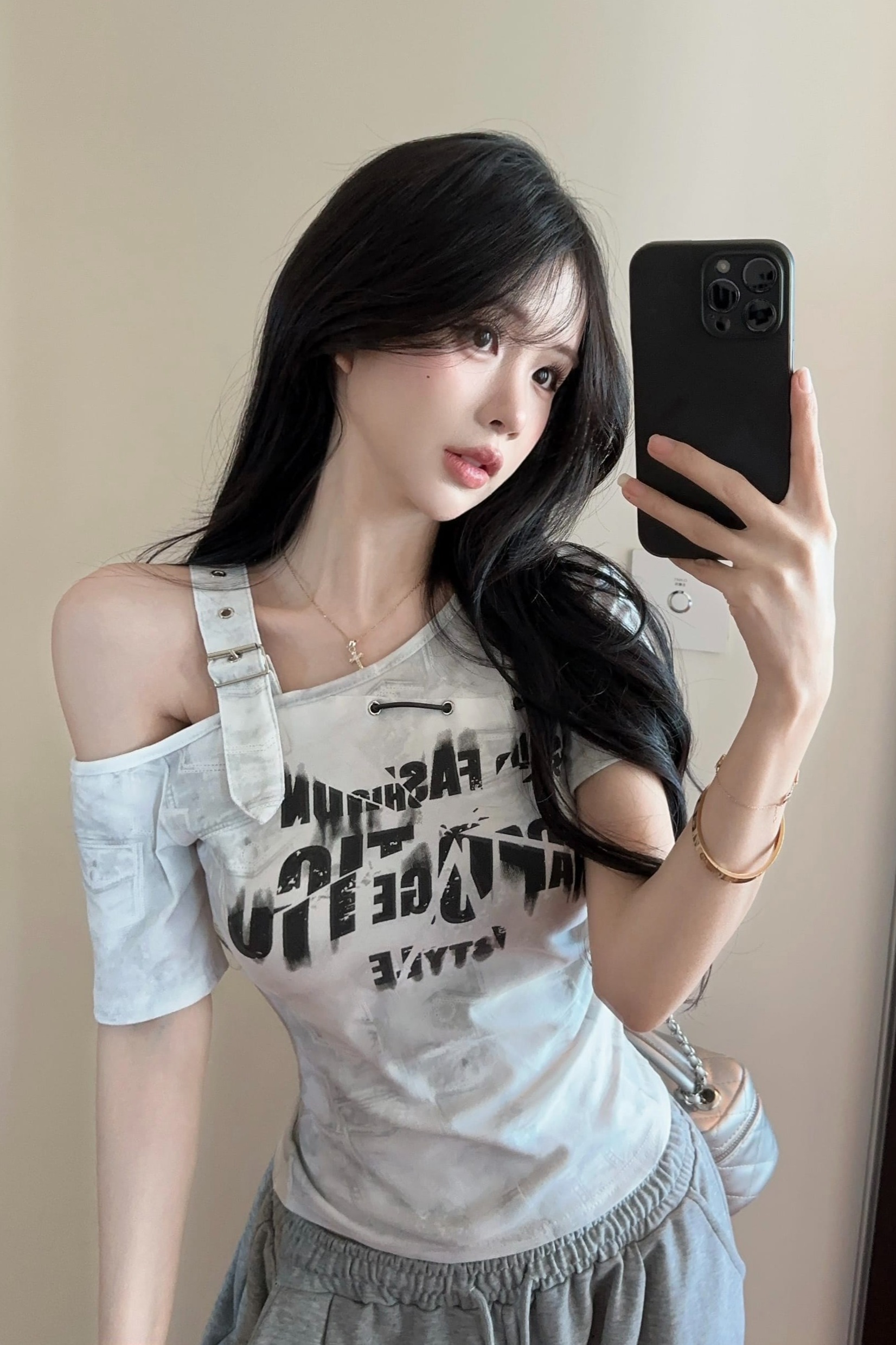 RY2895# 实拍实价 夏季新款设计感字母印花露肩斜领短袖T恤女修身小众上衣