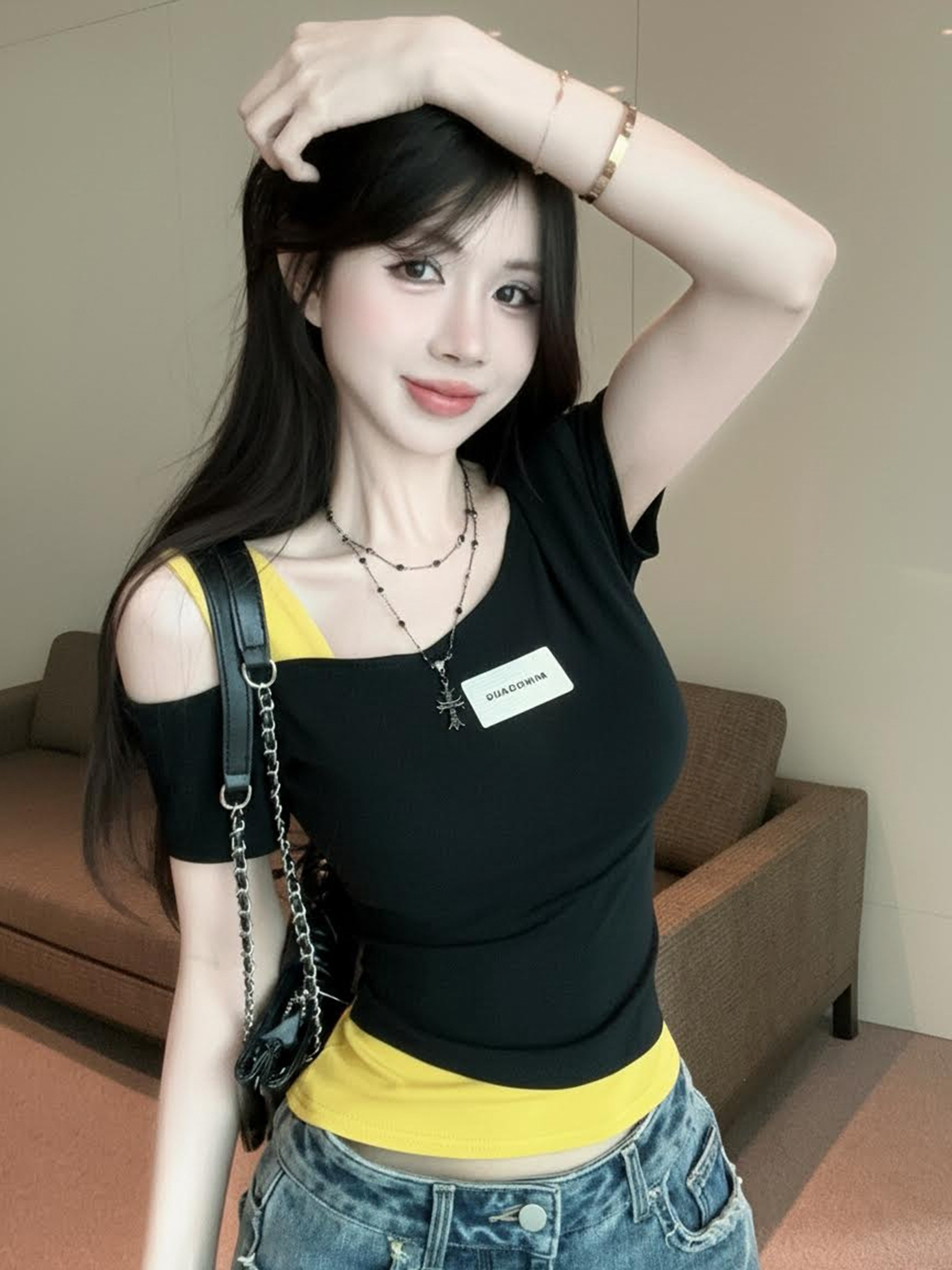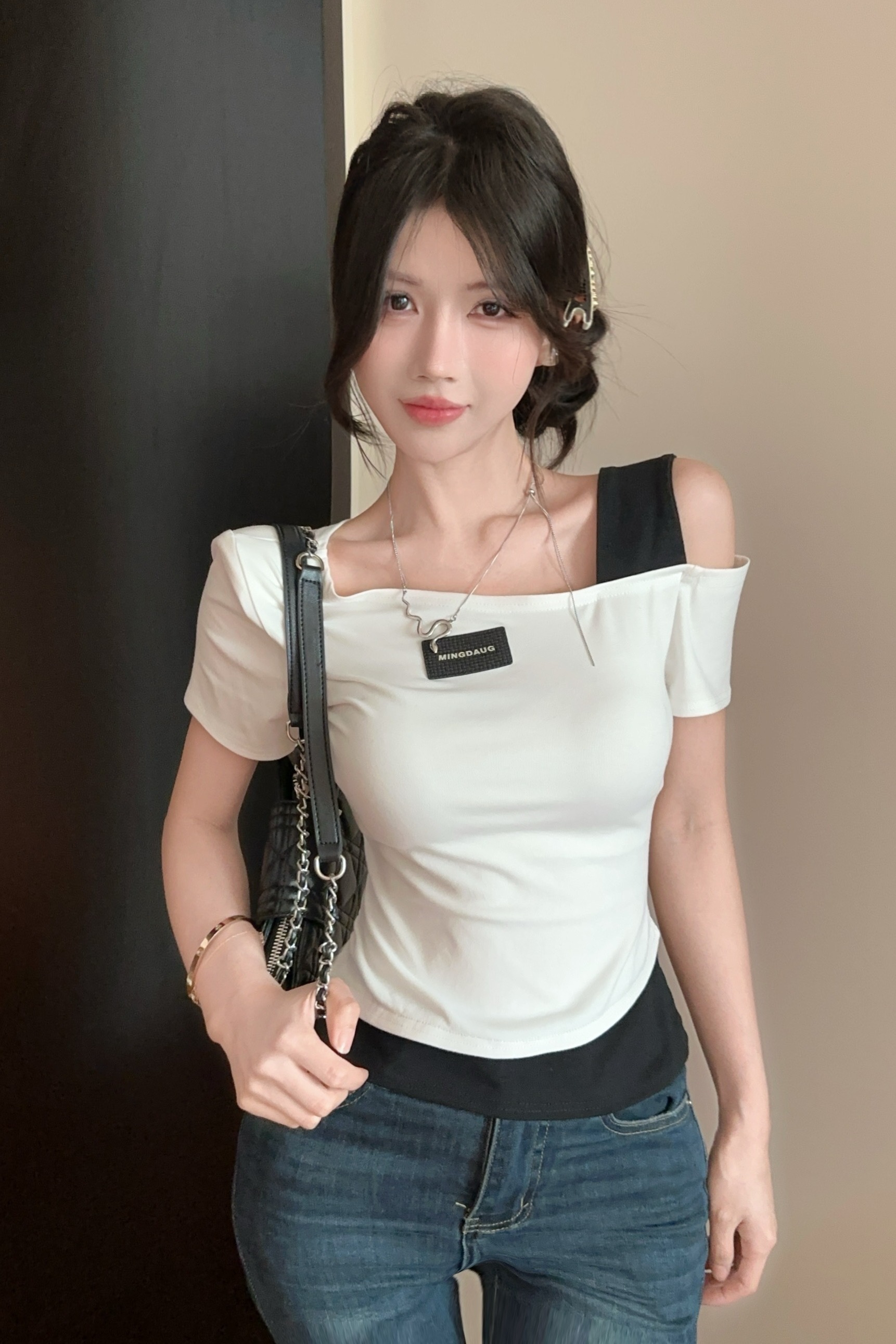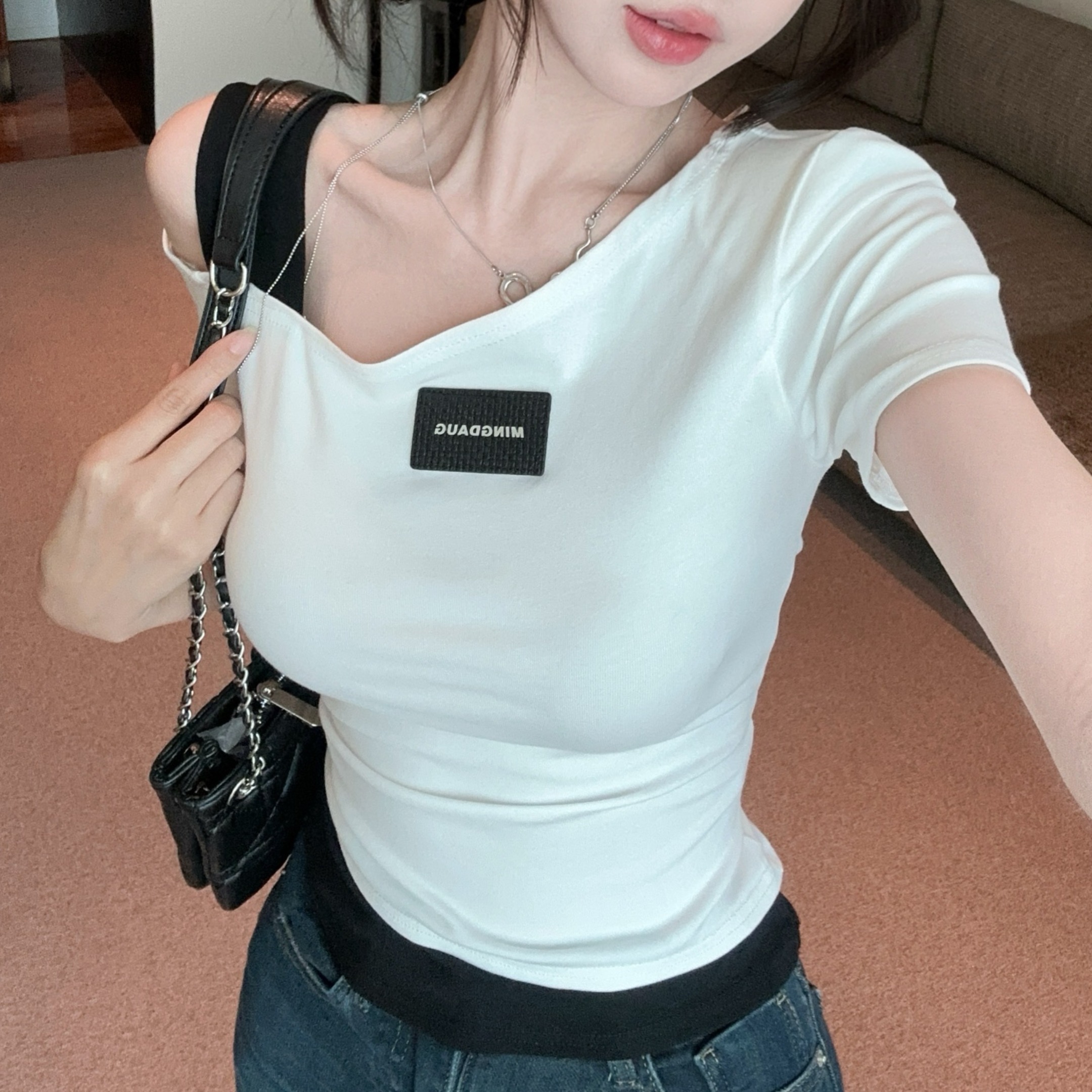 RY2896# 实拍实价 2026夏季新款撞色斜肩百搭时尚T恤上衣女潮