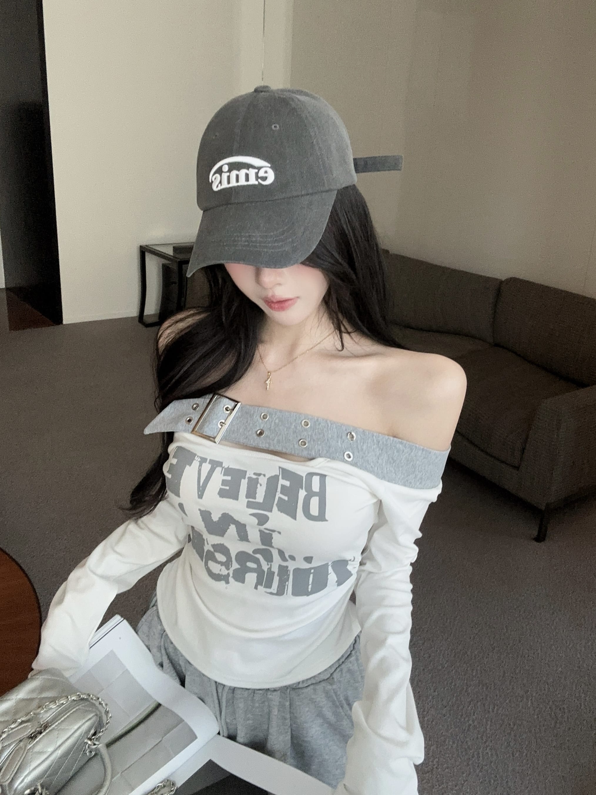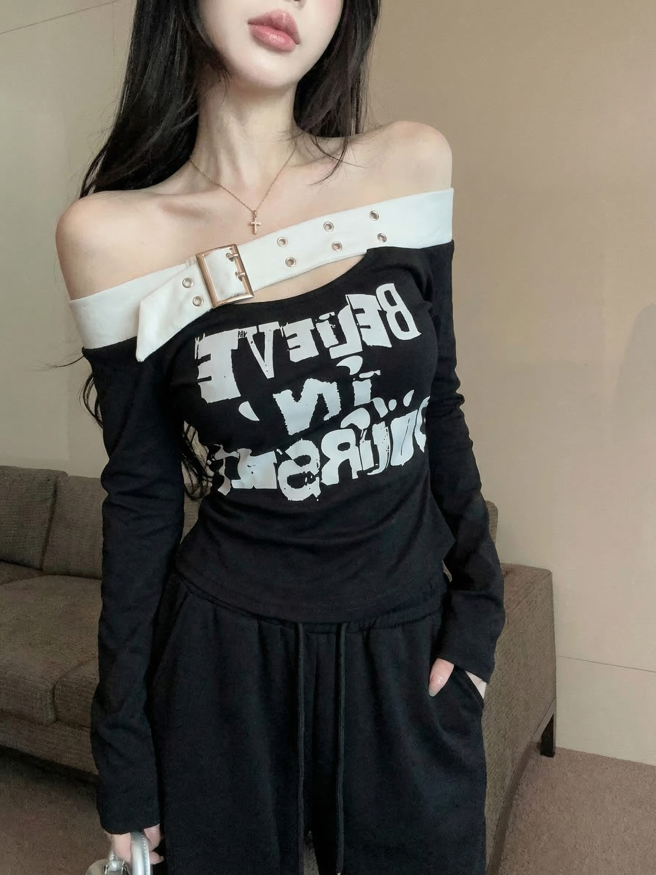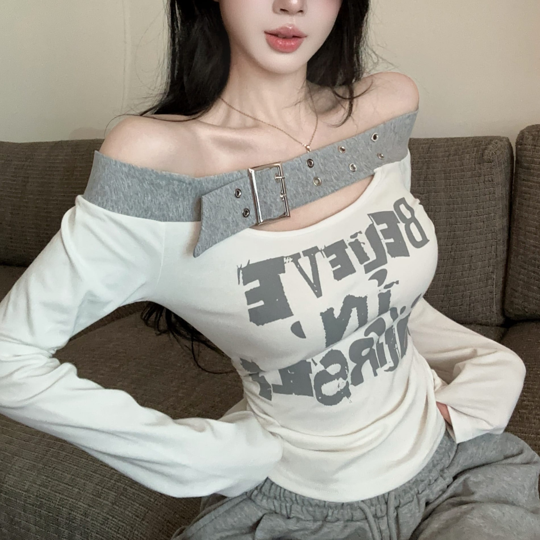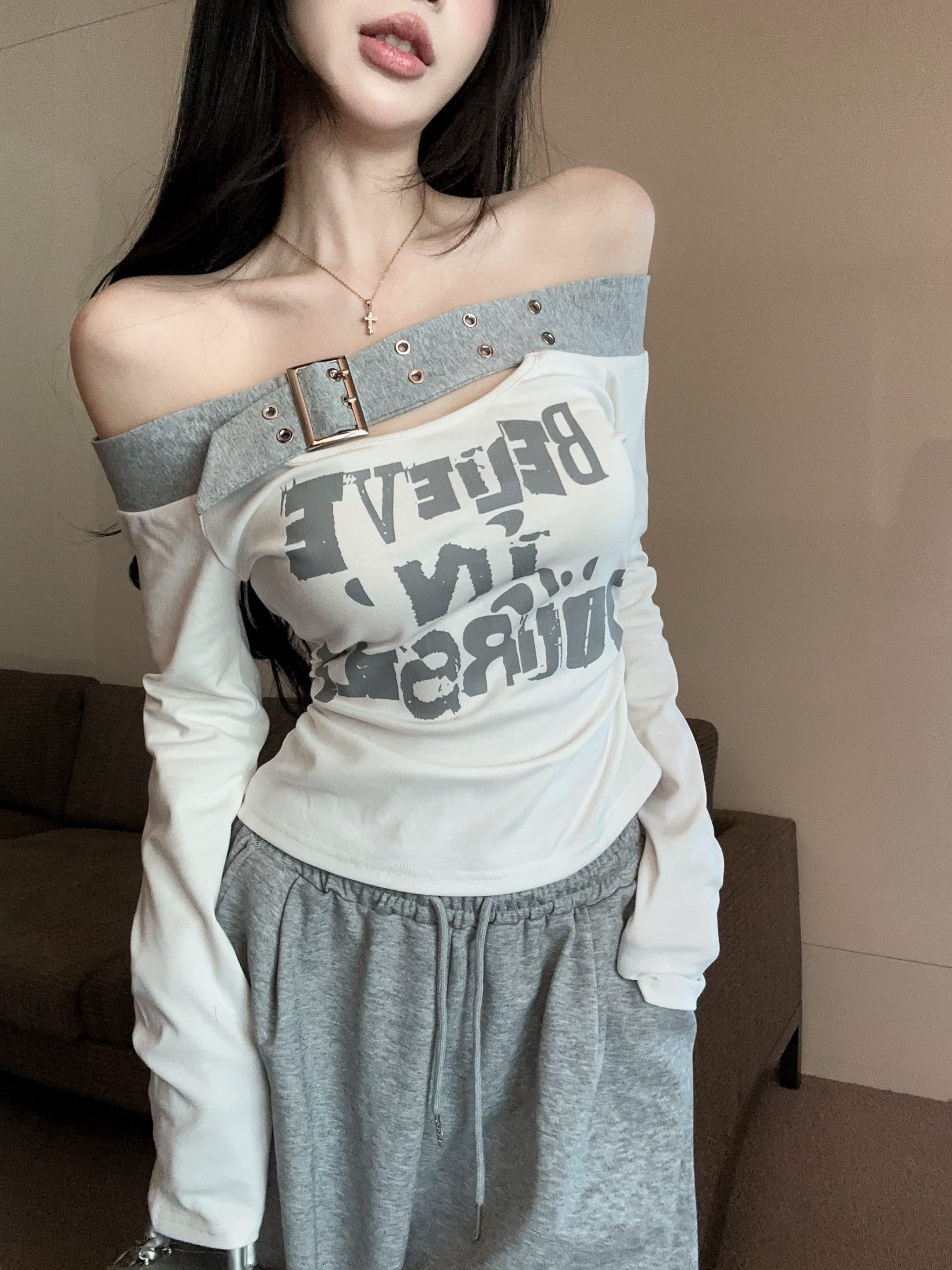 RY2898# 实拍实价 设计感一字肩长袖字母印花T恤抽绳宽松休闲阔腿裤套装