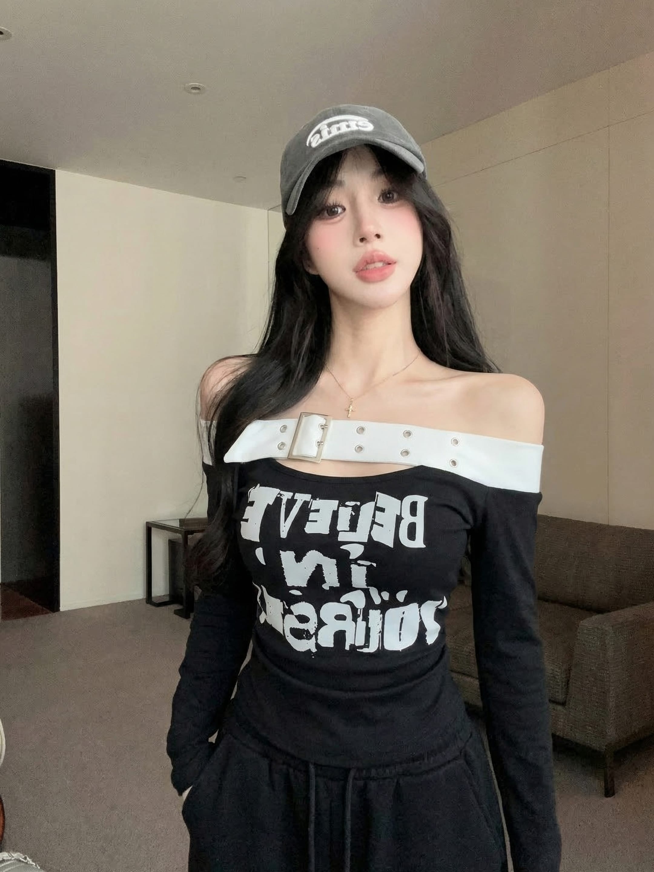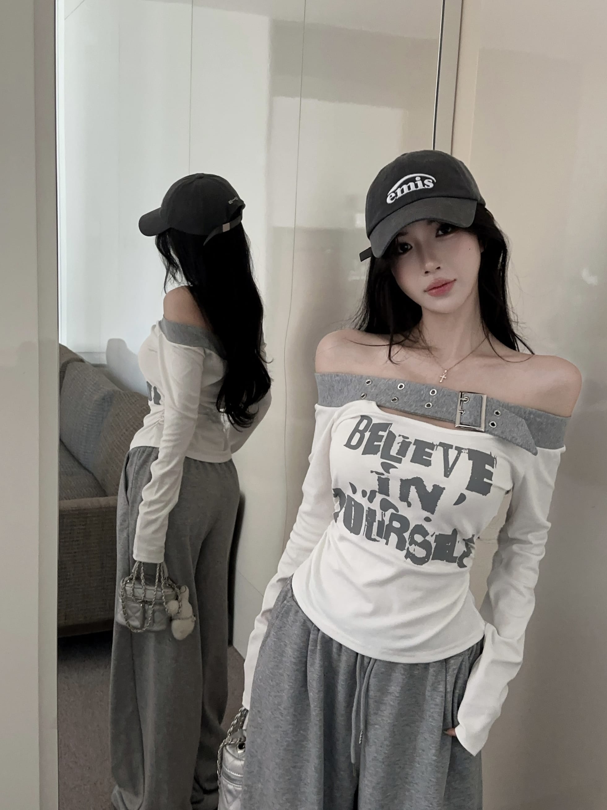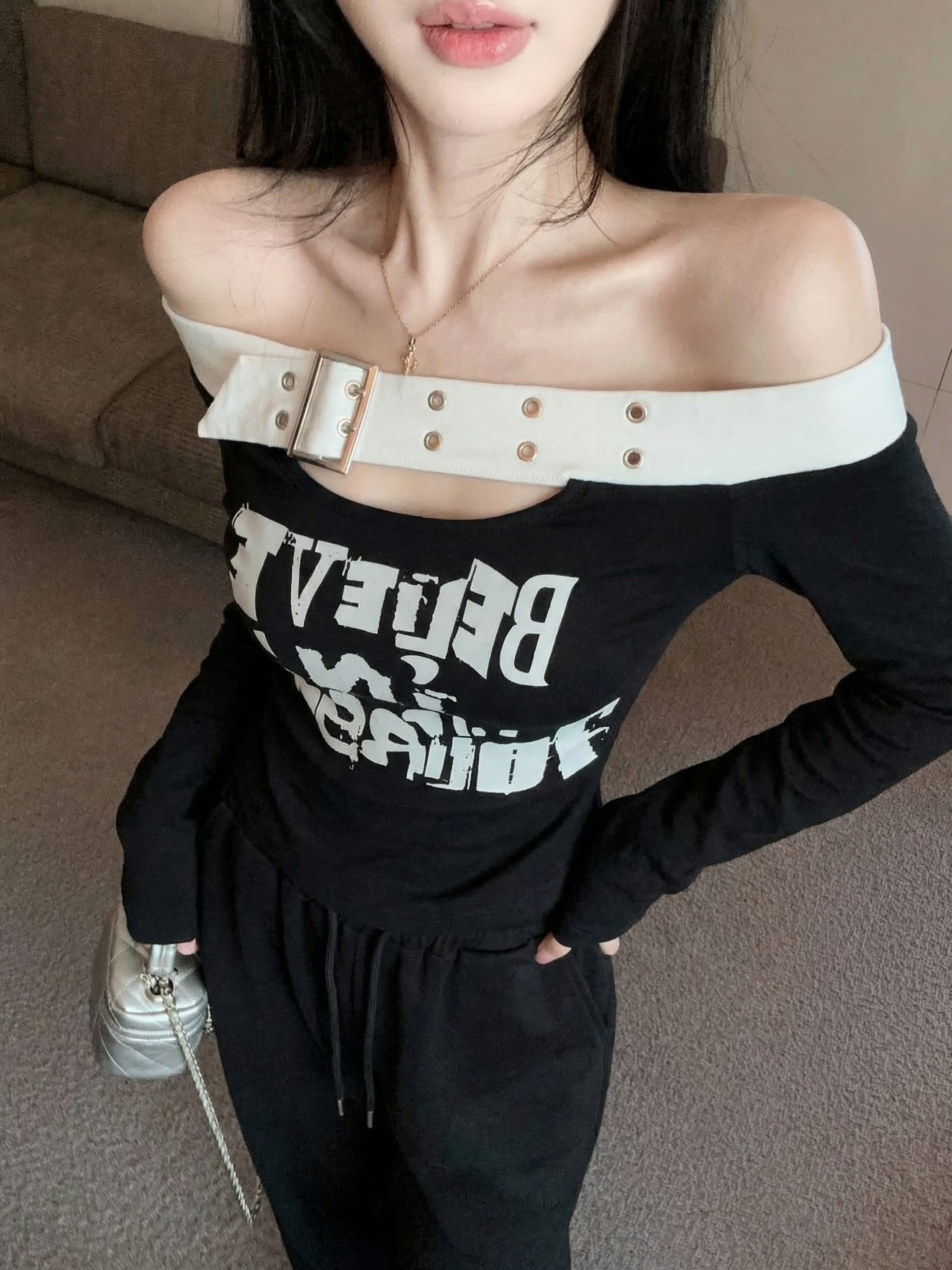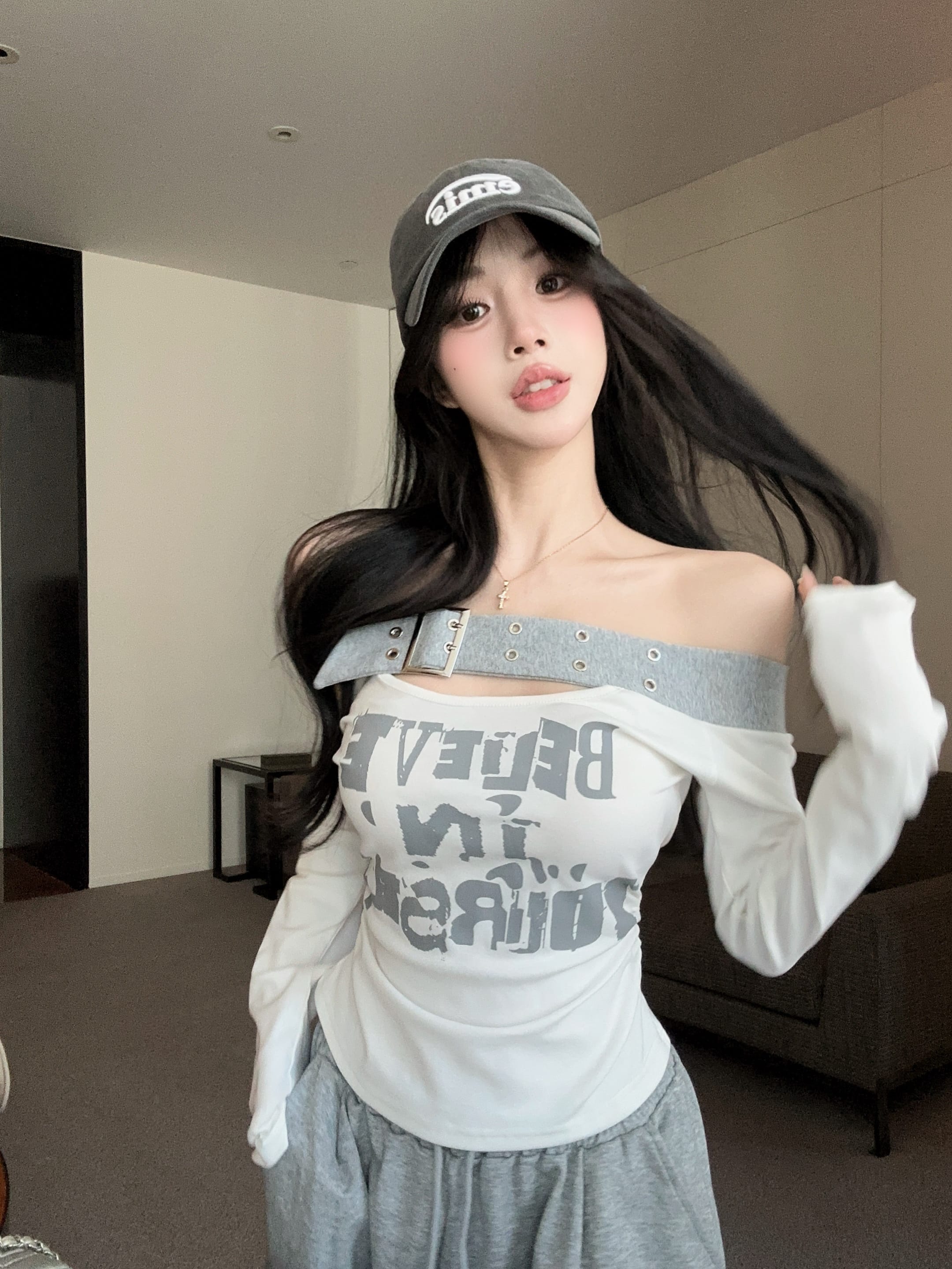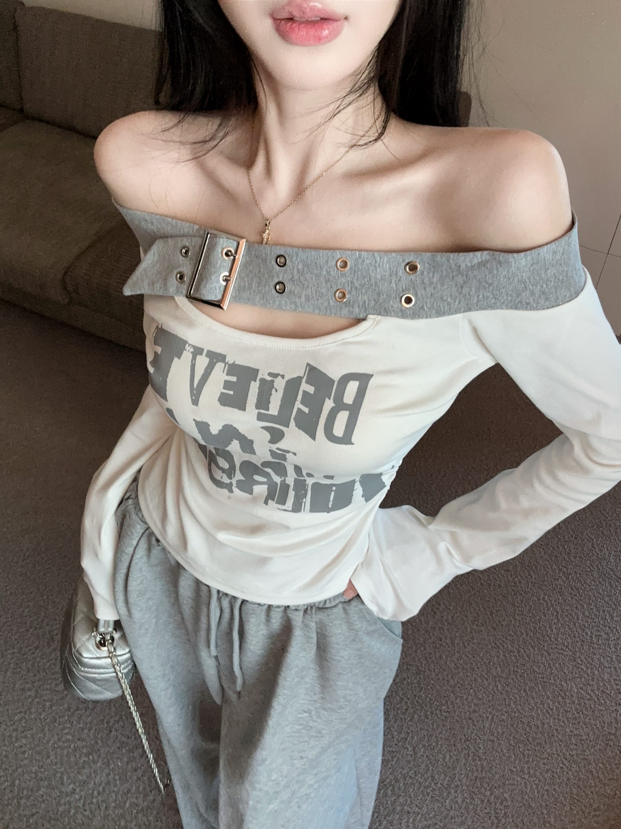 RY2898# 实拍实价 设计感一字肩长袖字母印花T恤抽绳宽松休闲阔腿裤套装